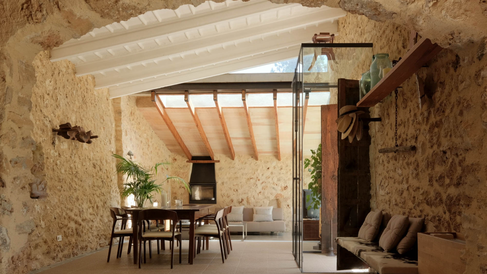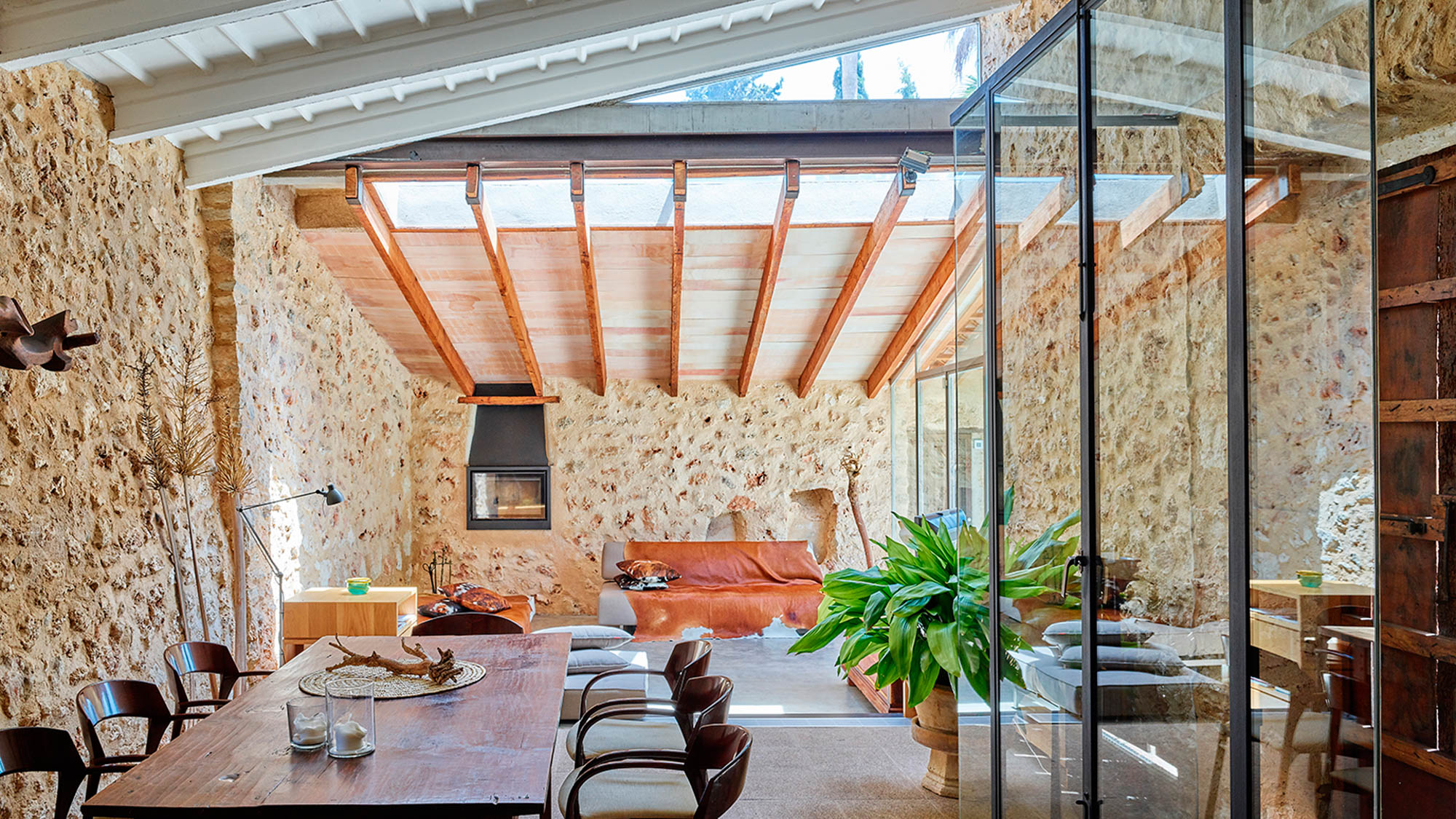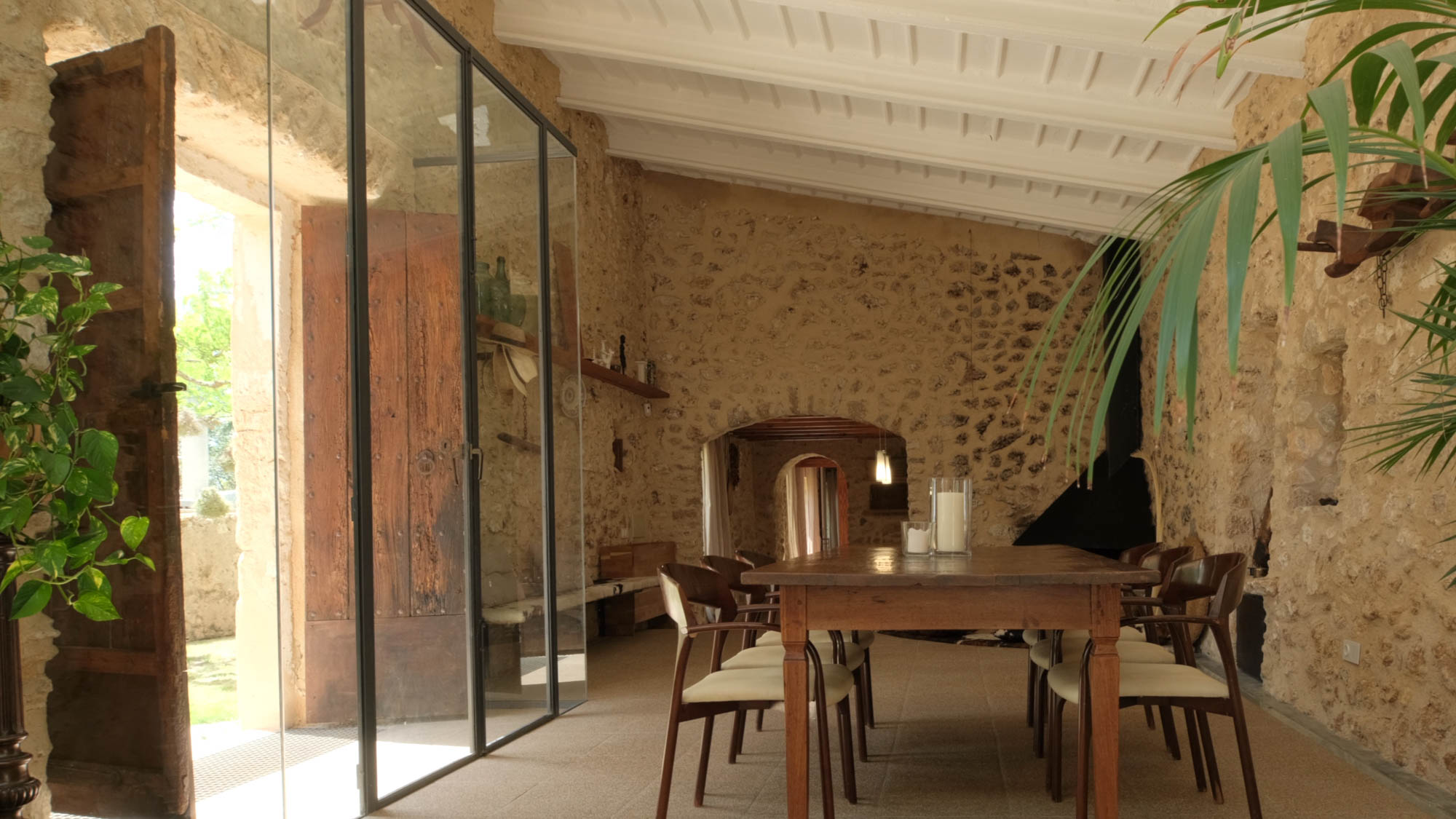 Huge glass panels allow light to stream into the house, and glazed concrete floors are draped with cowhides. Antique solid wood doors and rustic stone walls have been retained. There's a cosy living room, a sleek modern kitchen, and a large open dining room with an original fireplace. The two downstairs bedrooms have French doors leading onto the garden. Upstairs, there's one large bedroom with comfortable armchairs and another with a balcony. Bathrooms are sleek and modern.