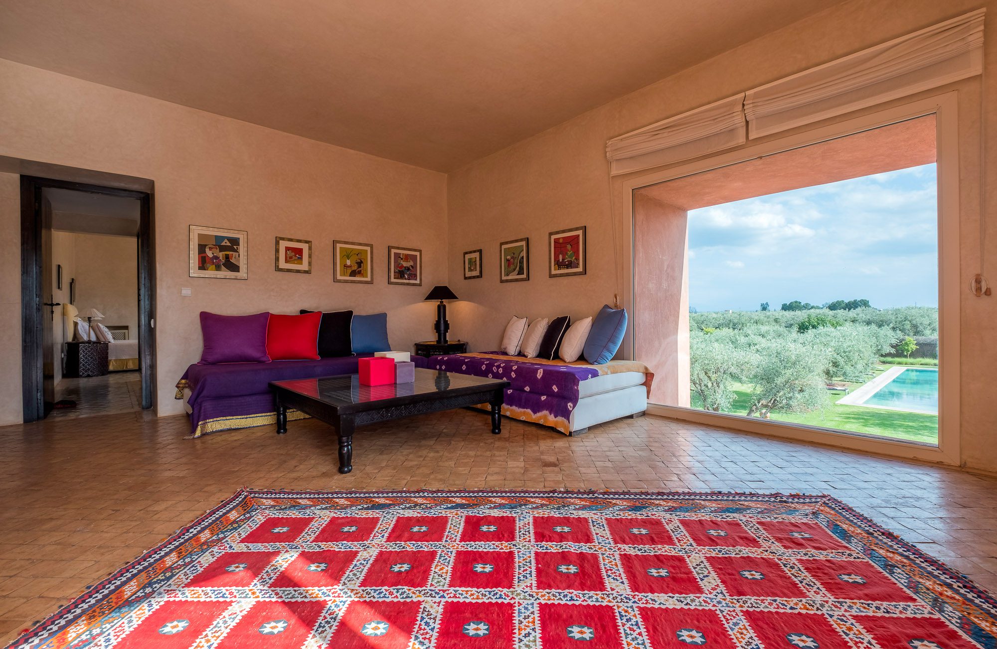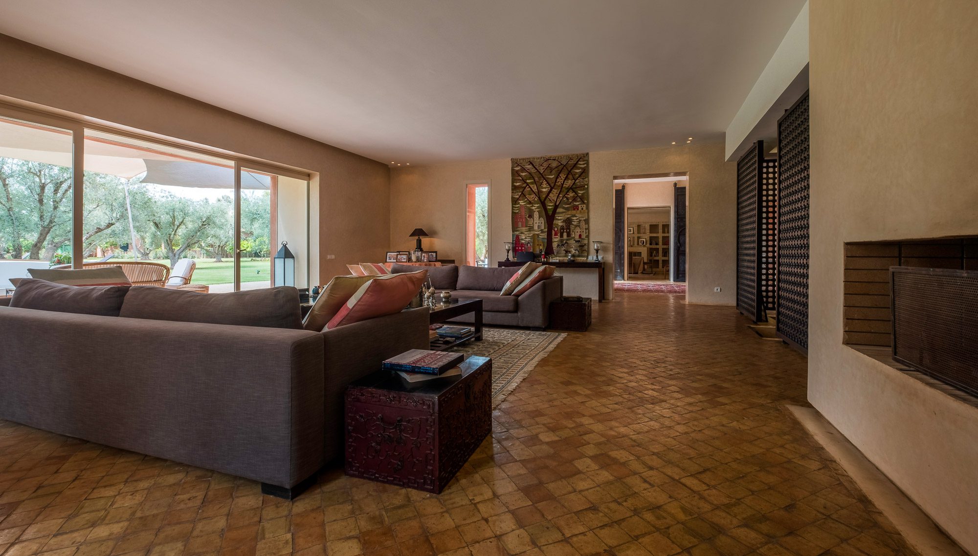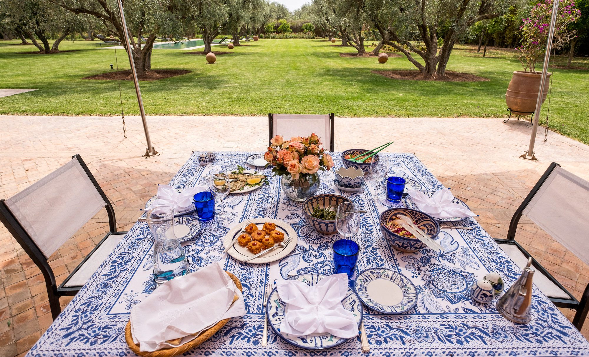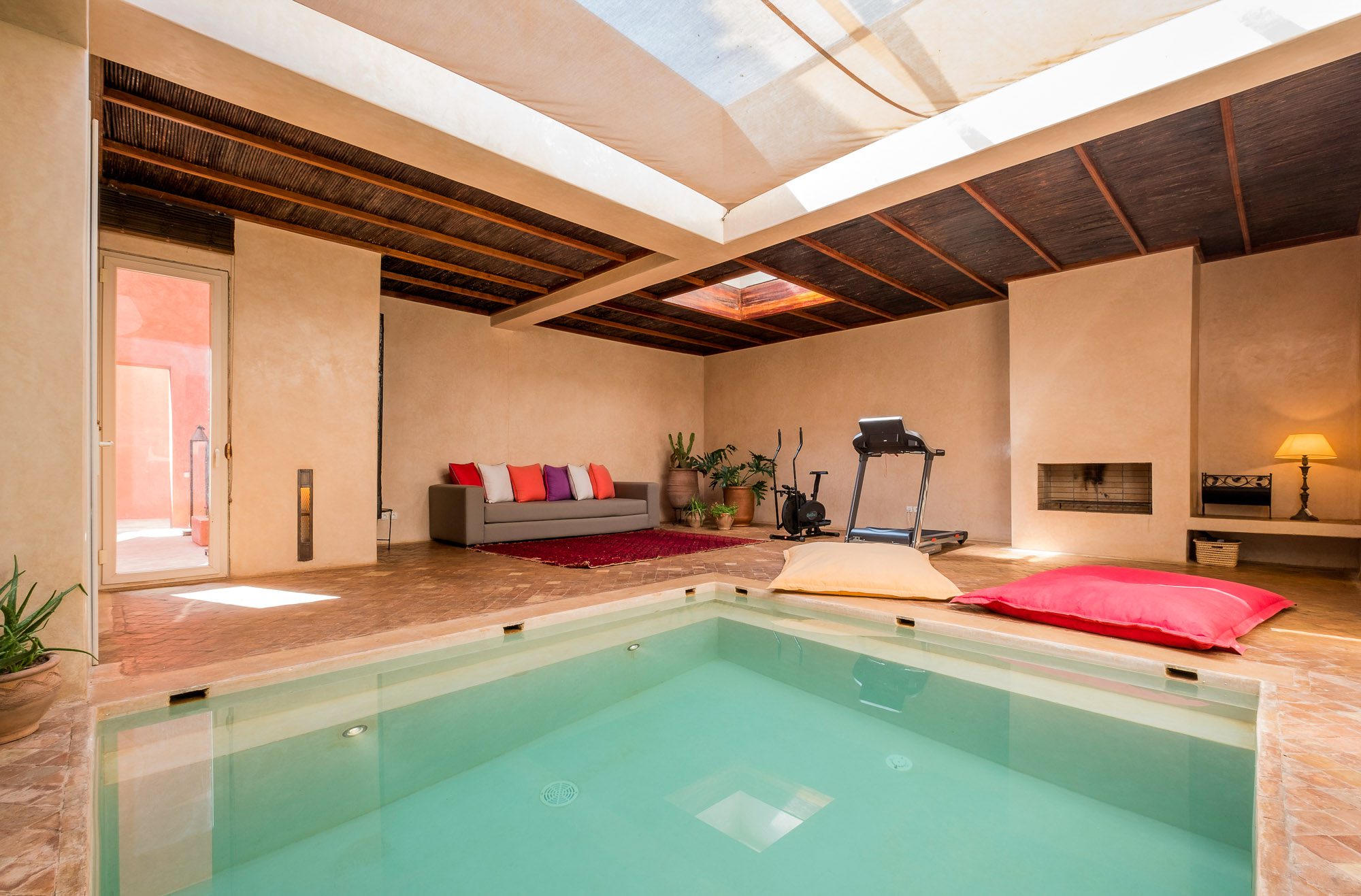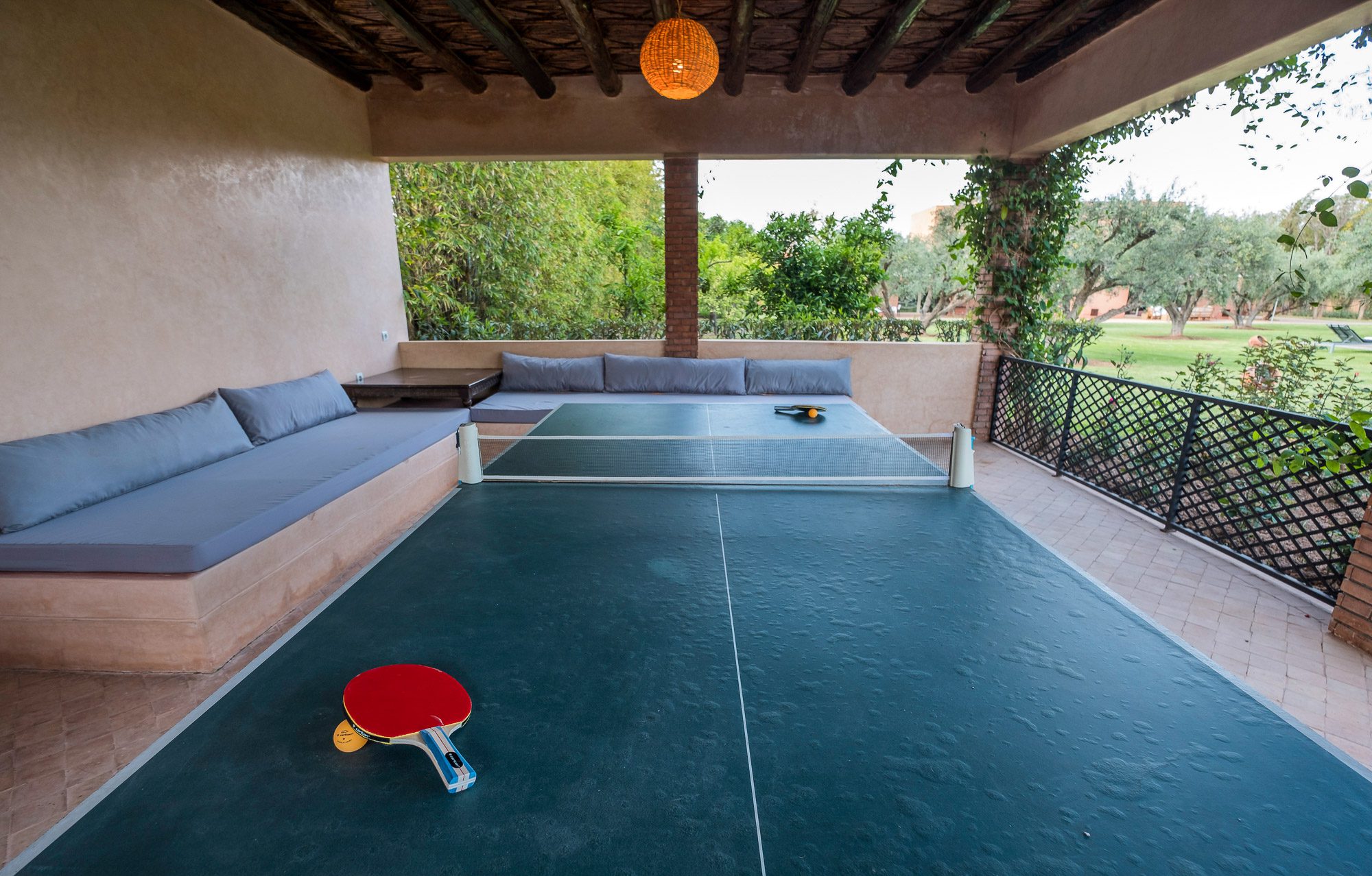Inside, there’s a smaller heated pool and a hammam area. On the terrace, gazebos shade an al fresco dining area and a separate chill-out seating area. A covered veranda houses table tennis and further seating overlooking the gardens.