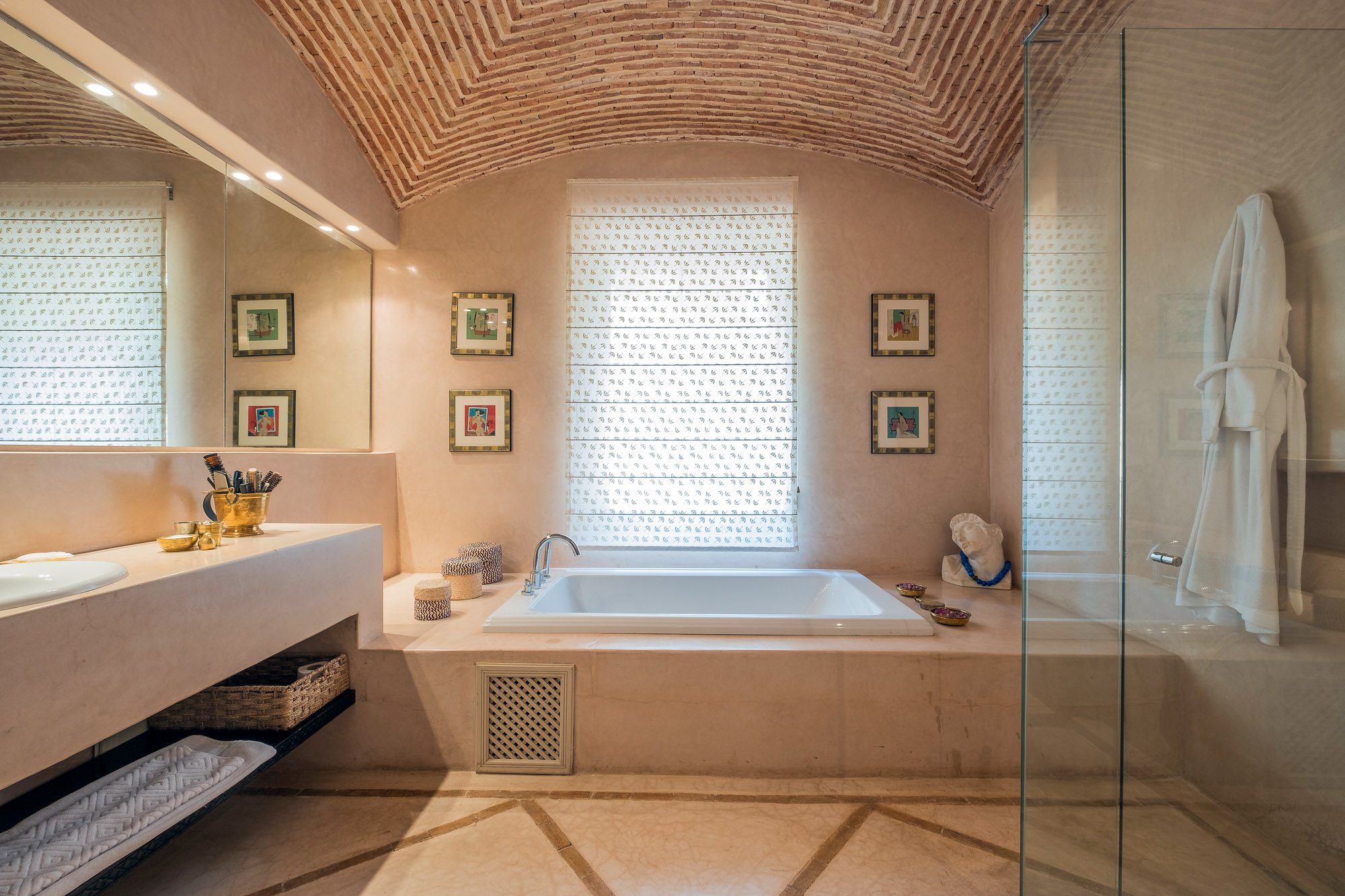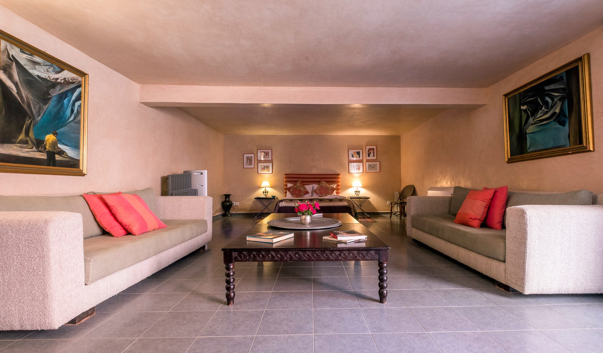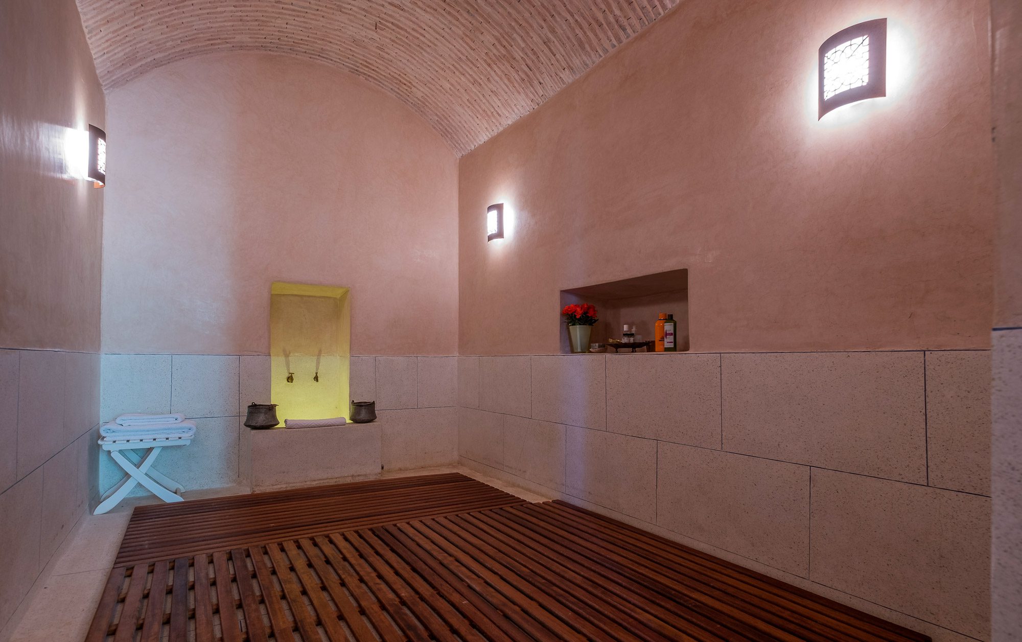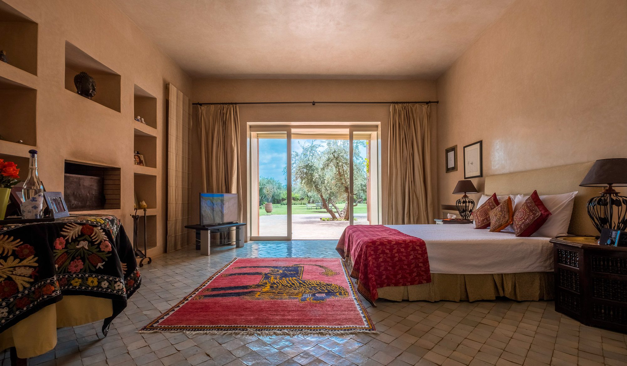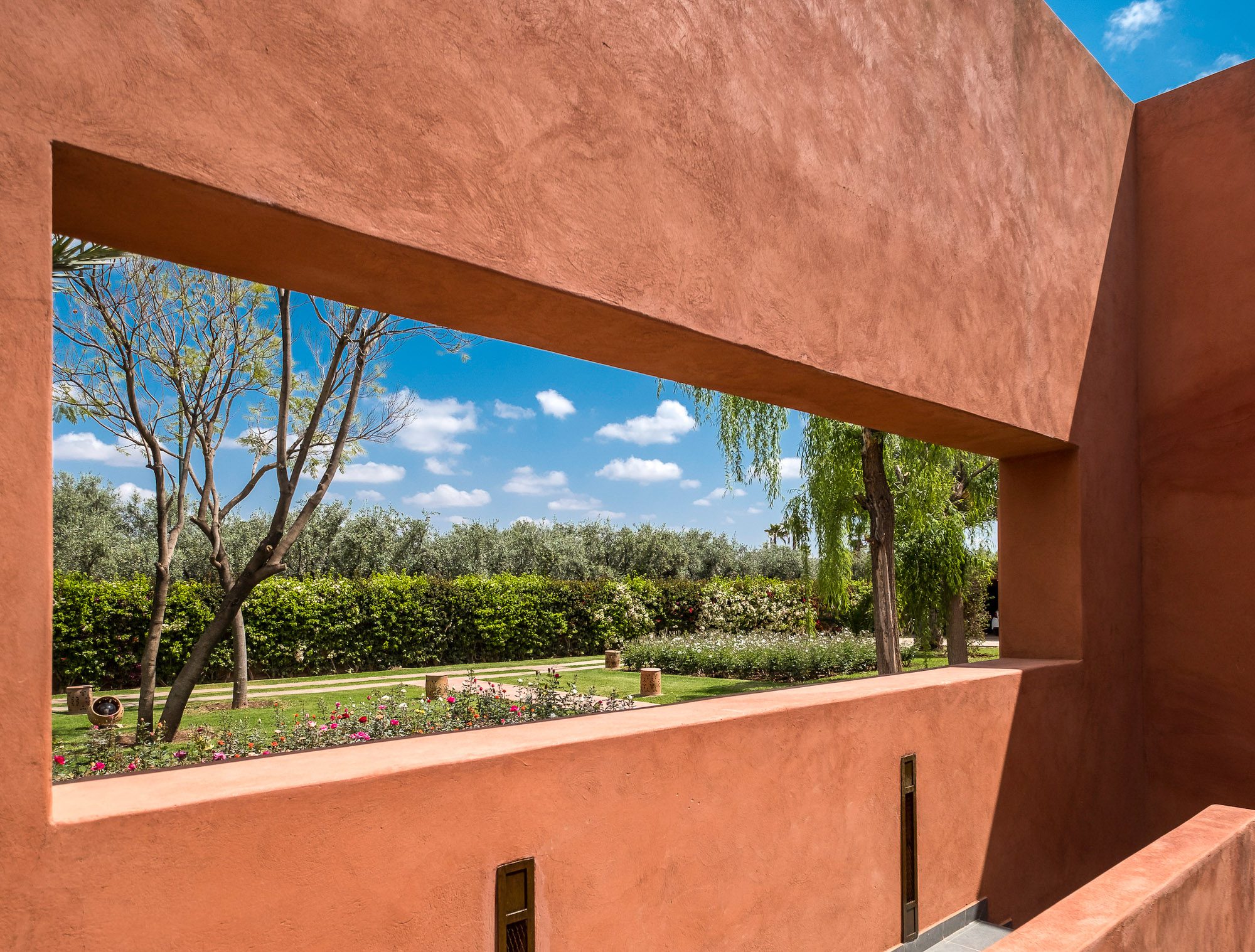 Inside, there’s a smaller heated pool and a hammam area. On the terrace, gazebos shade an al fresco dining area and a separate chill-out seating area. A covered veranda houses table tennis and further seating overlooking the gardens.