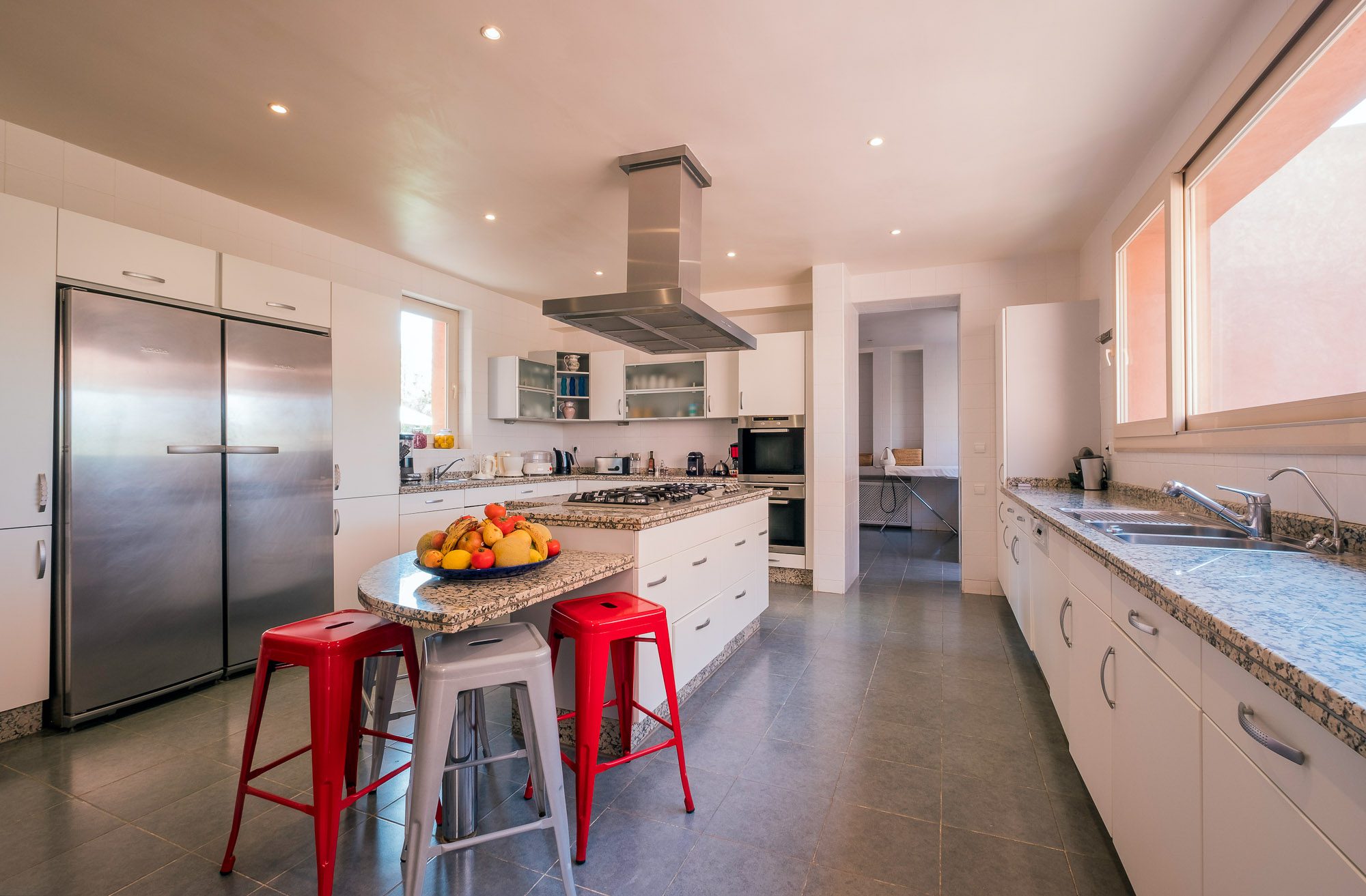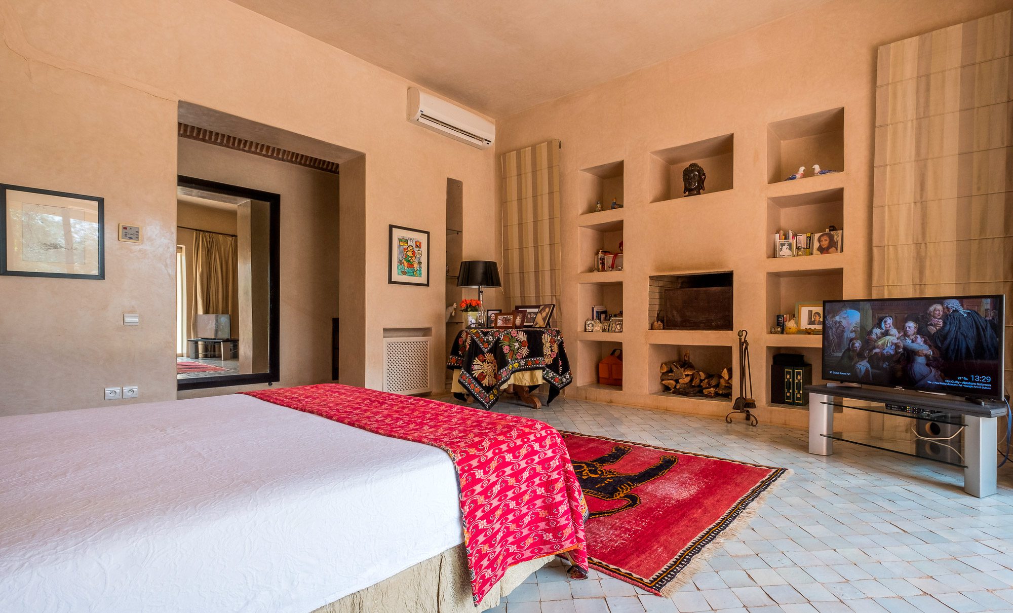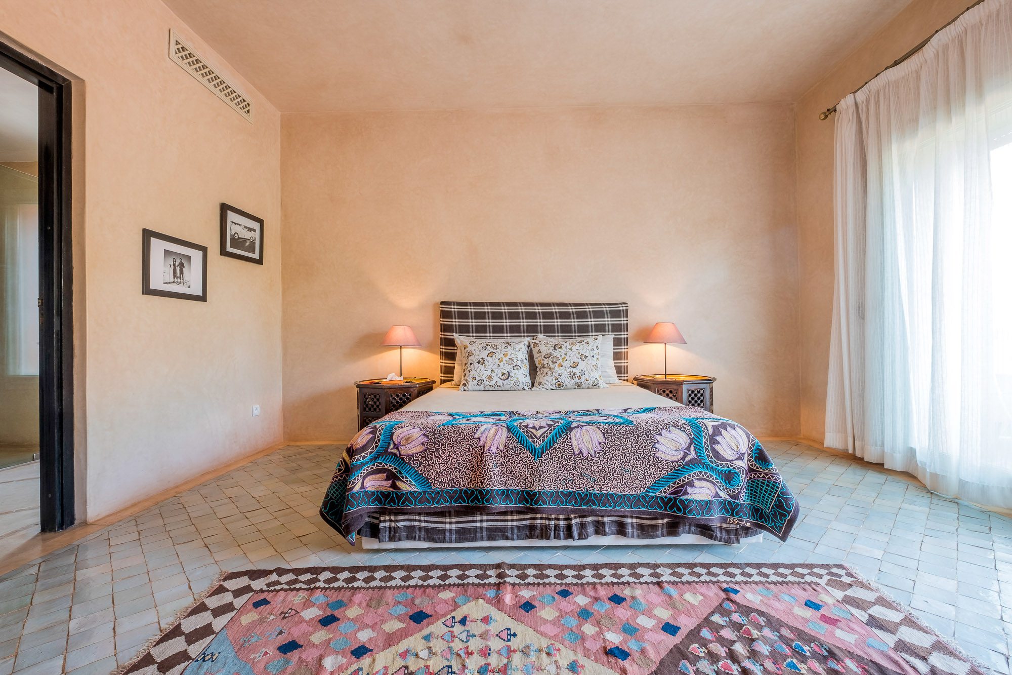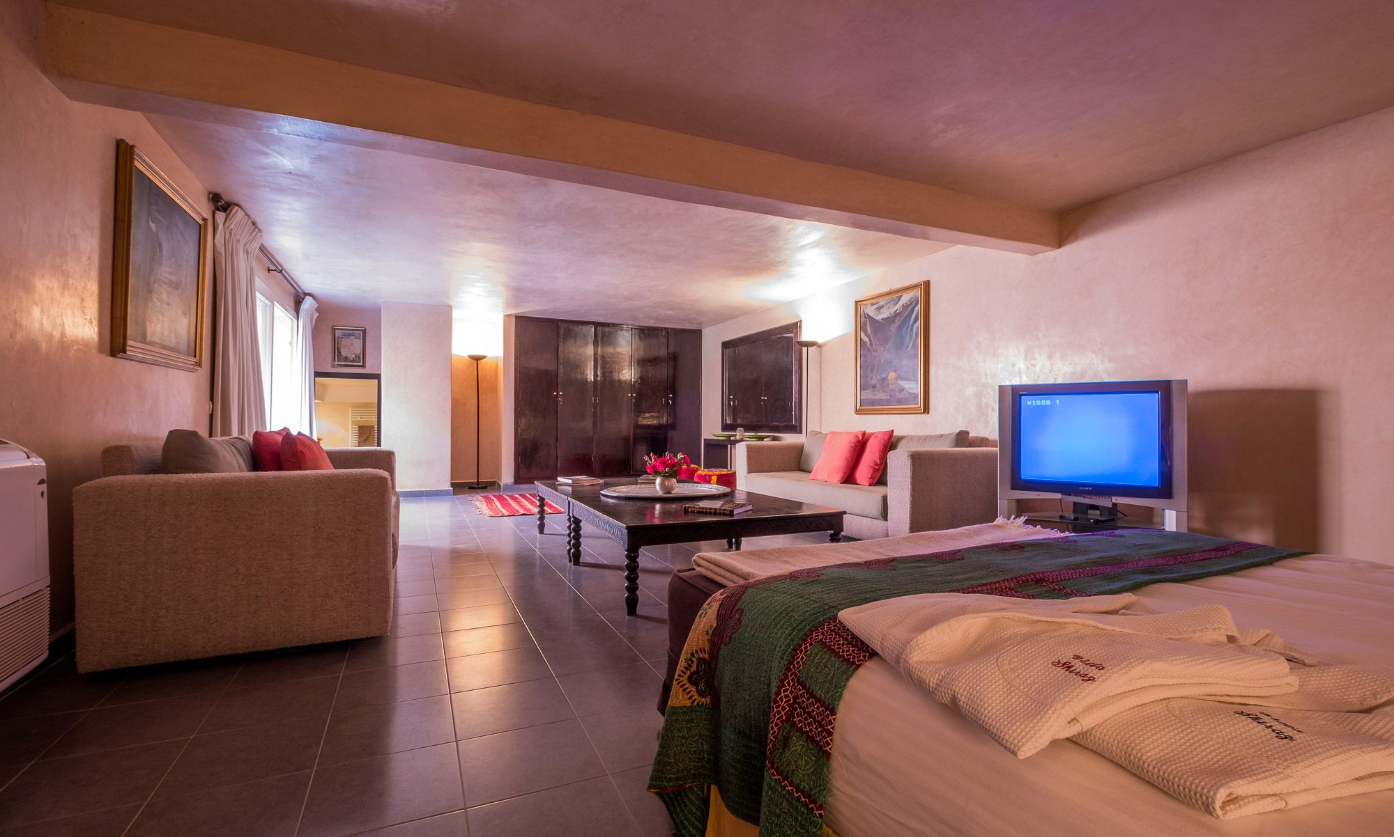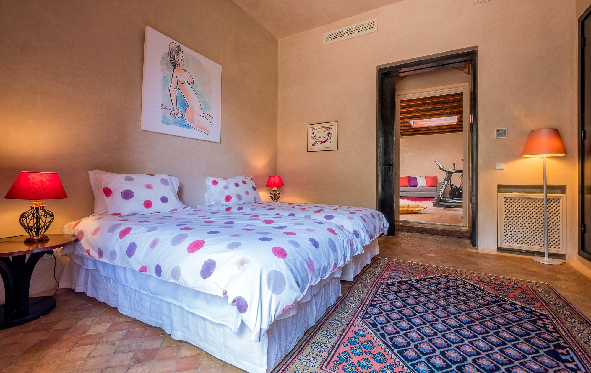 Inside, there’s a smaller heated pool and a hammam area. On the terrace, gazebos shade an al fresco dining area and a separate chill-out seating area. A covered veranda houses table tennis and further seating overlooking the gardens.