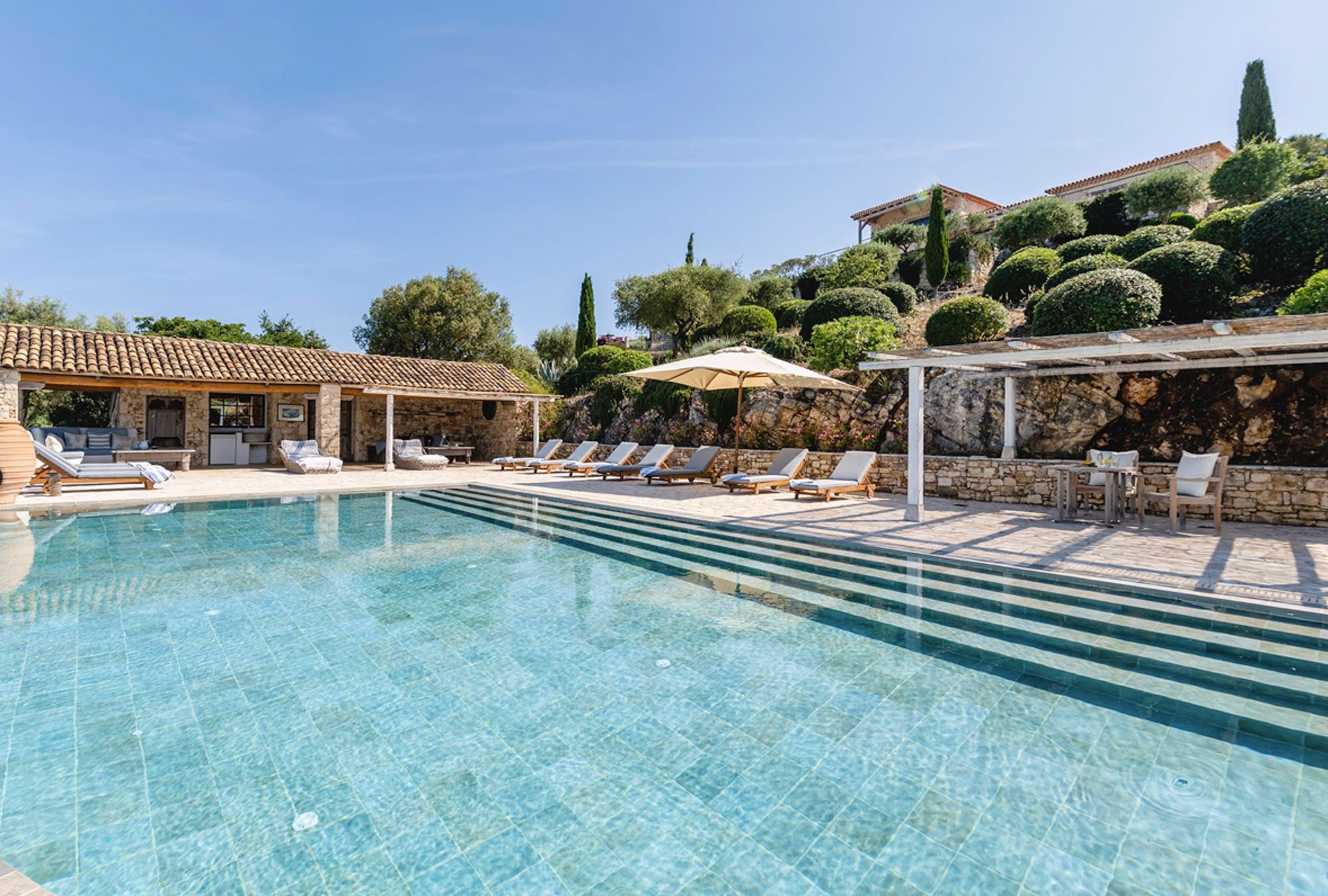Set into the terrace below the house is a large swimming pool with steps for sitting. The entrance to the pool area can be locked, so it is great for keeping small children safe. Plenty of comfy sun loungers surround the pool to one side. A shaded portico houses another comfortable seating area and outdoor kitchen. Wherever you decide to sit at this property, the views are exceptional.