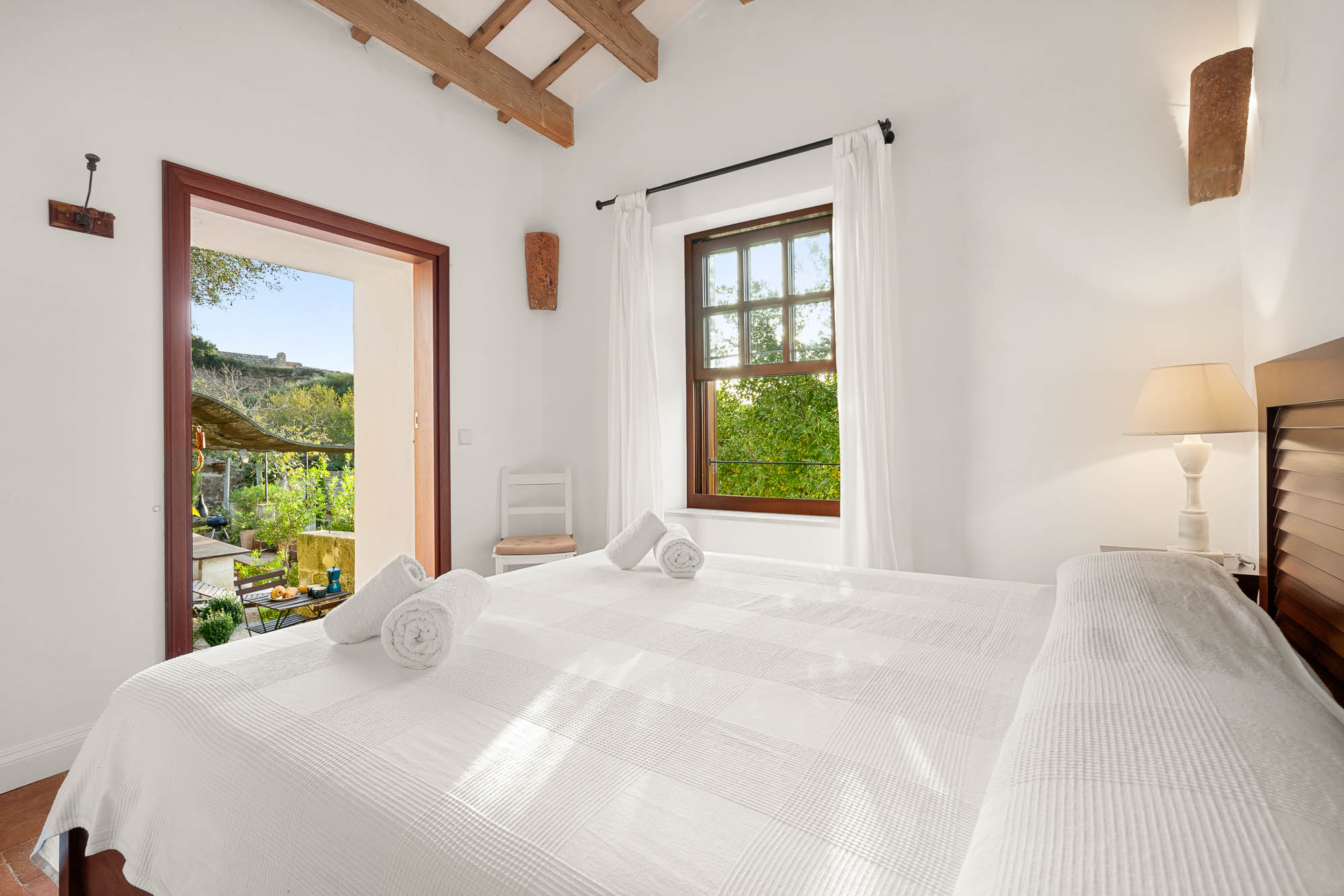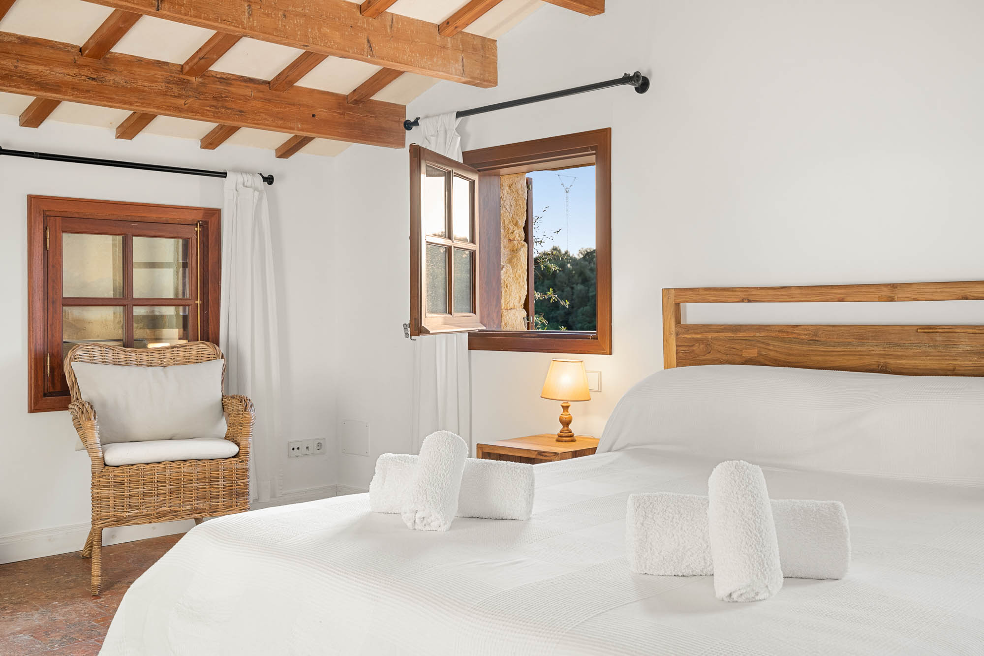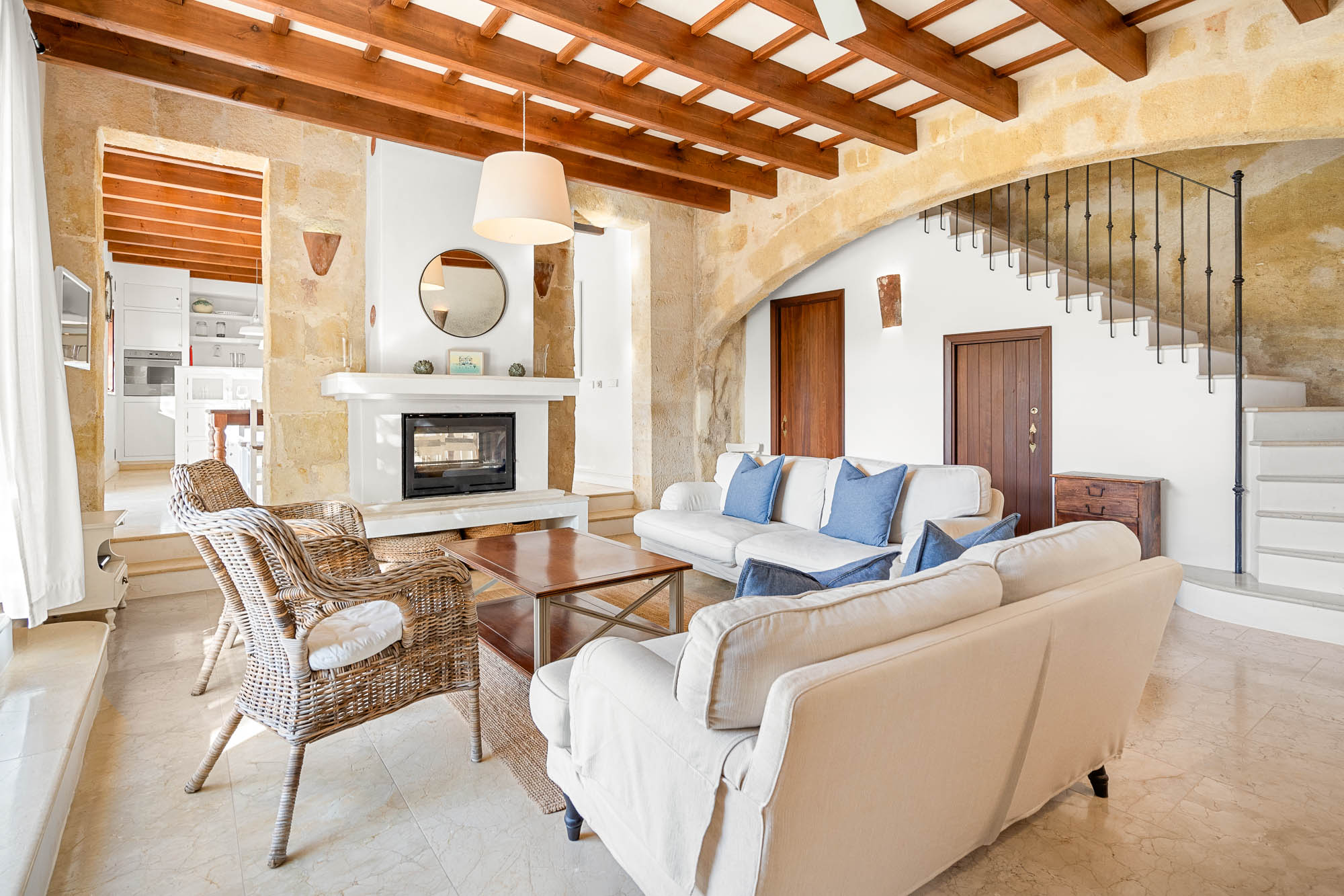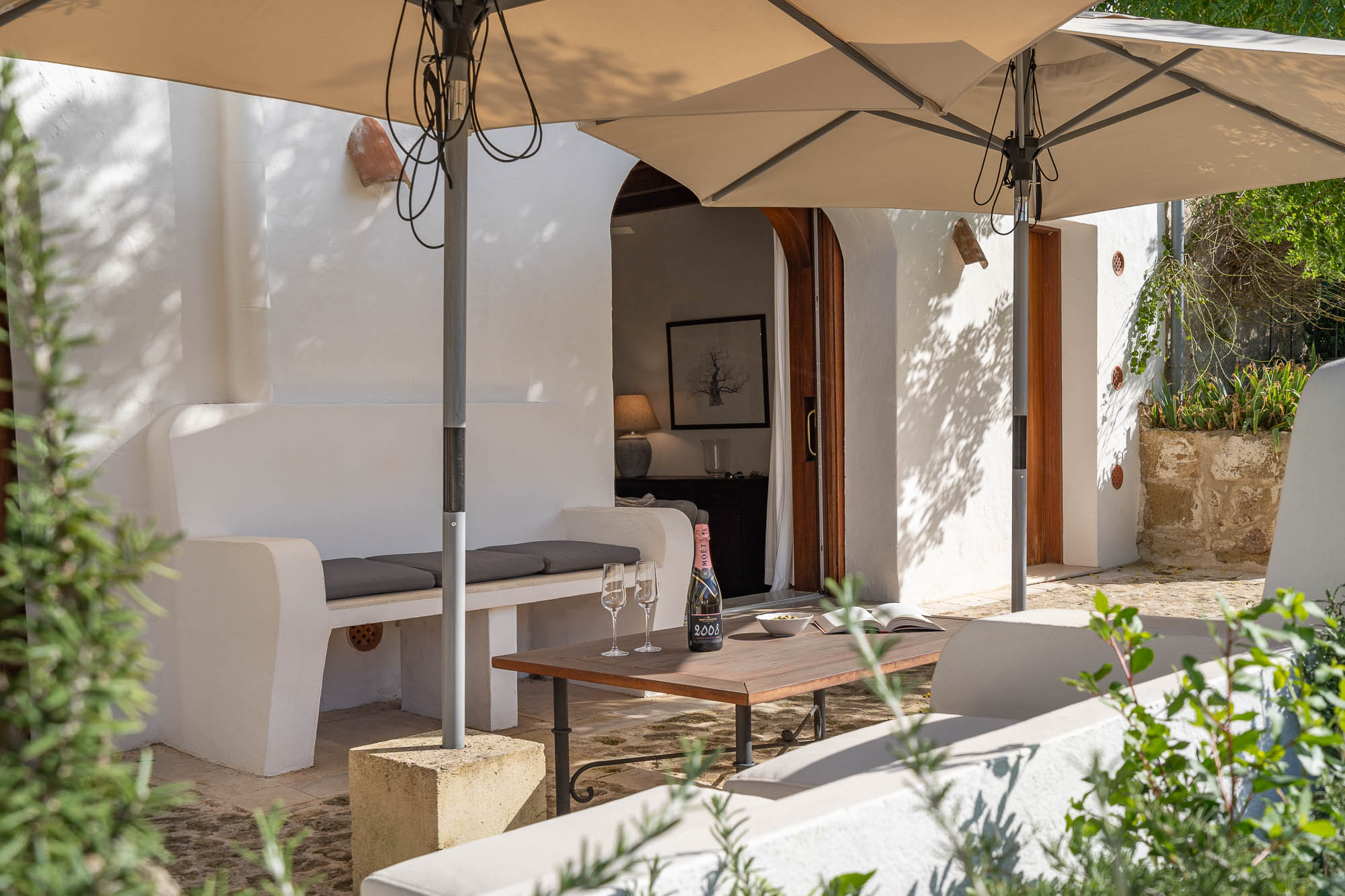 The interiors feel light, contemporary, and cool, combining original materials such as wooden beams, terracotta floor tiles, and exposed stone with fresh whitewashed walls and contemporary furniture in natural or white-painted wood.