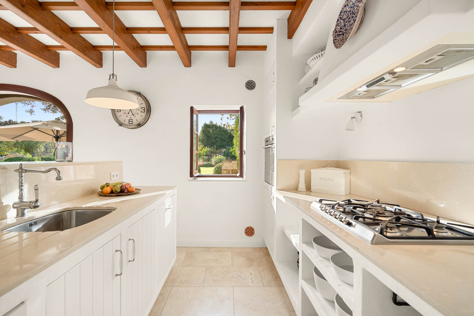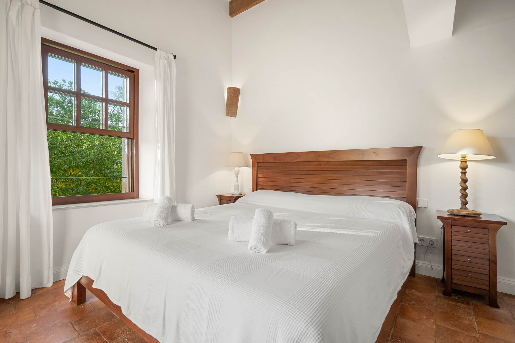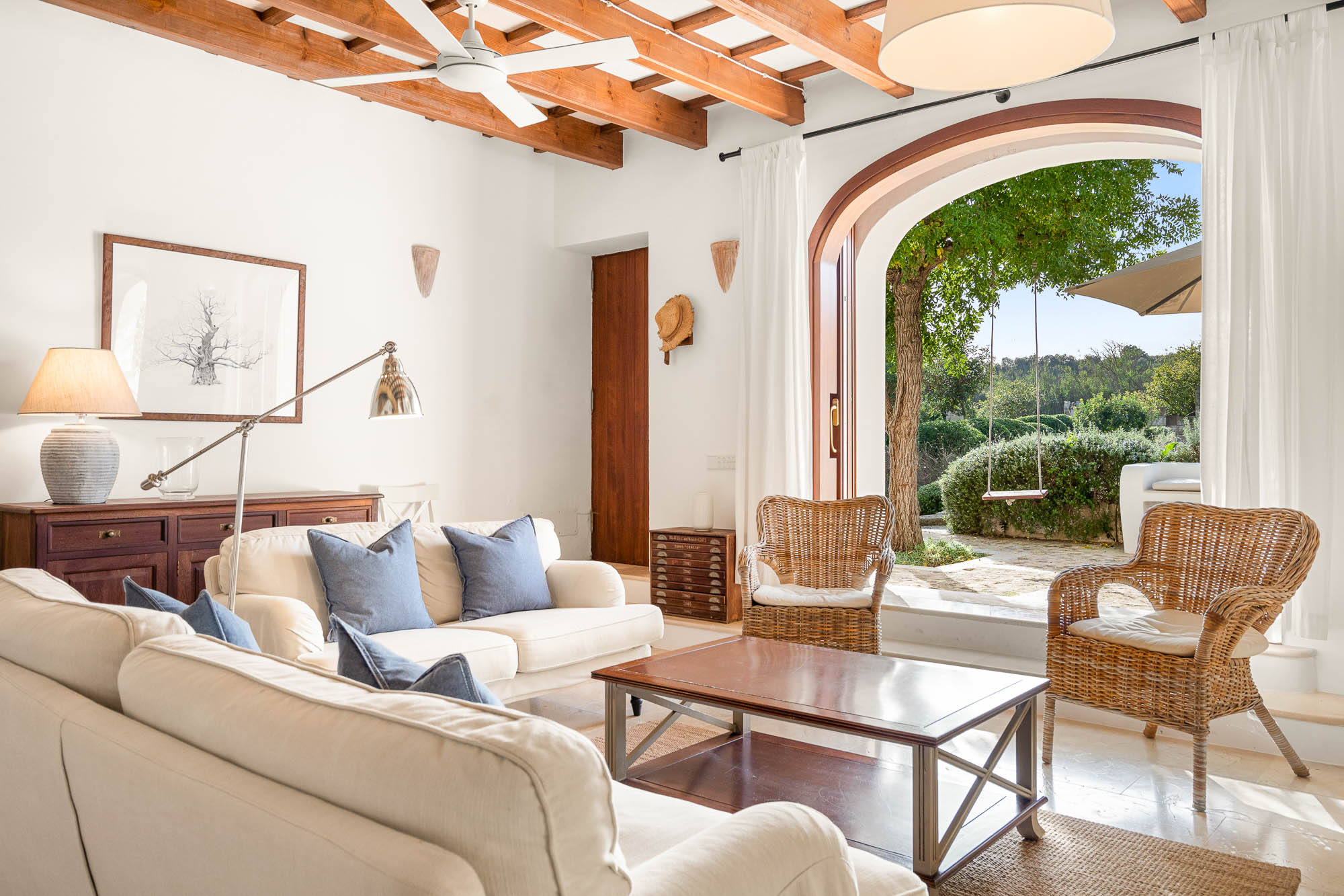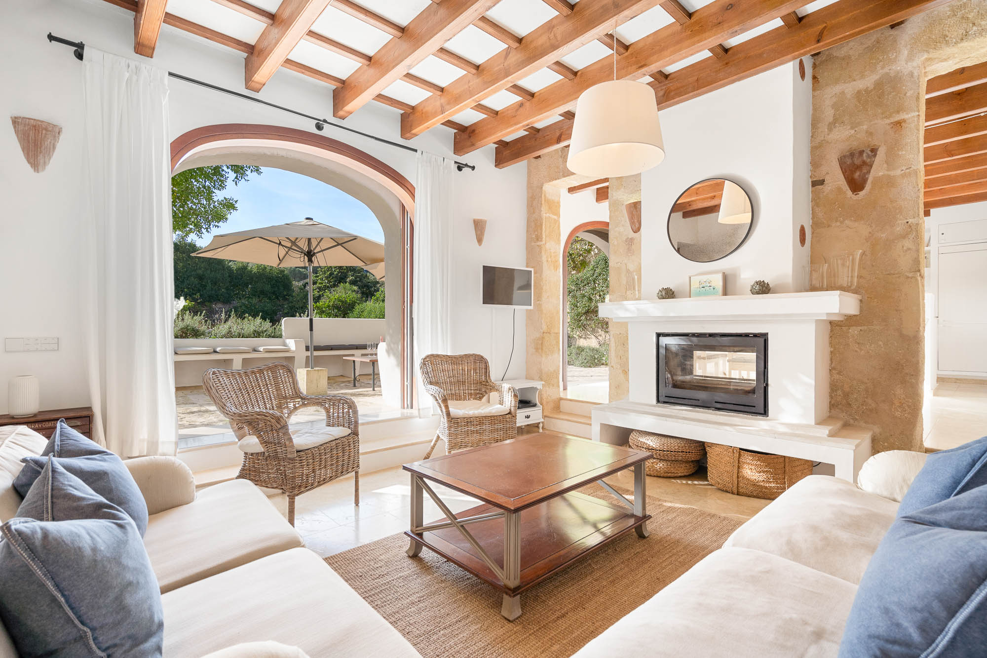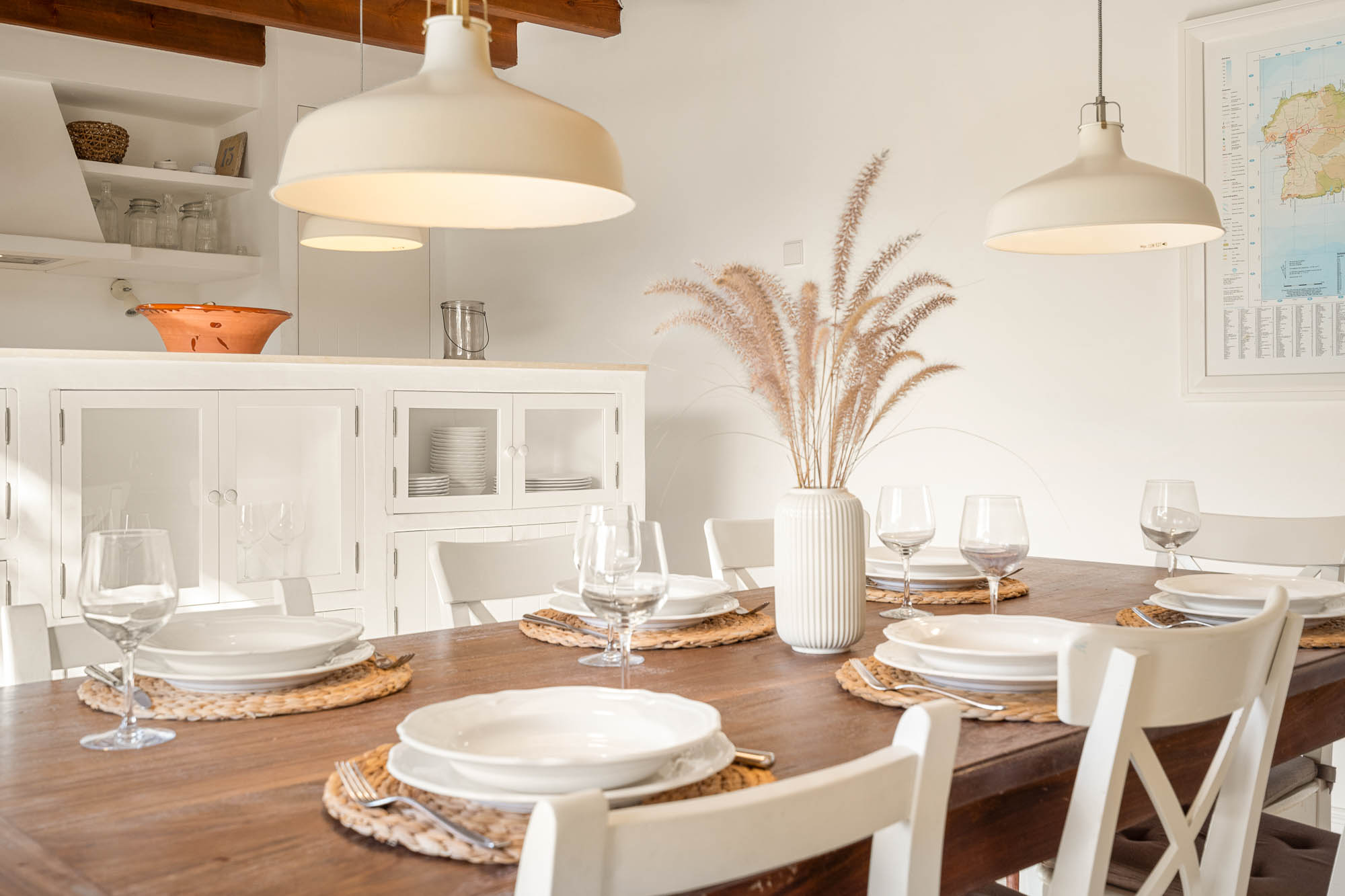 The interiors feel light, contemporary, and cool, combining original materials such as wooden beams, terracotta floor tiles, and exposed stone with fresh whitewashed walls and contemporary furniture in natural or white-painted wood.