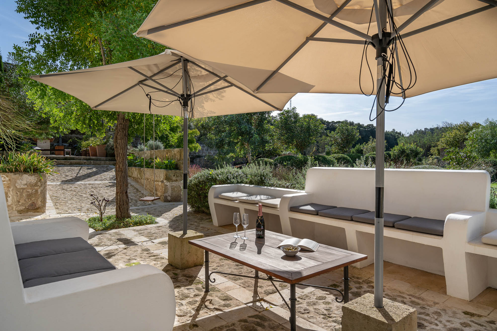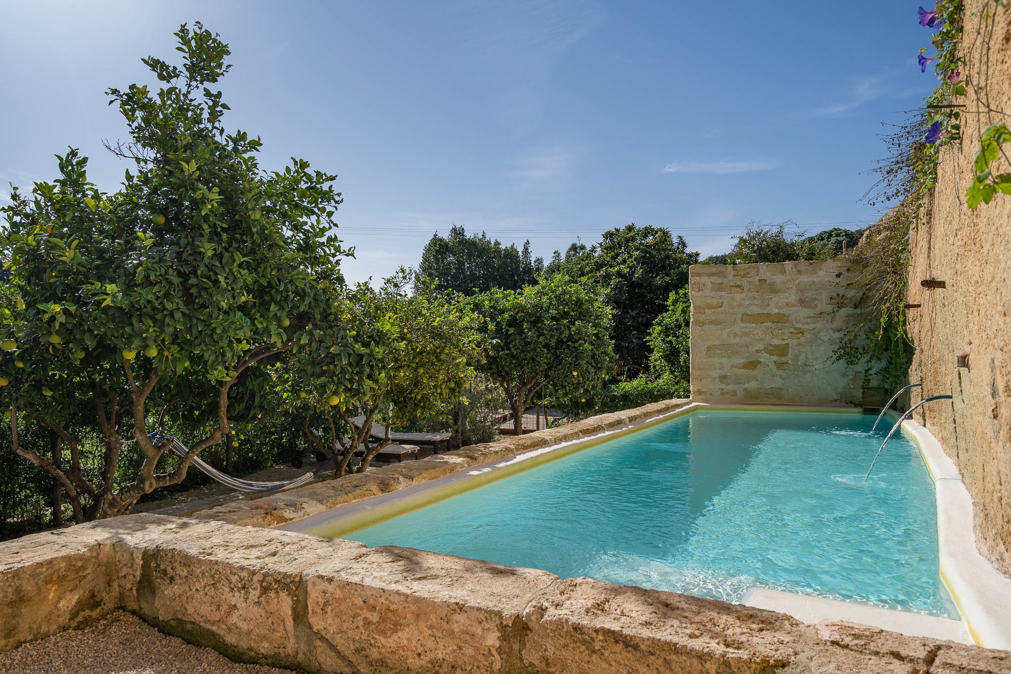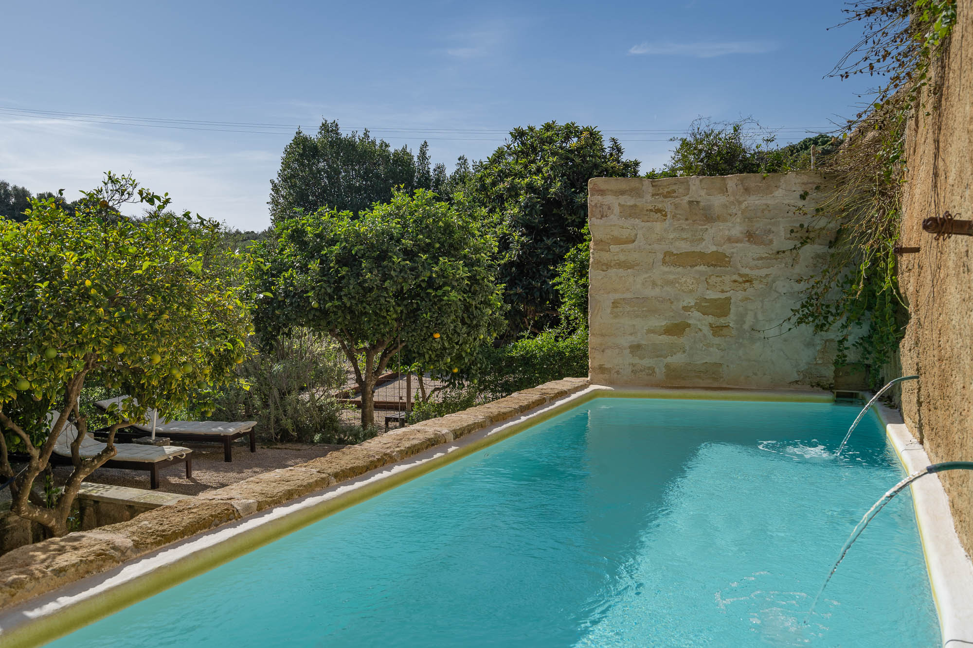 There's a unique swimming pool converted from a large stone water tank, a wonderful dining area beneath the shade of a pergola, large lawns where children can play, plenty of seating both in the sun or beneath large parasols, fruit and olive trees and delightful planting.