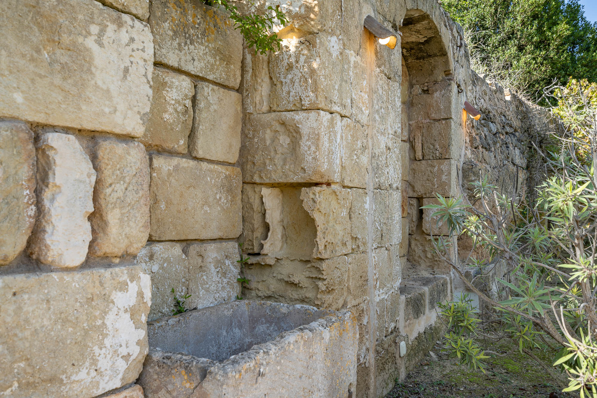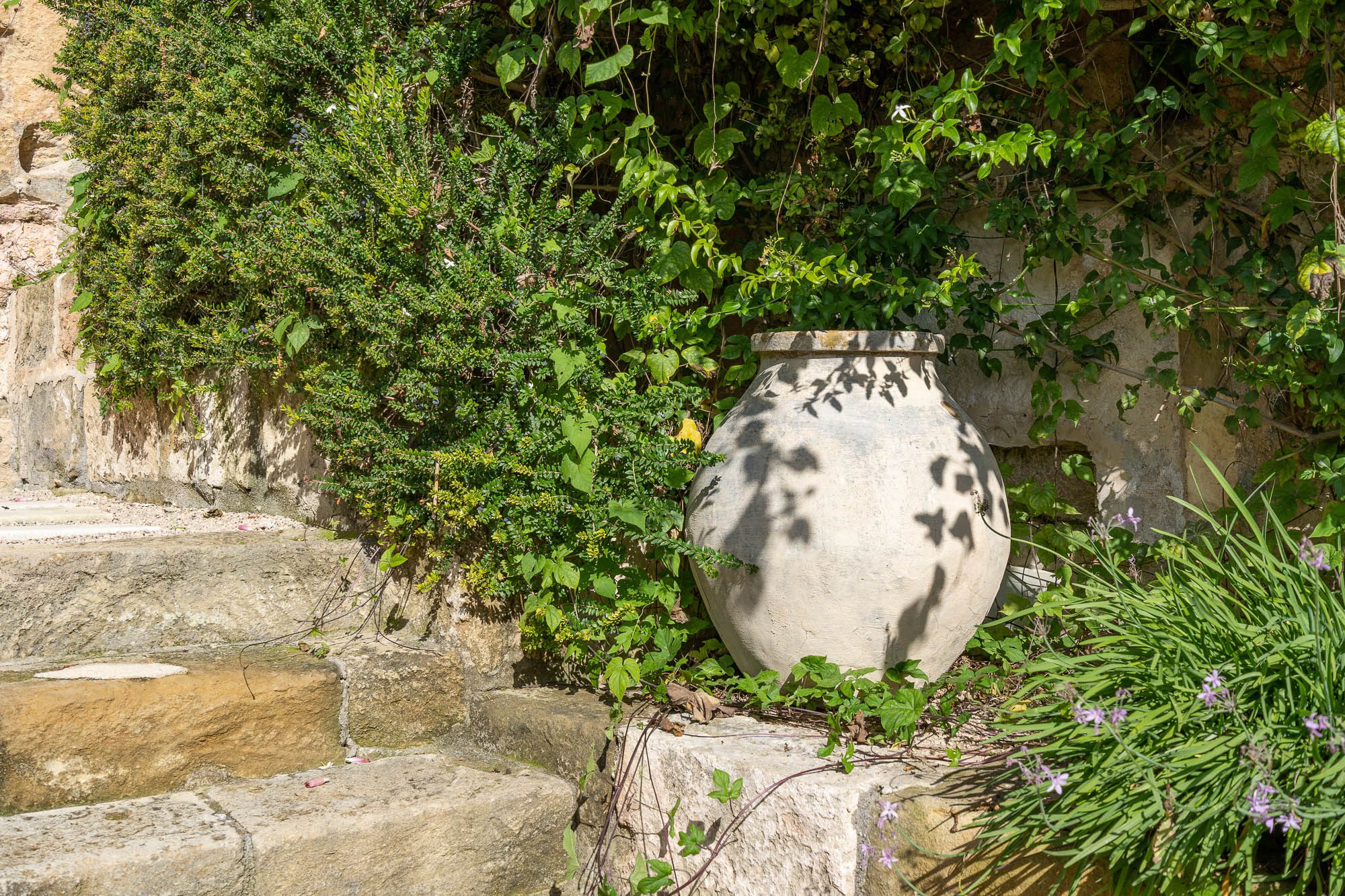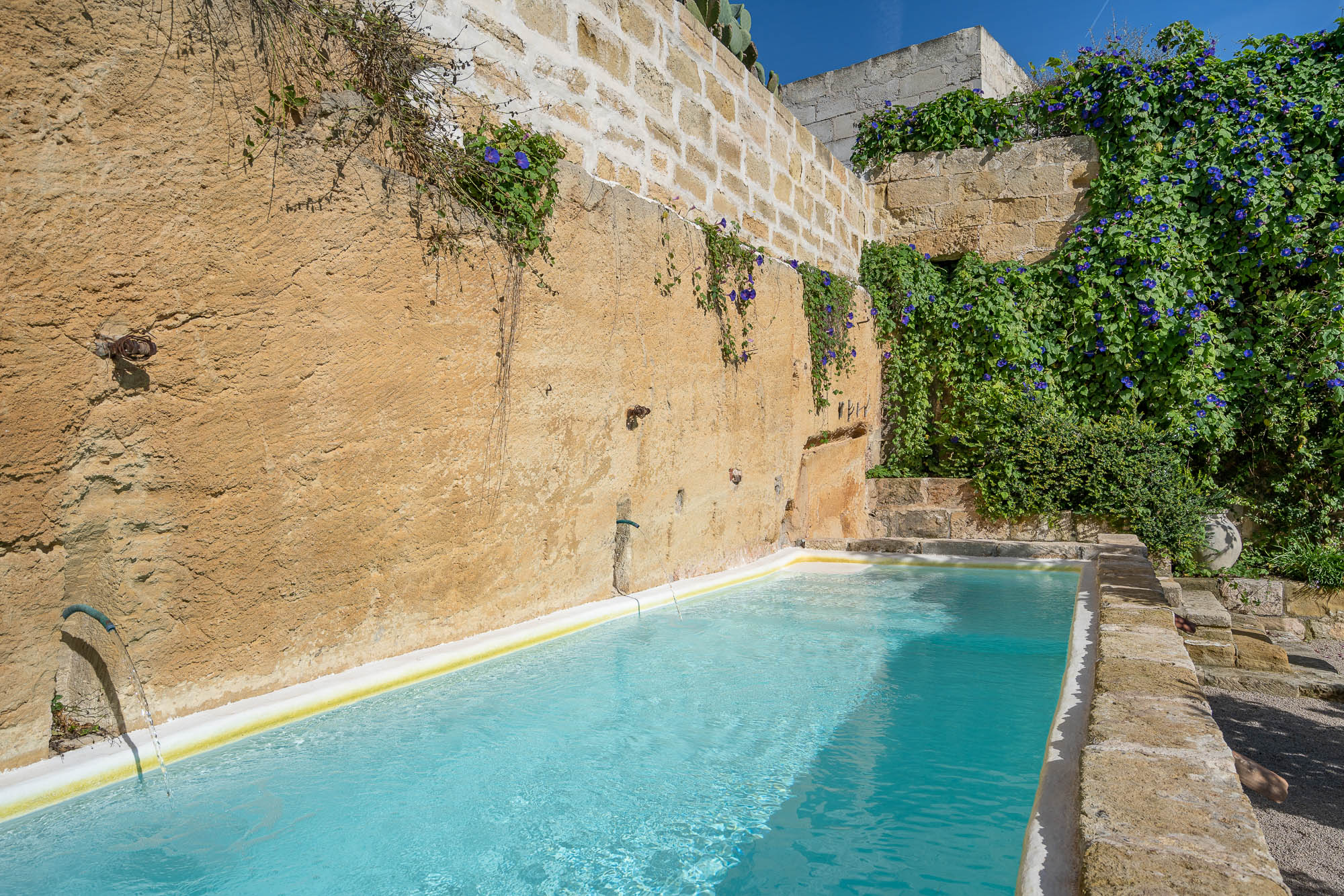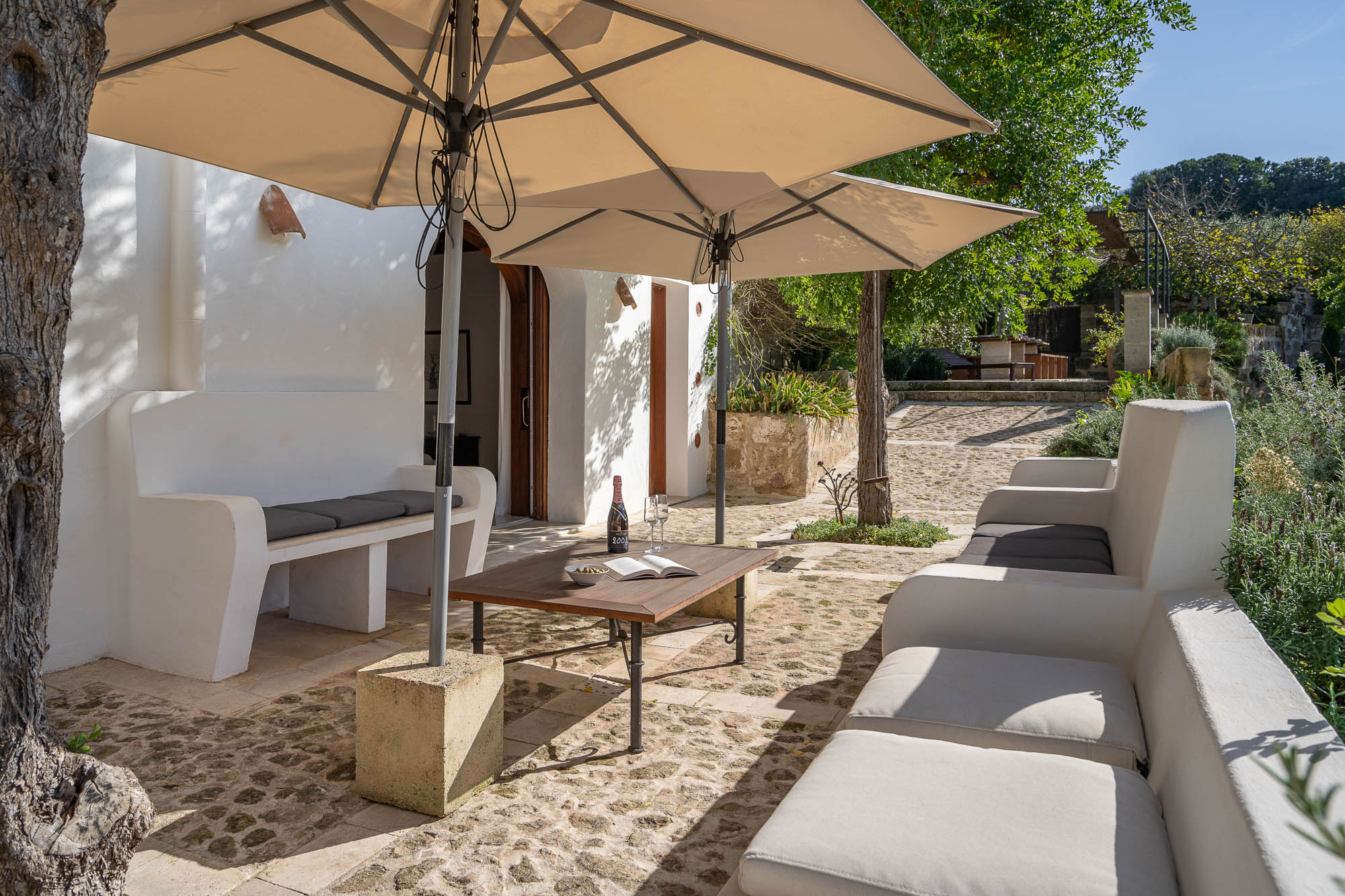 There's a unique swimming pool converted from a large stone water tank, a wonderful dining area beneath the shade of a pergola, large lawns where children can play, plenty of seating both in the sun or beneath large parasols, fruit and olive trees and delightful planting.