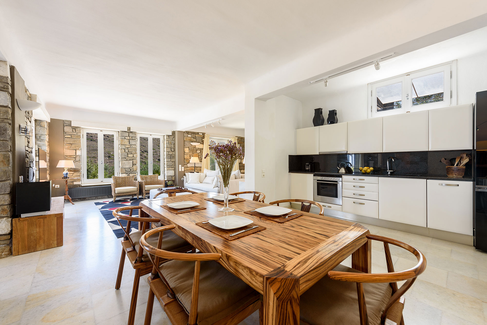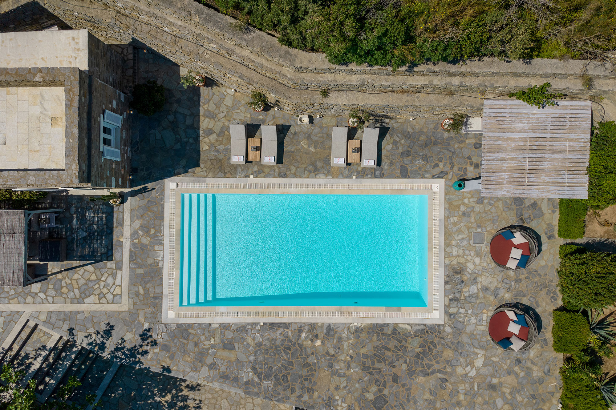 At one end, you can enjoy a stone table that seats six guests, screened by mature trees. There are plentiful cushioned steamer chairs, sun loungers, outdoor sofas to relax in, and an 11m swimming pool. At the far end of the terrace, you will find gazebo shades, cushioned banquettes and a nice spot to enjoy drinks and watch the sunset over the sea.