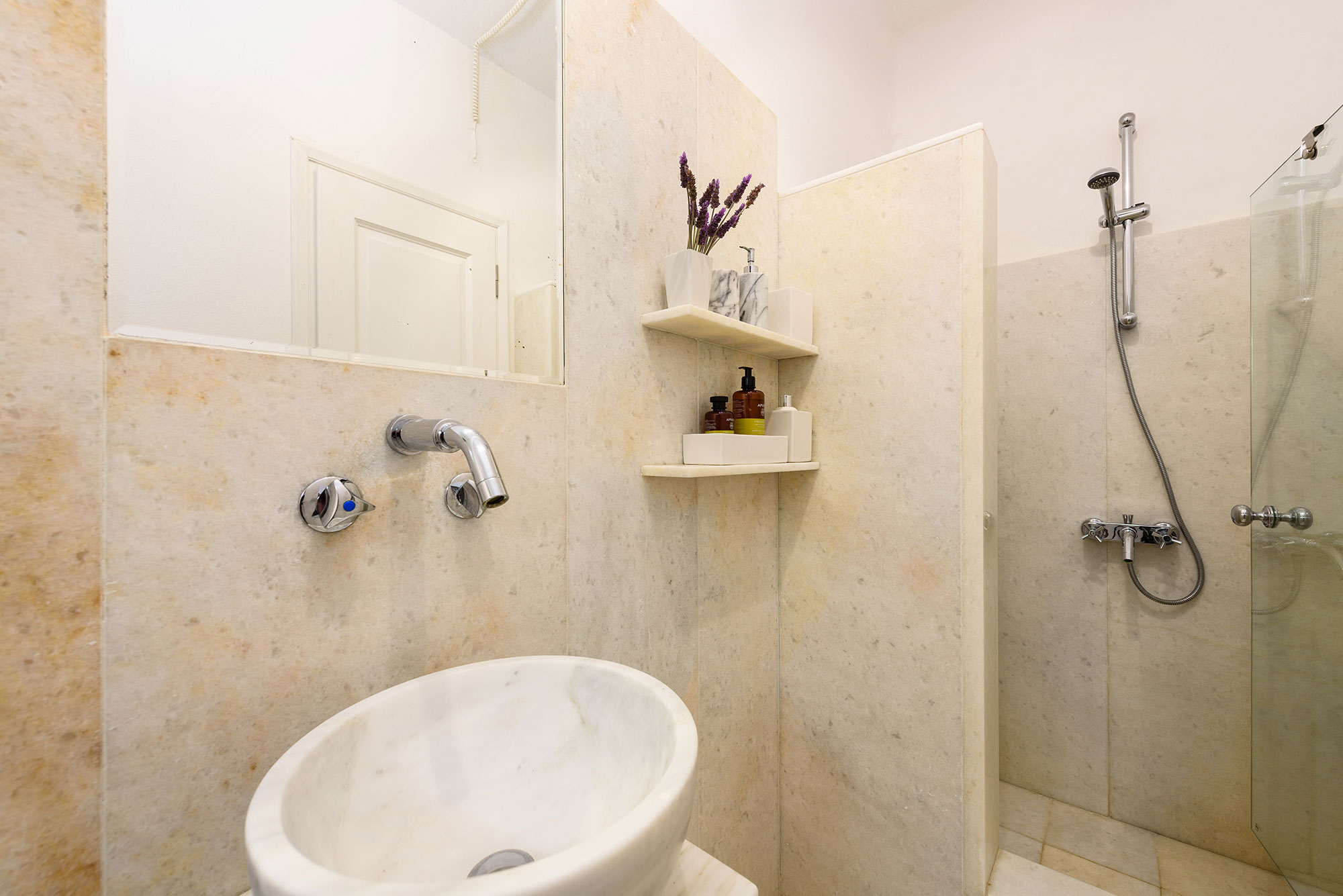 On the ground floor, an open-plan living space consists of a kitchen, living and dining areas with exposed stone walls, Persian rugs, a dining table for six, comfortable seating, and French doors onto the terrace. Two of the ensuite bedrooms are also on this floor. The master suite is on the first floor and has a private roof terrace. All bedrooms have sea views and modern shower rooms.