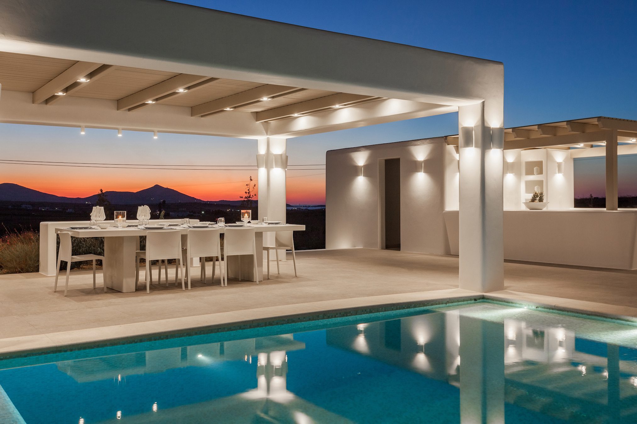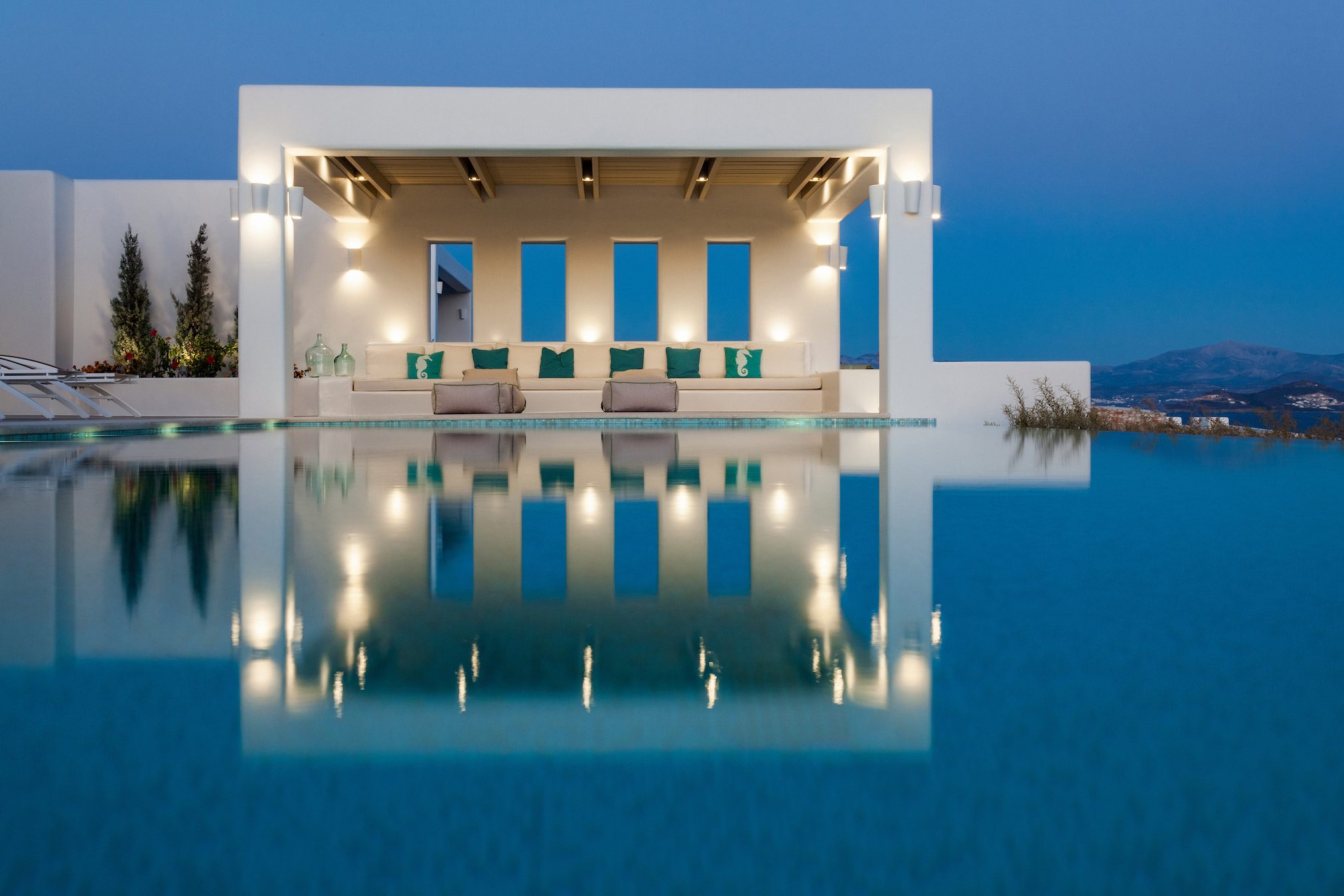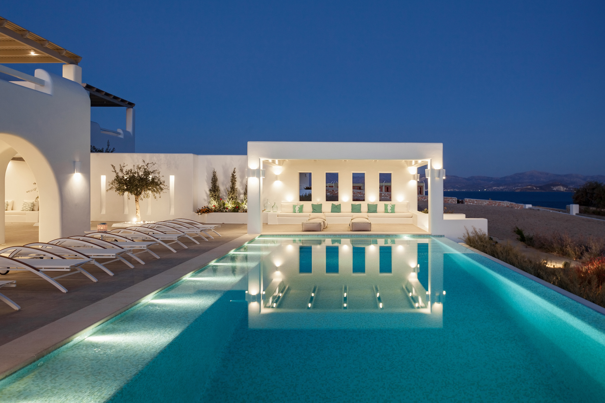 Expansive terraces provide luxurious lounge areas, a shaded dining table for 16, an outdoor kitchen and bar, and a barbecue. Plump cushions and sun loungers surround the sparkling infinity pool, which is beautifully lit at night, creating the perfect setting for enjoying stunning sunsets over the Aegean.