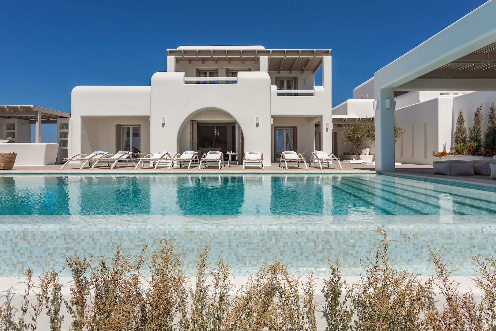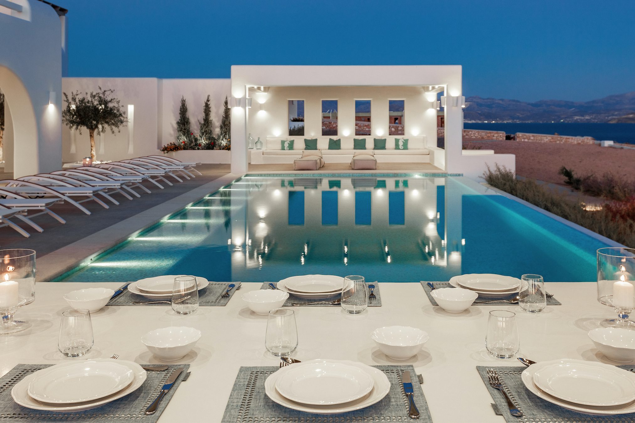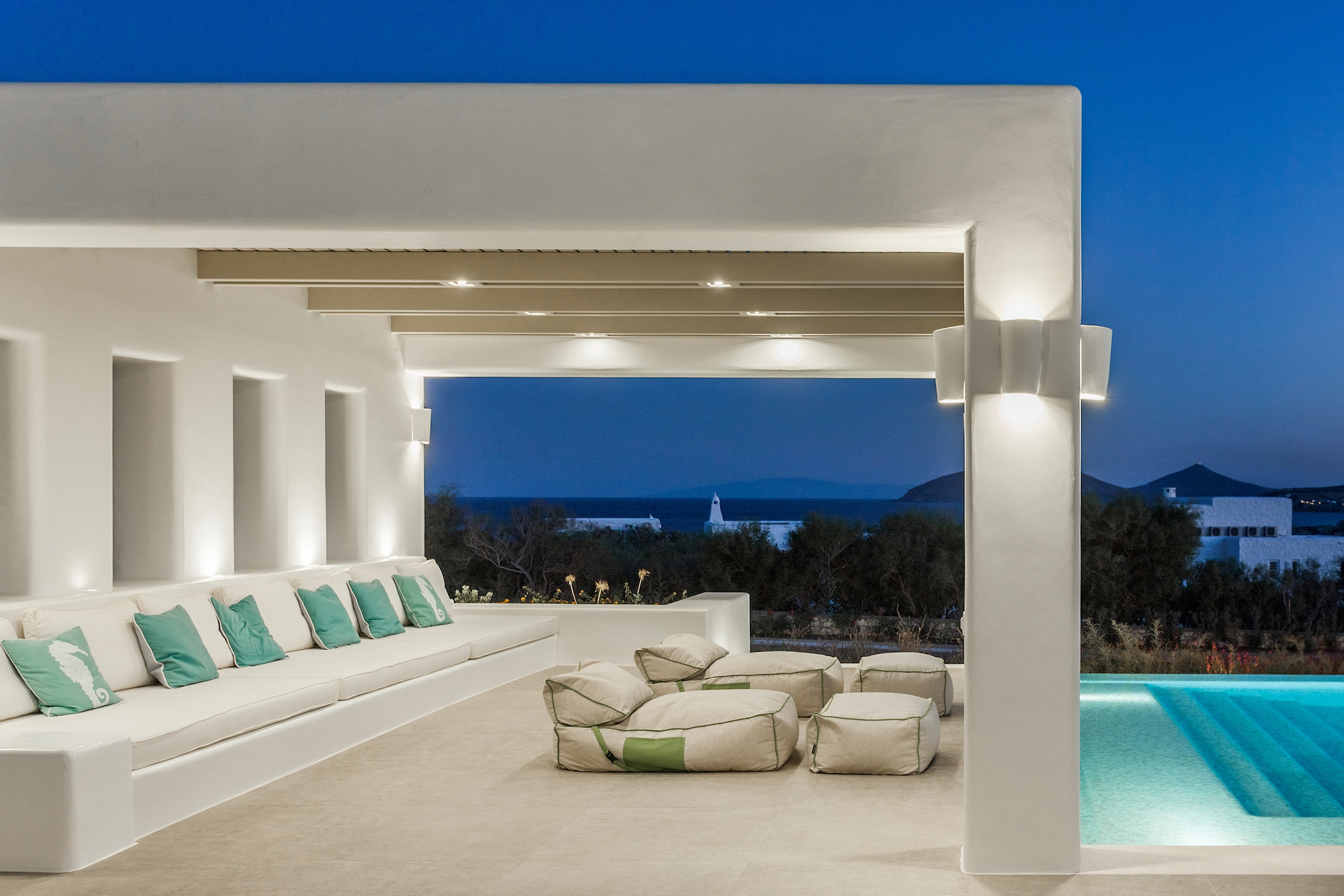 Expansive terraces provide luxurious lounge areas, a shaded dining table for 16, an outdoor kitchen and bar, and a barbecue. Plump cushions and sun loungers surround the sparkling infinity pool, which is beautifully lit at night, creating the perfect setting for enjoying stunning sunsets over the Aegean.