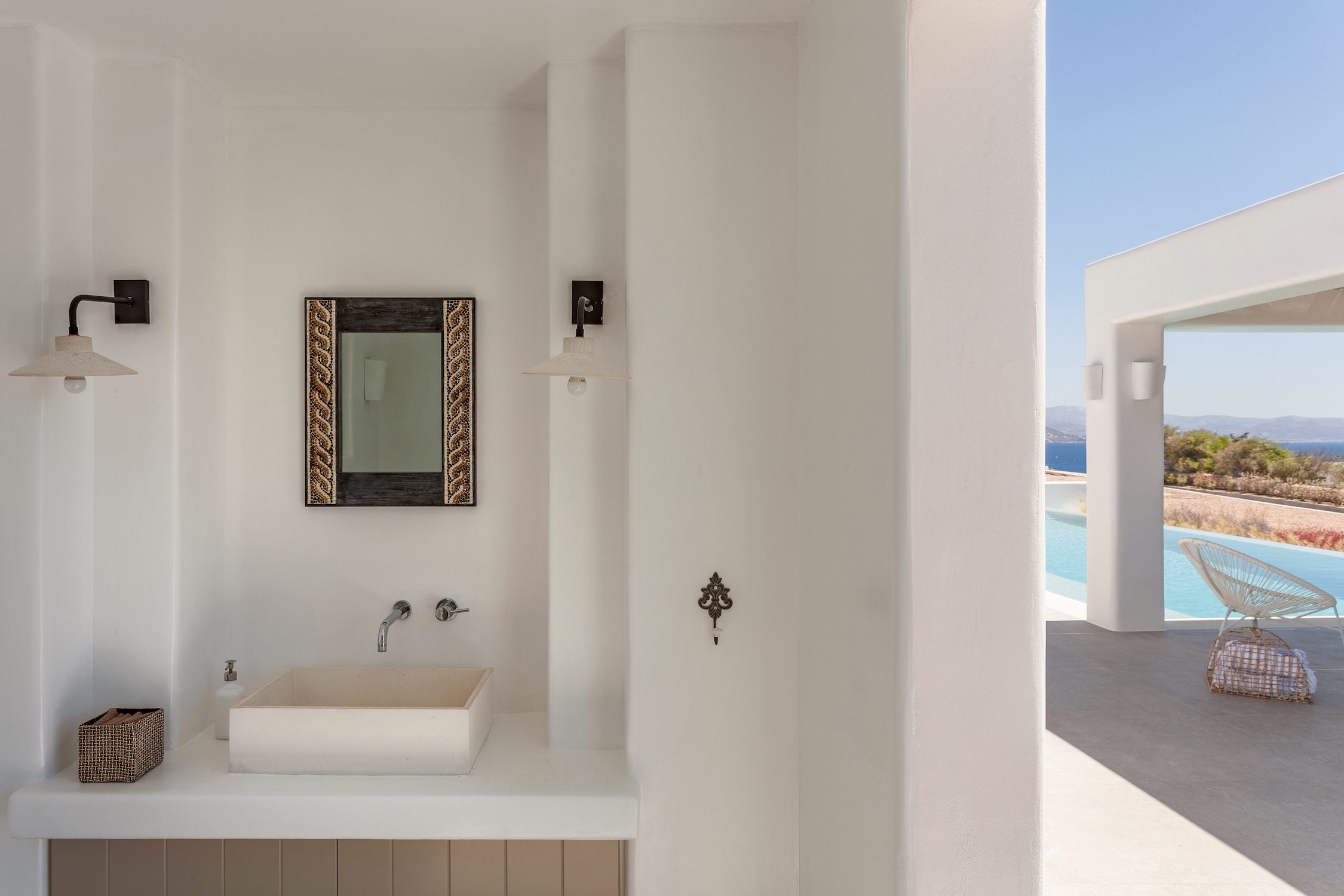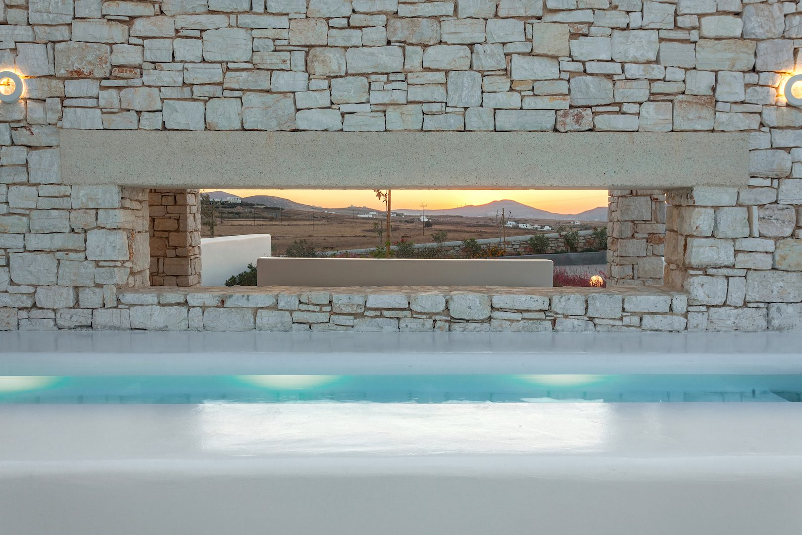 The design elegantly blends modern architectural details with the traditional whitewashed Cycladic style. With stunning views across the Aegean Sea towards Naxos, the villa offers a peaceful retreat while being just a short drive from the bustling harbour village of Naoussa, known for its vibrant atmosphere and excellent seafood restaurants. For larger groups, Villa Alpha can be rented alongside Villa Gamma.