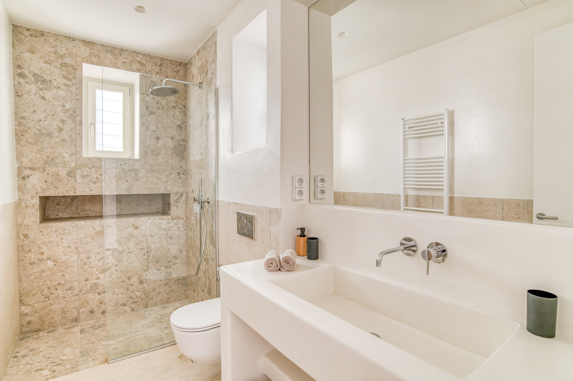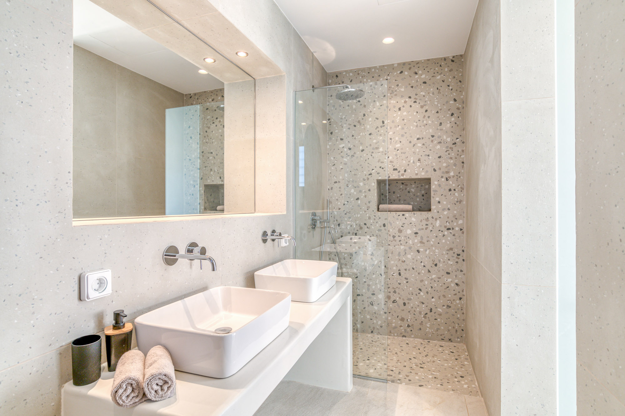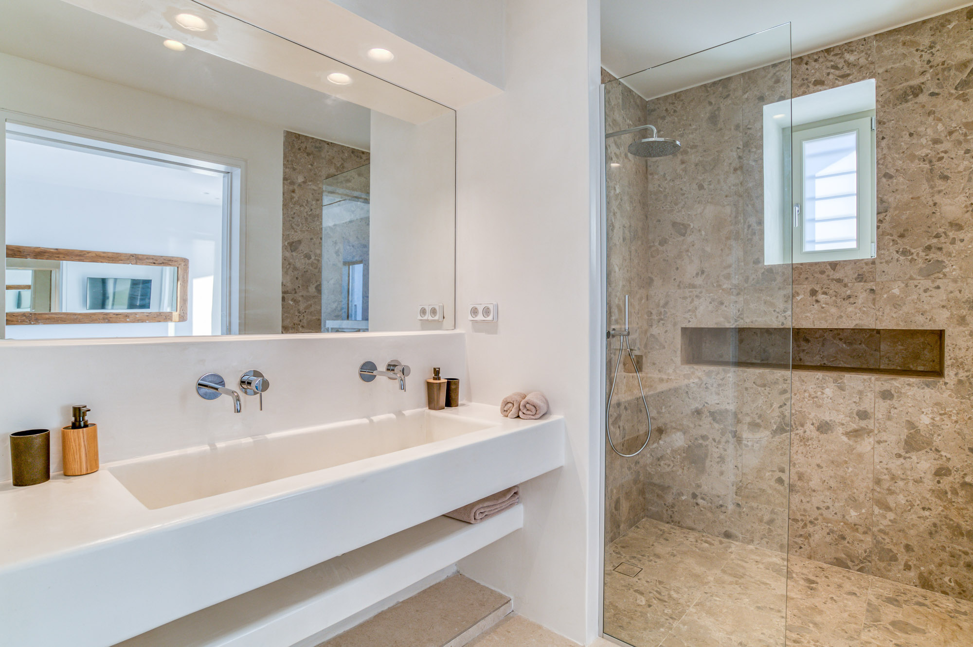 Pale colours and simple, clean-lined furnishings create calm, harmonious living spaces that feel cool and spacious. The ground floor of the main house features a large open-plan living and dining area with doors to the terrace, a well-equipped kitchen and 3 elegantly decorated double en-suite bedrooms. The top floor hosts two double en-suite bedrooms open to voluminous balconies, breathing in the awe-inspiring views of the sea and surrounding area. The separate one-bedroom guesthouse for two has a bathroom, kitchenette, and private verandah.