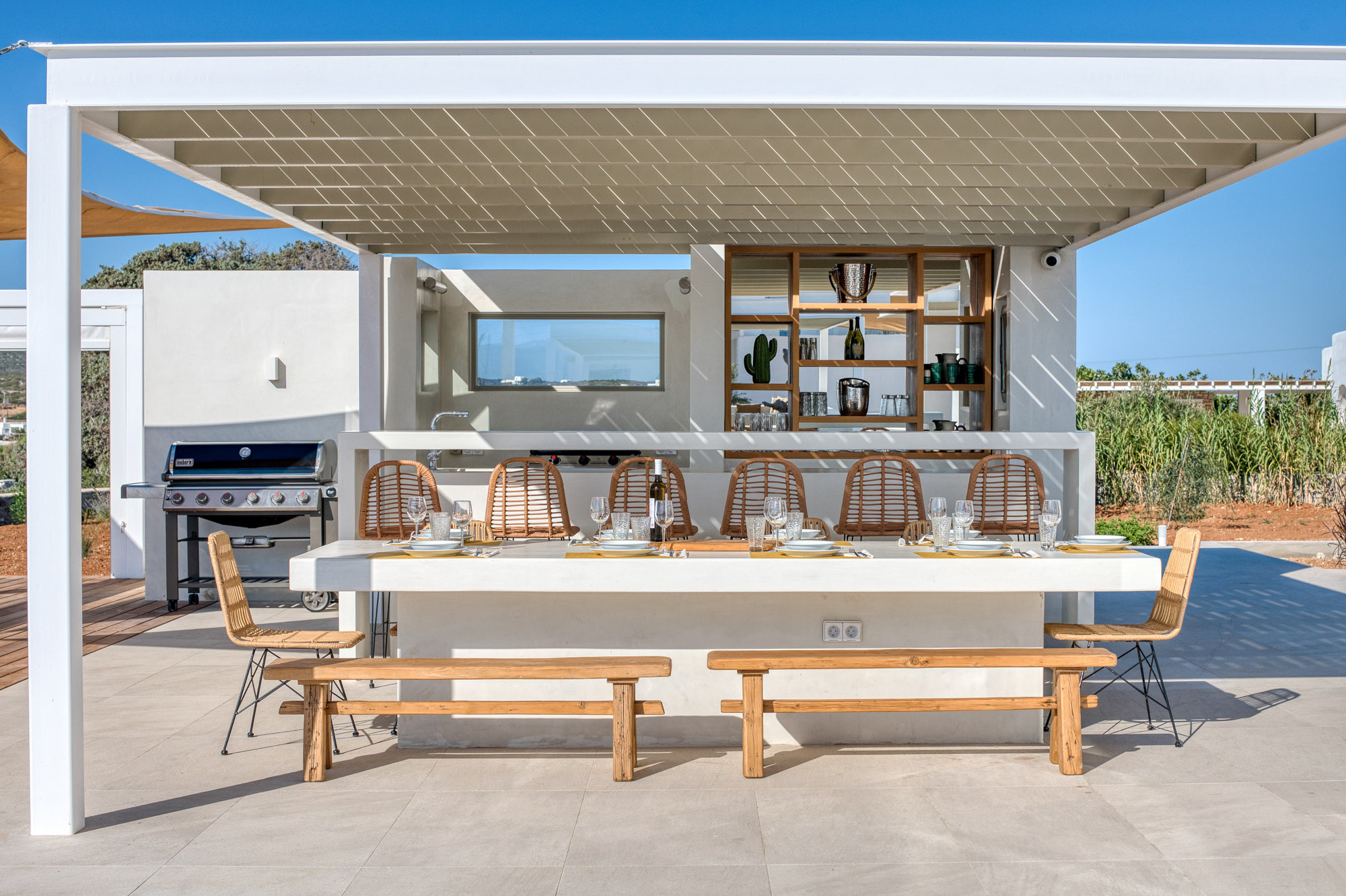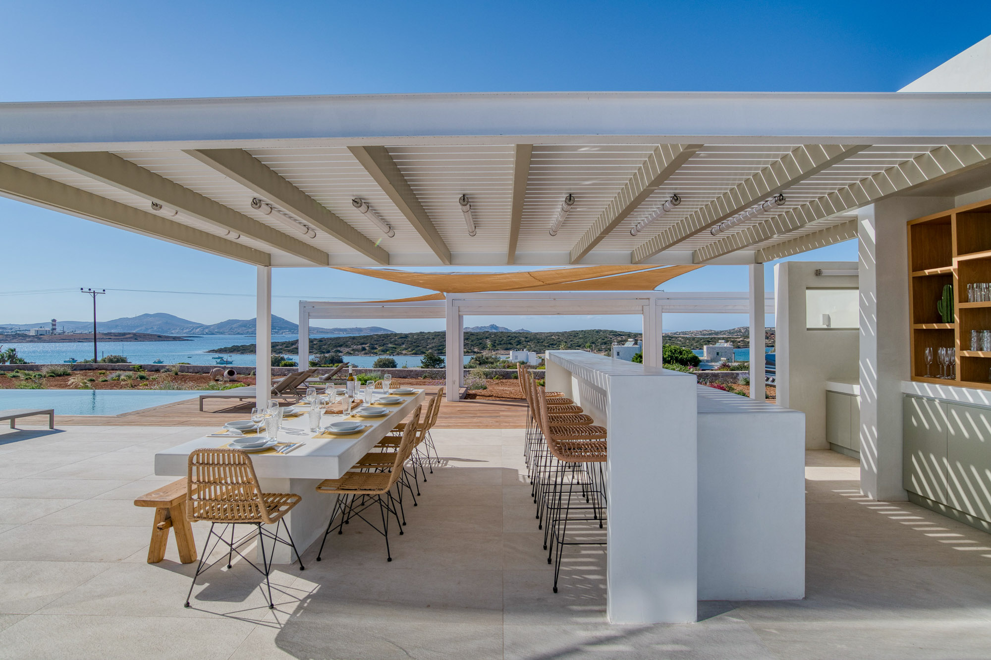 The pool area, fringed by sun loungers and a broad deck, is an ideal spot to enjoy both the sun and the view. A shaded pergola connects the house to the poolside, where a stone dining table and barbecue provide a relaxed setting for open-air meals. A bar and lounge area invite guests to unwind or gather as the day turns to evening.