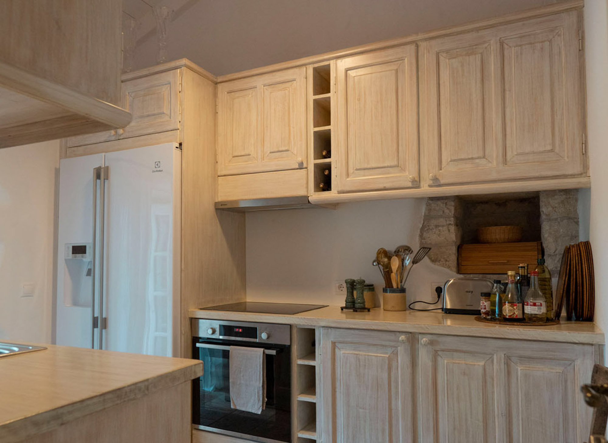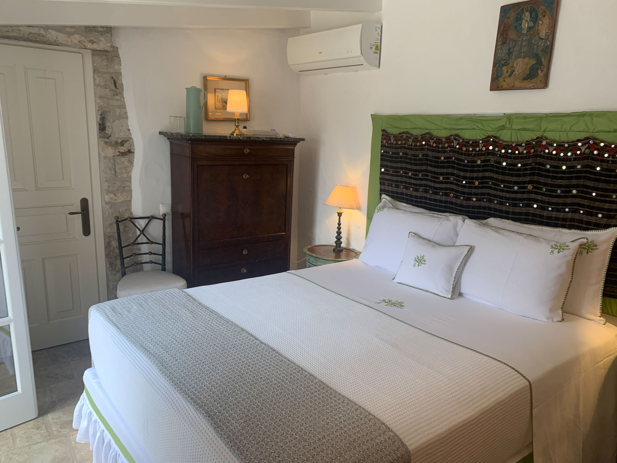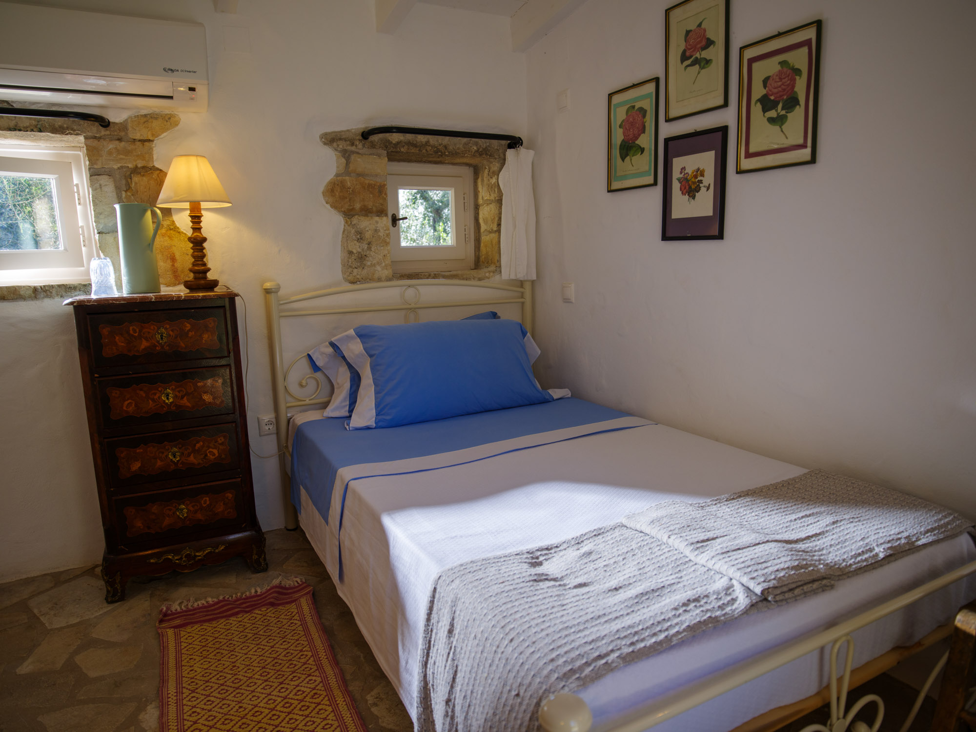 The main house includes a cosy living room with a corner dining area, windows overlooking both the front patio and back garden, and a library with serene sea views. The main bedroom features low ceilings, century-old walls, and a small en-suite bathroom with a built-in bathtub and powerful shower. A charming kitchen with garden access completes the main house. Downstairs, the second bedroom offers stunning views over Lakka and the valley through French windows and includes an en-suite bathroom with a shower. A separate garden shed has been converted into a tiny but charming guest bedroom, shaded by vine trees and complete with an en-suite bathroom.