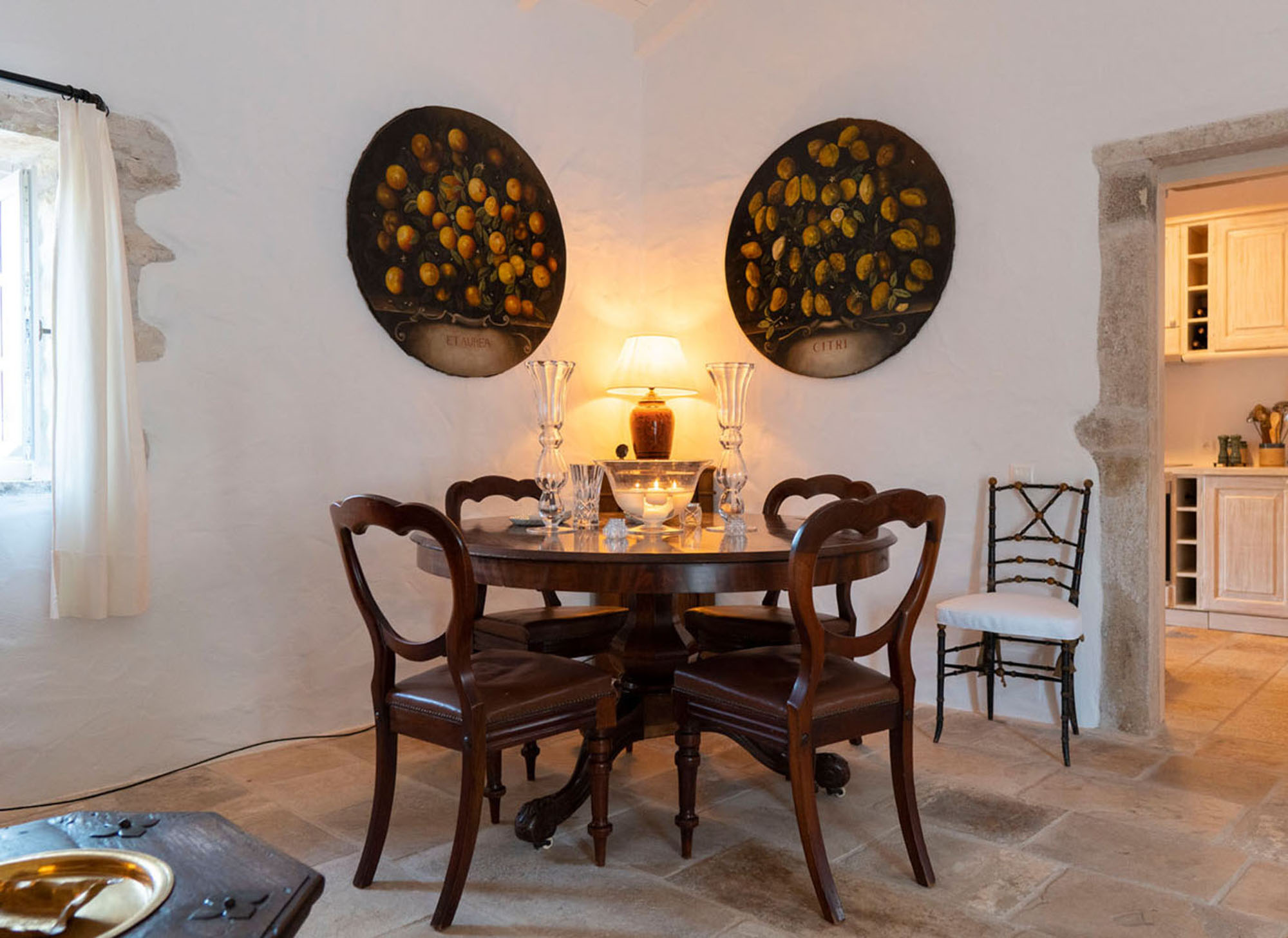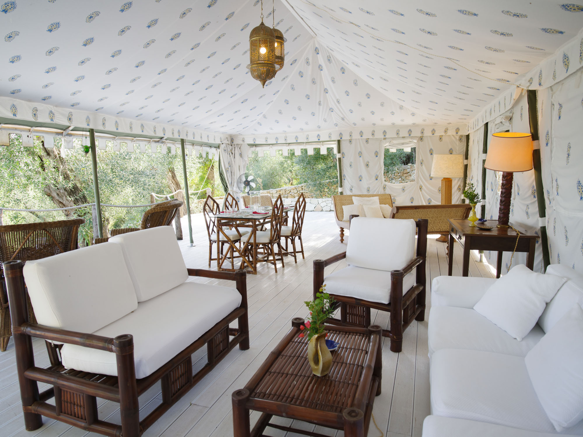 The main patio is perfect for enjoying meals or simply taking in the surrounding beauty. A 14-metre swimming pool, bordered by a utility room for convenience, is ideal for refreshing dips. On the opposite side of the house, a wooden deck offers a serene spot to soak in the picturesque valley and seaside views. The lush garden, dotted with ancient olive trees and vine-covered nooks, creates a private and tranquil environment for guests to unwind.