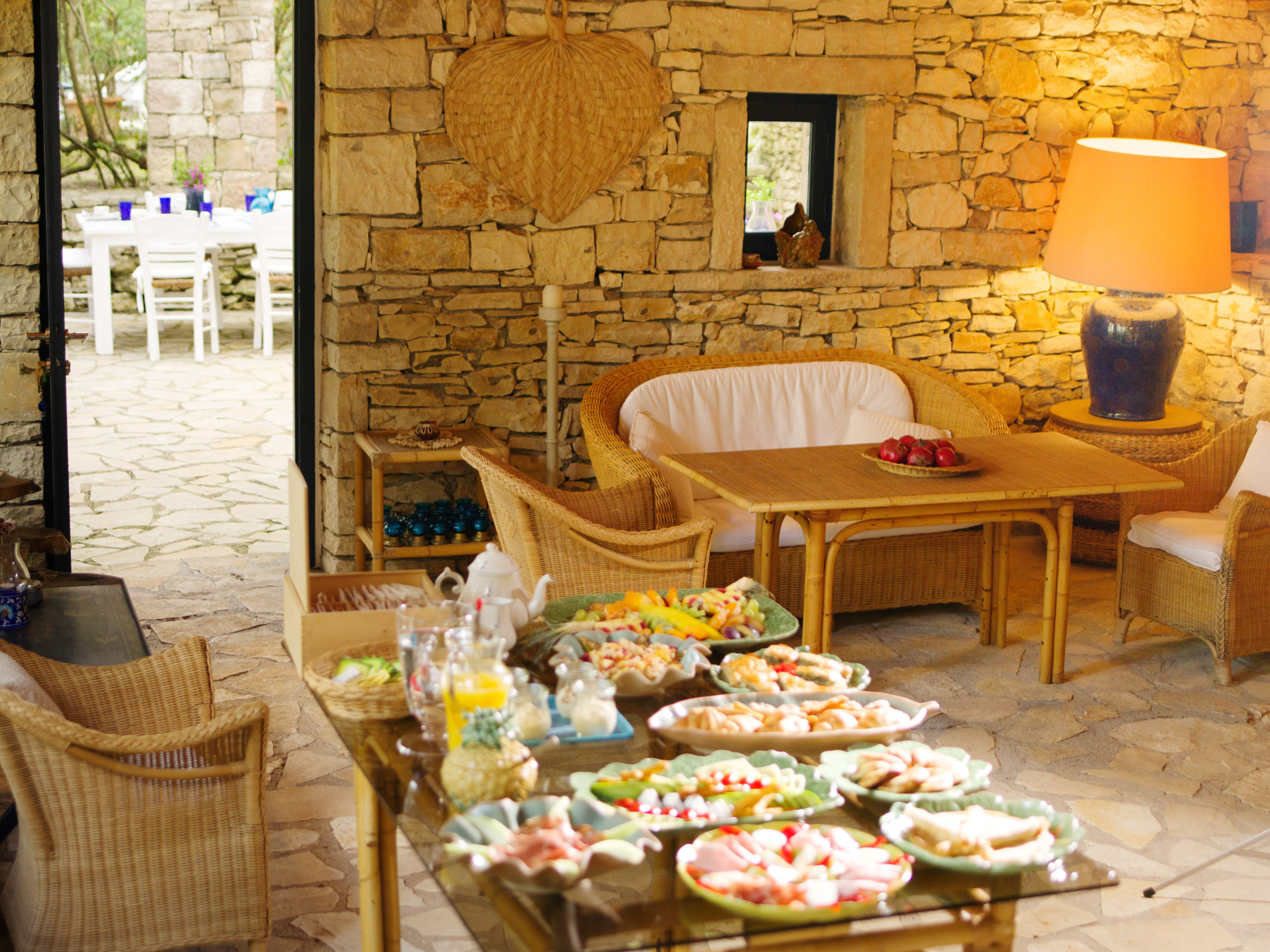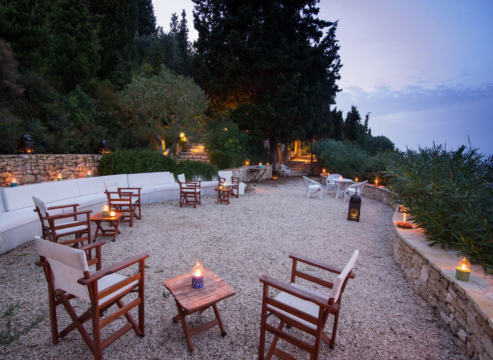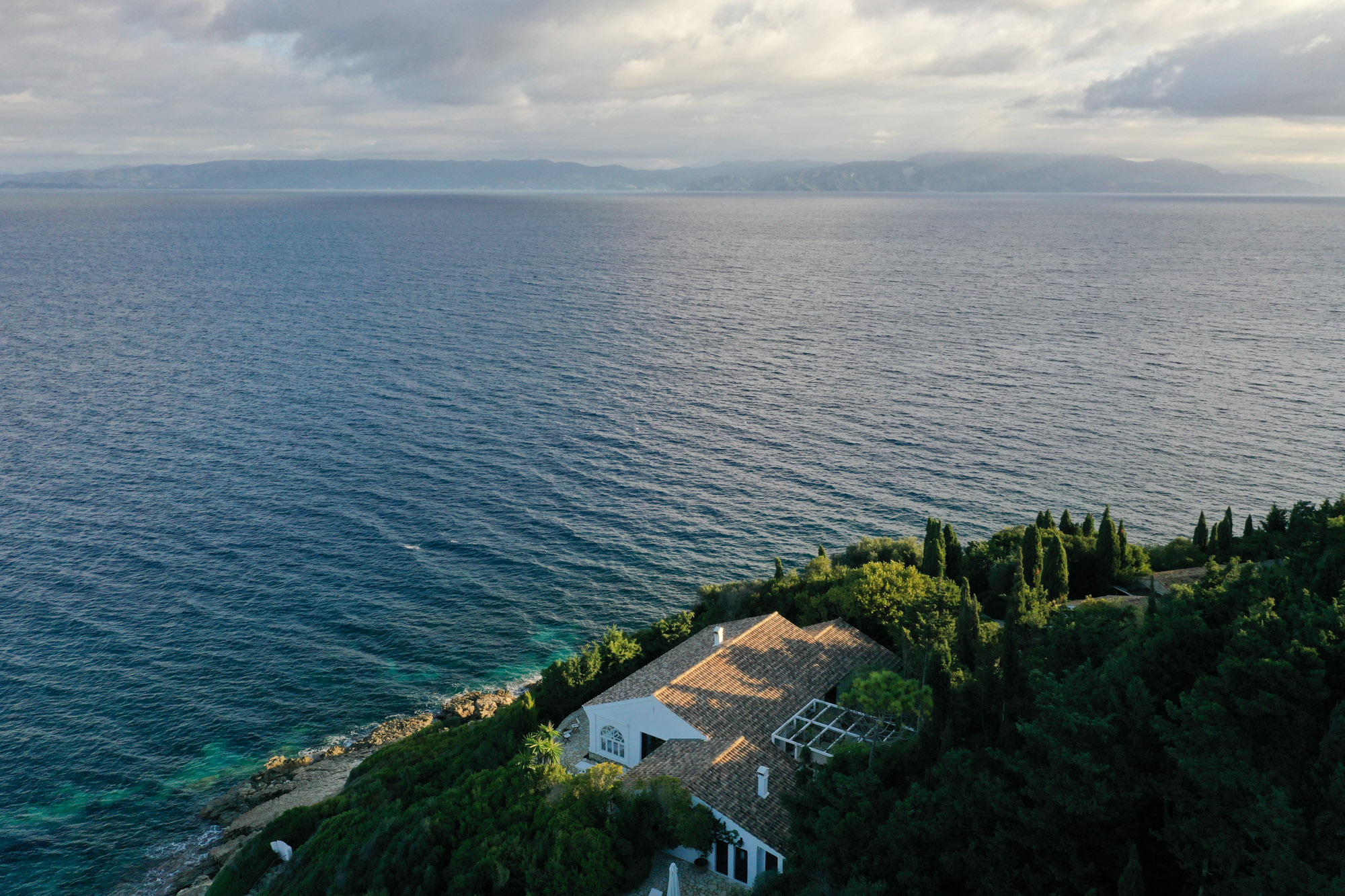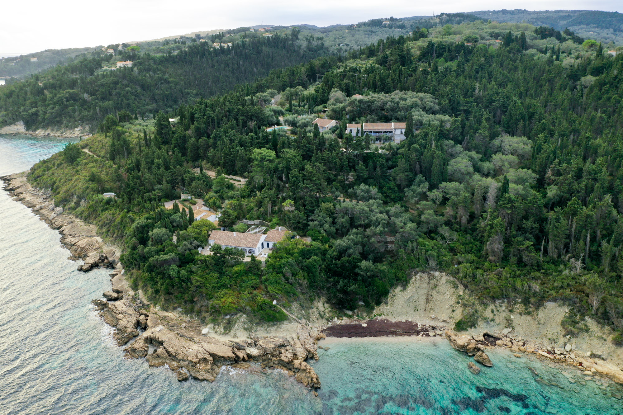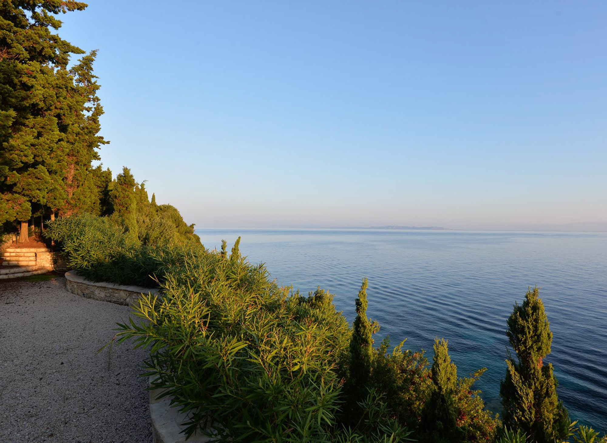 With the beach just steps away, there’s no need for a swimming pool, as the inviting waters of the Ionian Sea are always within reach. The property features two dining areas, a breakfast table, and numerous sitting areas and lounges, offering ample room for both shared gatherings and peaceful retreats.The landscaped gardens, filled with fragrant Mediterranean shrubs and shaded by tall cypress trees, create a tranquil ambiance. Down by the sea, a chic sunbathing terrace with shaded sails and plentiful seating provides the perfect place for unwinding, whether enjoying pre-dinner drinks or simply soaking up the views.