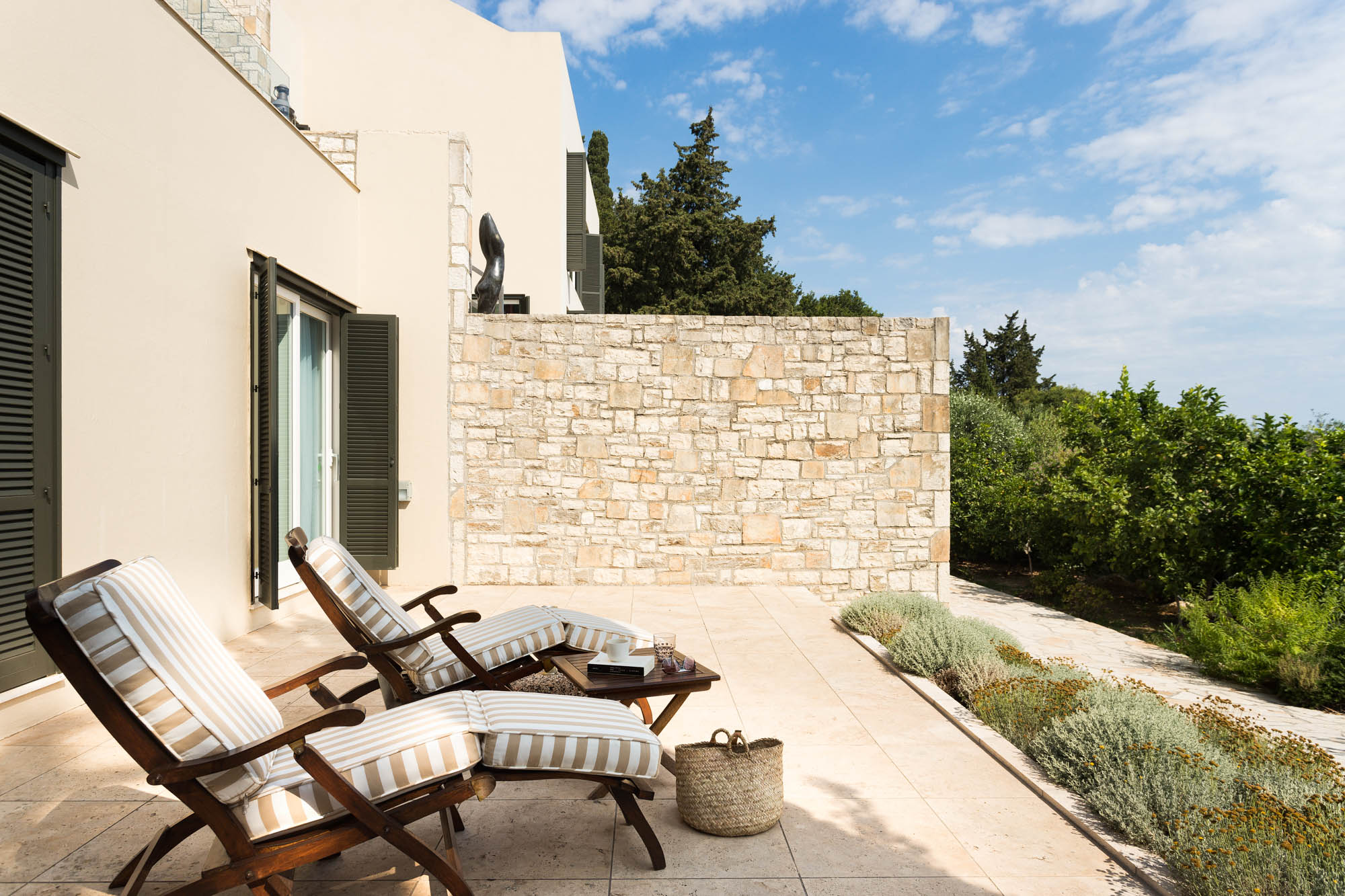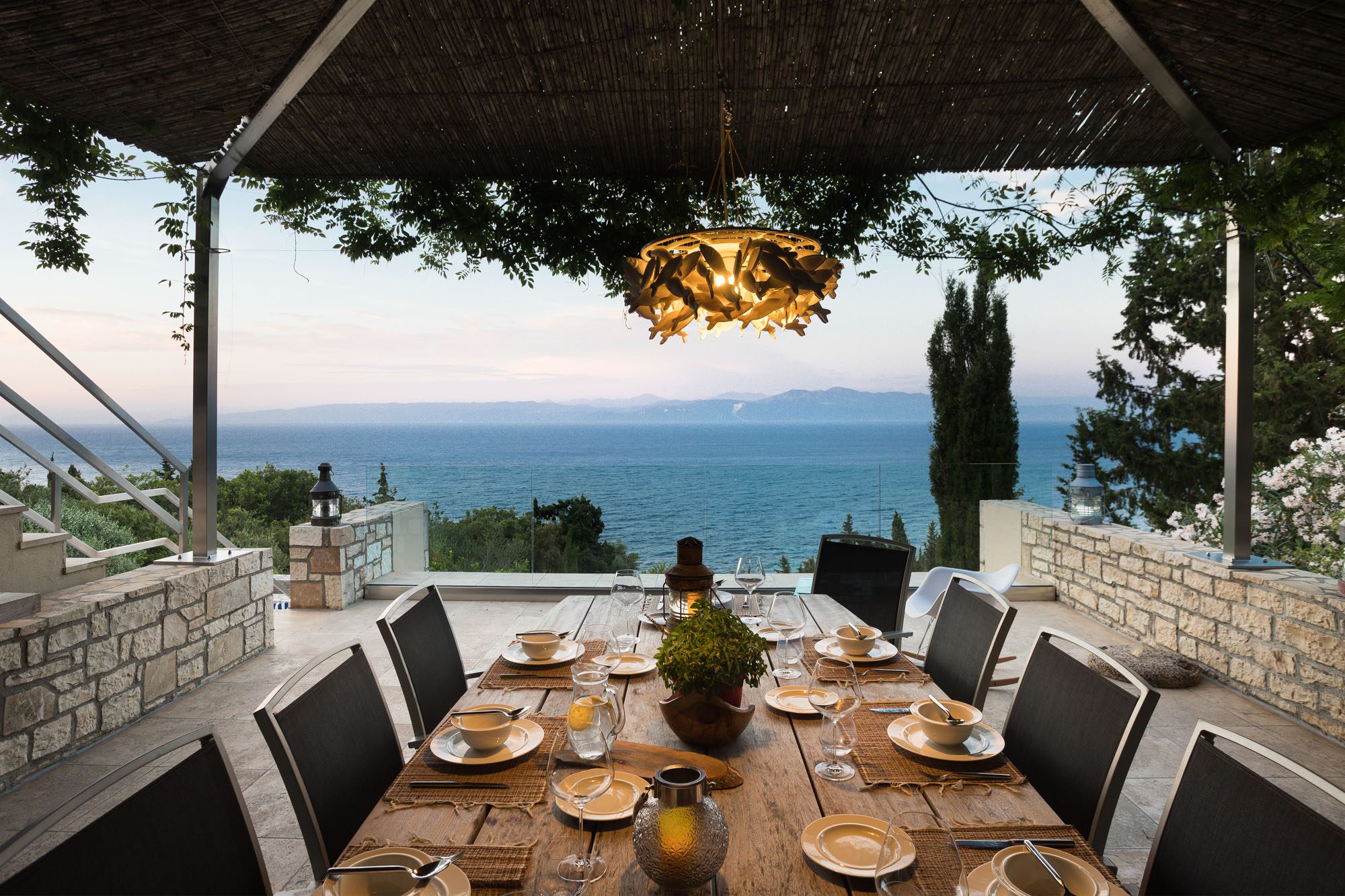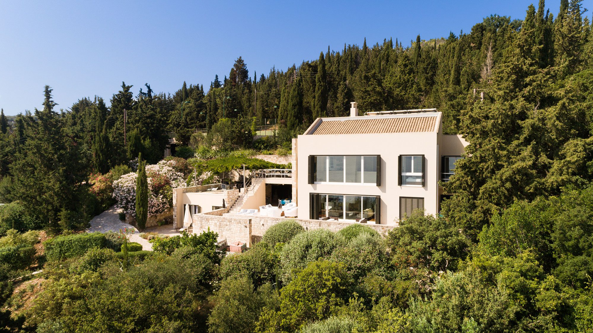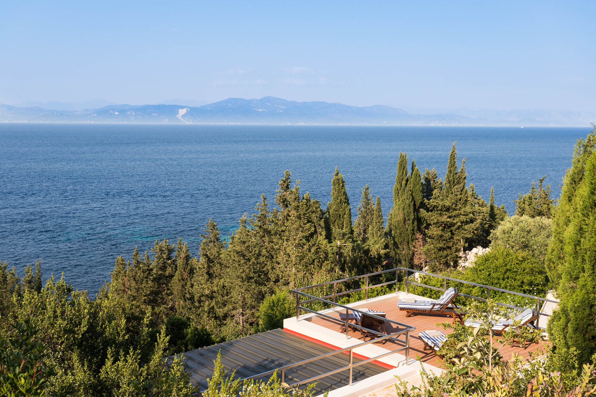 It's in a secluded spot on the east coast of Paxos but just a short drive to the villages of Loggos and Lakka. You can wander down the hillside path, ending in steps, to your own secluded cove with crystal blue waters and a little beach.