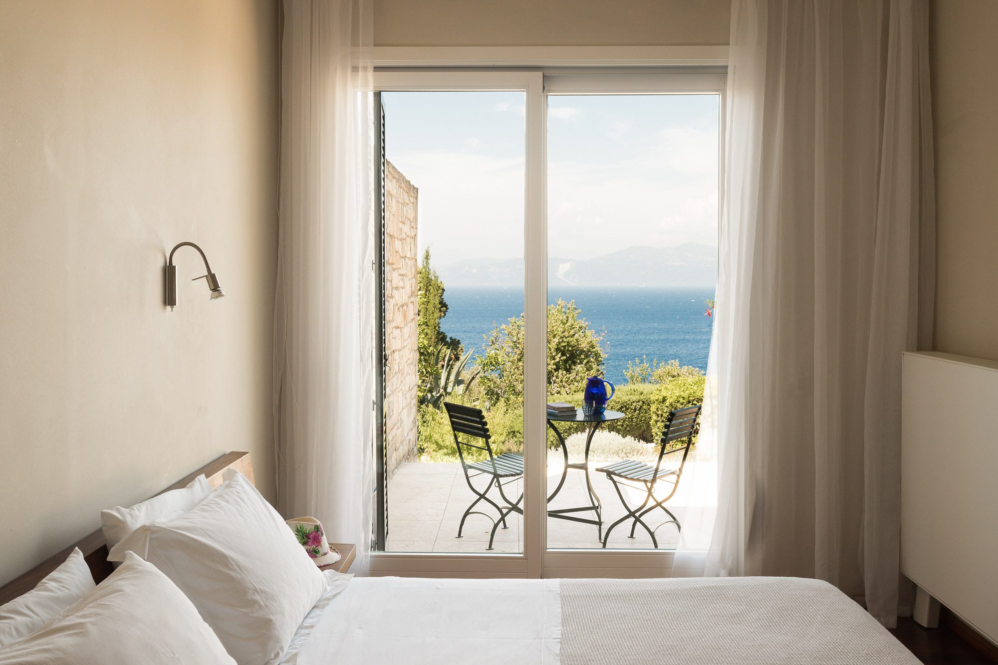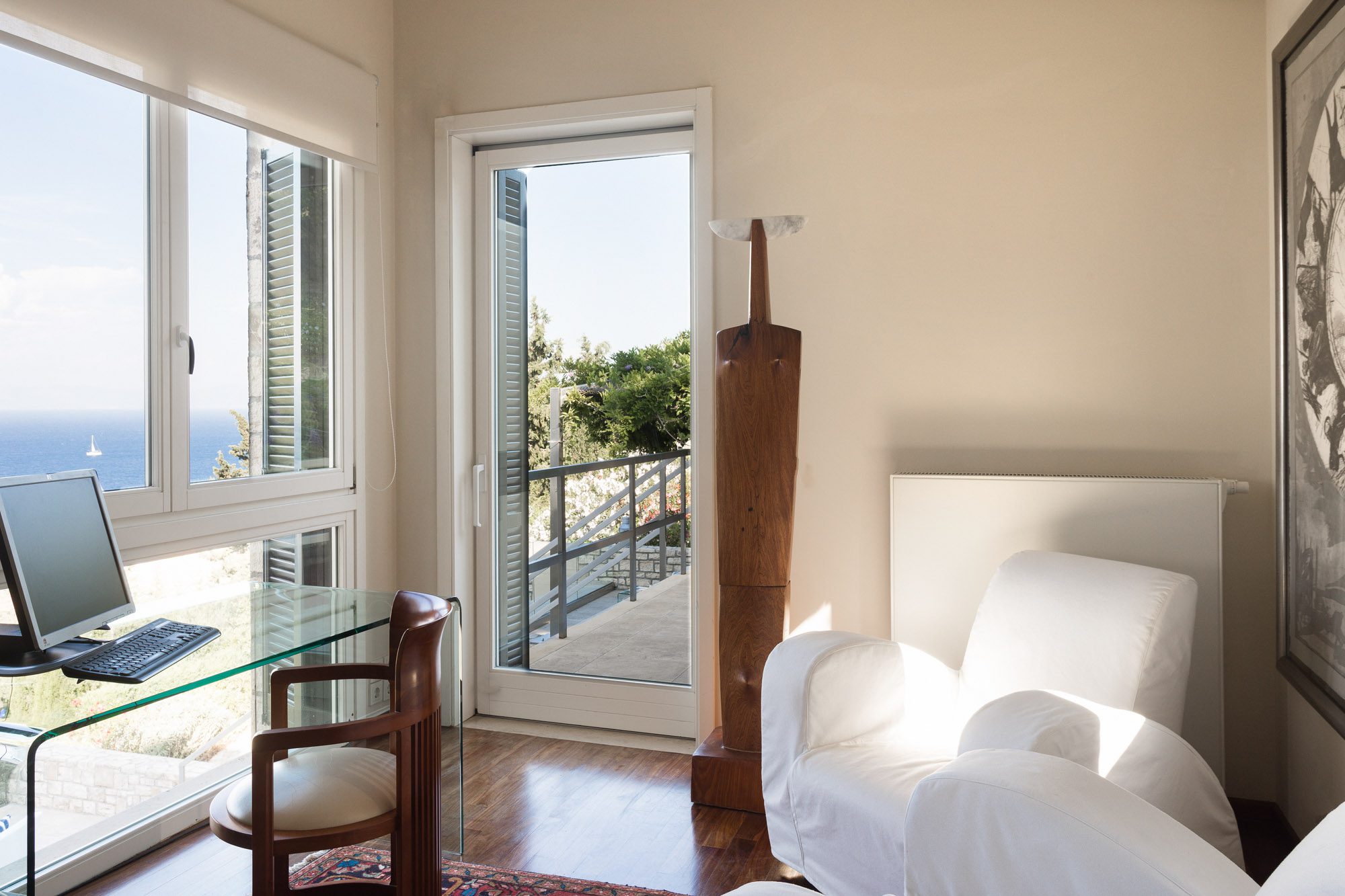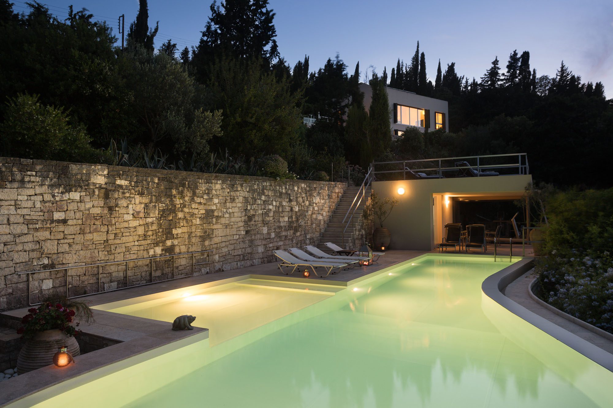 It's in a secluded spot on the east coast of Paxos but just a short drive to the villages of Loggos and Lakka. You can wander down the hillside path, ending in steps, to your own secluded cove with crystal blue waters and a little beach.