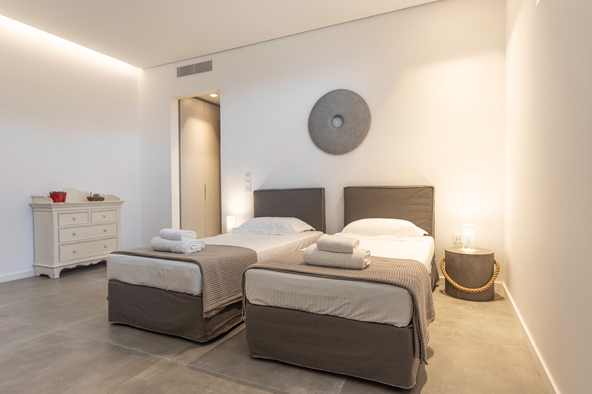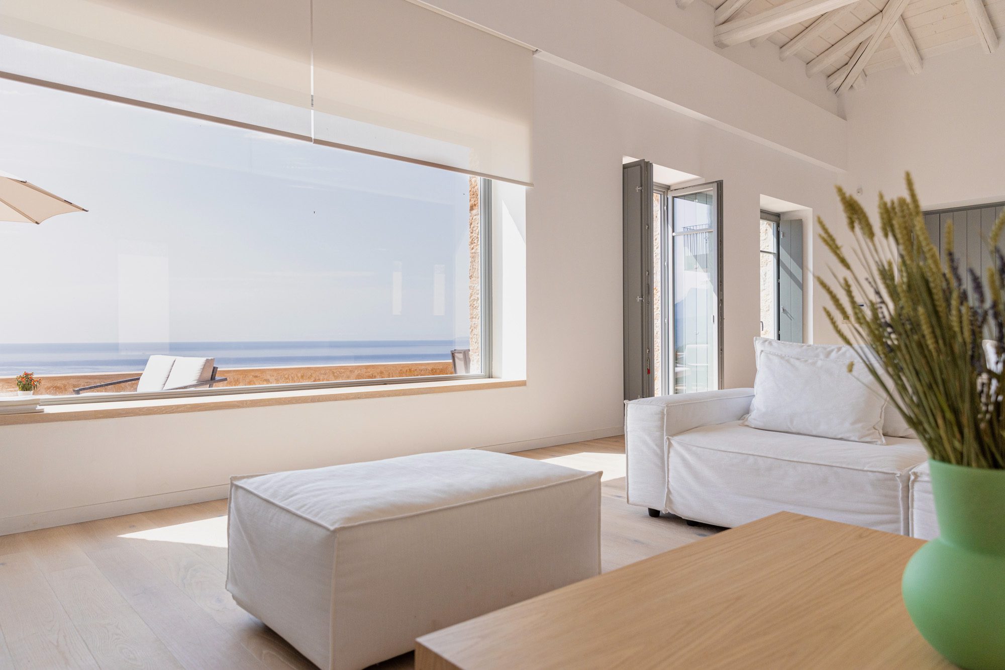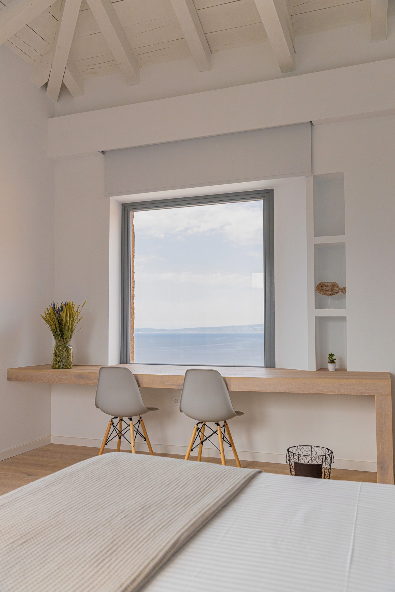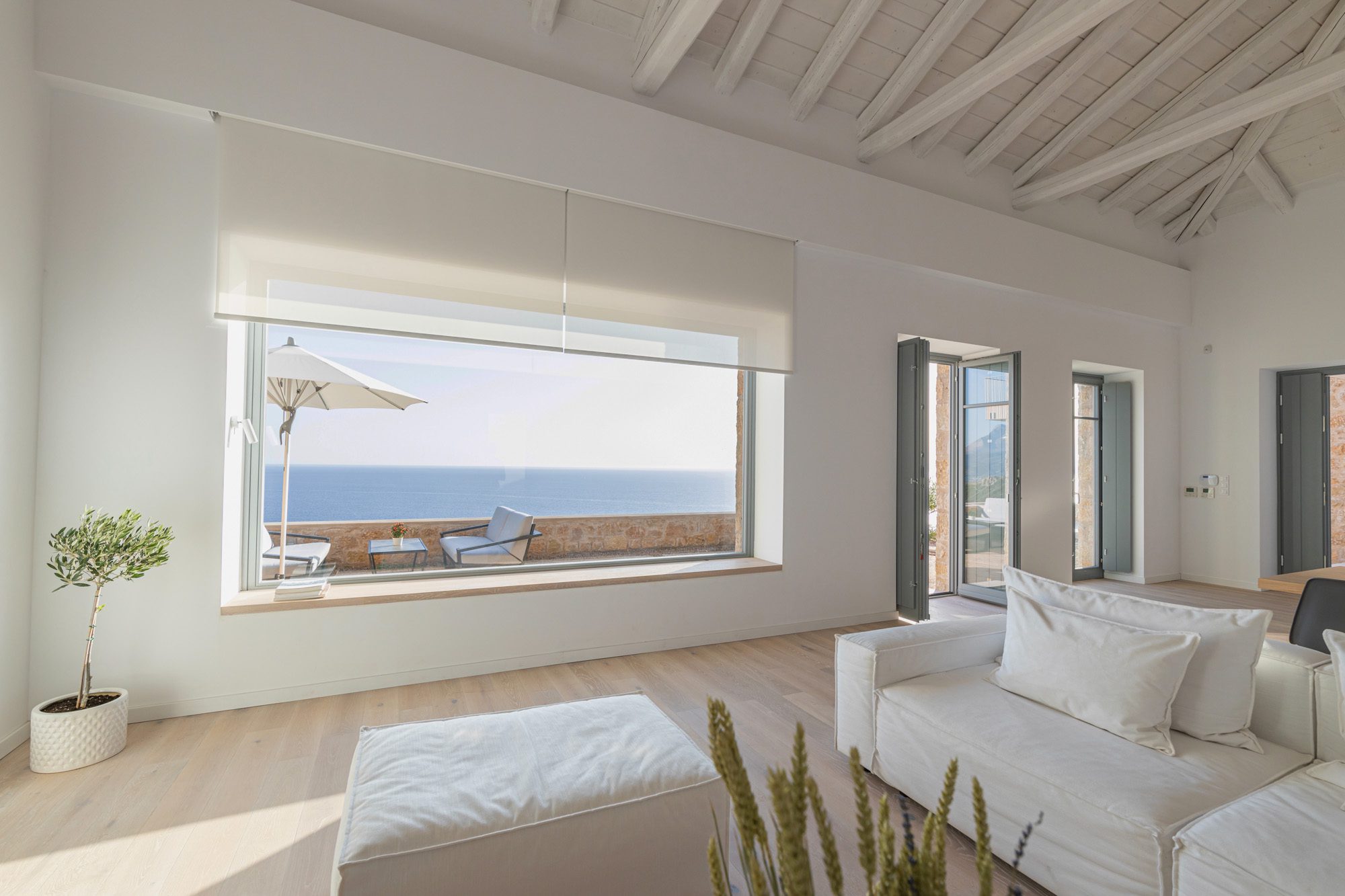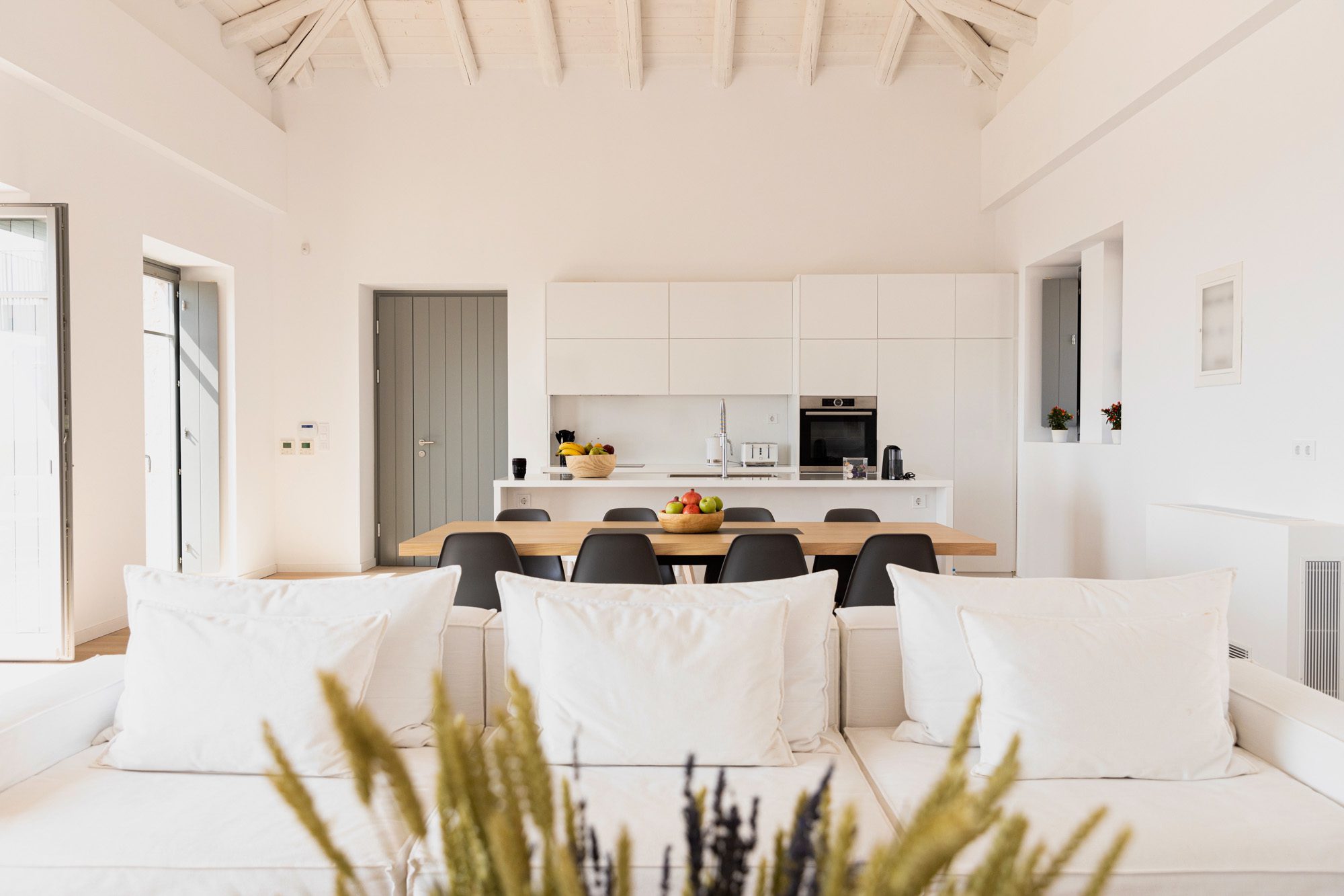 The pristine white, minimalist interiors are flooded with light, with lots of windows and doors looking out to sea and high-ceilinged open-plan living and dining spaces. Bathrooms are sleek and elegant, and beds are extremely comfortable. The ground and first-floor bedrooms have private balconies.