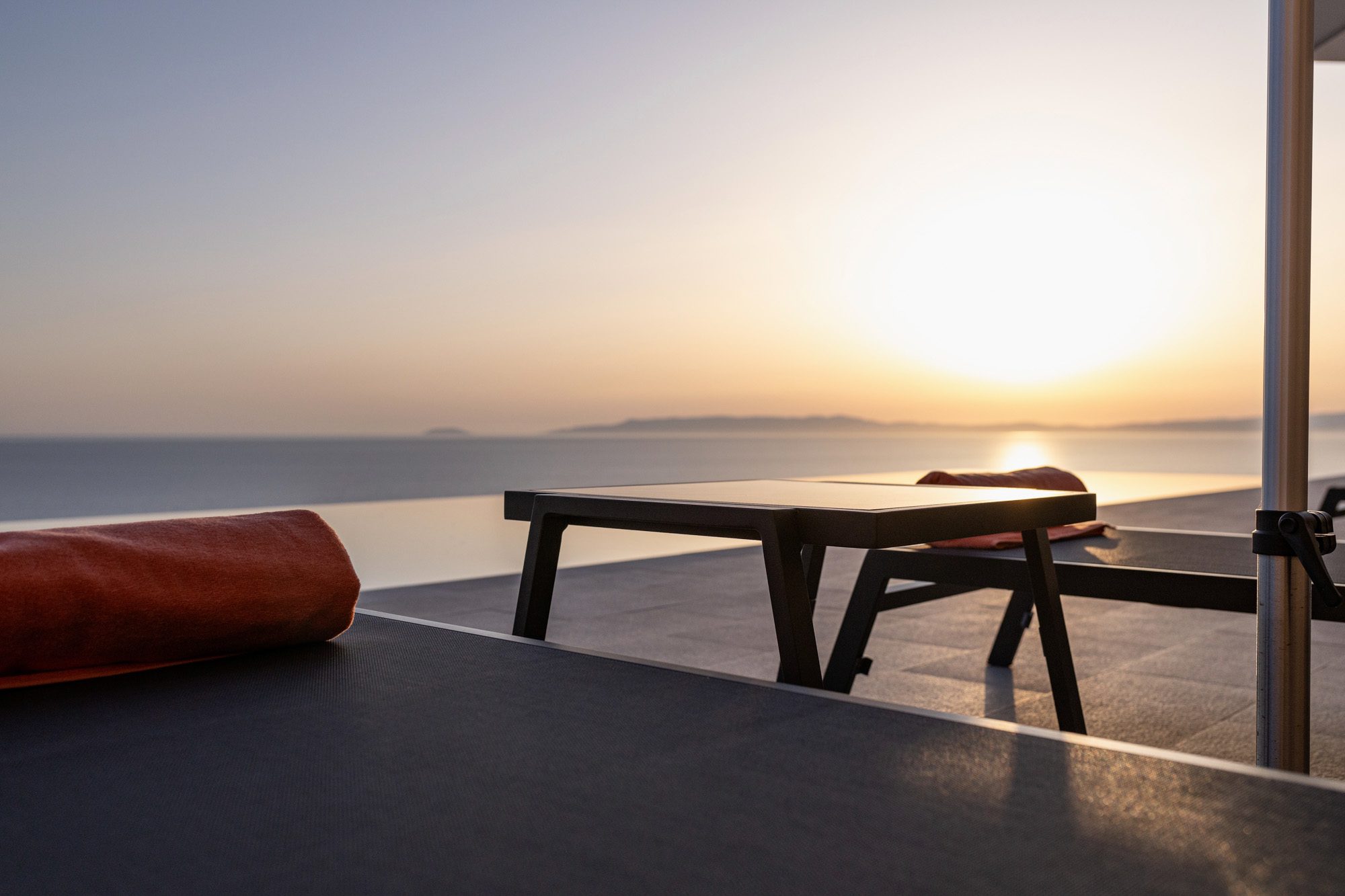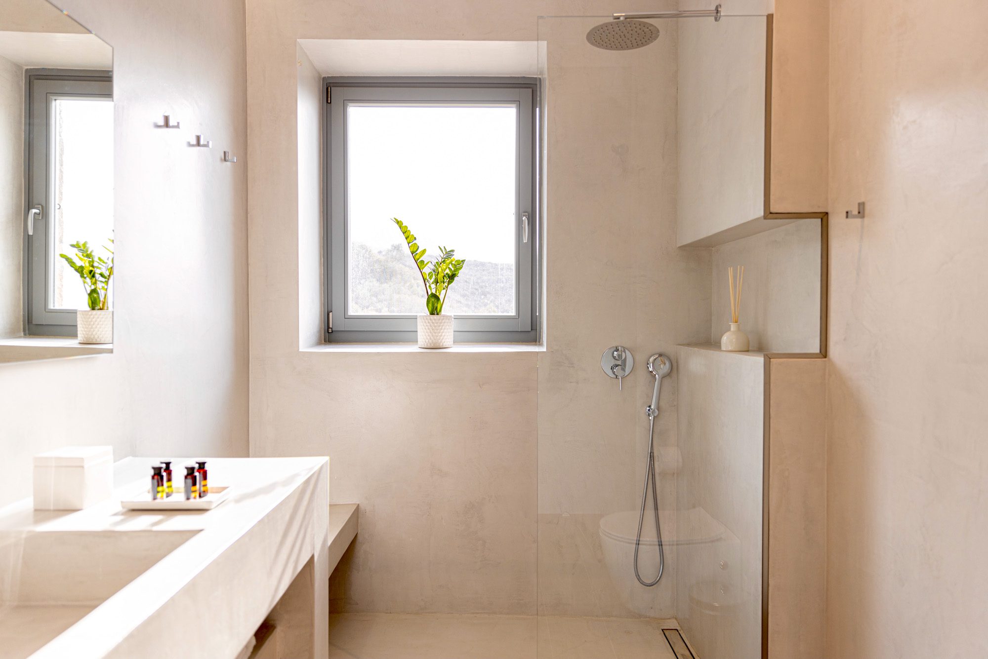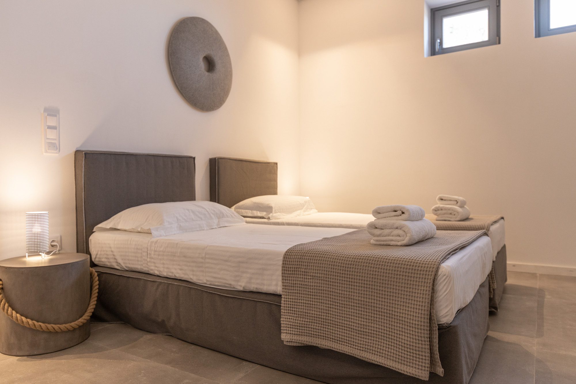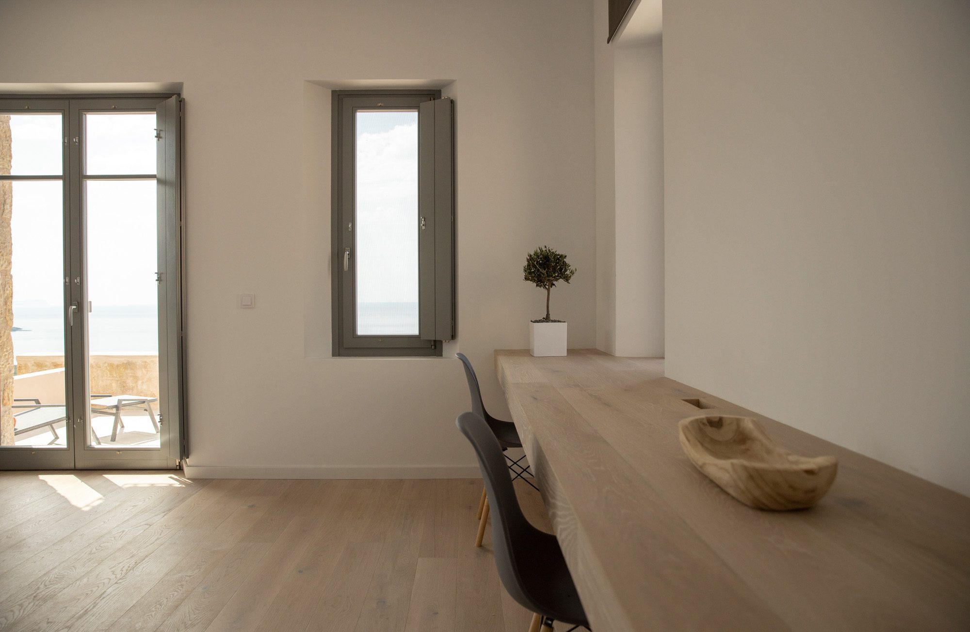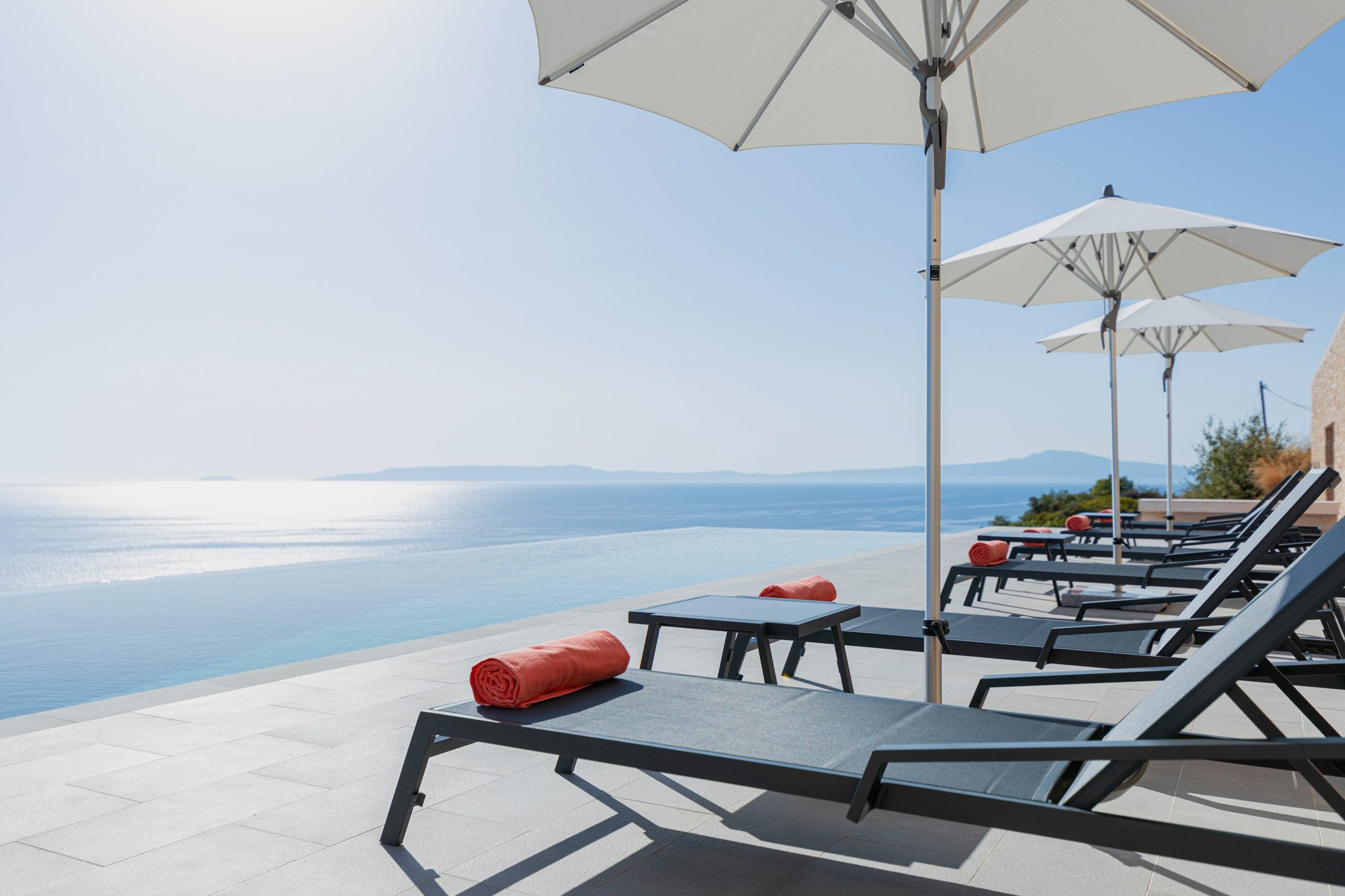 The pristine white, minimalist interiors are flooded with light, with lots of windows and doors looking out to sea and high-ceilinged open-plan living and dining spaces. Bathrooms are sleek and elegant, and beds are extremely comfortable. The ground and first-floor bedrooms have private balconies.