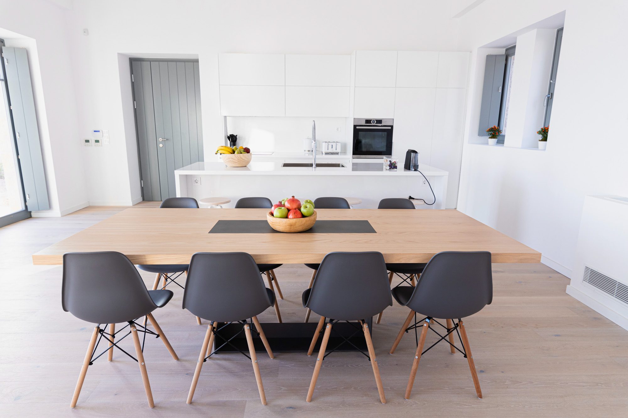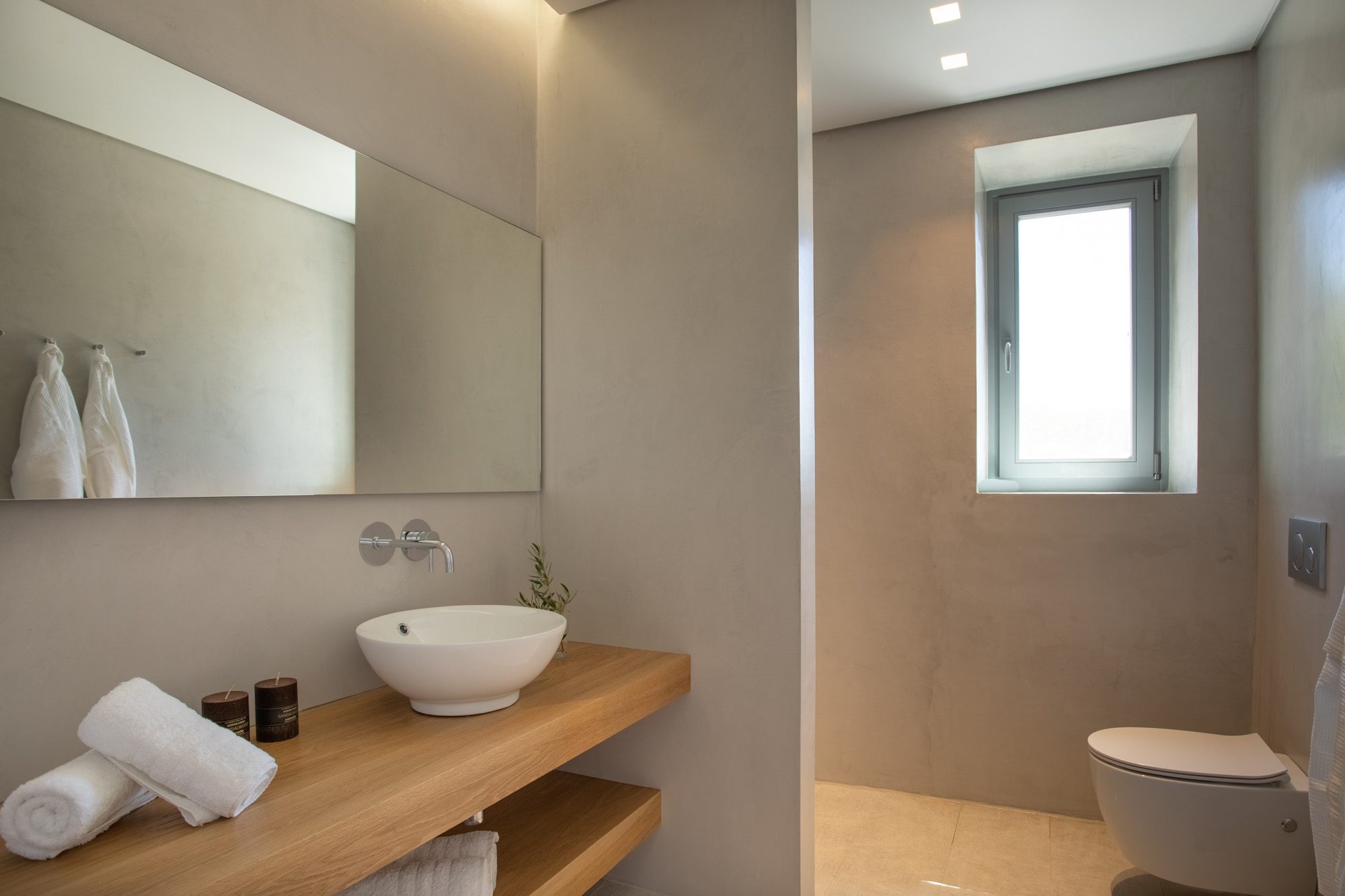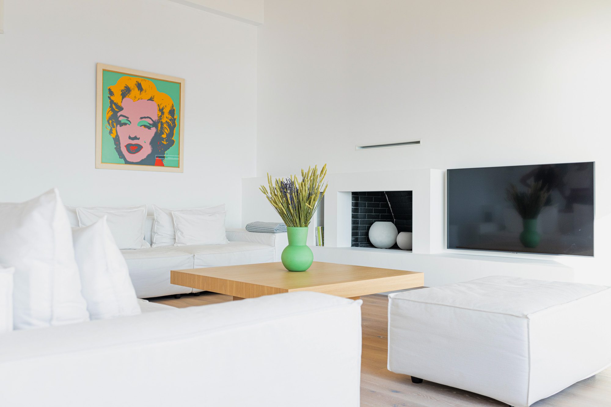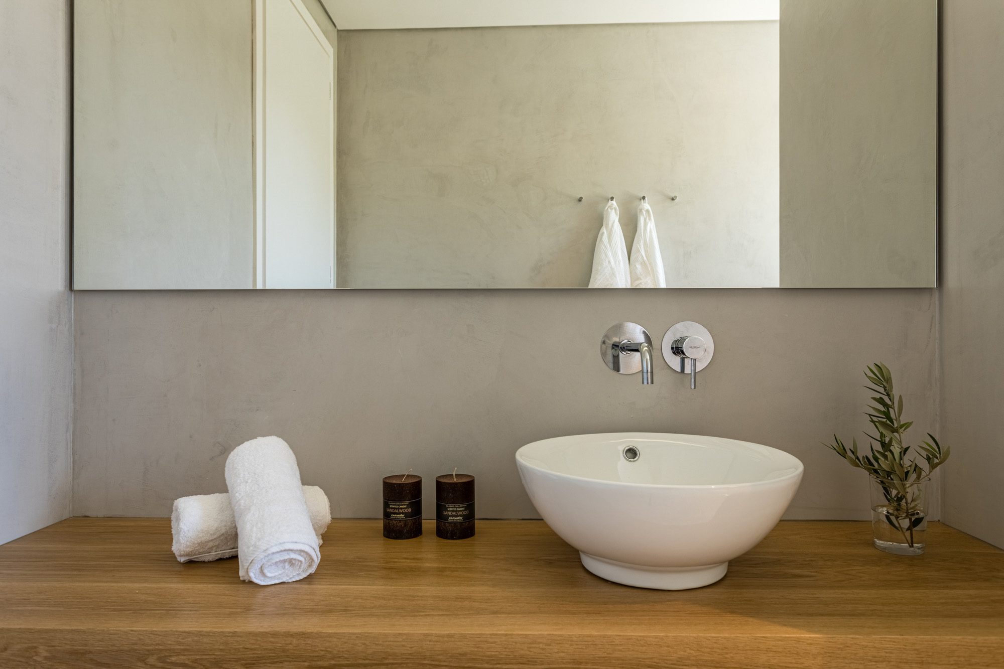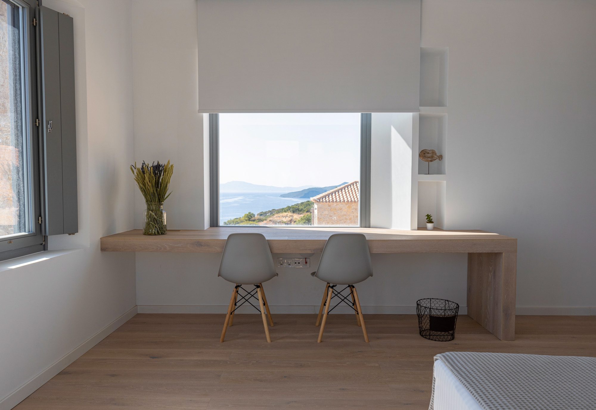 The pristine white, minimalist interiors are flooded with light, with lots of windows and doors looking out to sea and high-ceilinged open-plan living and dining spaces. Bathrooms are sleek and elegant, and beds are extremely comfortable. The ground and first-floor bedrooms have private balconies.