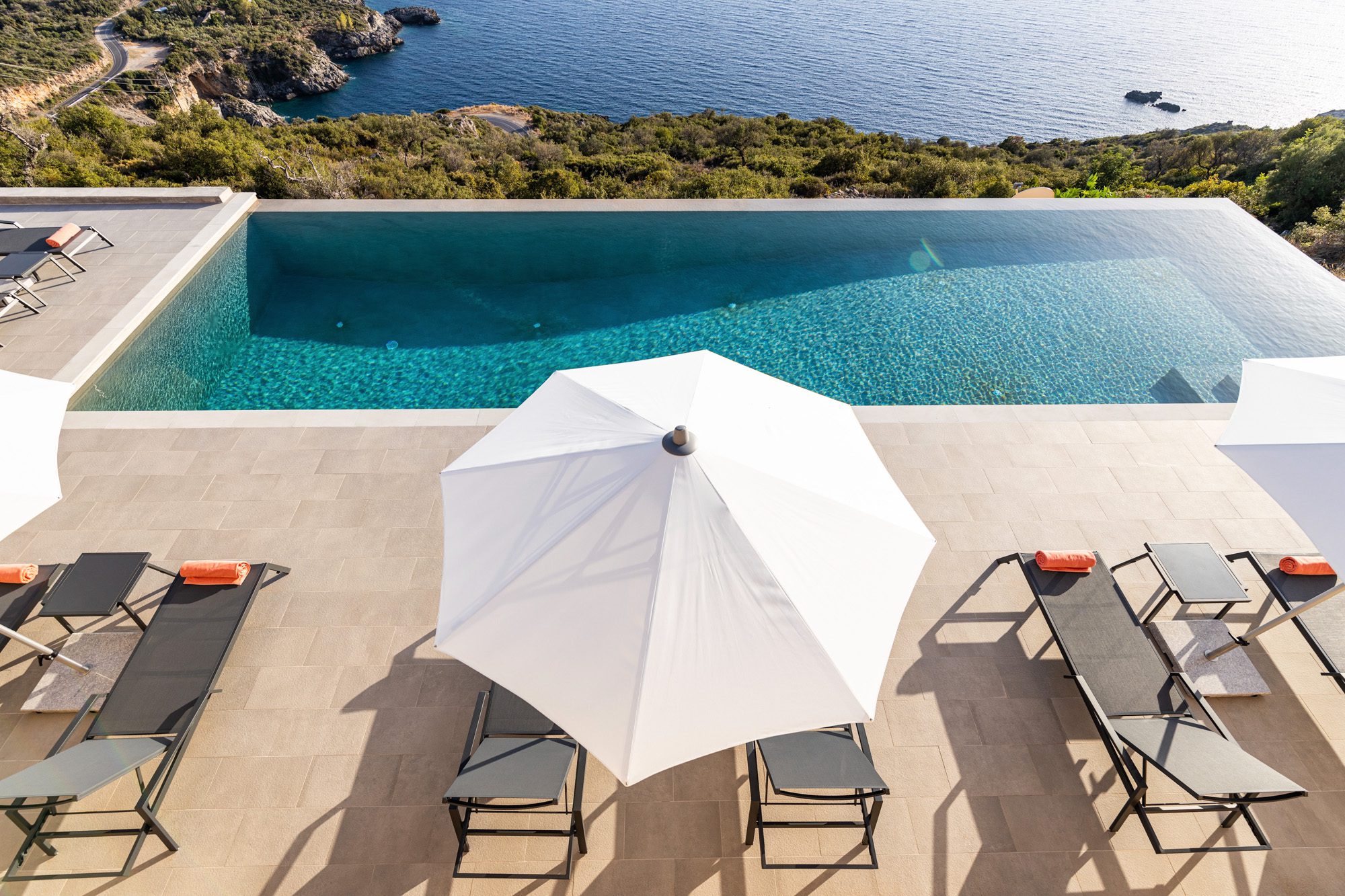 The house opens onto spacious multi-level terraces and an enticing 15-meter infinity pool. There are sunbeds with parasols, lots of seating spread across the various spaces, and a long dining table under an awning where all guests can gather.