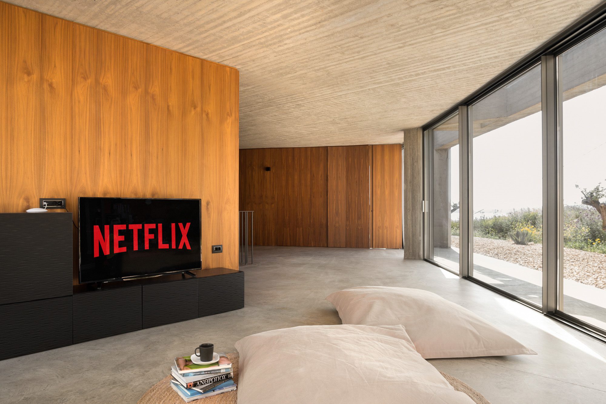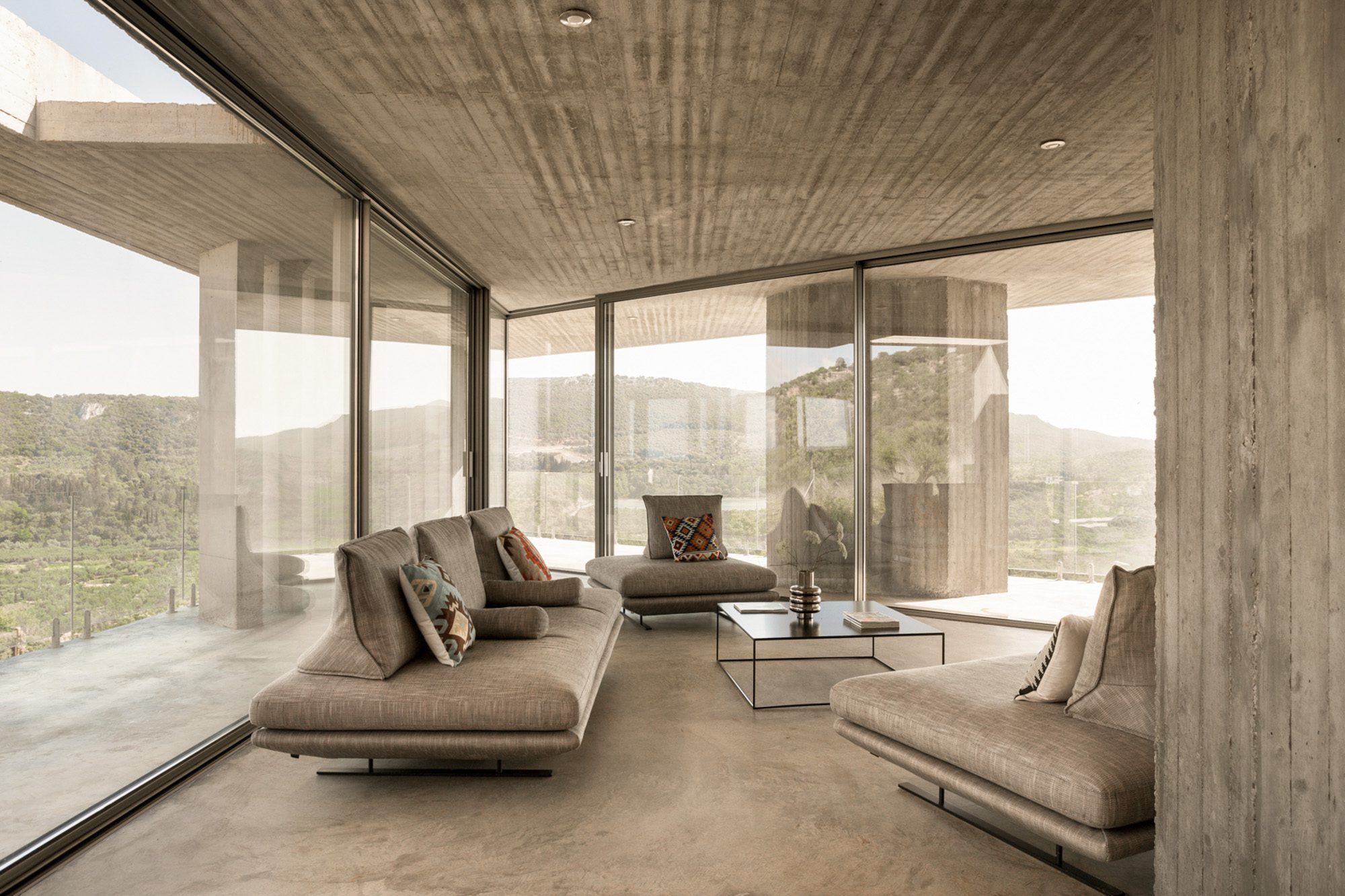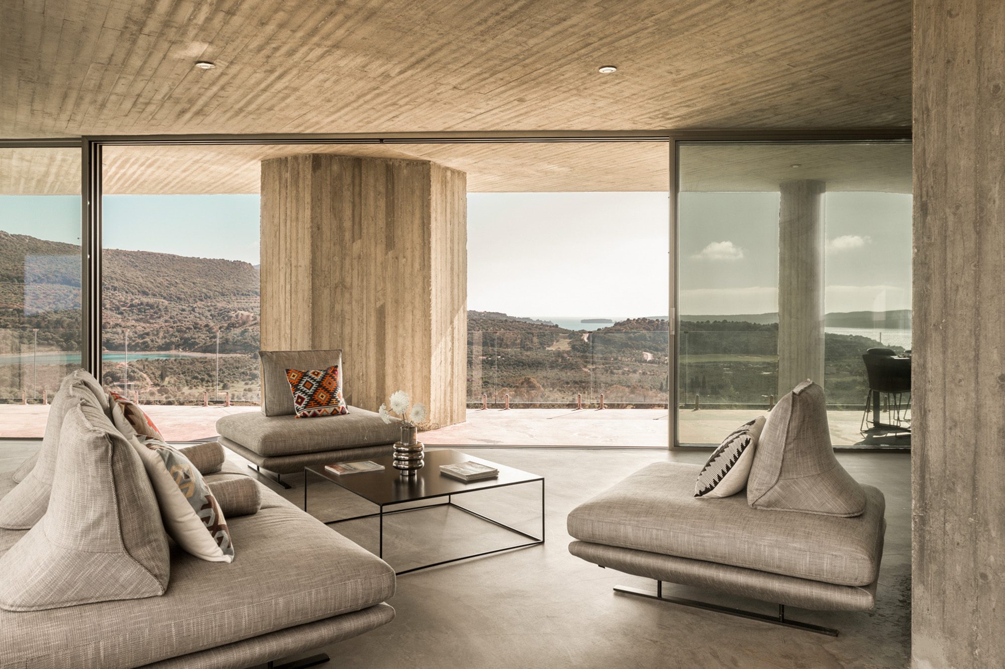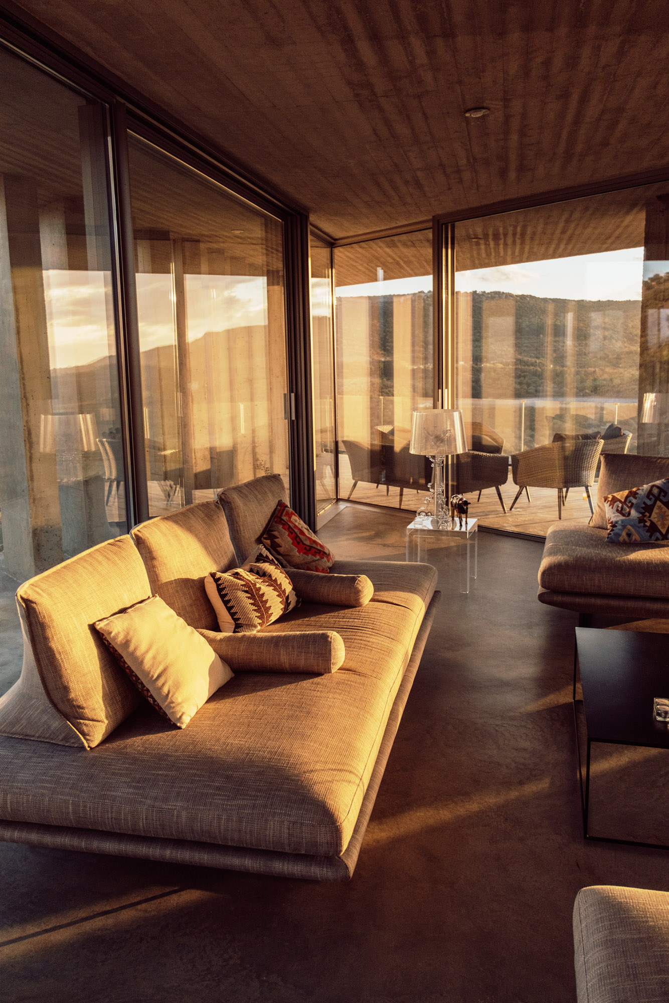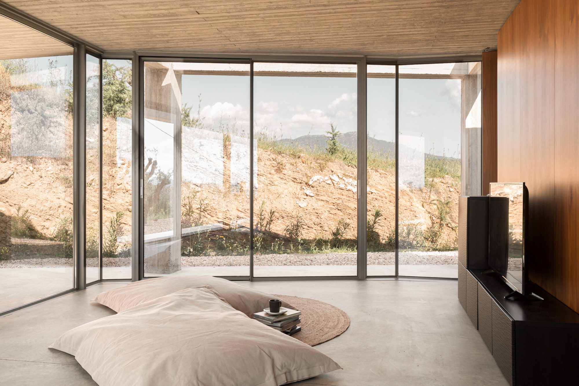 Three bedrooms are on the main floor, all with huge windows and access to the terrace. A further en suite bedroom is on the lower floor. The capacious open-plan living area has a TV end with big floor cushions, a separate sitting area with comfortable sofas, a dining space and a fitted kitchen. Floor-to-ceiling windows maximise the views and give a feeling of connecting with the landscape.
