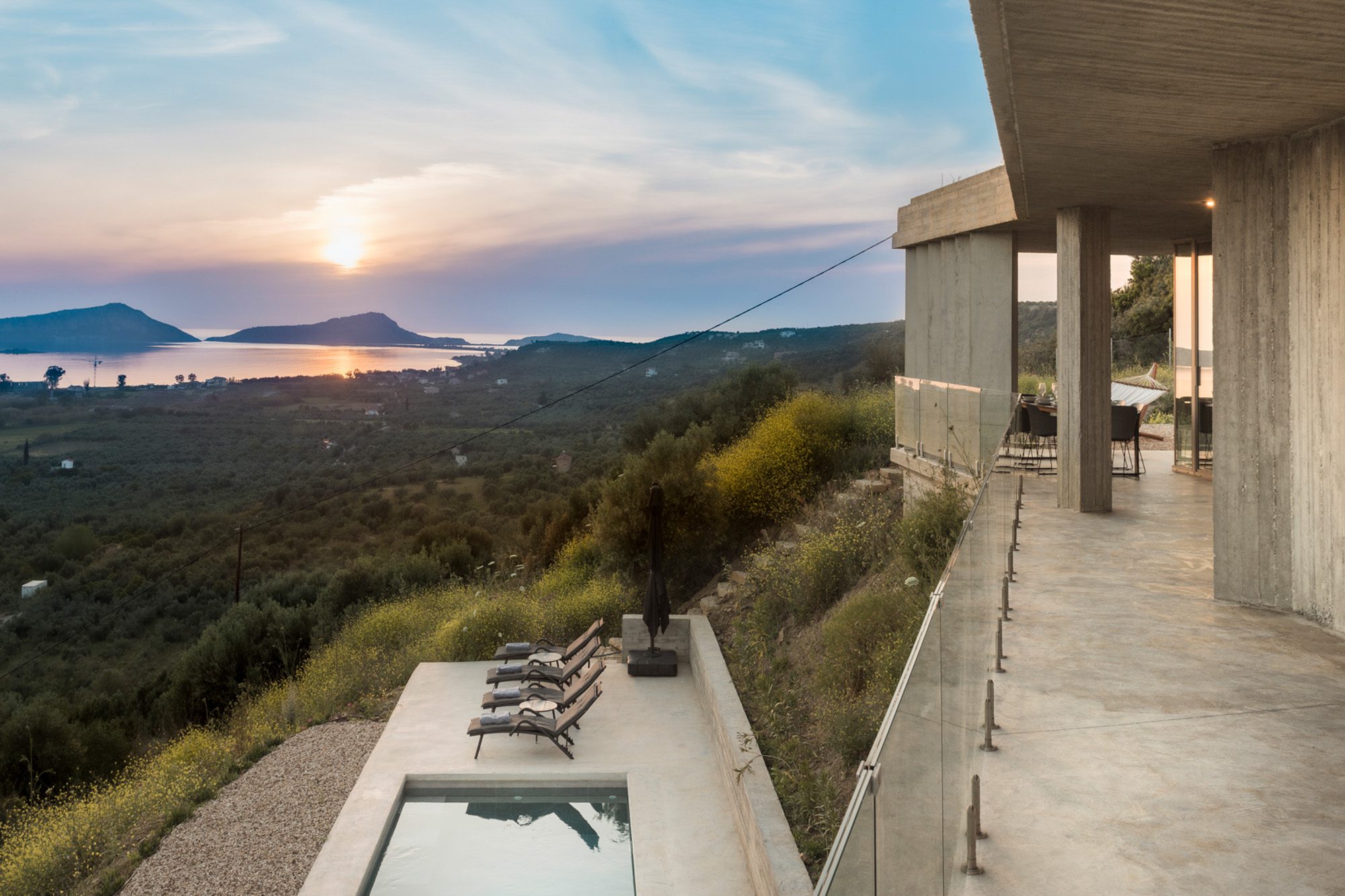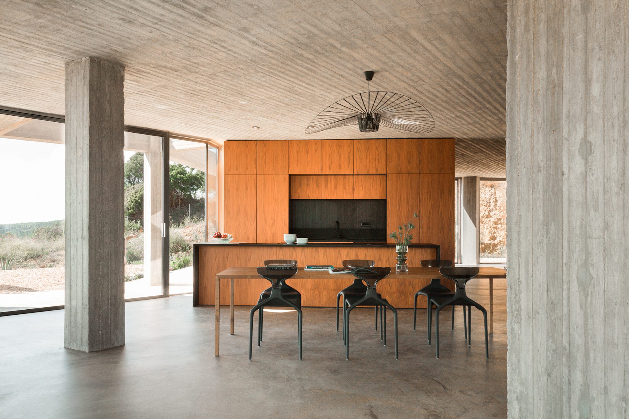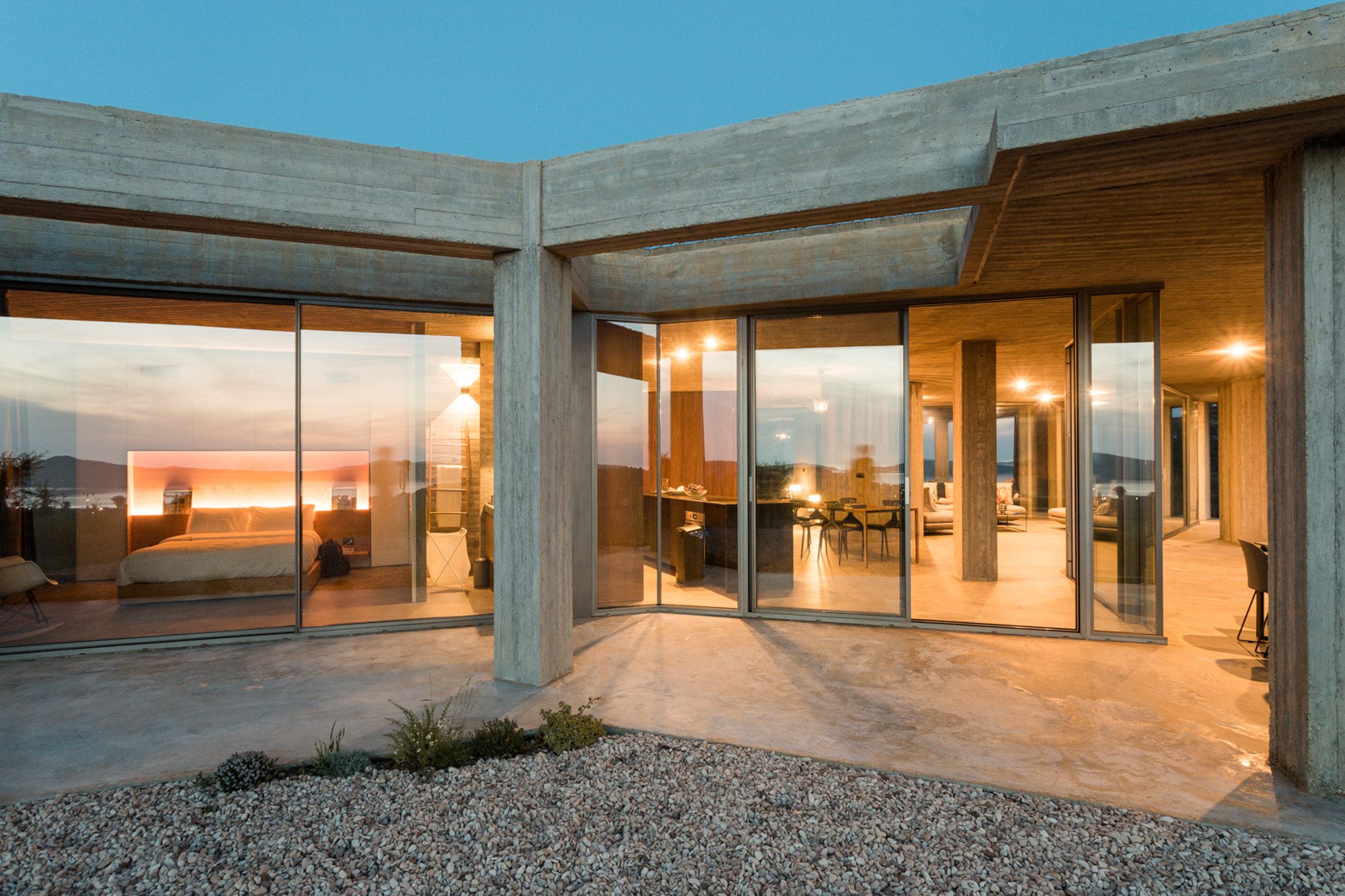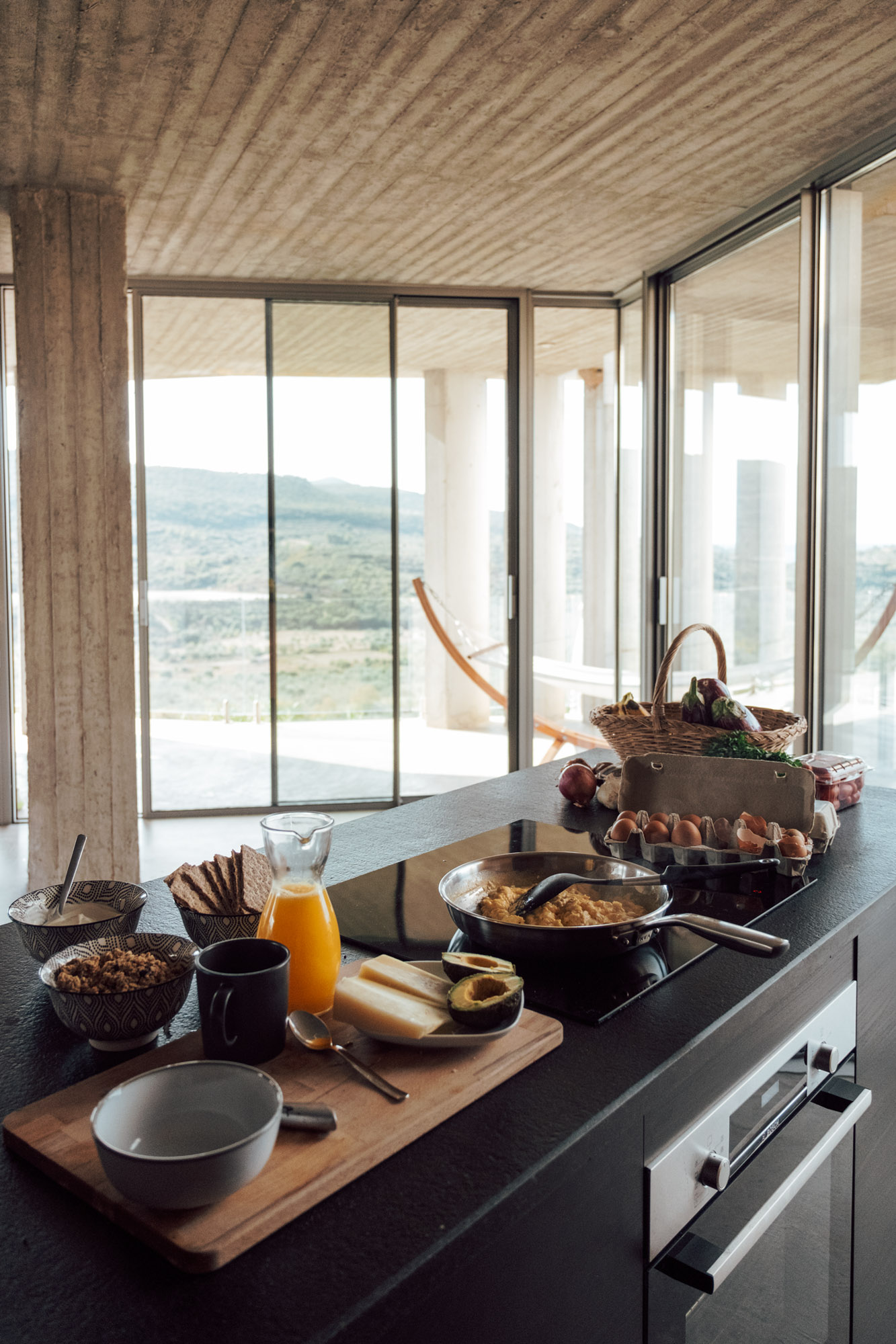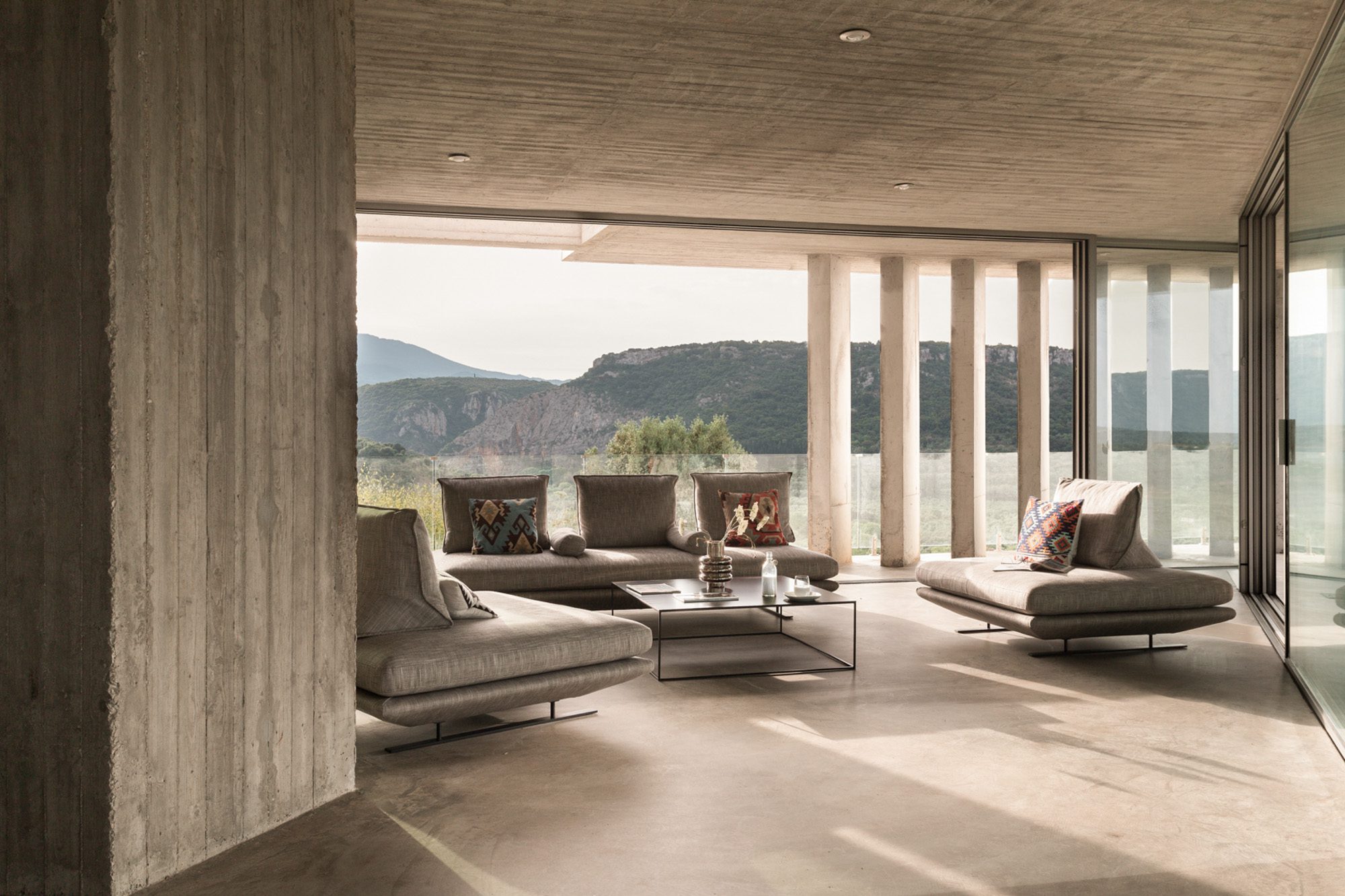 Three bedrooms are on the main floor, all with huge windows and access to the terrace. A further en suite bedroom is on the lower floor. The capacious open-plan living area has a TV end with big floor cushions, a separate sitting area with comfortable sofas, a dining space and a fitted kitchen. Floor-to-ceiling windows maximise the views and give a feeling of connecting with the landscape.