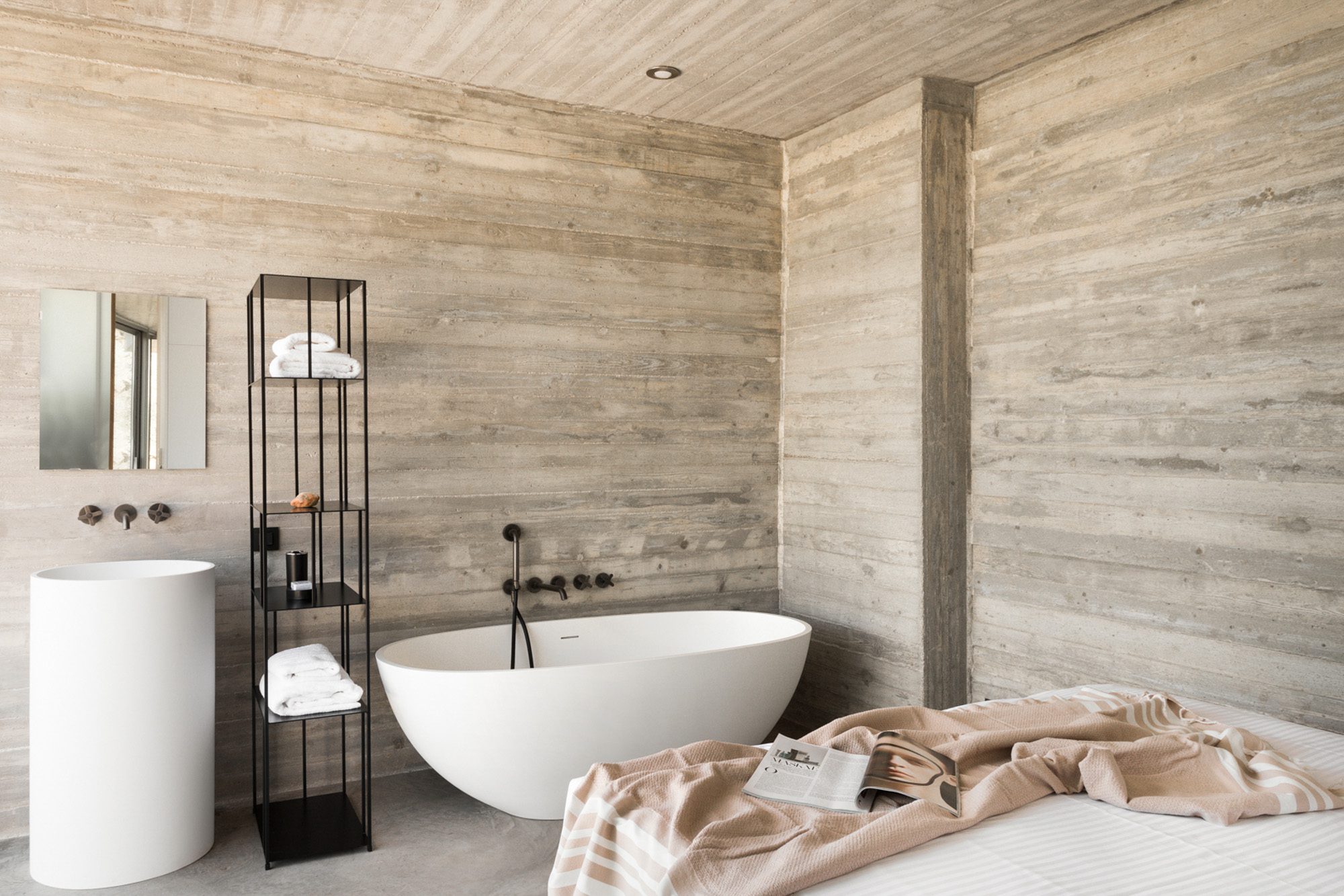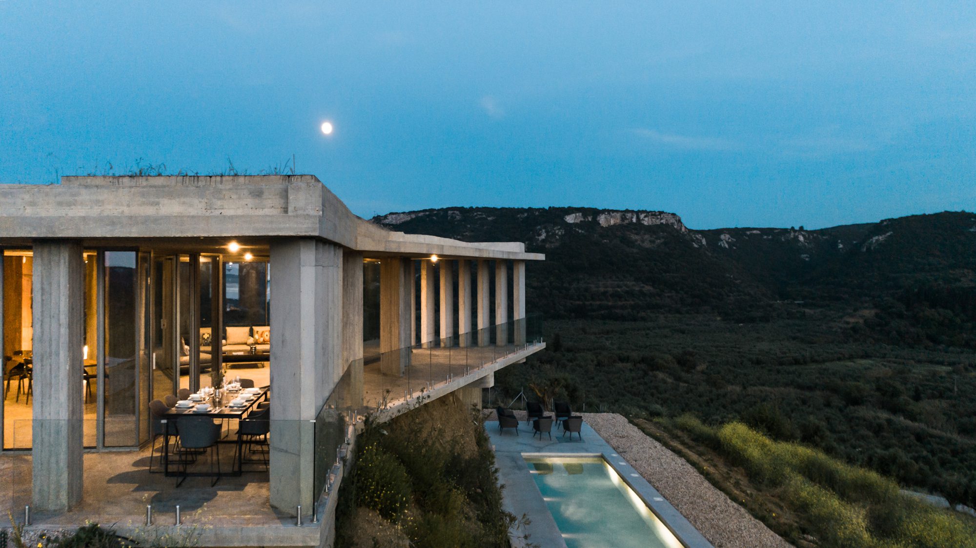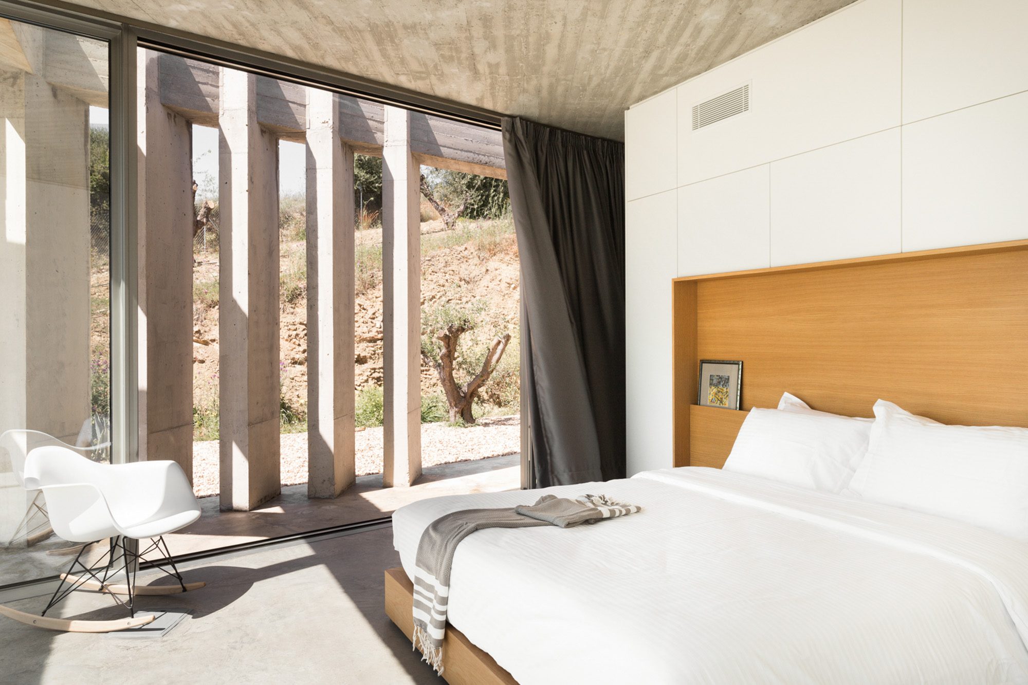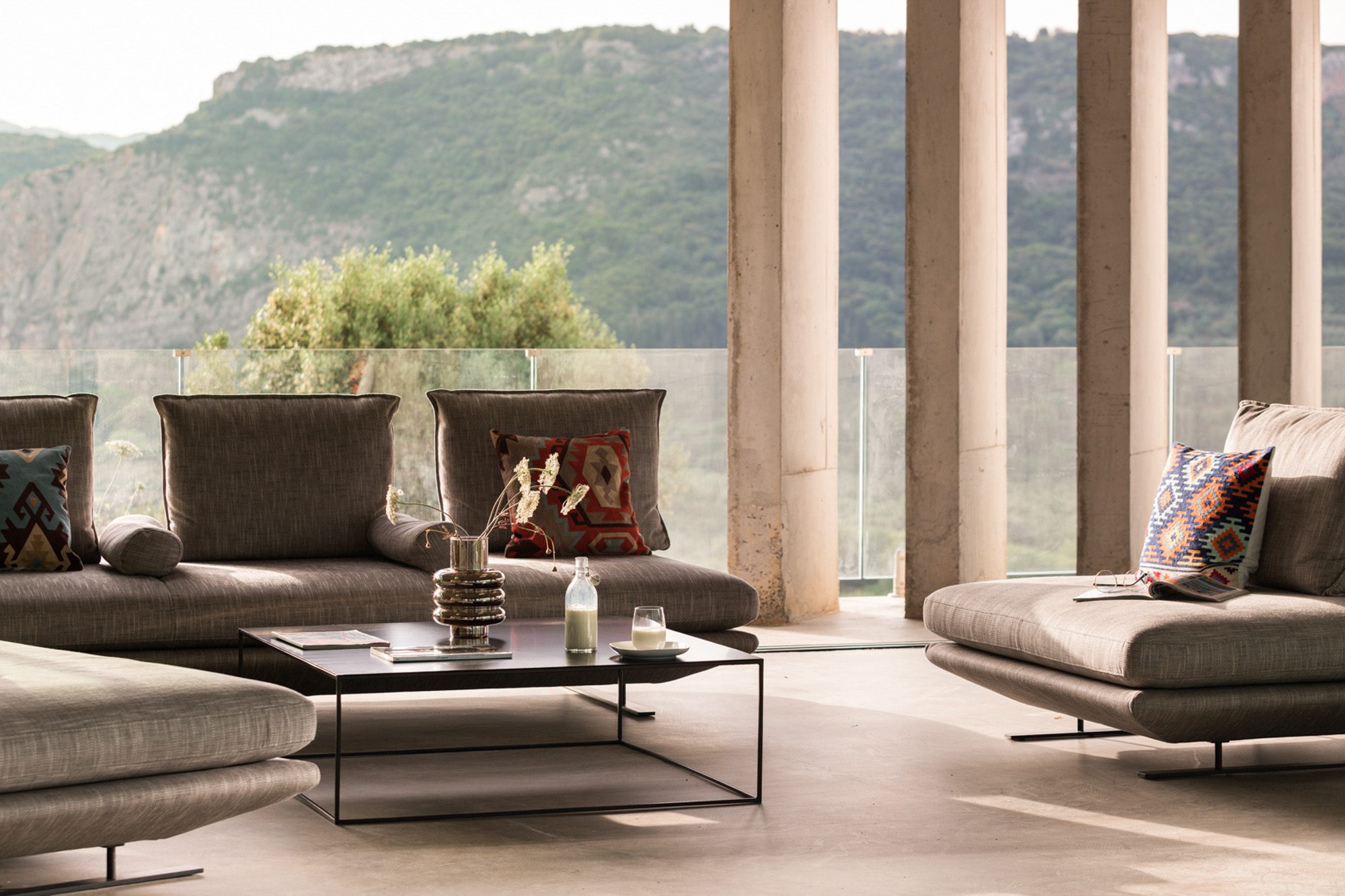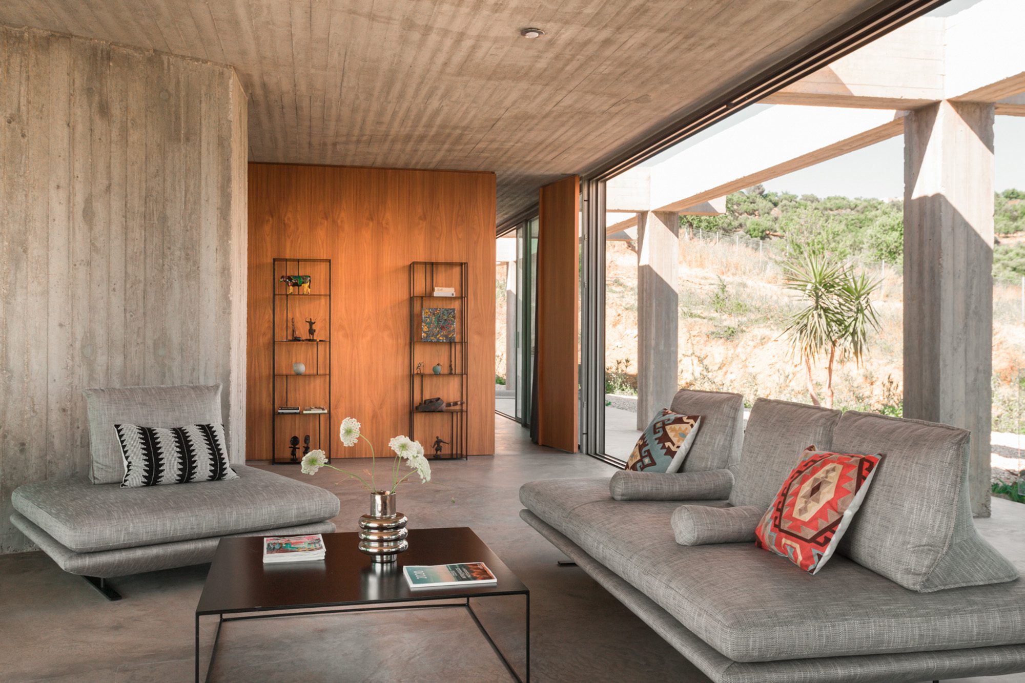 Three bedrooms are on the main floor, all with huge windows and access to the terrace. A further en suite bedroom is on the lower floor. The capacious open-plan living area has a TV end with big floor cushions, a separate sitting area with comfortable sofas, a dining space and a fitted kitchen. Floor-to-ceiling windows maximise the views and give a feeling of connecting with the landscape.