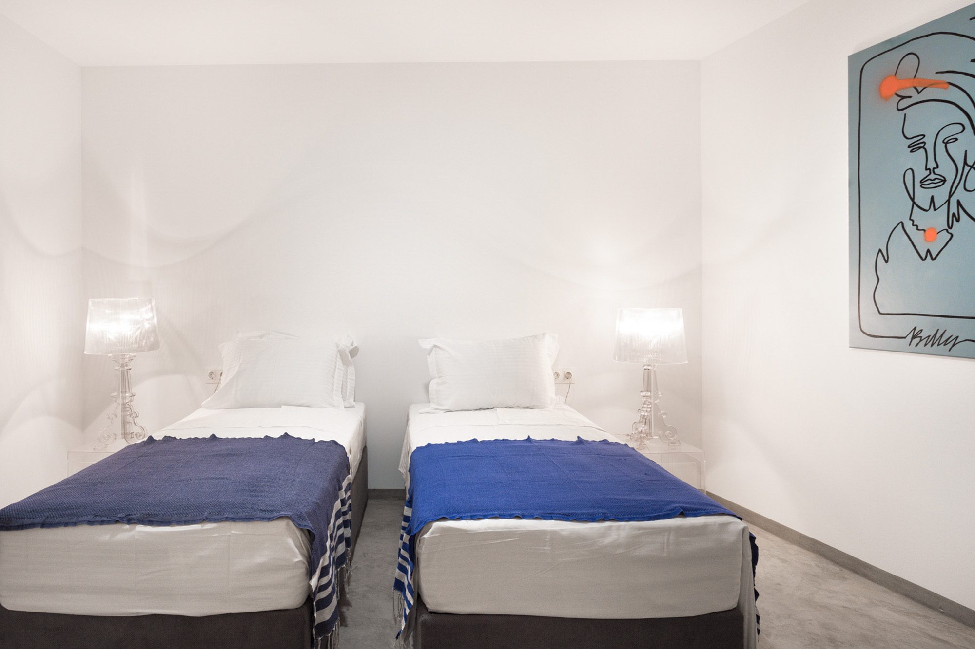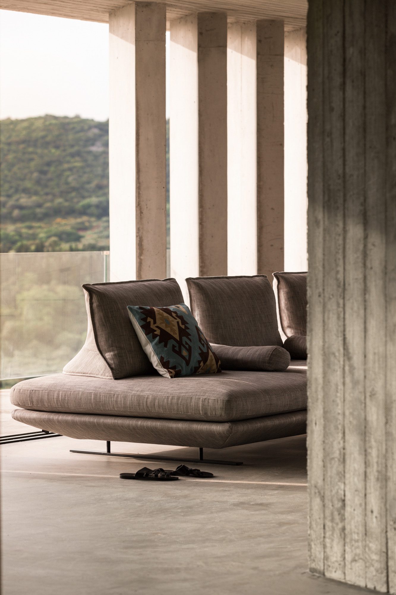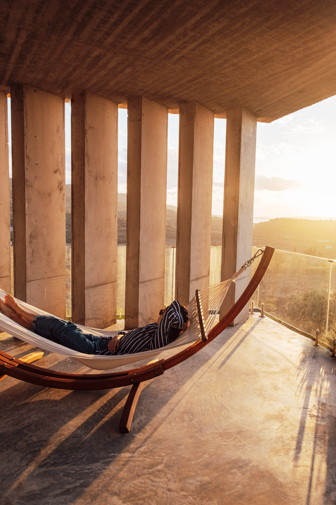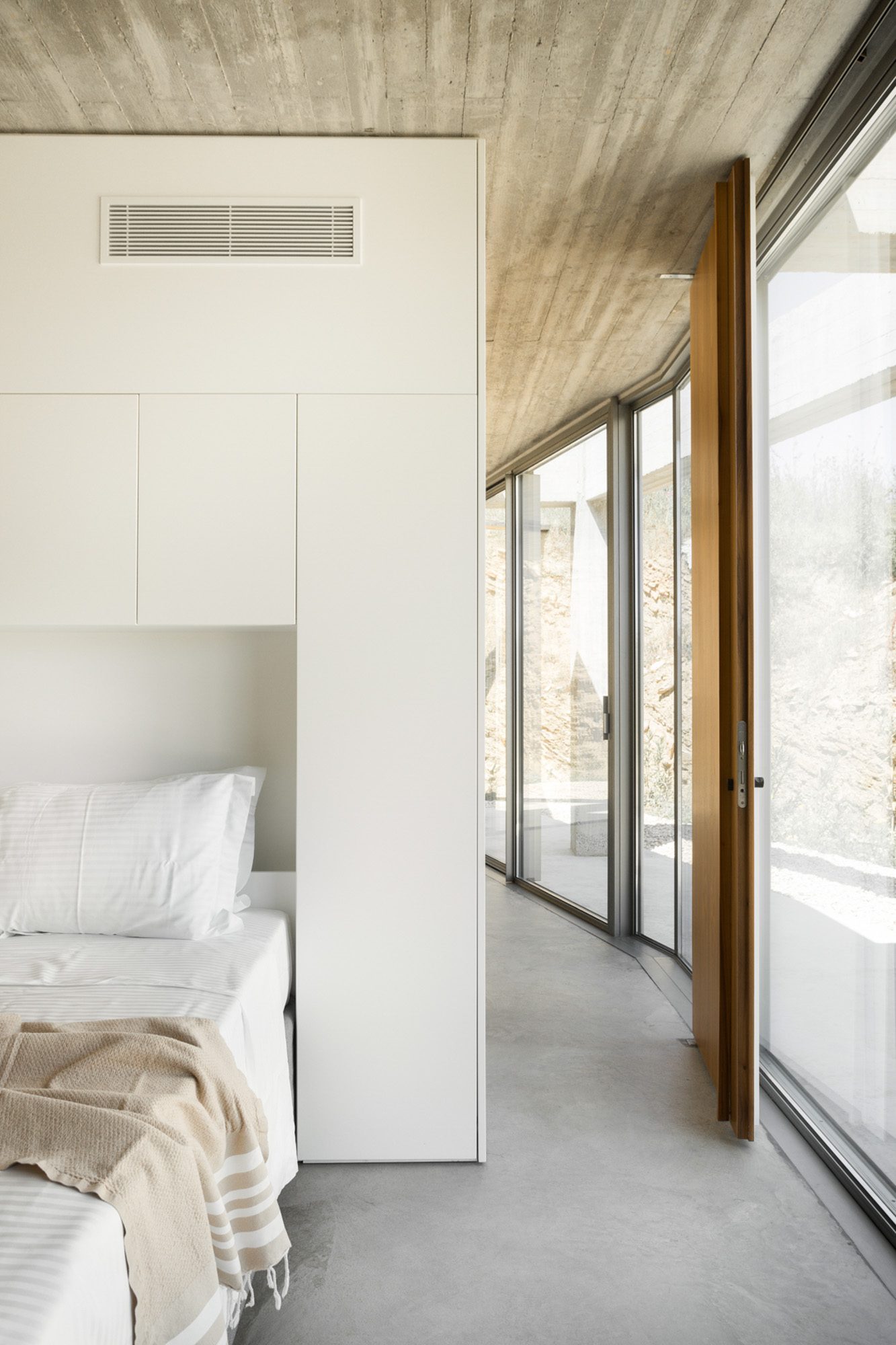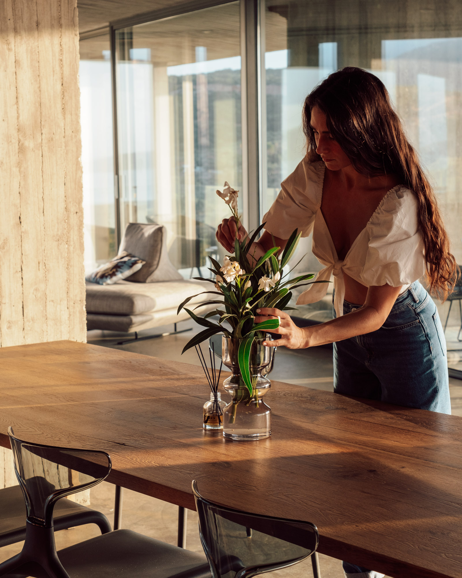 Three bedrooms are on the main floor, all with huge windows and access to the terrace. A further en suite bedroom is on the lower floor. The capacious open-plan living area has a TV end with big floor cushions, a separate sitting area with comfortable sofas, a dining space and a fitted kitchen. Floor-to-ceiling windows maximise the views and give a feeling of connecting with the landscape.