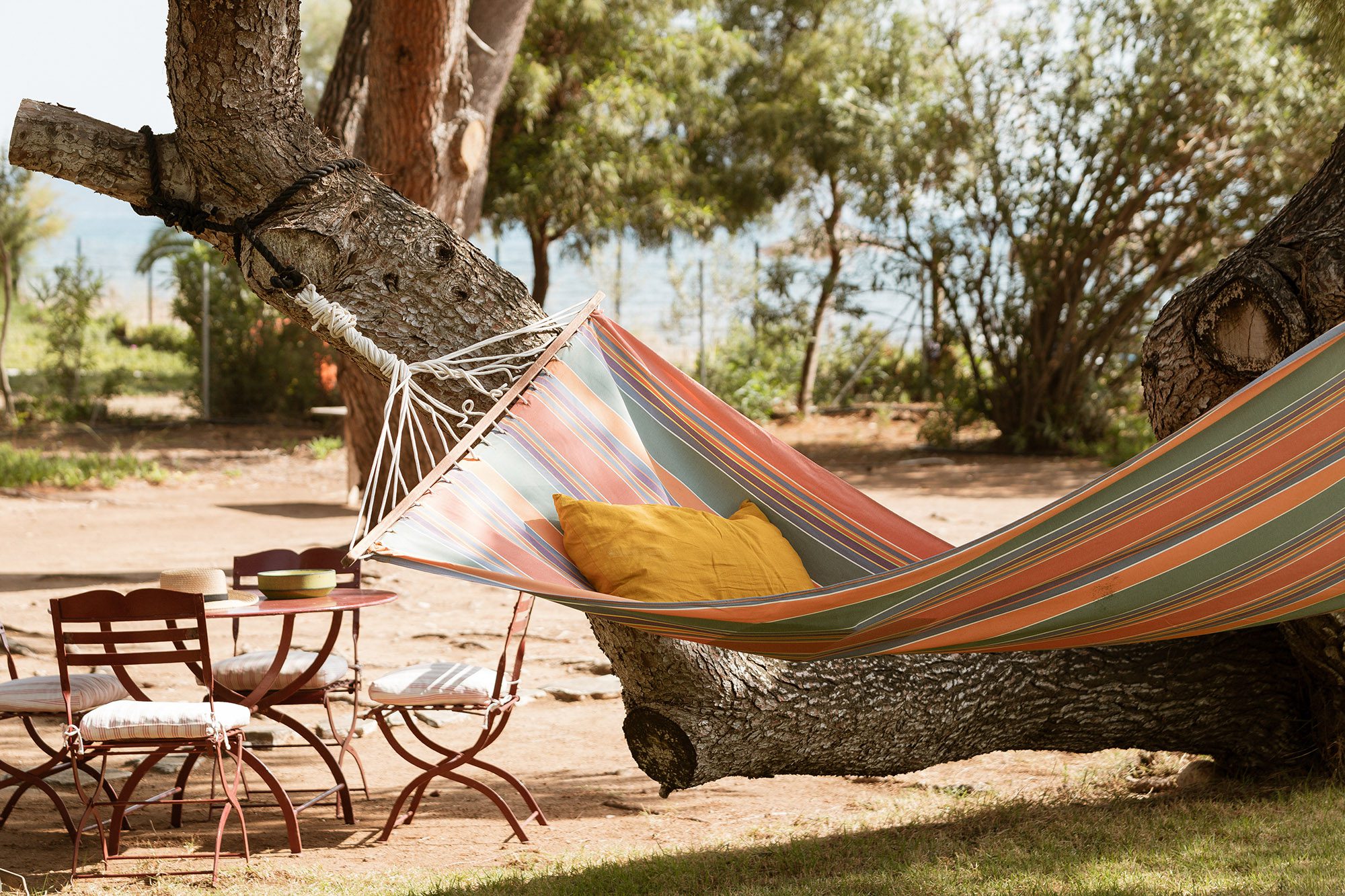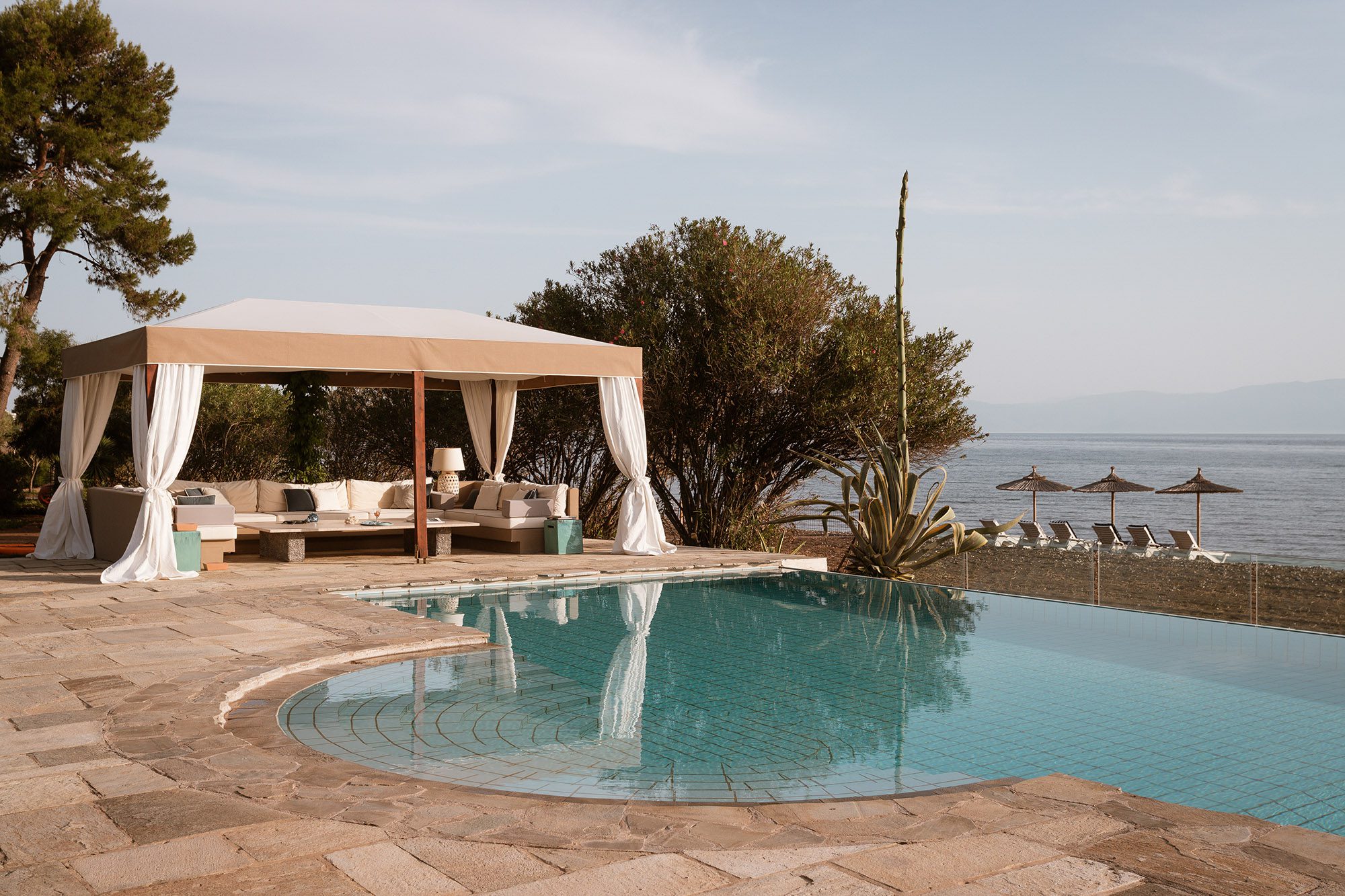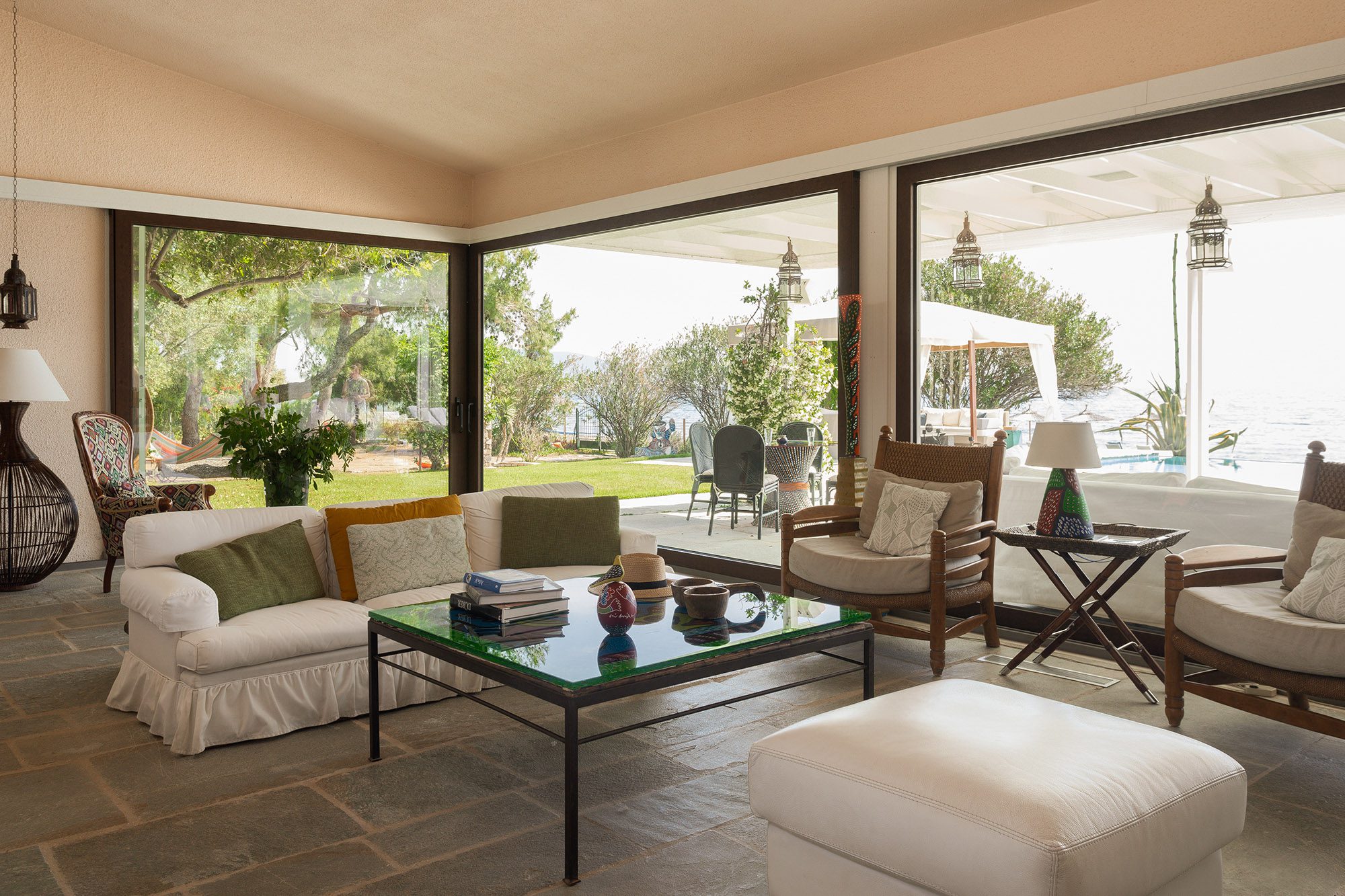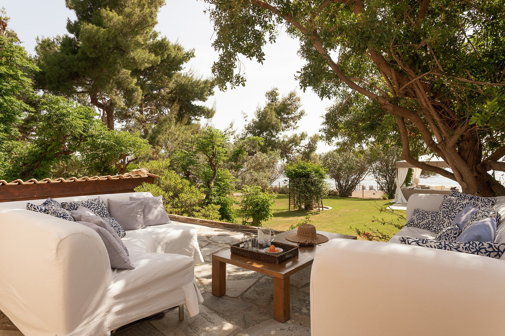 A large terrace faces the sea and has an infinity pool, sun loungers, and a gazebo. The surrounding grounds have plenty of evergreen trees and palms, with further places to sit and relax, dine al fresco, or snooze in the hammock.