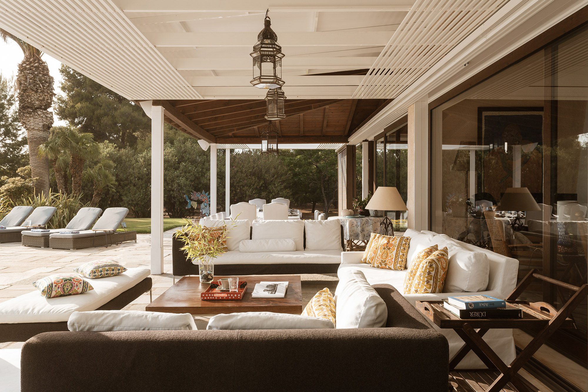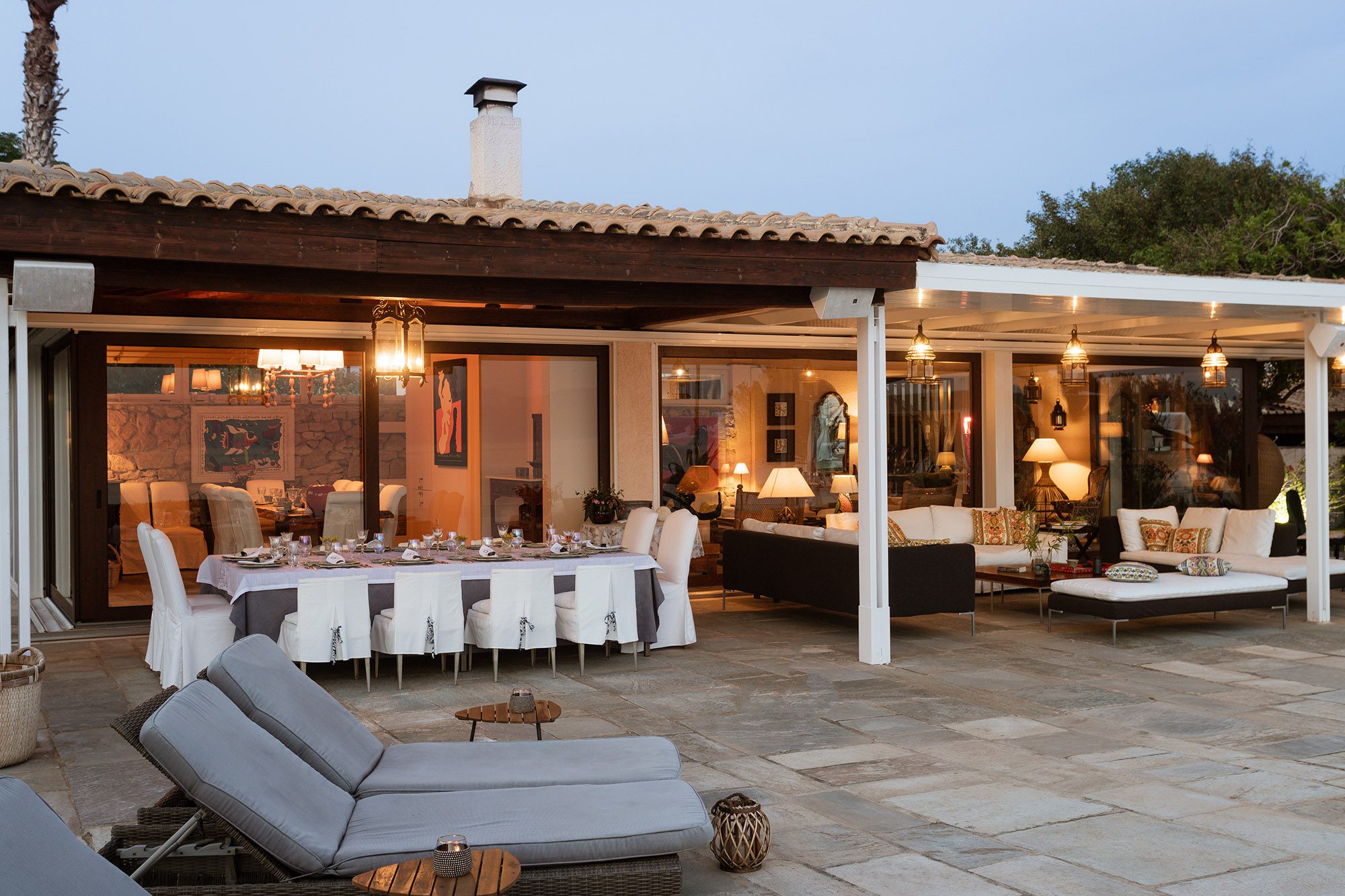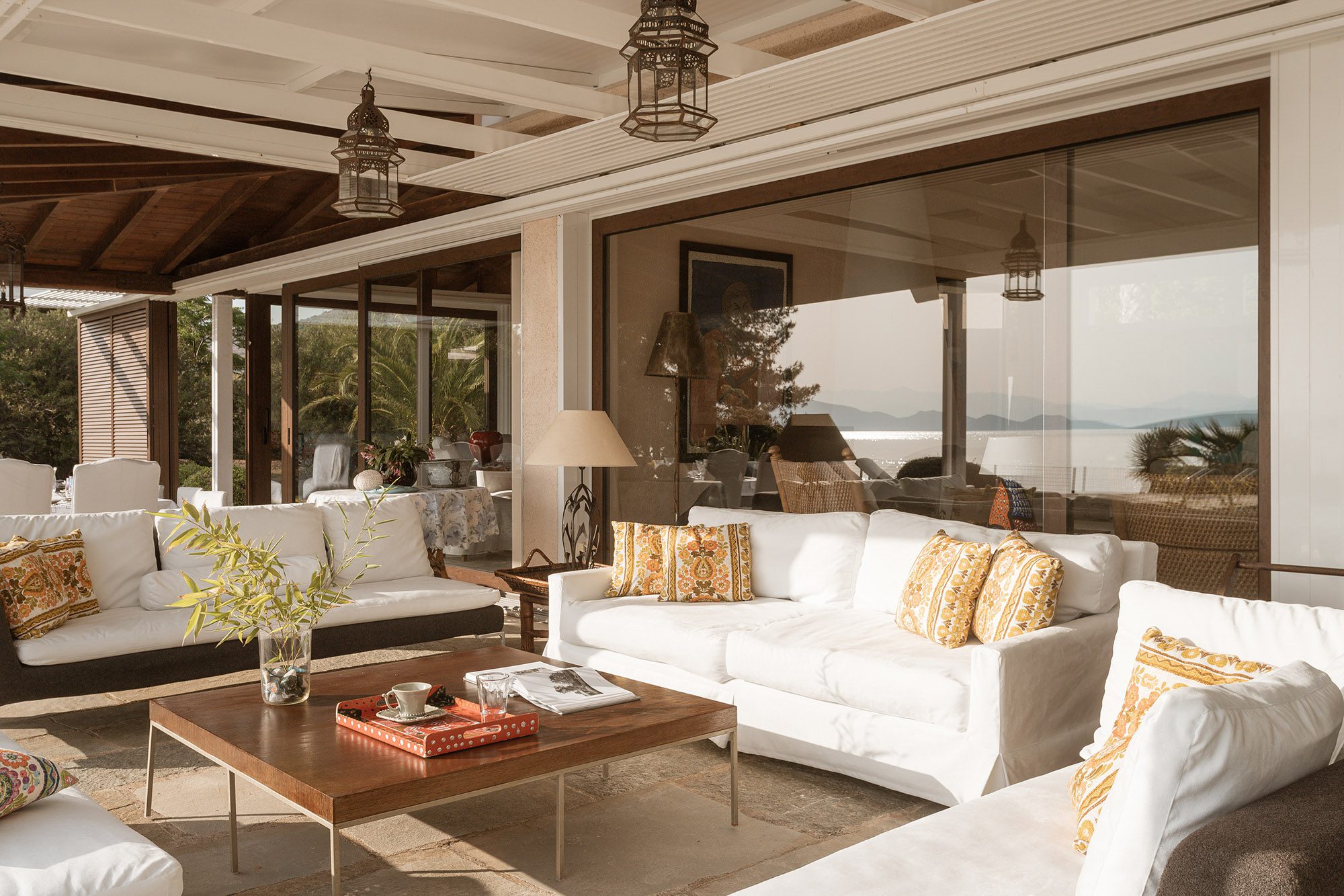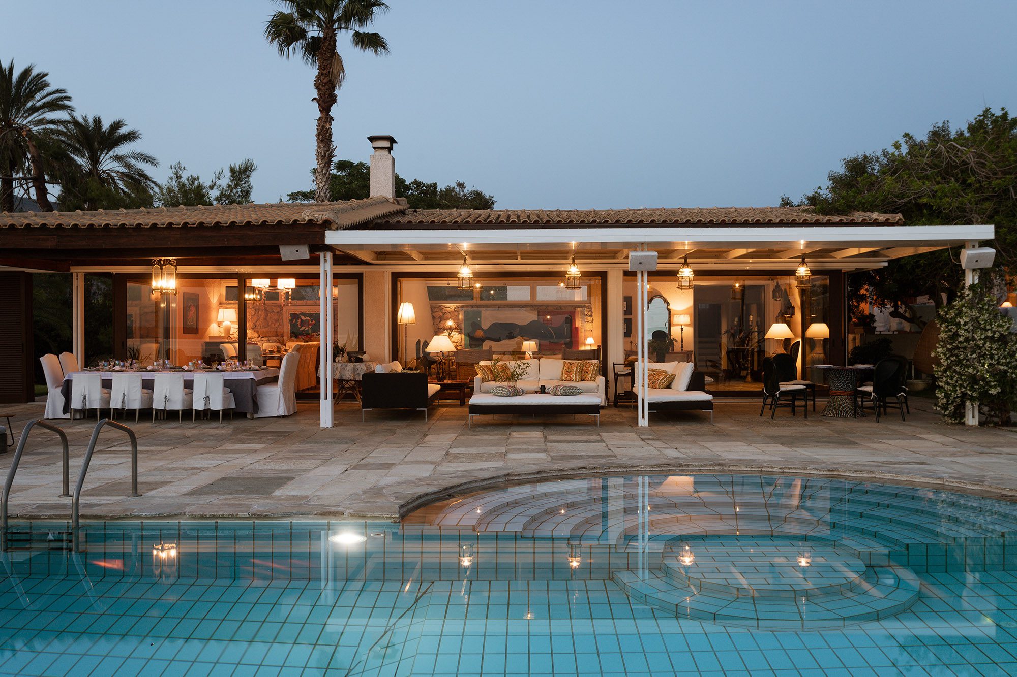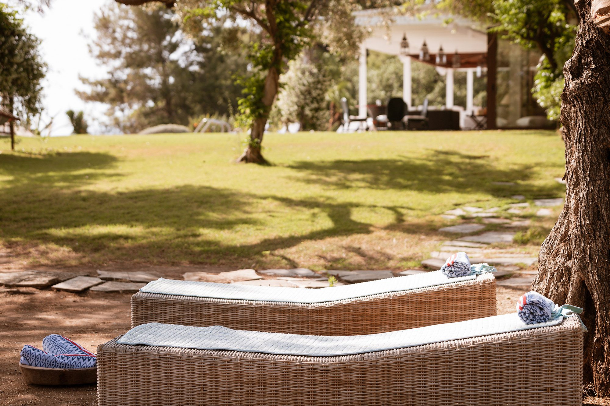 A large terrace faces the sea and has an infinity pool, sun loungers, and a gazebo. The surrounding grounds have plenty of evergreen trees and palms, with further places to sit and relax, dine al fresco, or snooze in the hammock.