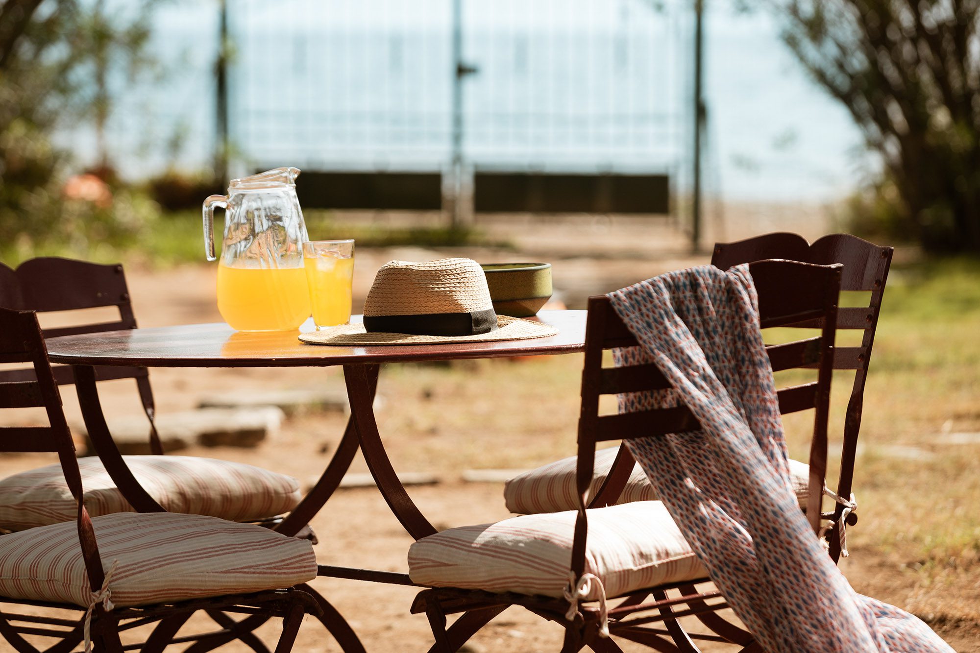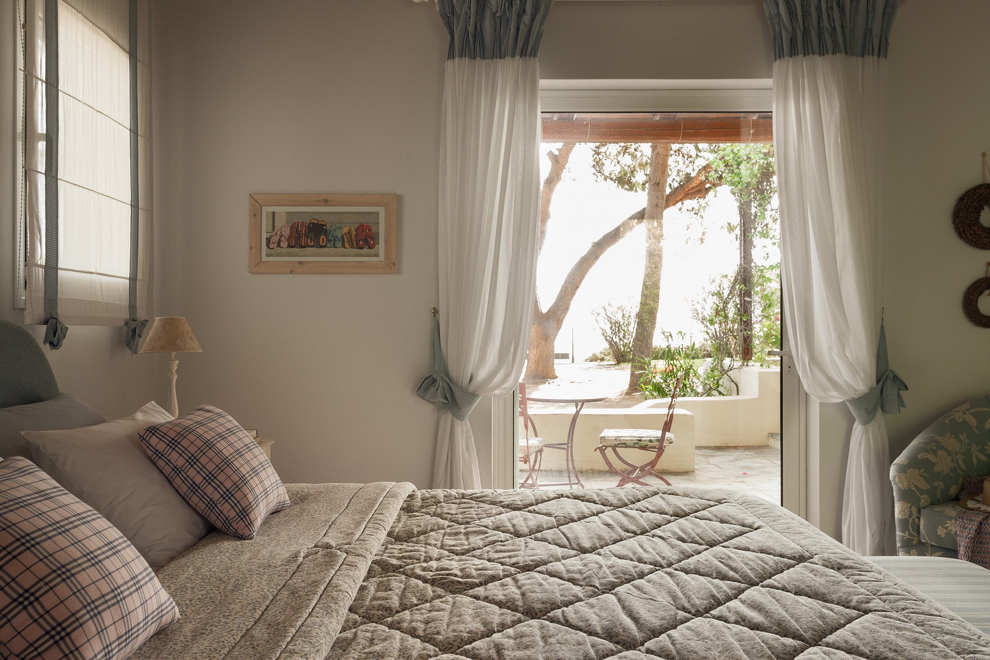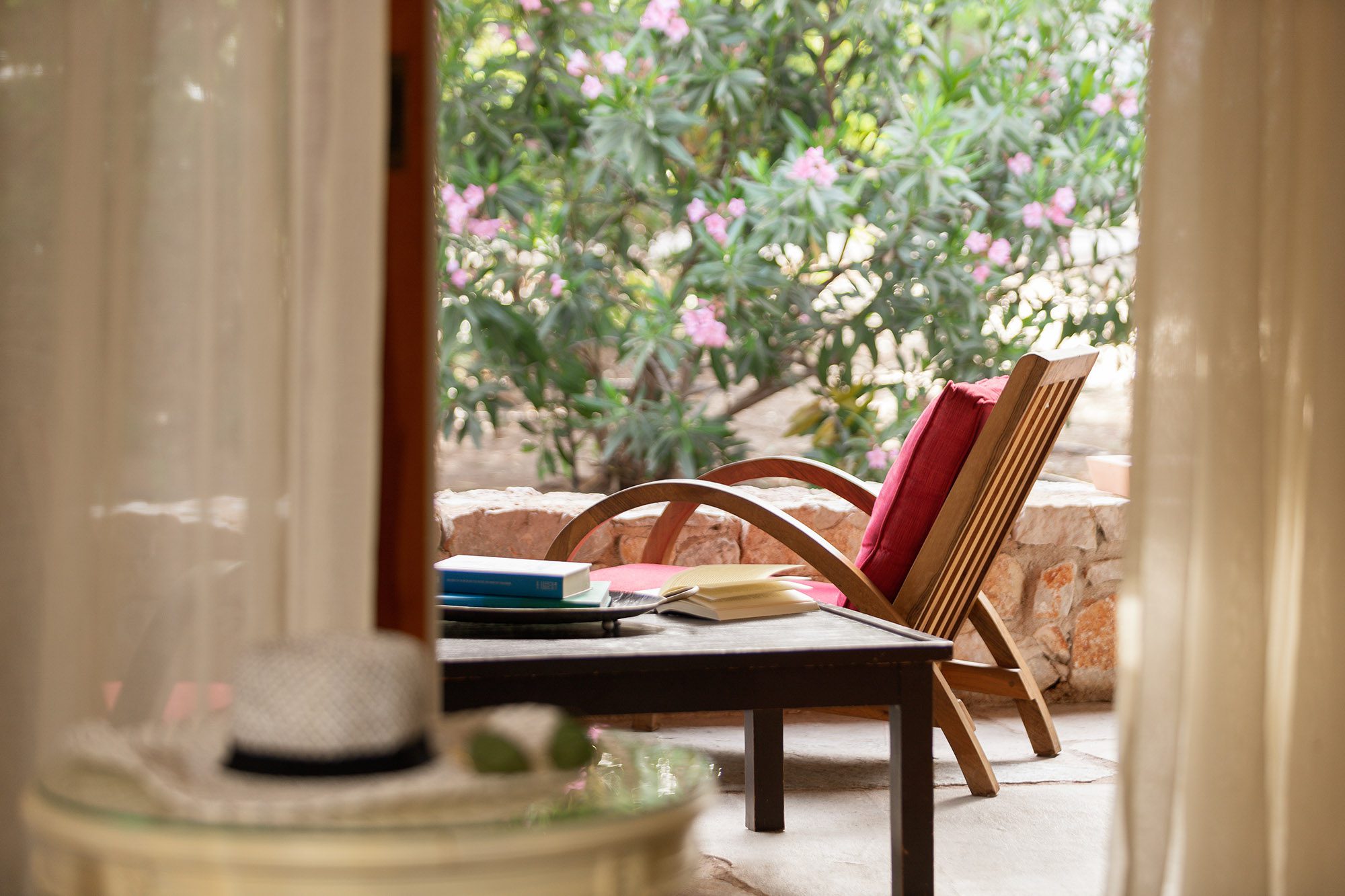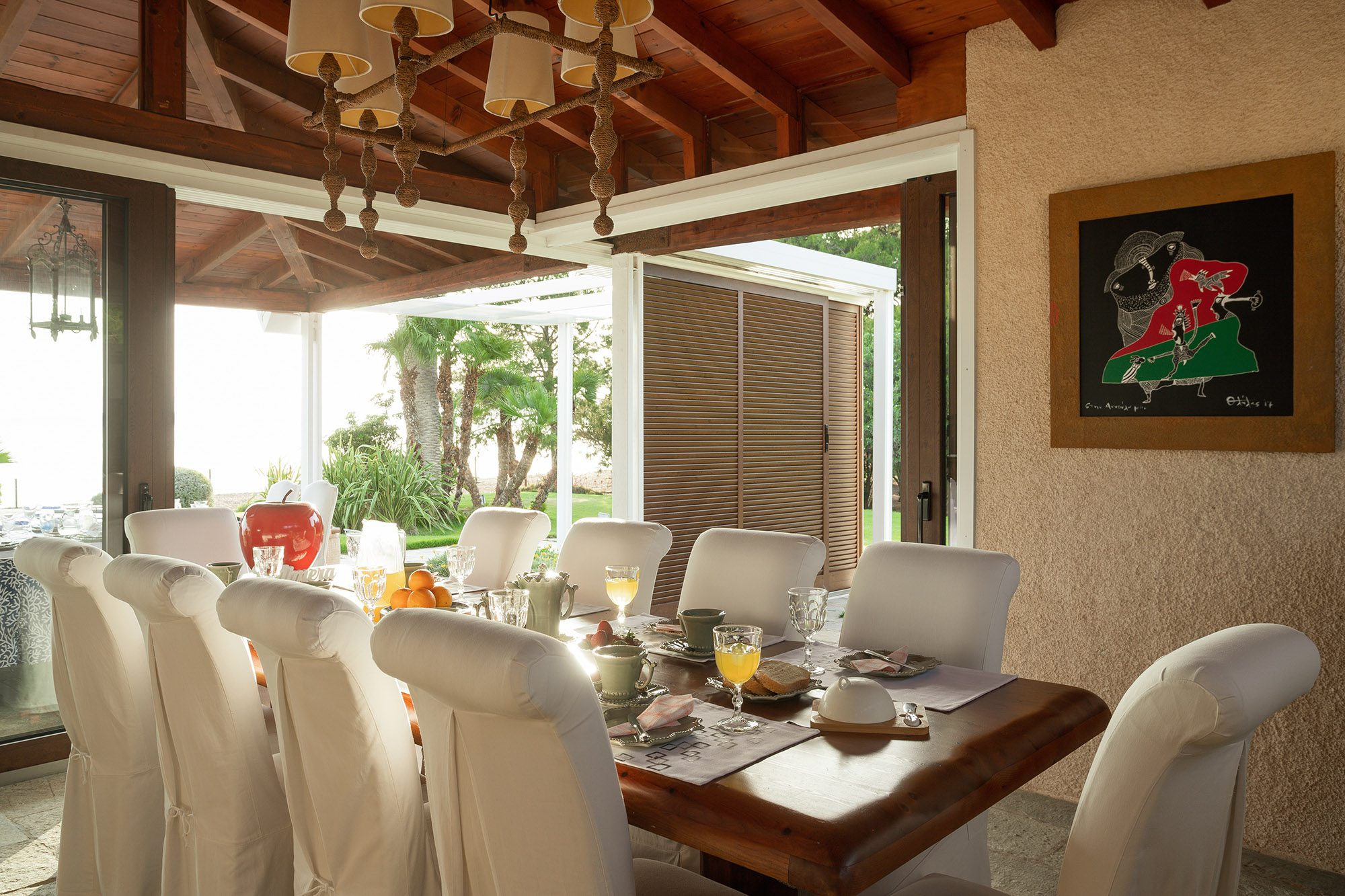 A large terrace faces the sea and has an infinity pool, sun loungers, and a gazebo. The surrounding grounds have plenty of evergreen trees and palms, with further places to sit and relax, dine al fresco, or snooze in the hammock.