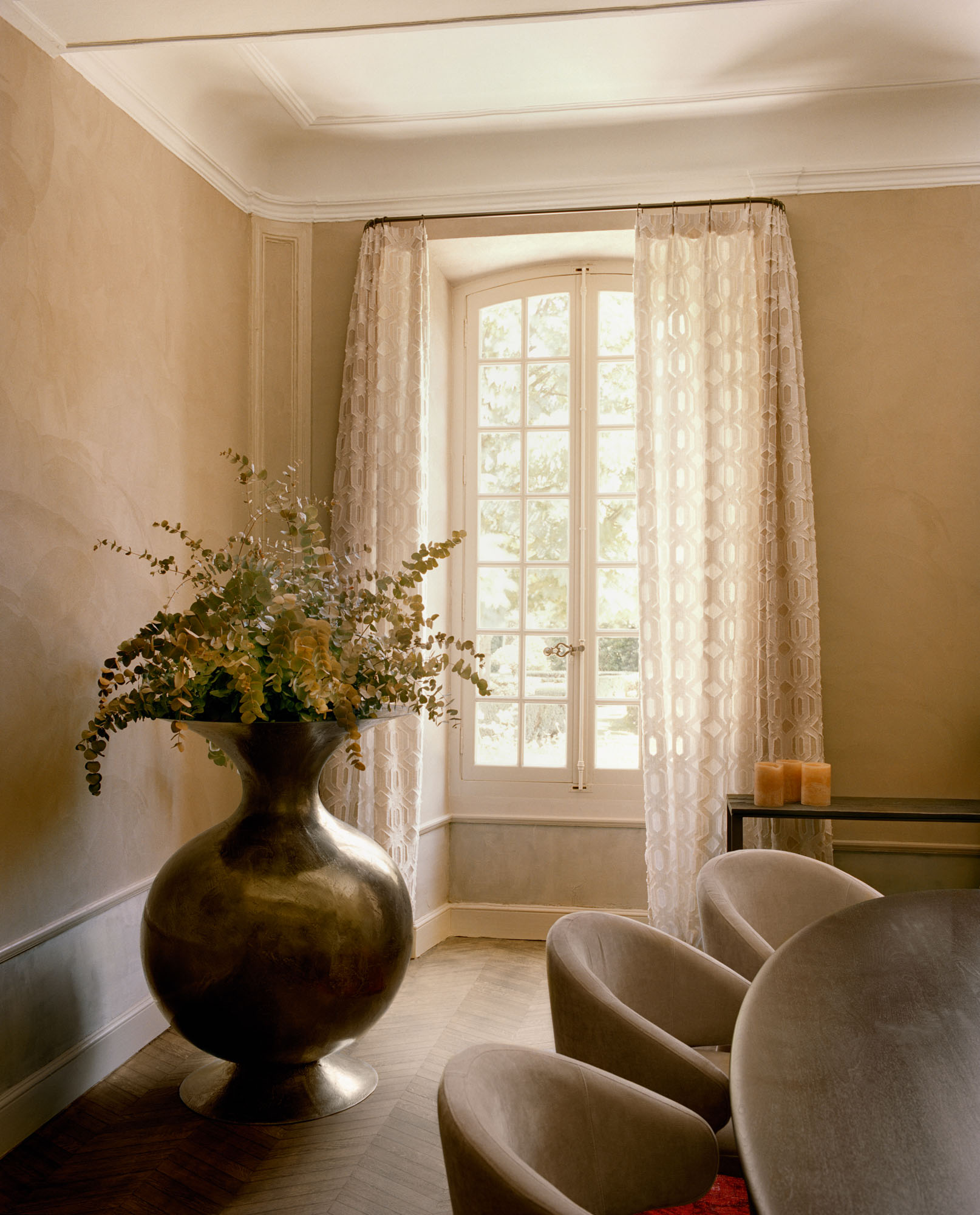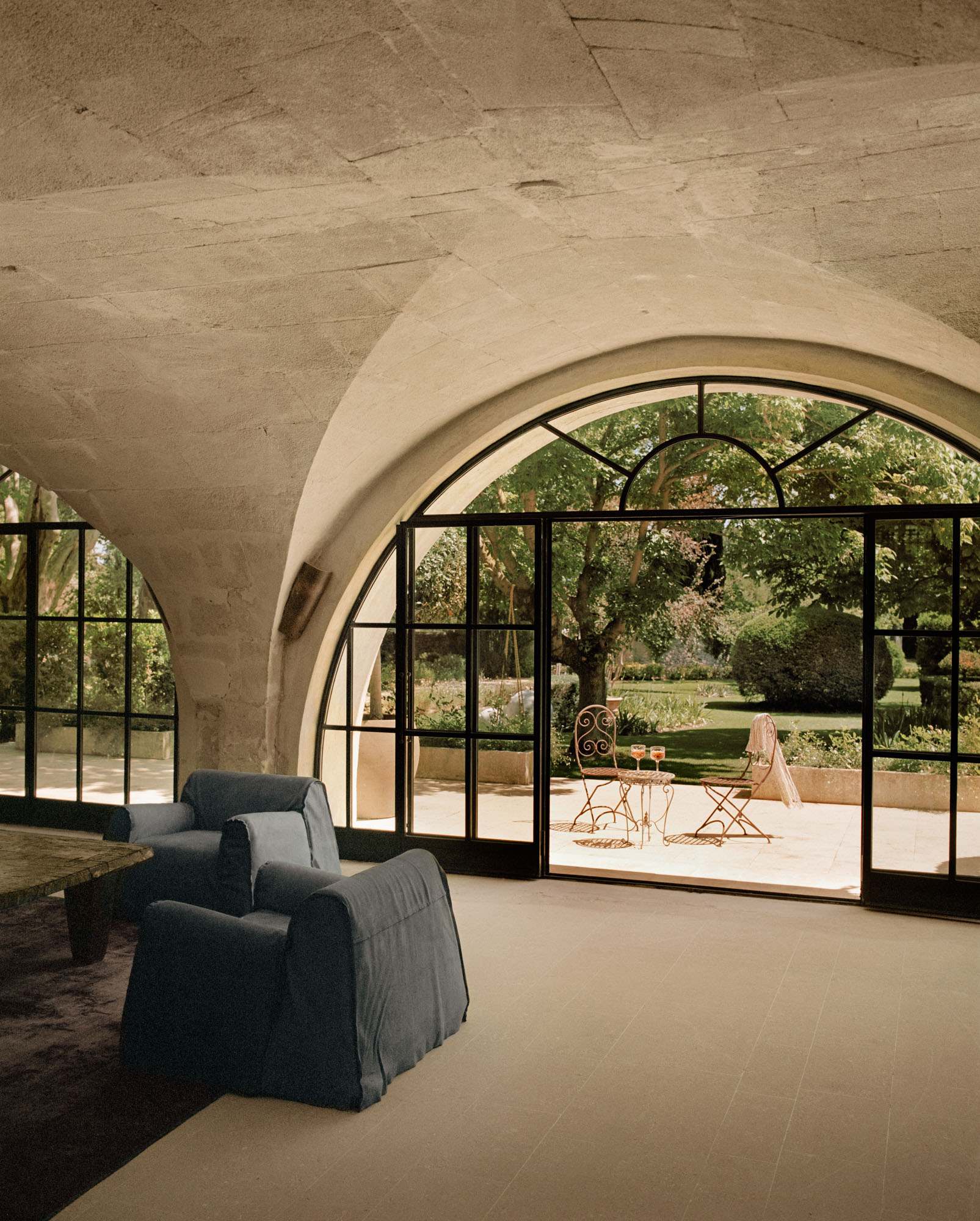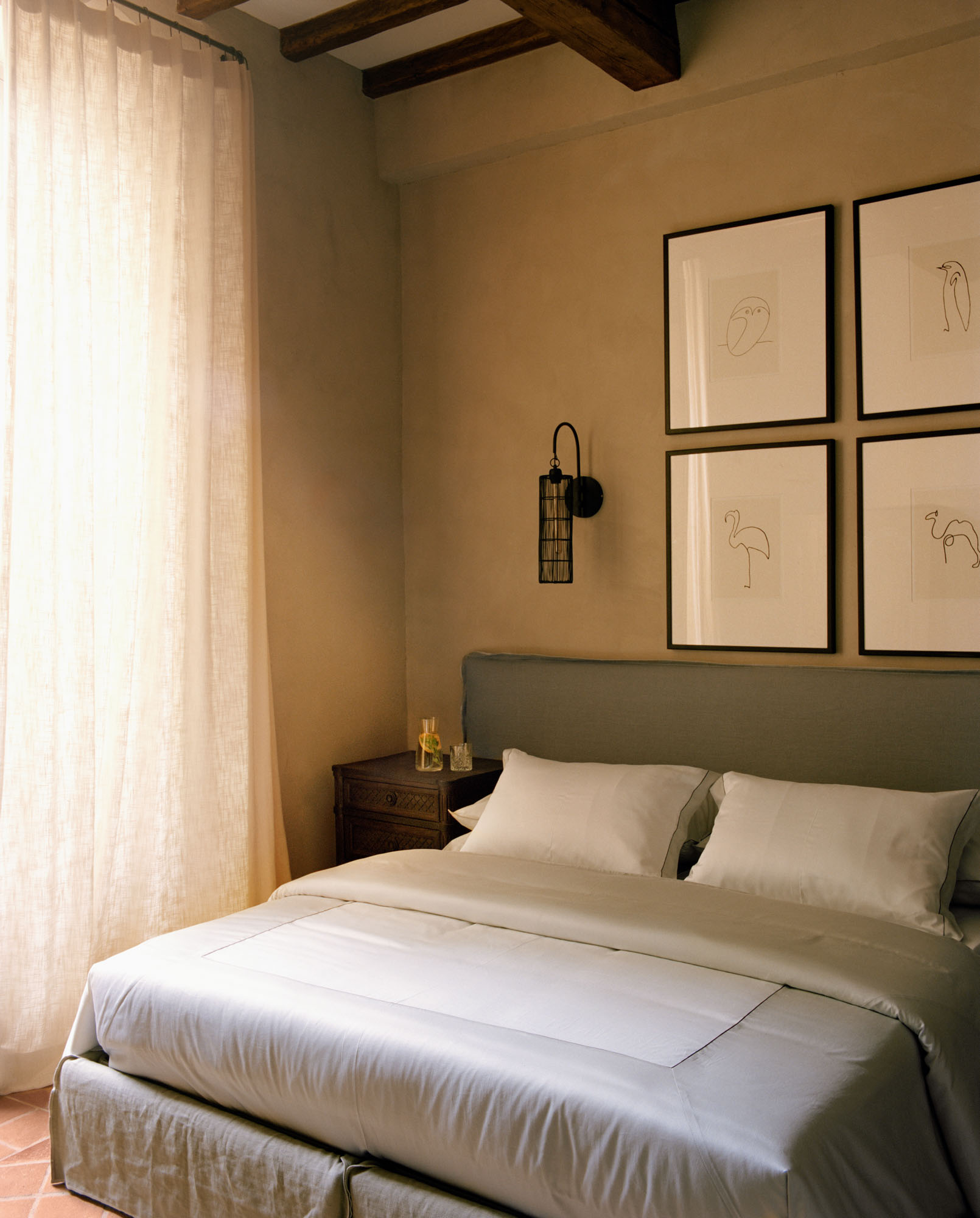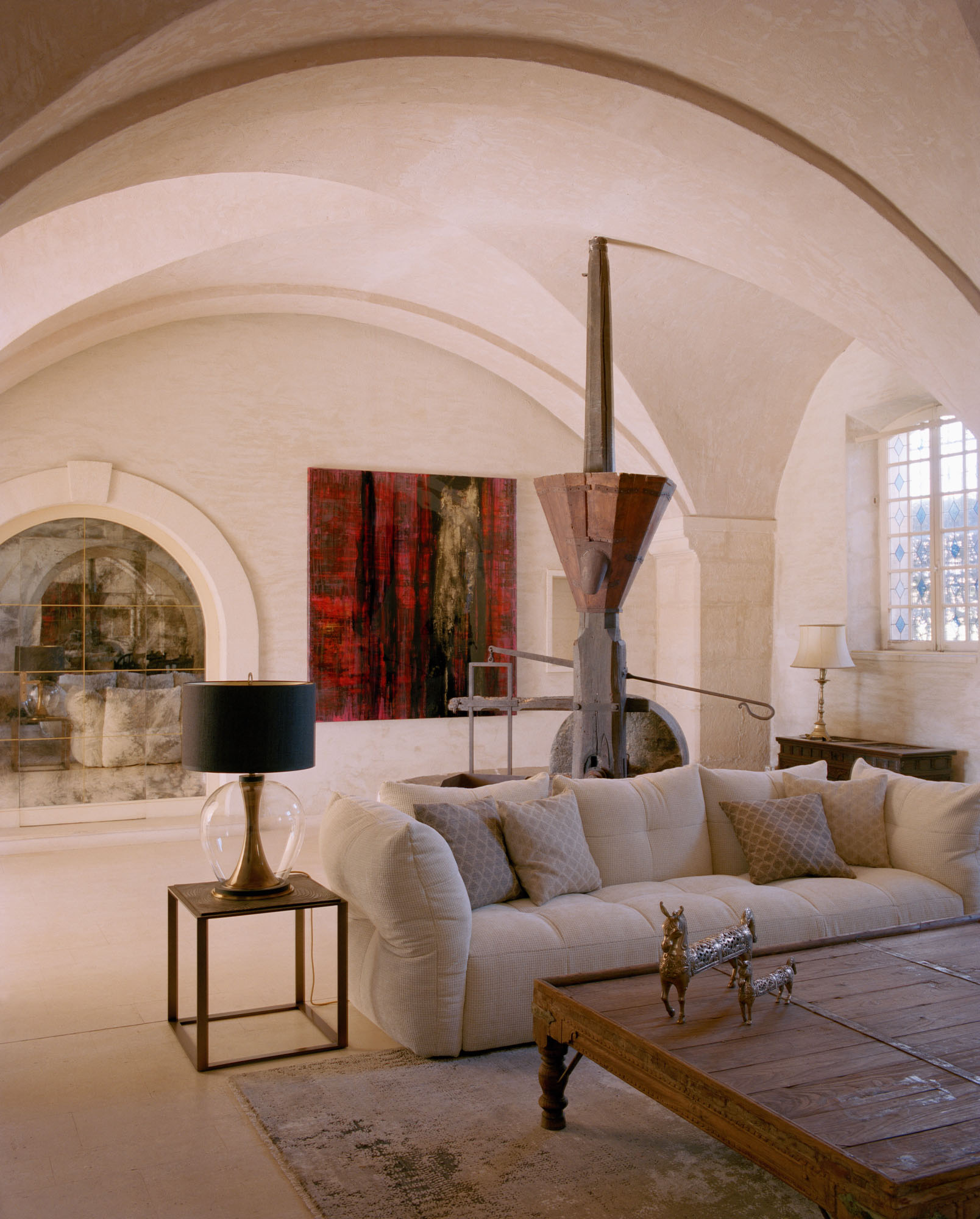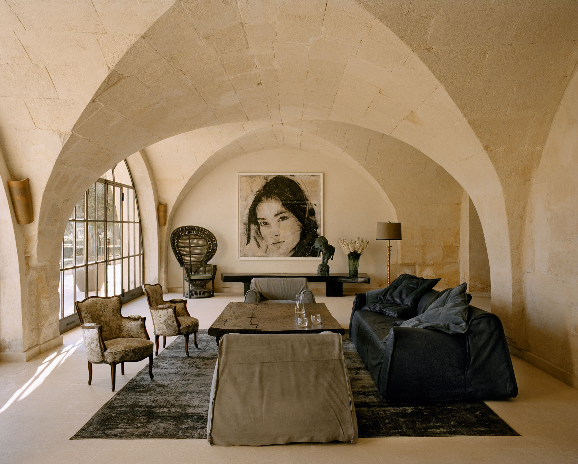 Throughout the house, you will find artwork collected over the years. There's a large living room with soaring vaulted stone ceilings, two fully equipped kitchens, one with a breakfast bar and the other with a formal dining space, and bedrooms with Pierre Frey fabrics and large shuttered windows.