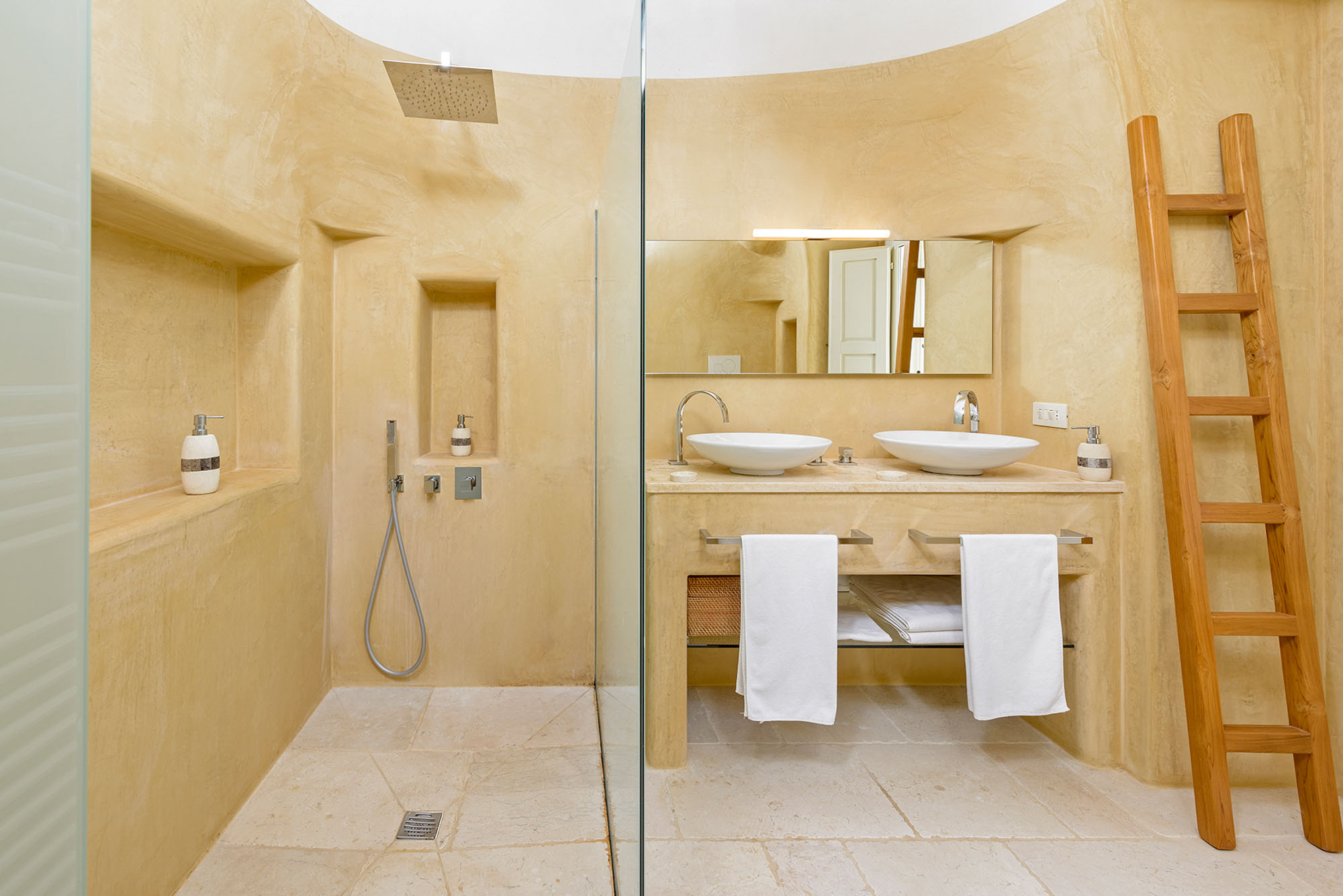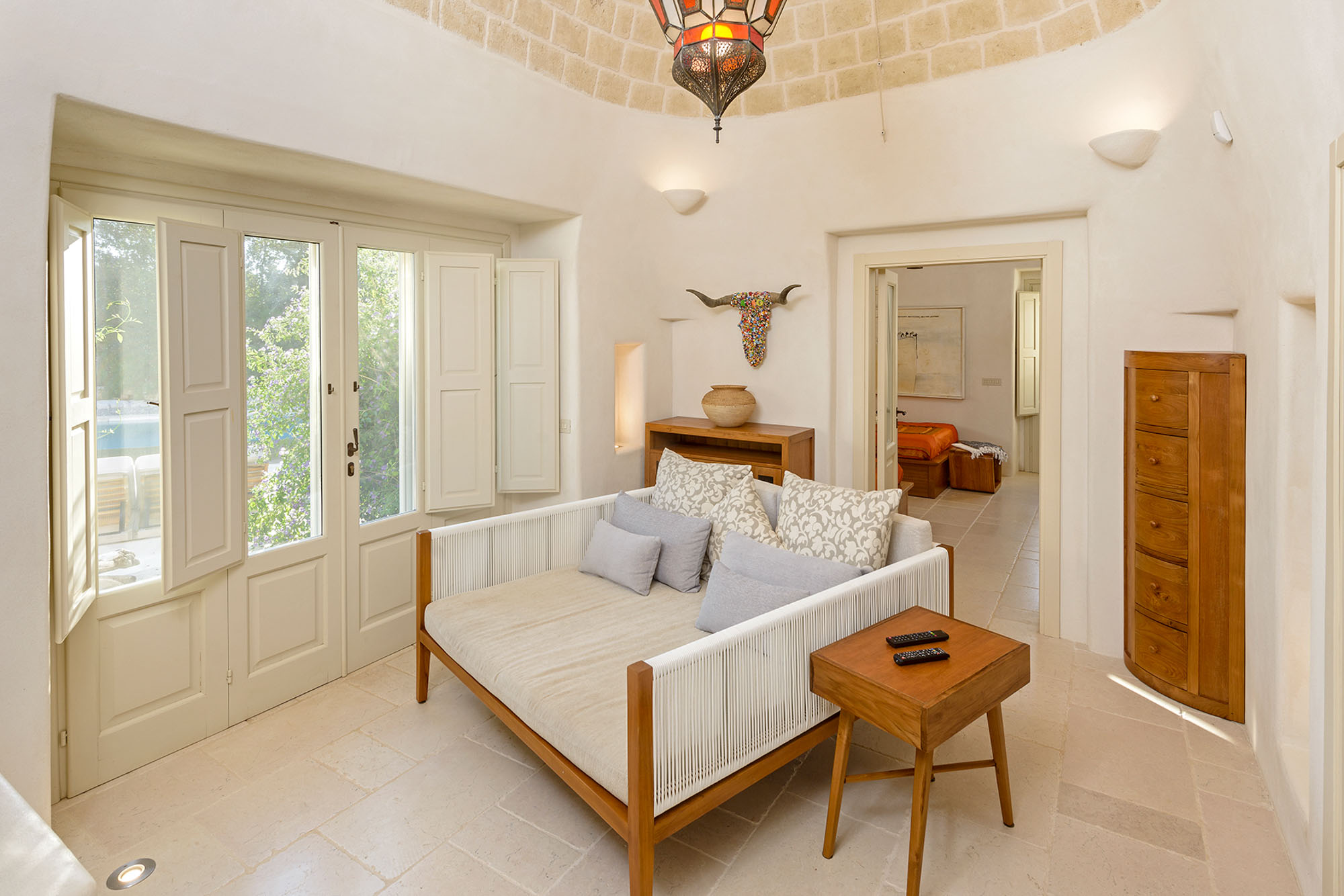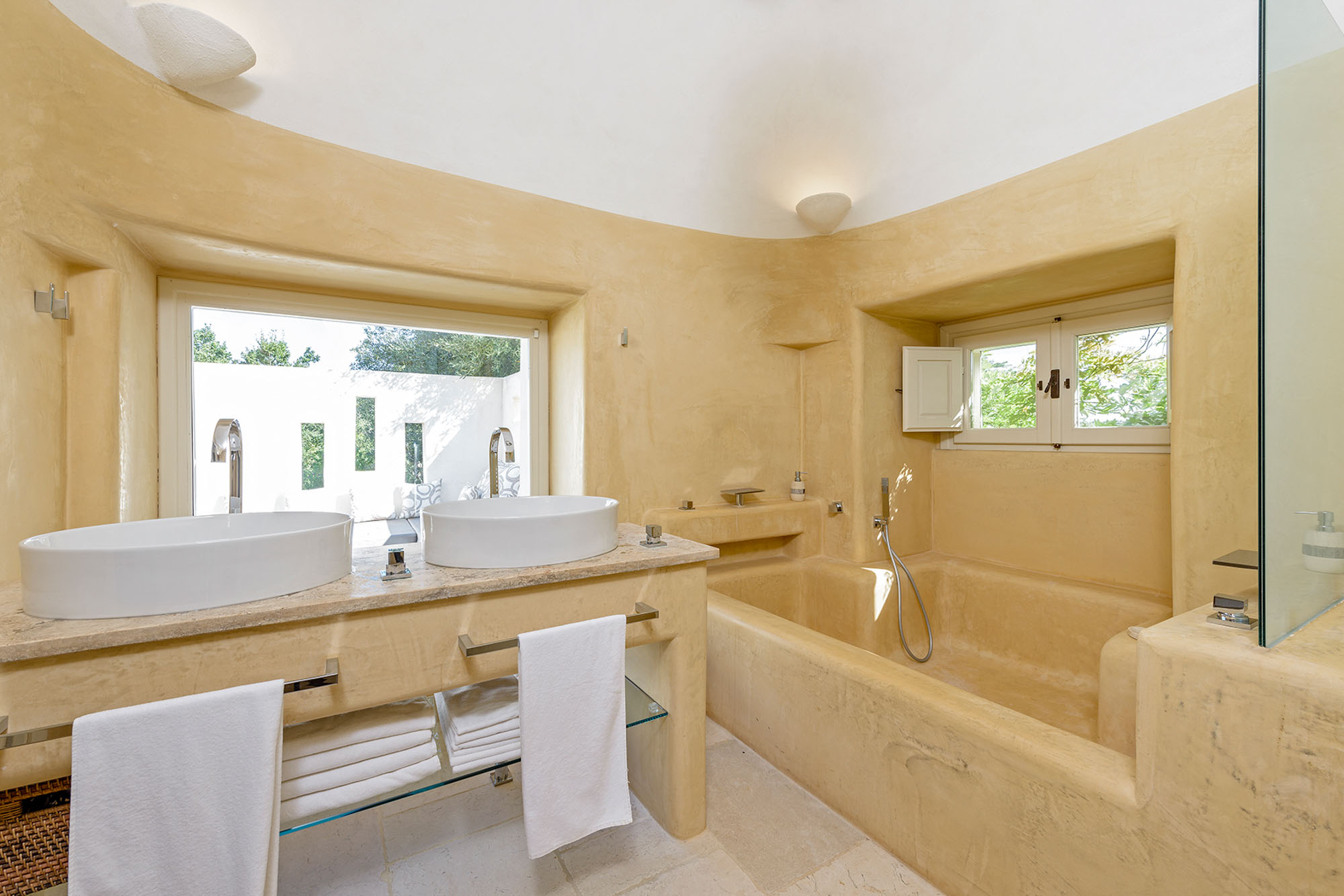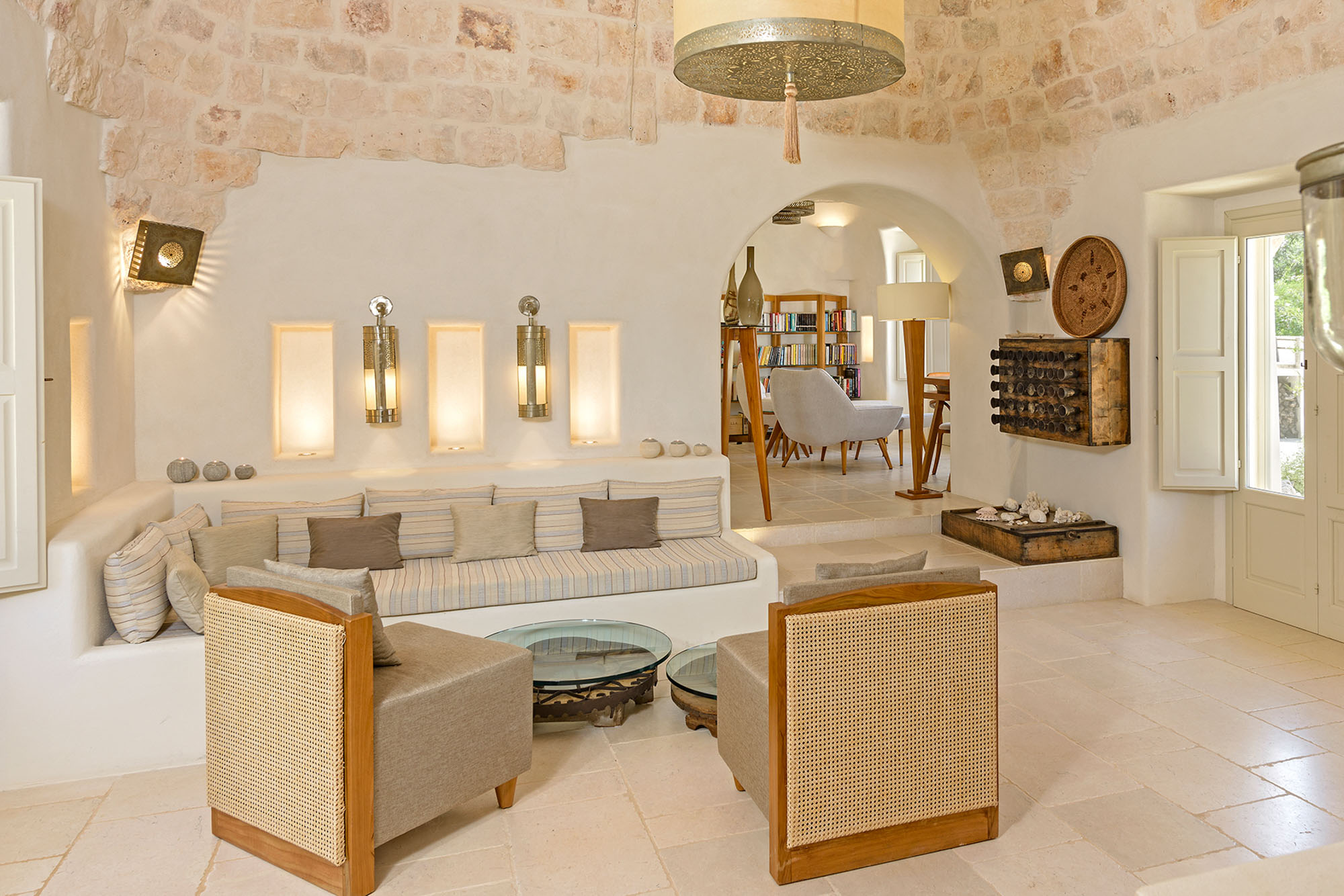 - pale floors, walls, soaring stone ceilings and furniture of honey-coloured wood or upholstered in neutral tones. Rooms flow into one another, from the kitchen-dining room to the living room, study room, and TV room. At one end are two en suite master bedrooms, each with its own gardens and outdoor showers, and at the other, two further twin rooms, with jewel-coloured bed coverings, sharing a large bathroom with a fabulous bath big enough for two. One of these rooms has a staircase to a mezzanine bedroom.