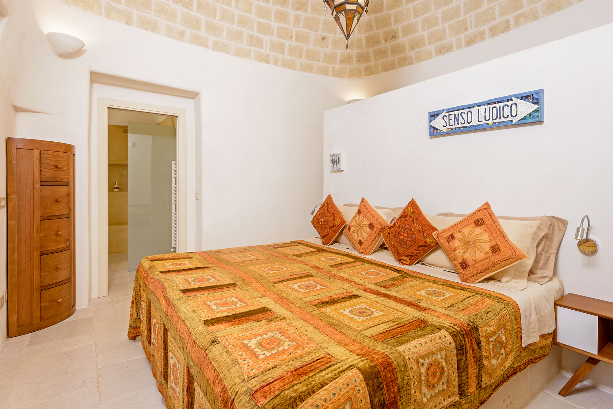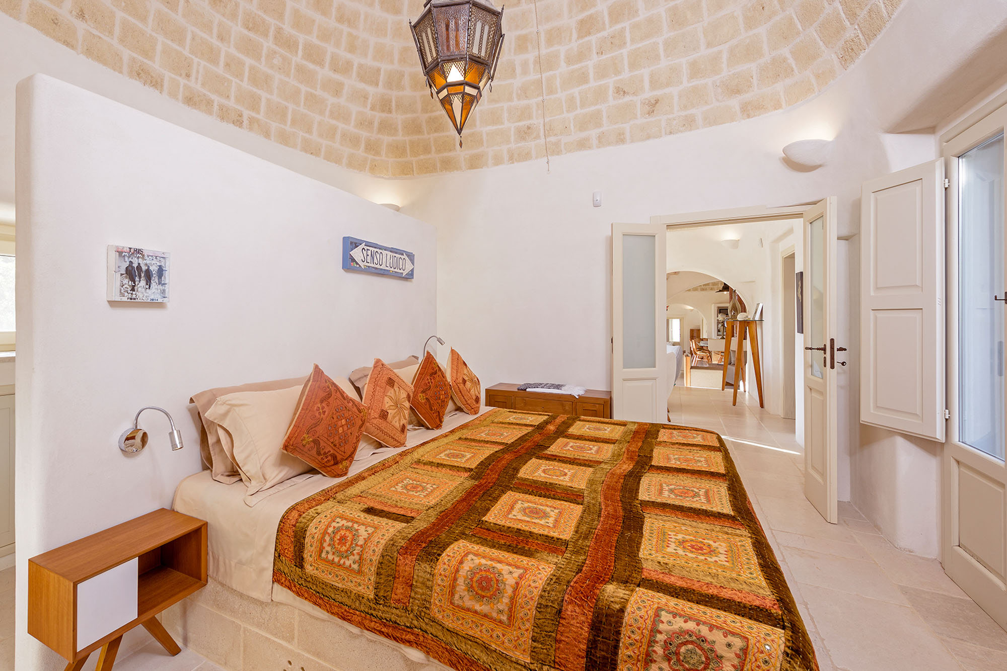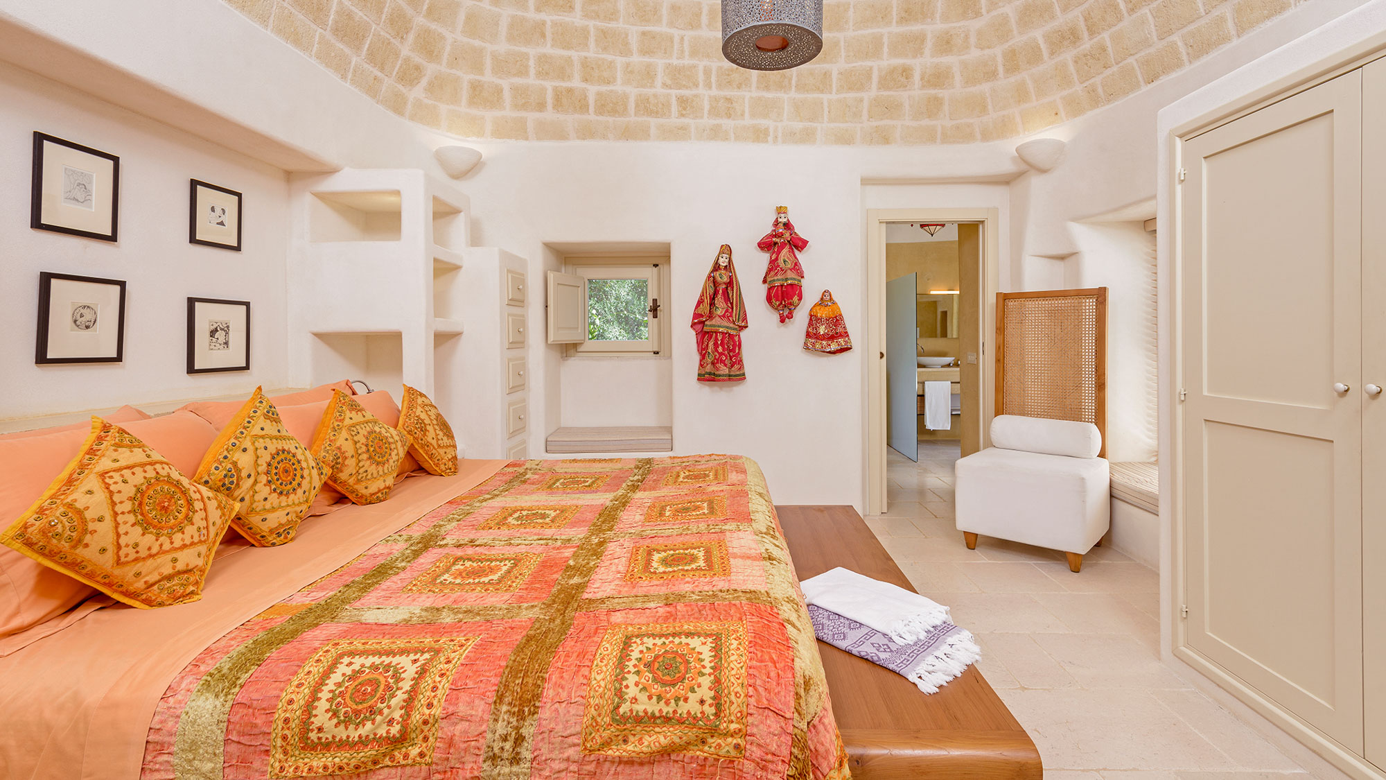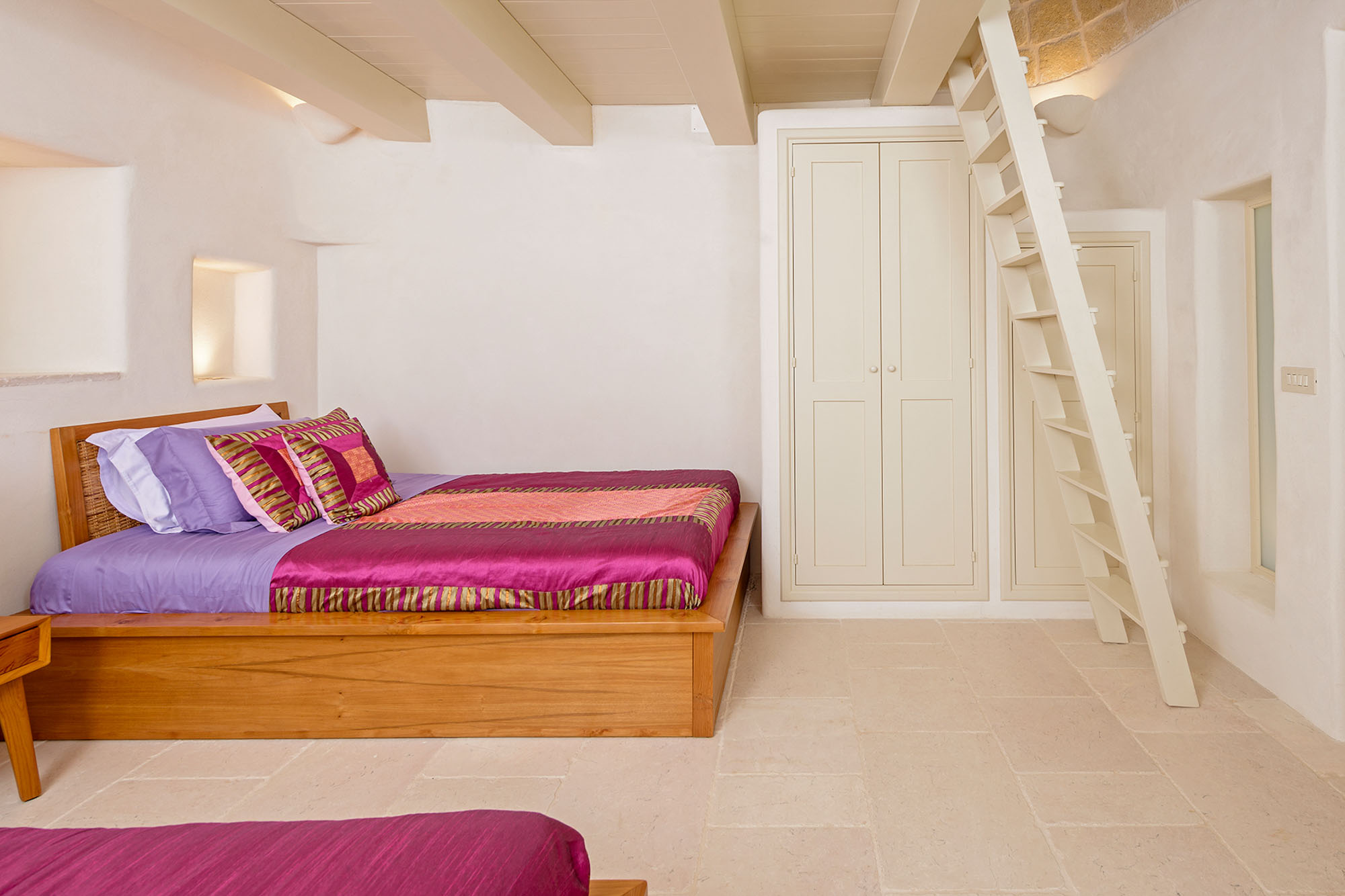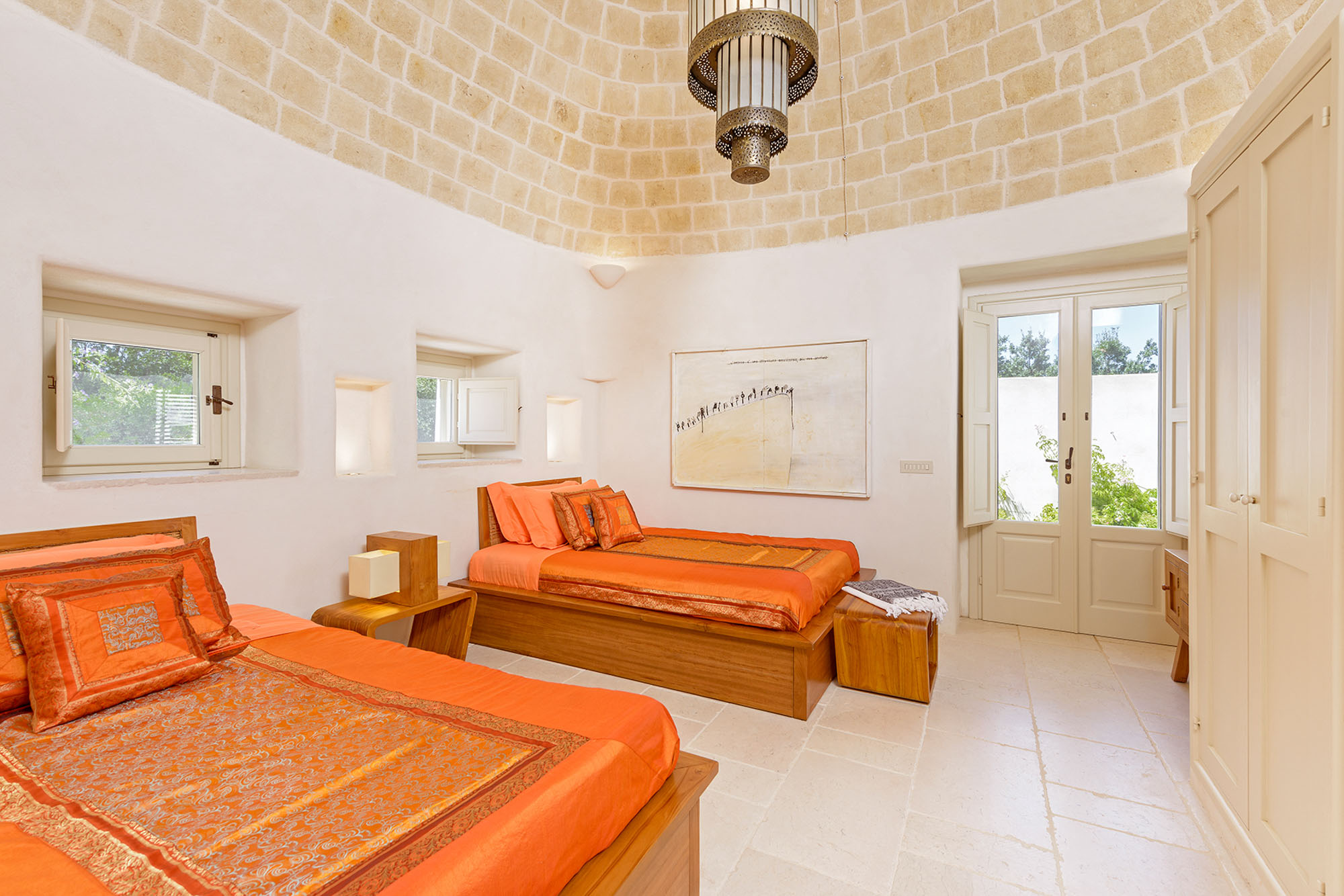 - pale floors, walls, soaring stone ceilings and furniture of honey-coloured wood or upholstered in neutral tones. Rooms flow into one another, from the kitchen-dining room to the living room, study room, and TV room. At one end are two en suite master bedrooms, each with its own gardens and outdoor showers, and at the other, two further twin rooms, with jewel-coloured bed coverings, sharing a large bathroom with a fabulous bath big enough for two. One of these rooms has a staircase to a mezzanine bedroom.