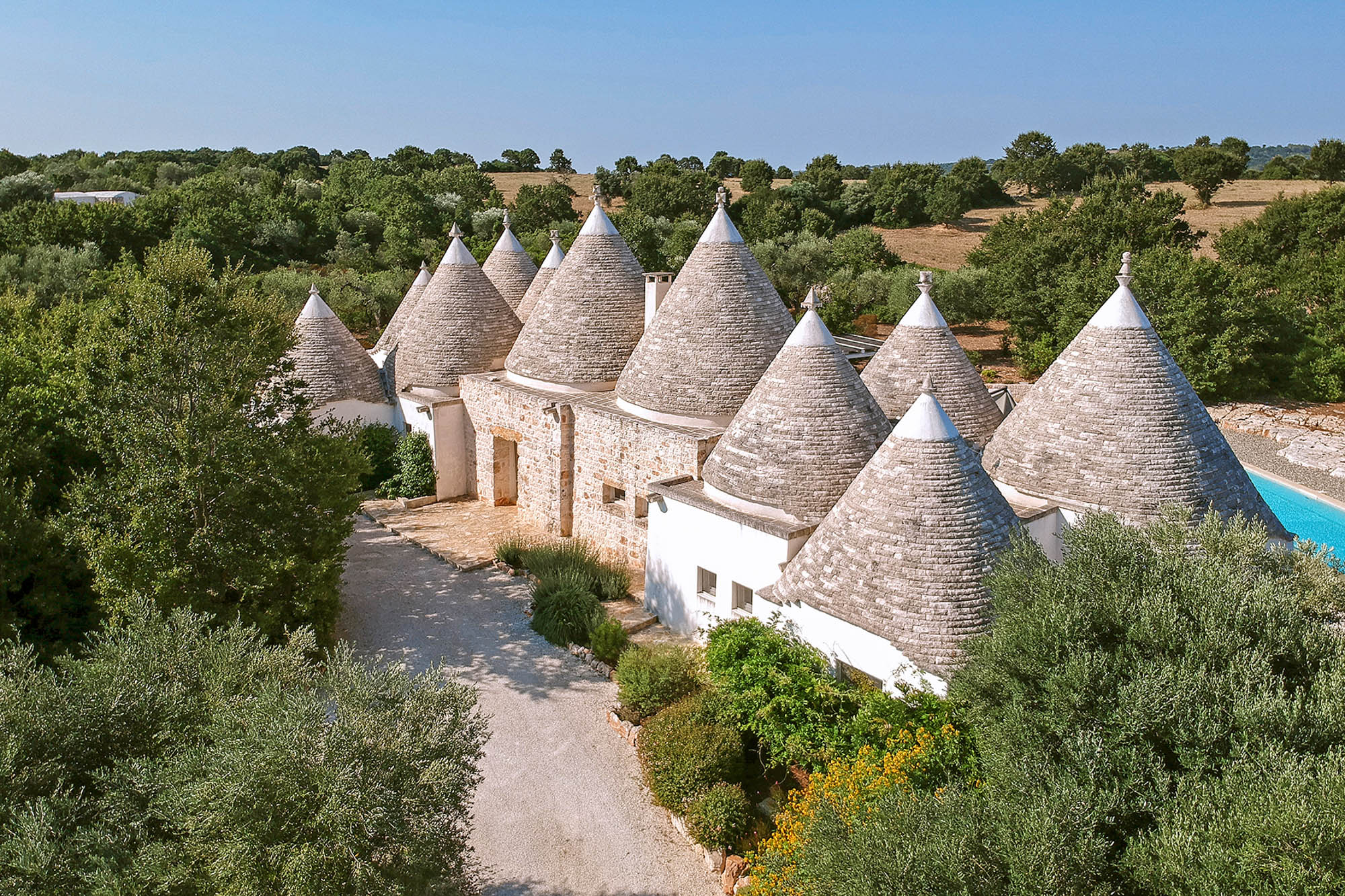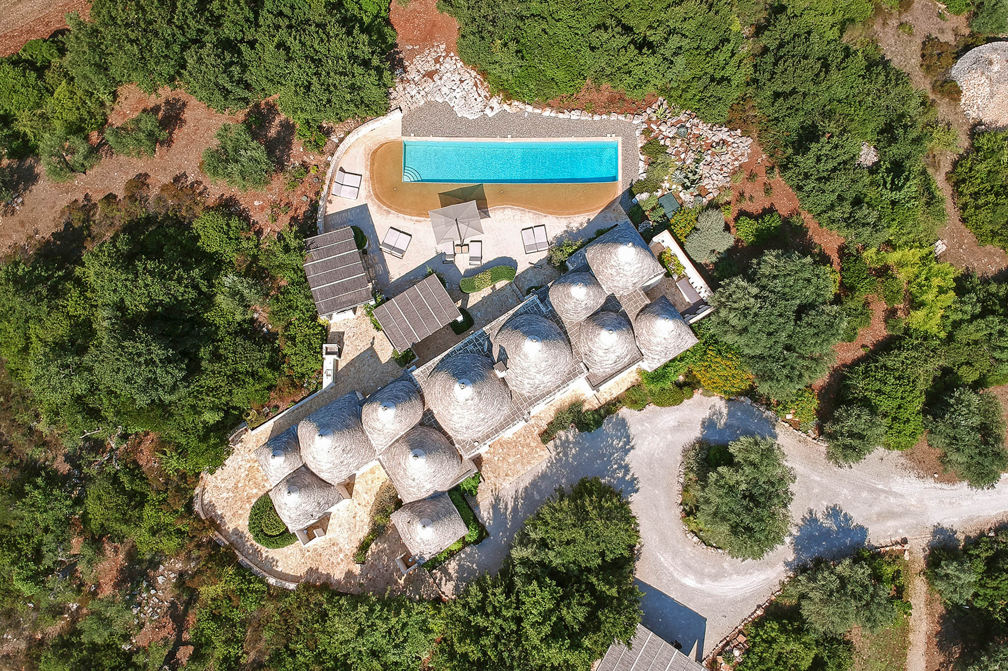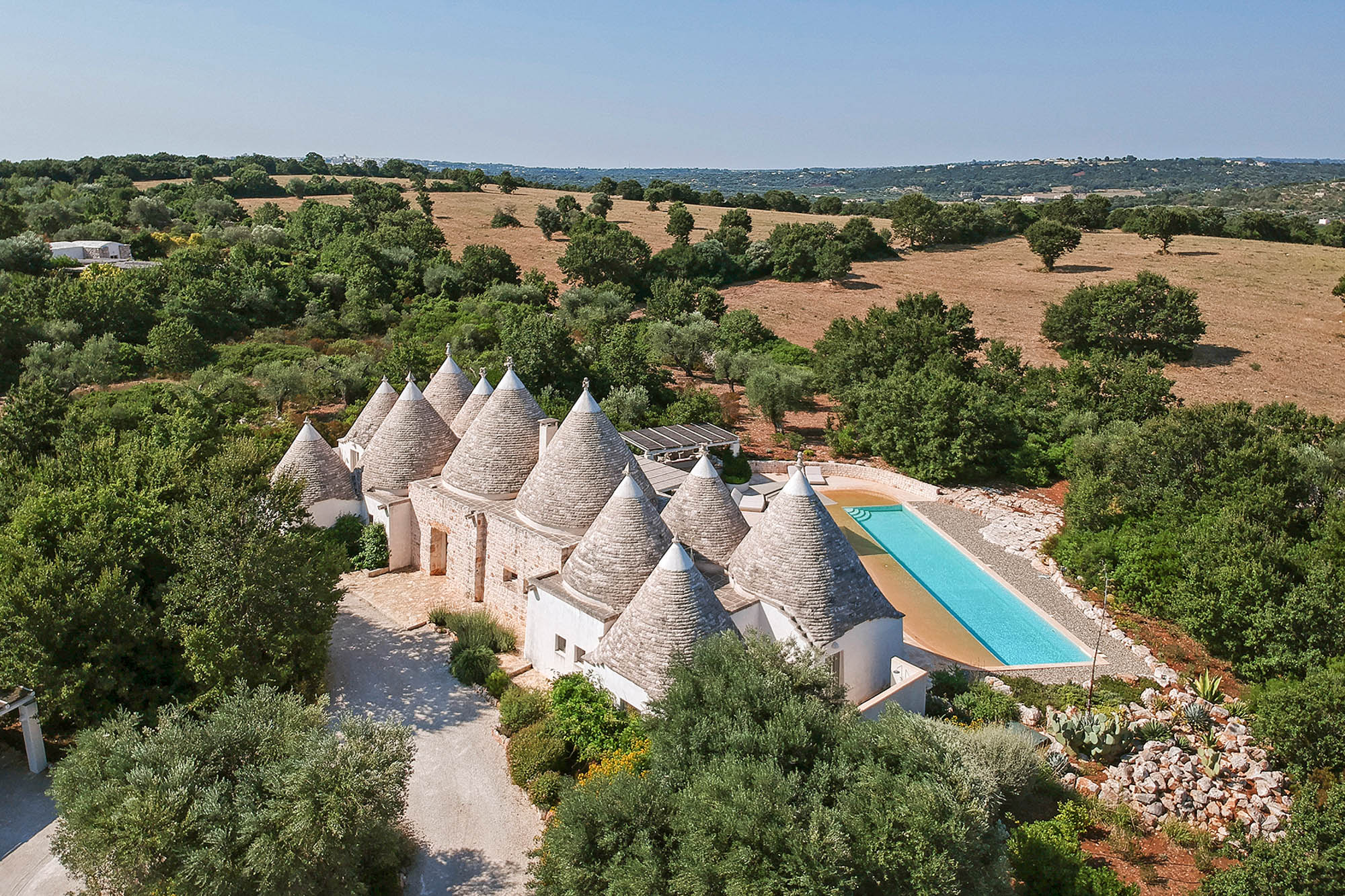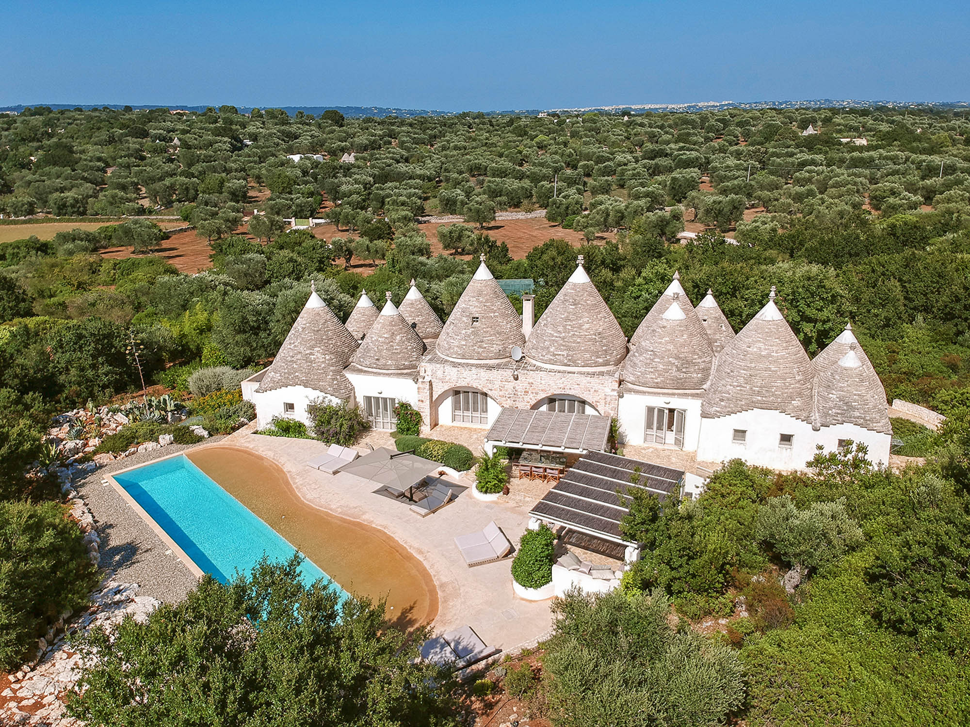 It's newly built, using skilled local craftsmen and blending modern interior aesthetics with traditional building techniques. Set within 6 acres of private land and surrounded by farmland and olive groves, the location is so private and peaceful, yet there are six Michelin-starred restaurants within half an hour's drive and lovely beaches on both the Adriatic and Ionian coasts to explore.