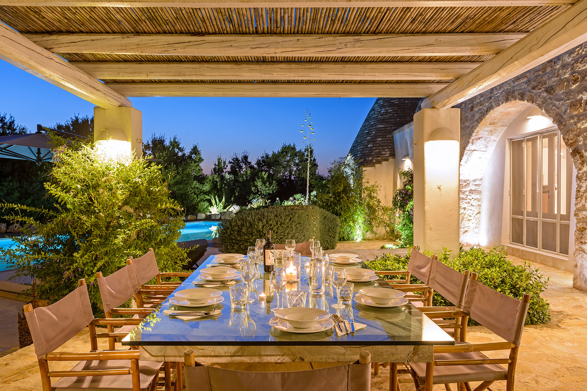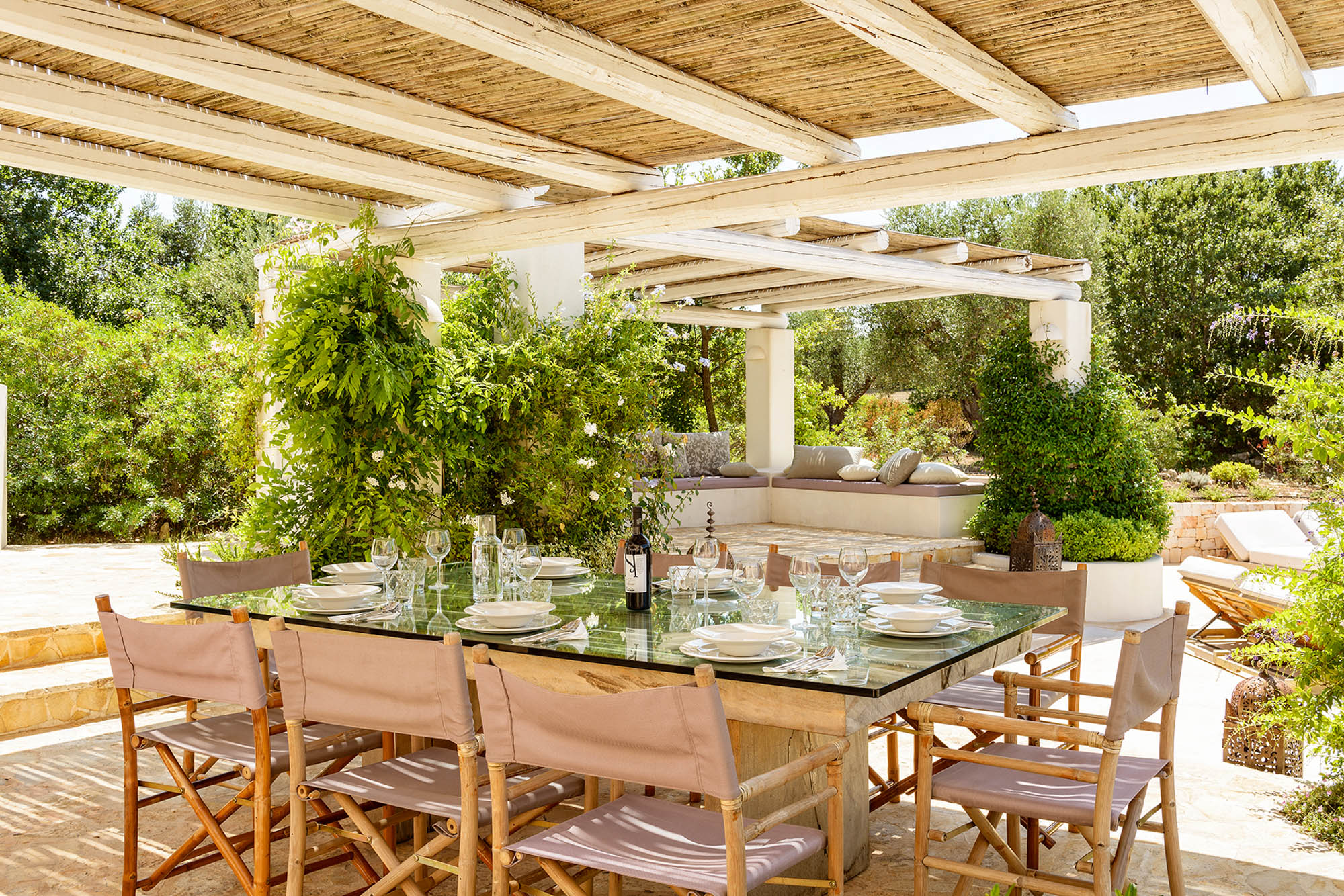 Woven roofed pergolas shade an outdoor kitchen with a barbecue, a large glass and teak dining table and a lounge area, all softened by luxuriant planting. Enjoy the views by day and the long evenings lit by ambient lighting.
