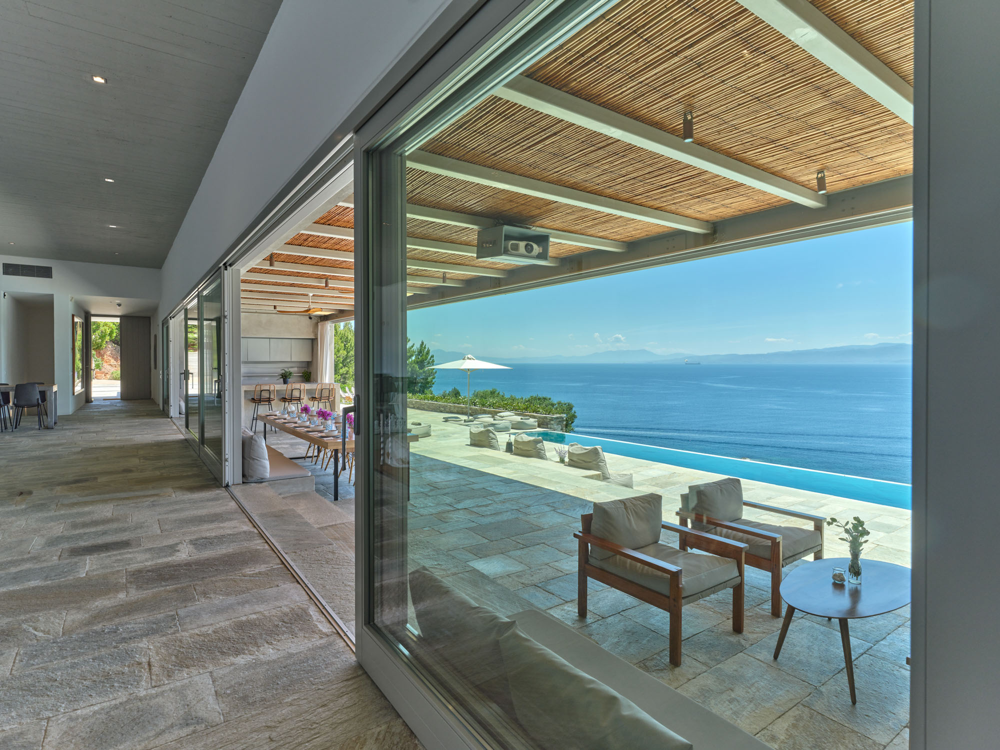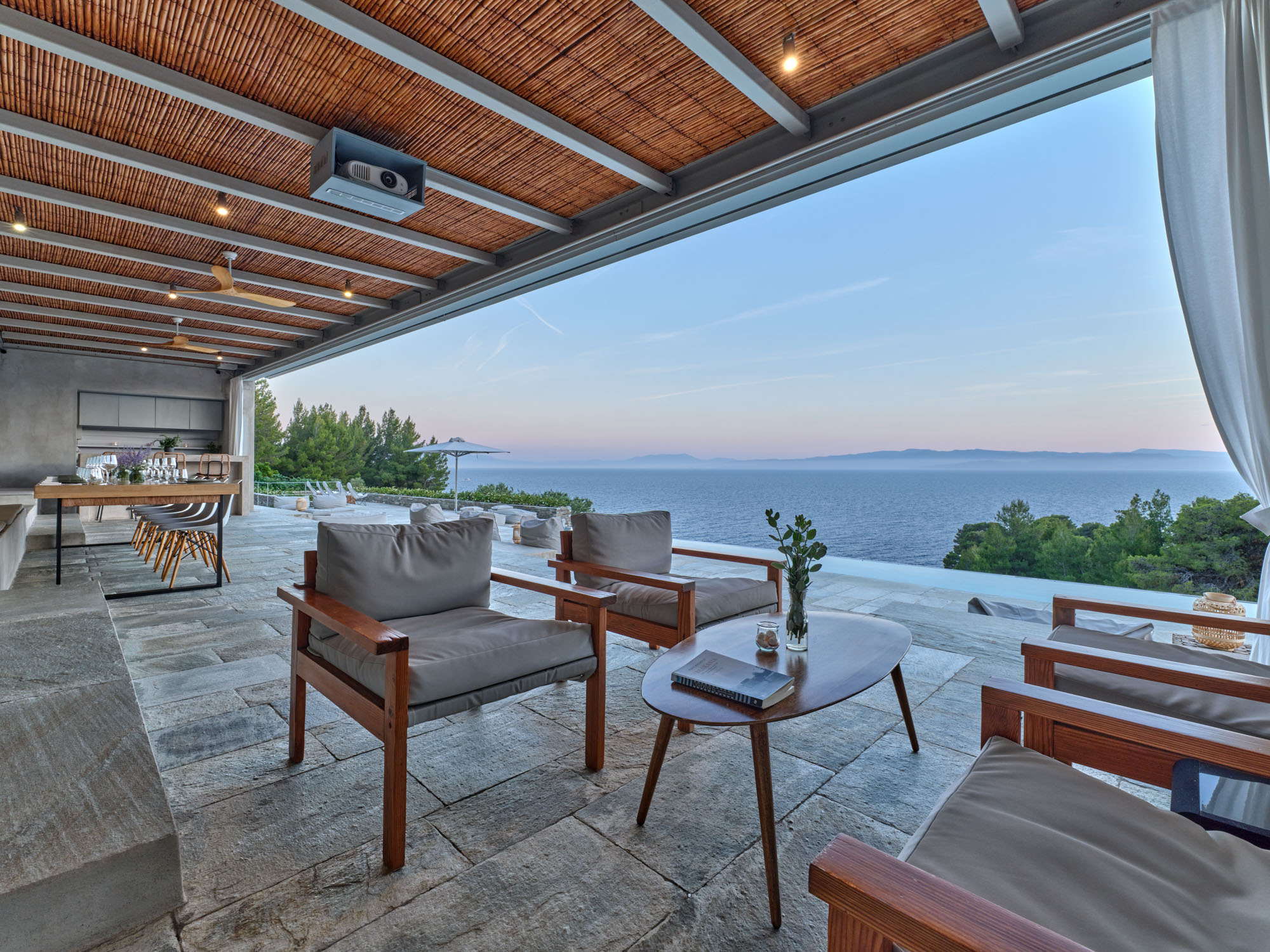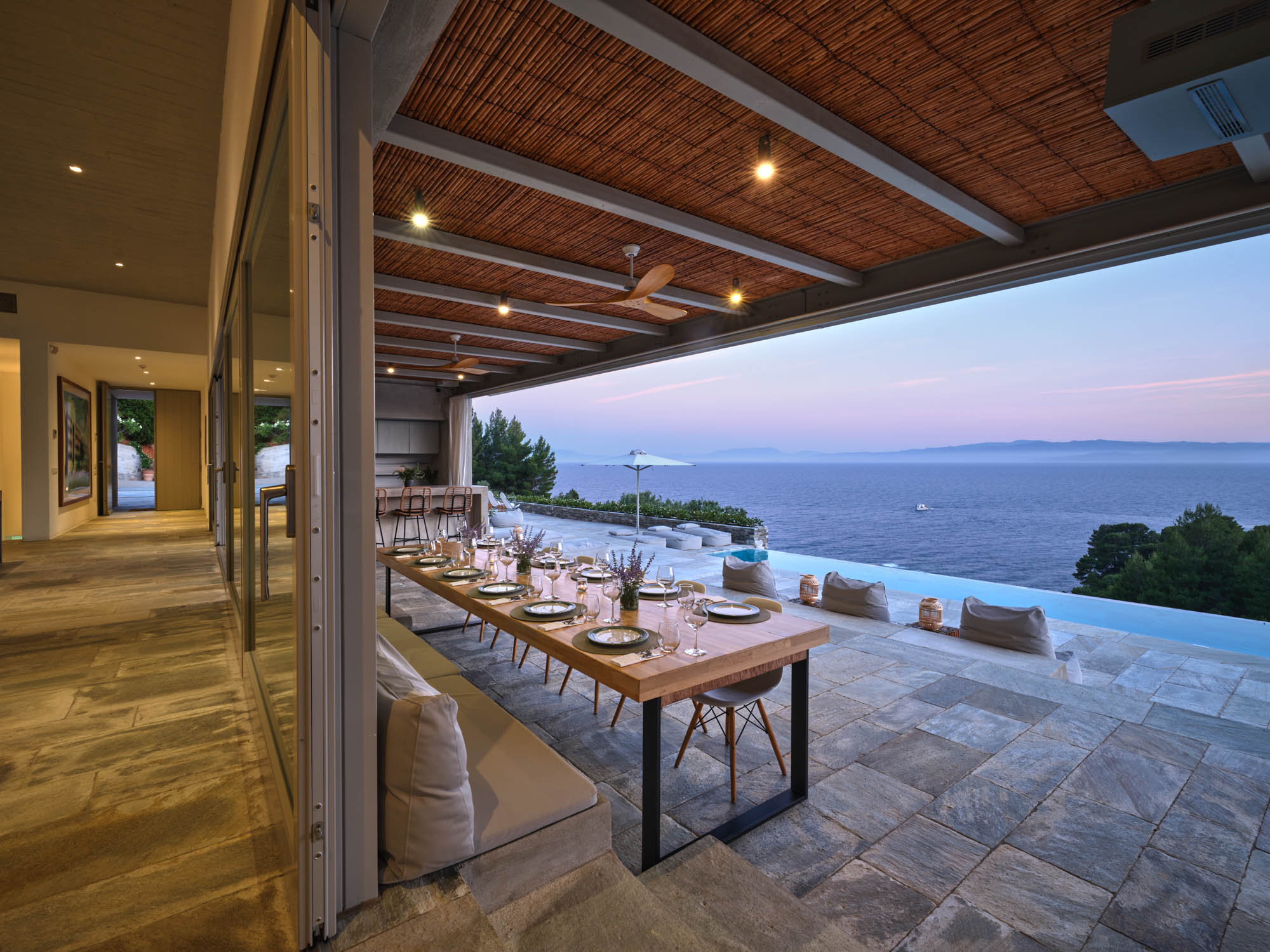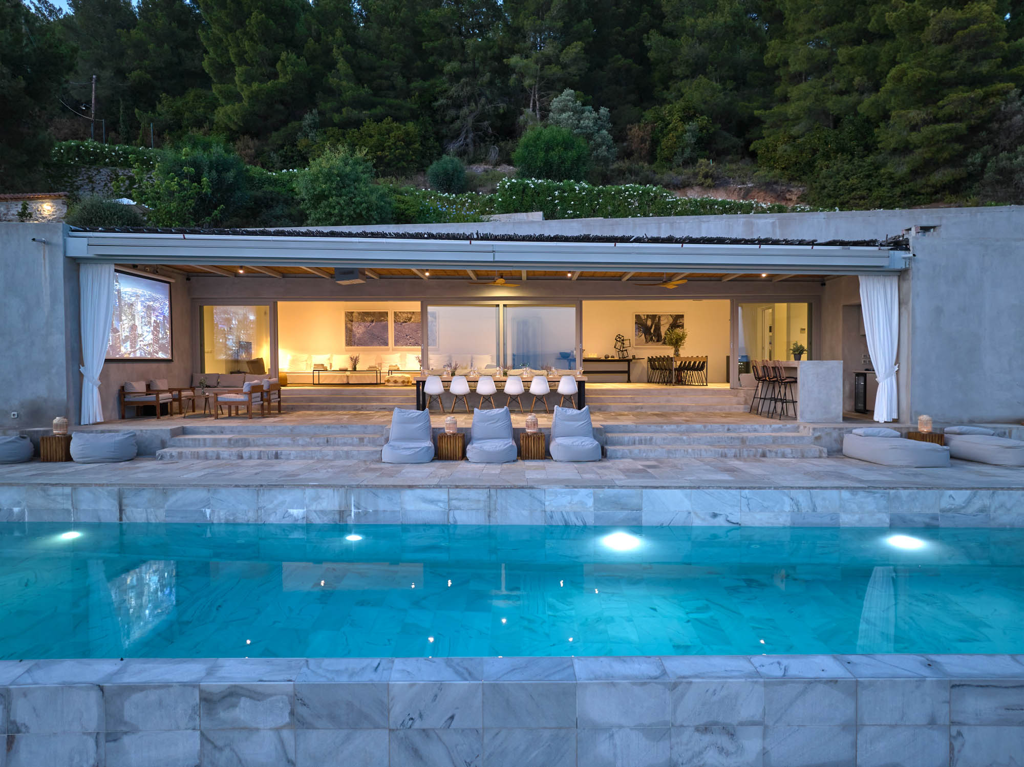 They open to a covered expanse of terrace housing a long dining table for 12, with overhead fans, barbecue and fridge. Steps lead down to an inviting 25m Parian marble freshwater swimming pool, beside which are an outdoor projector and large, comfortable sun loungers. A chef is available to prepare meals.