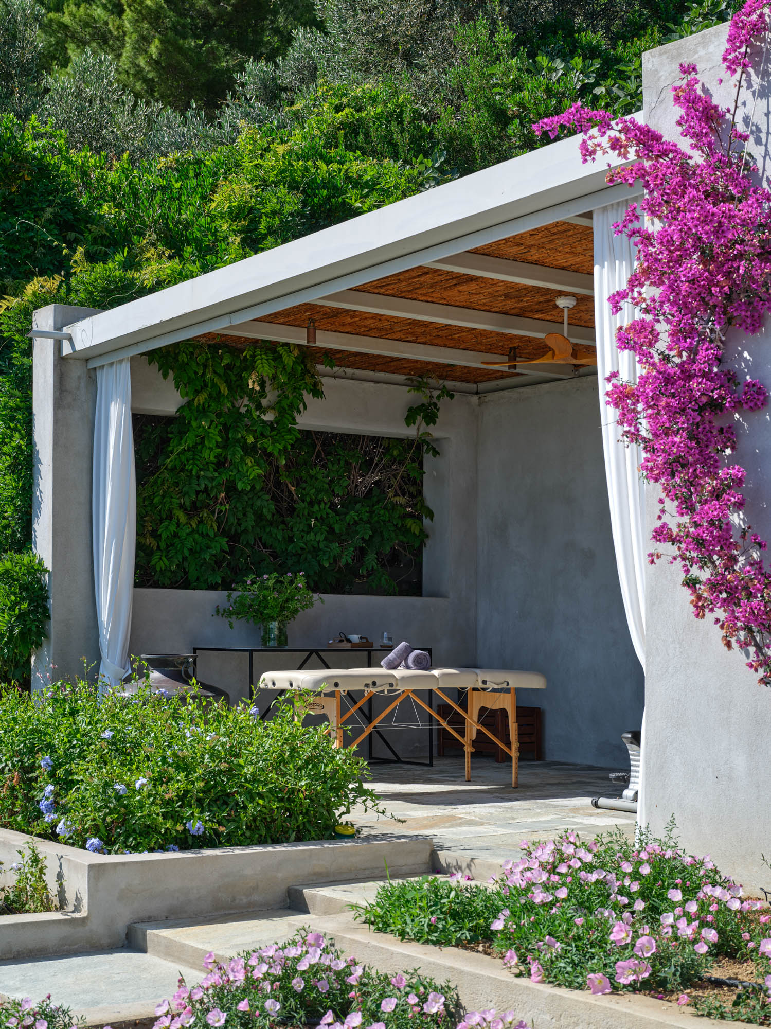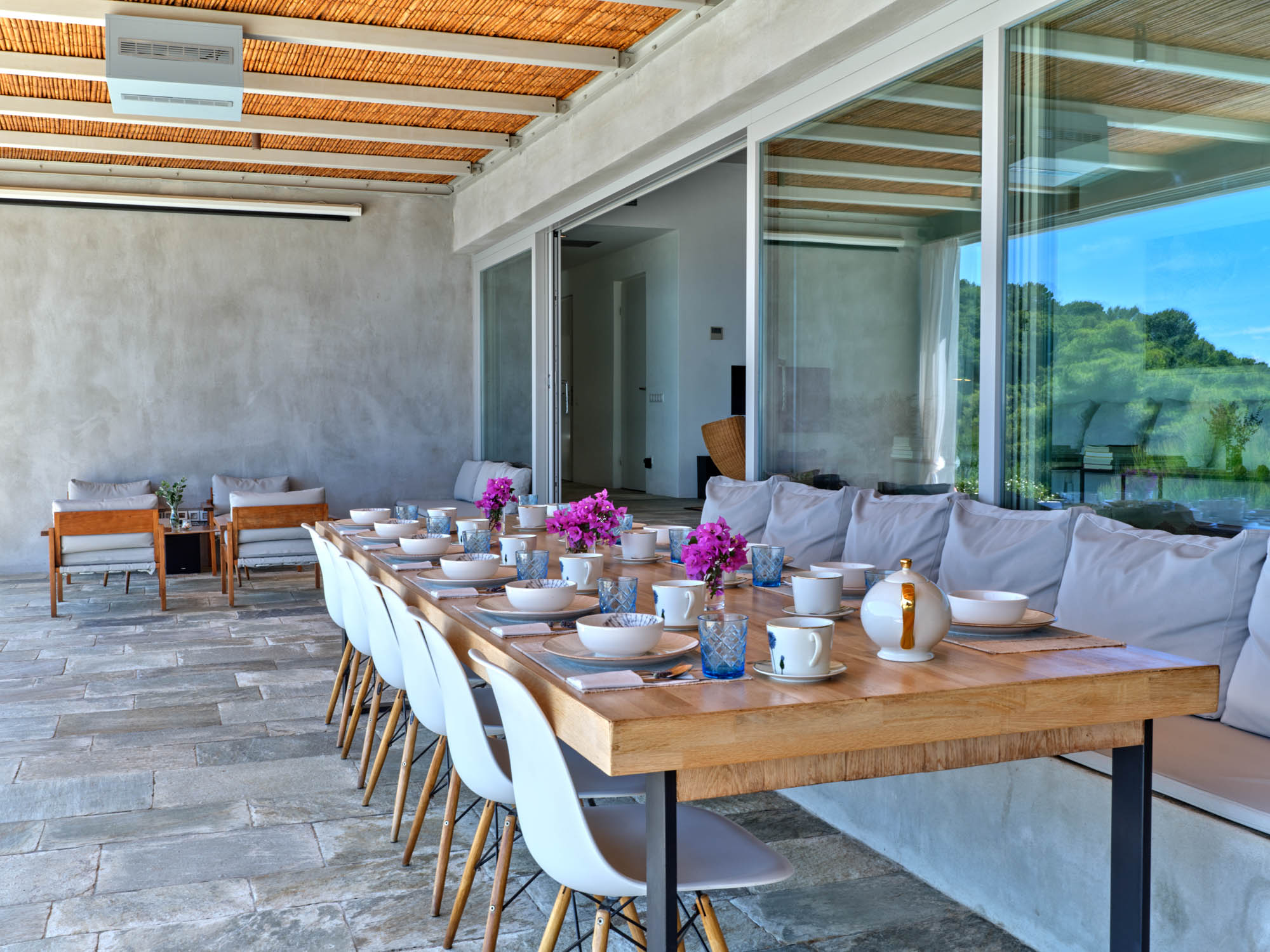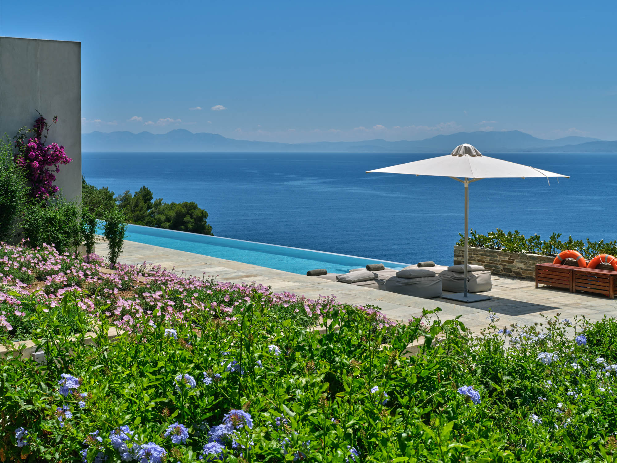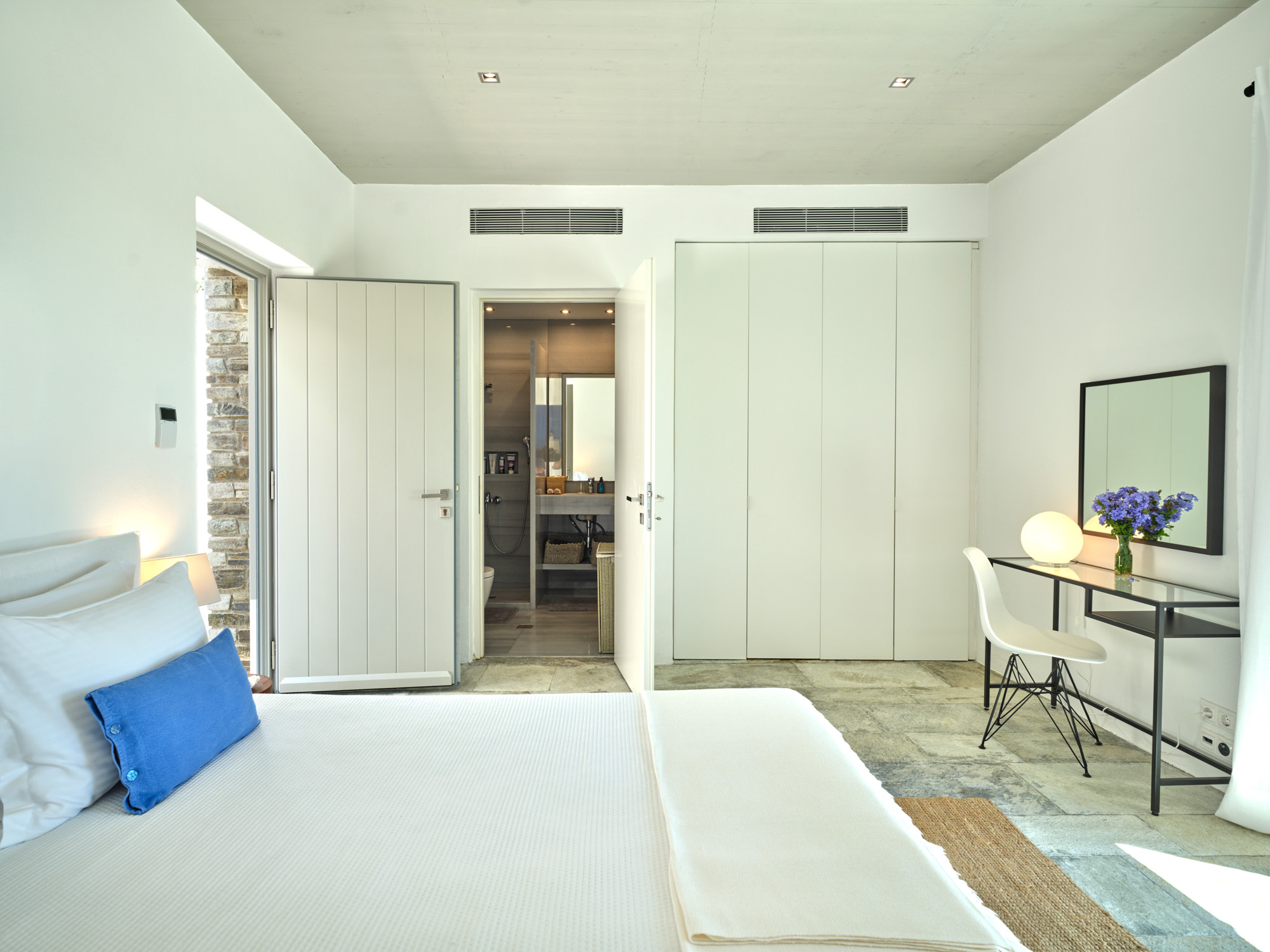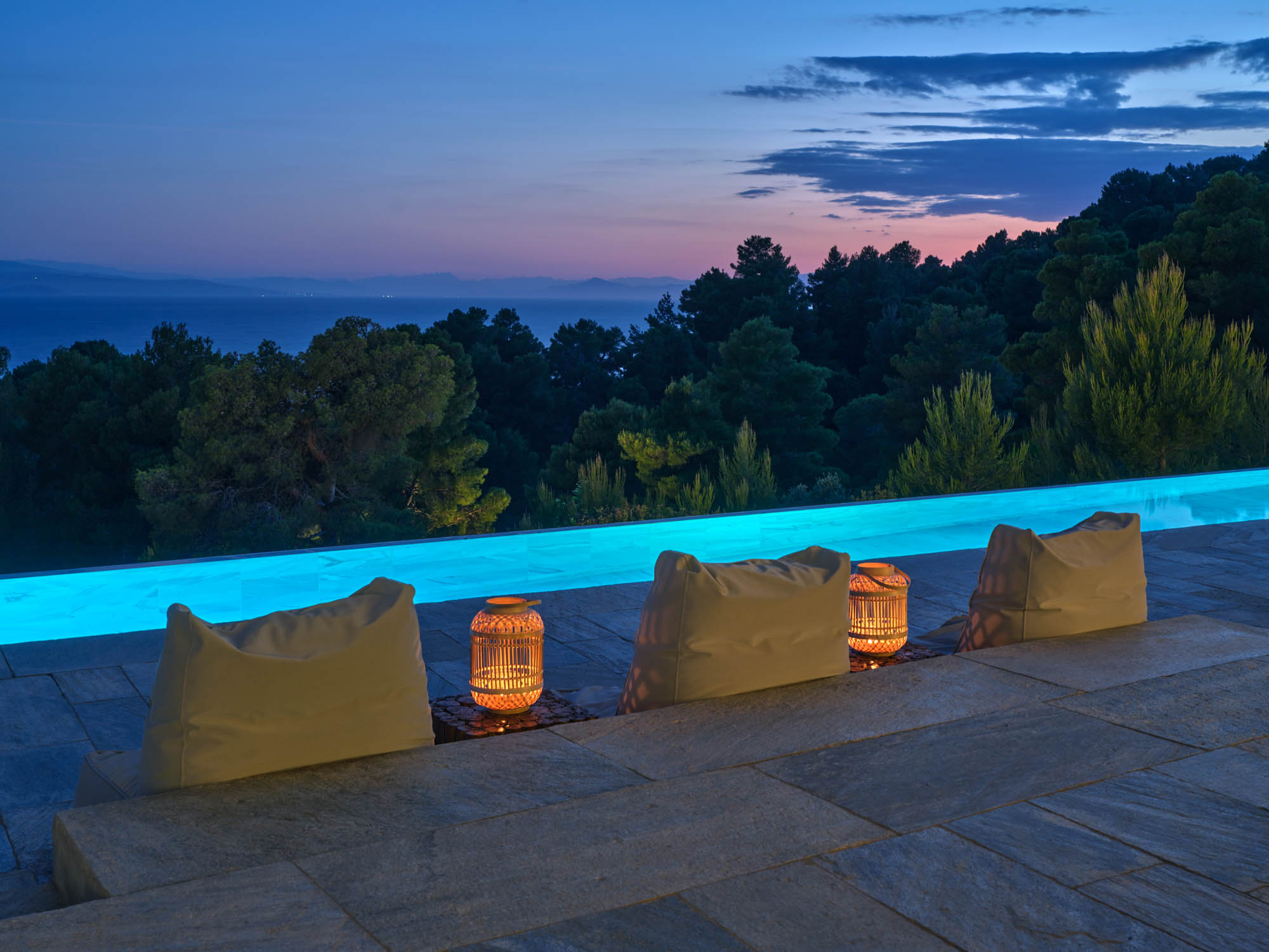 They open to a covered expanse of terrace housing a long dining table for 12, with overhead fans, barbecue and fridge. Steps lead down to an inviting 25m Parian marble freshwater swimming pool, beside which are an outdoor projector and large, comfortable sun loungers. A chef is available to prepare meals.