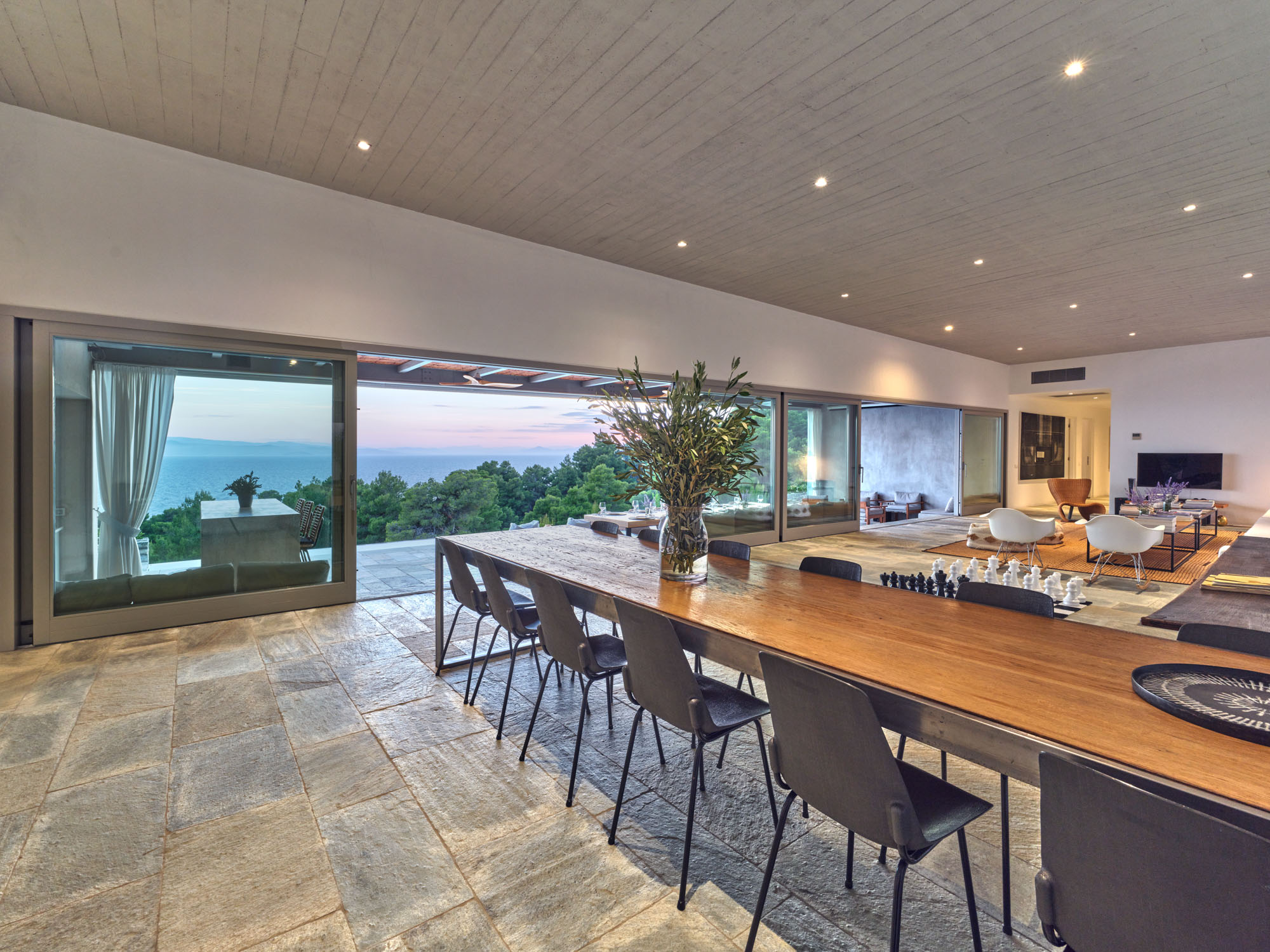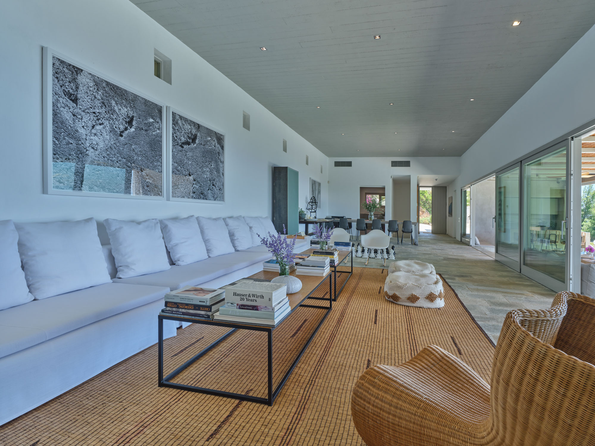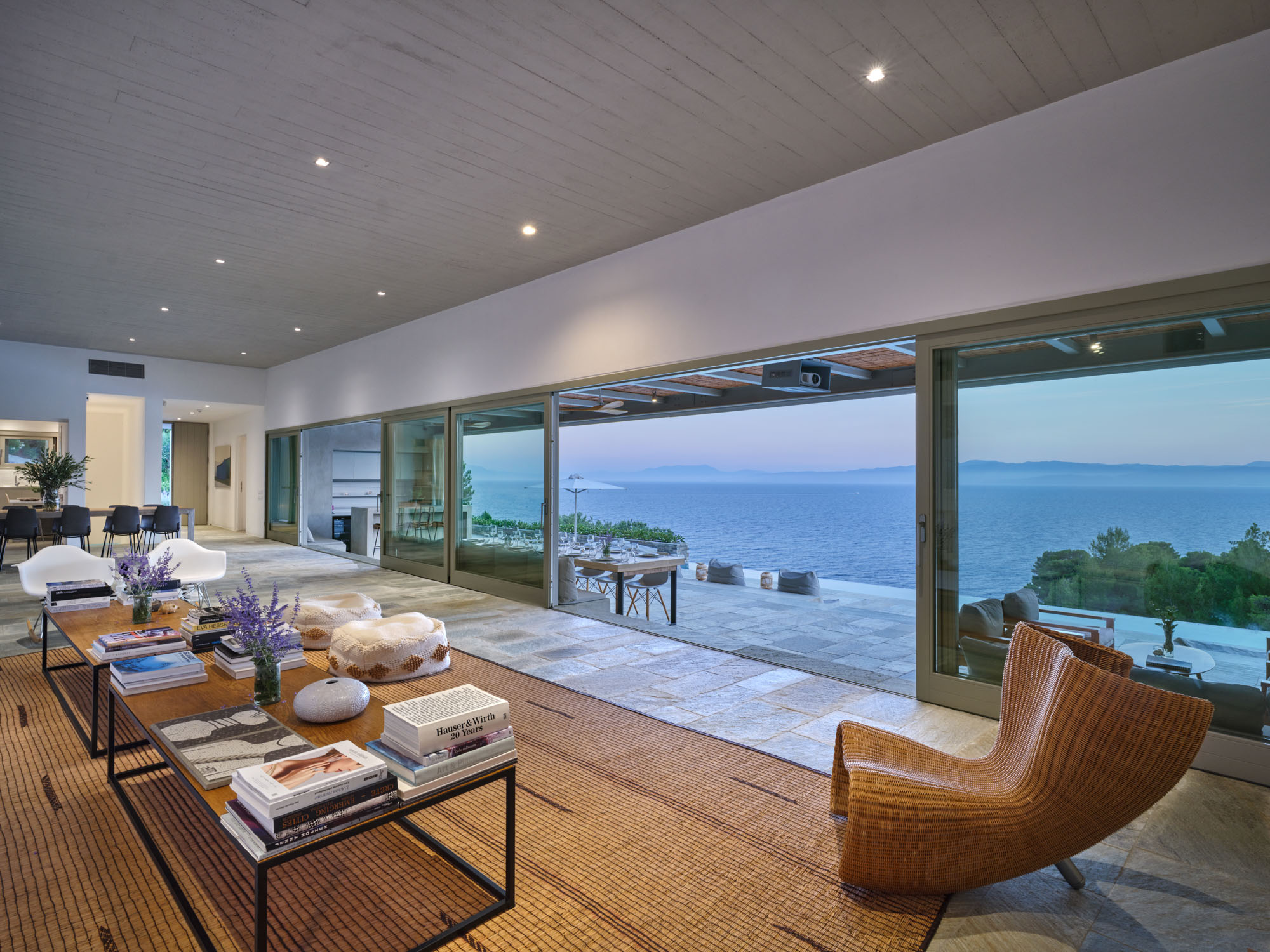 The large open-plan living and dining room has wonderful sea views and lots of light. The uncluttered, minimalist interiors create a calm, restful ambience without sacrificing comfort and welcoming decorative details.