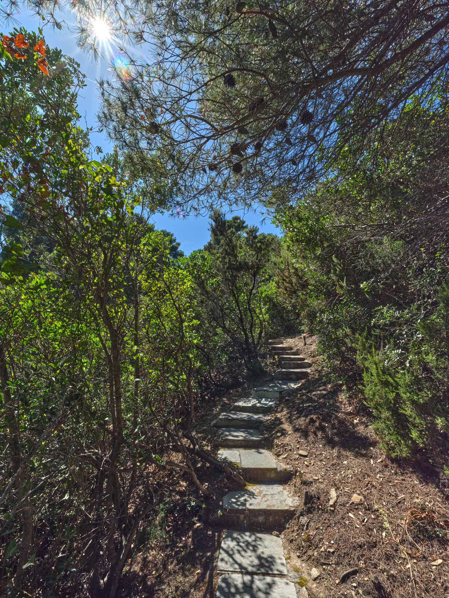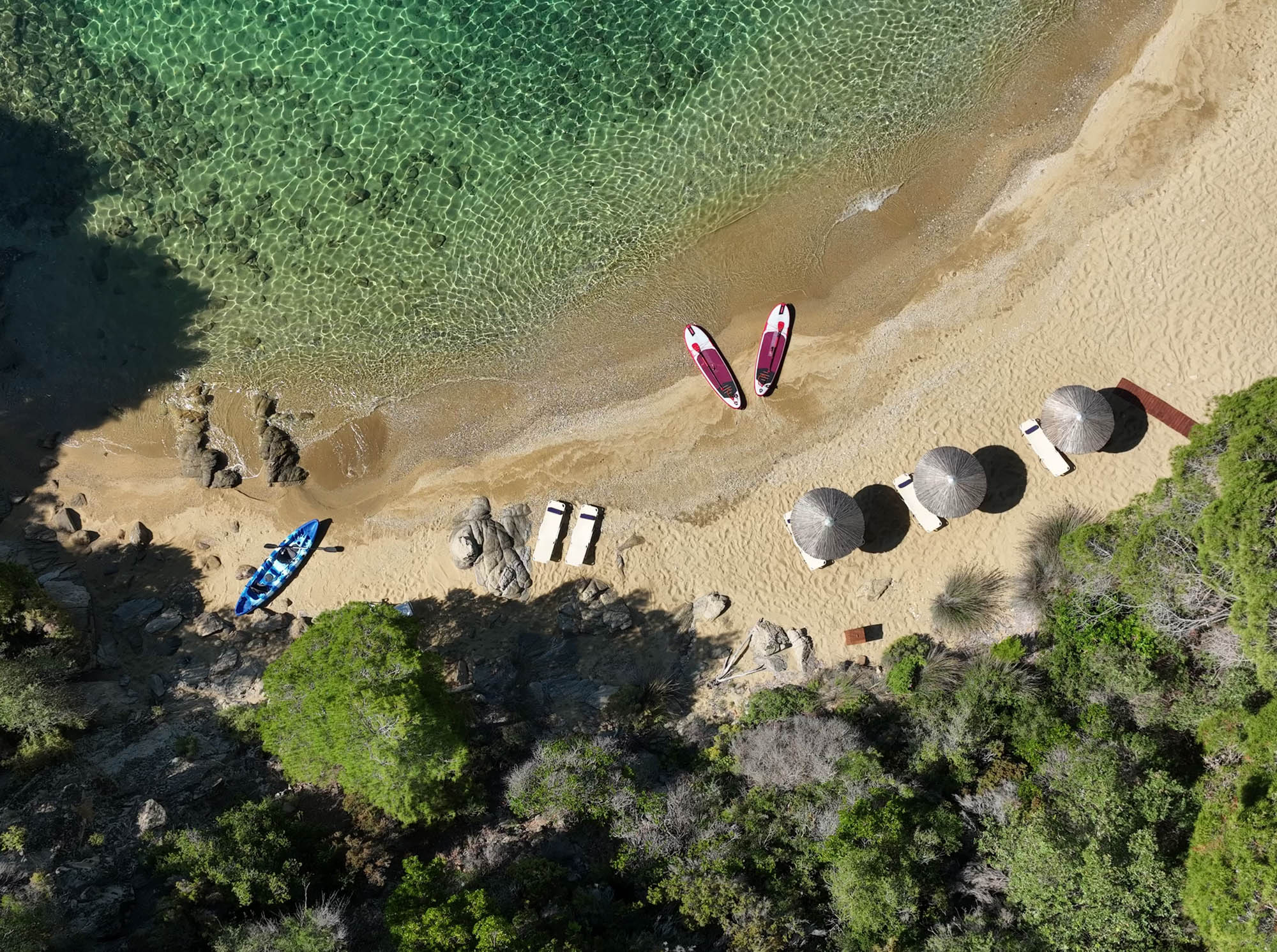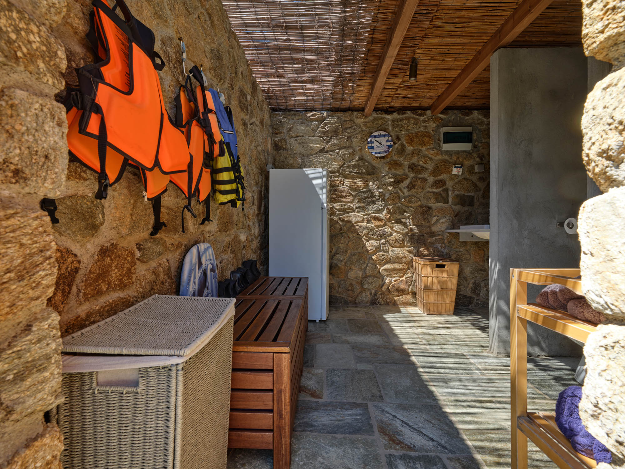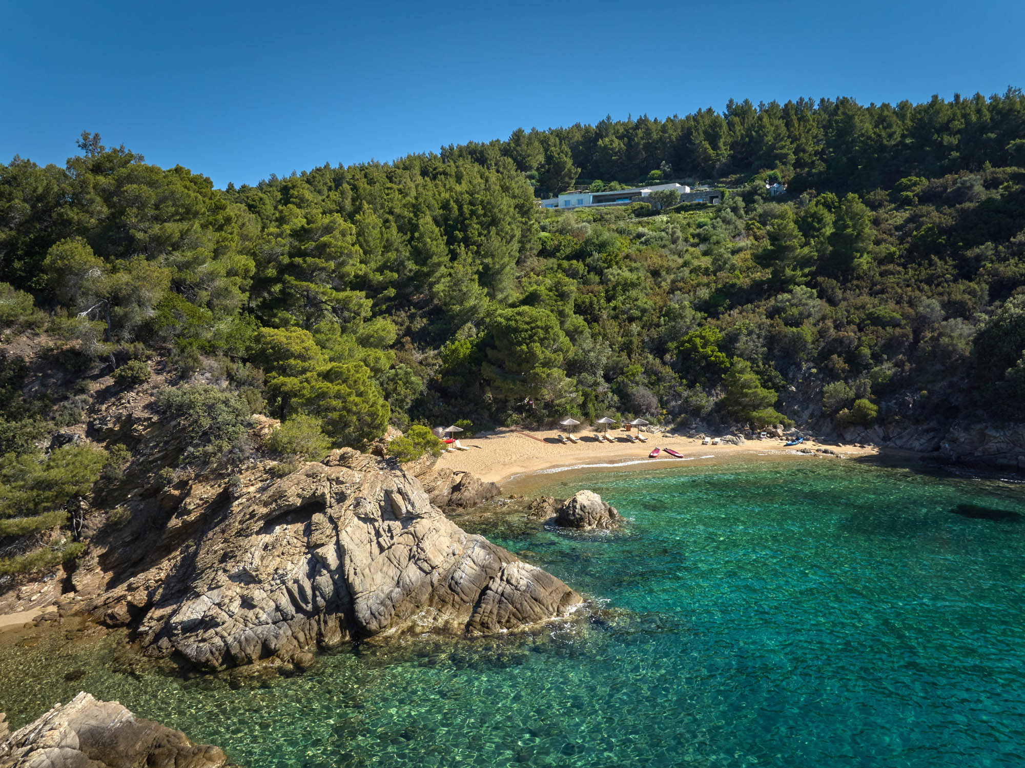 A path leads downhill to a little cove with a small, sandy, unspoilt beach equipped with sun beds and umbrellas. Between the villa and beach is a small stone building with a refrigerator, shower and toilet.