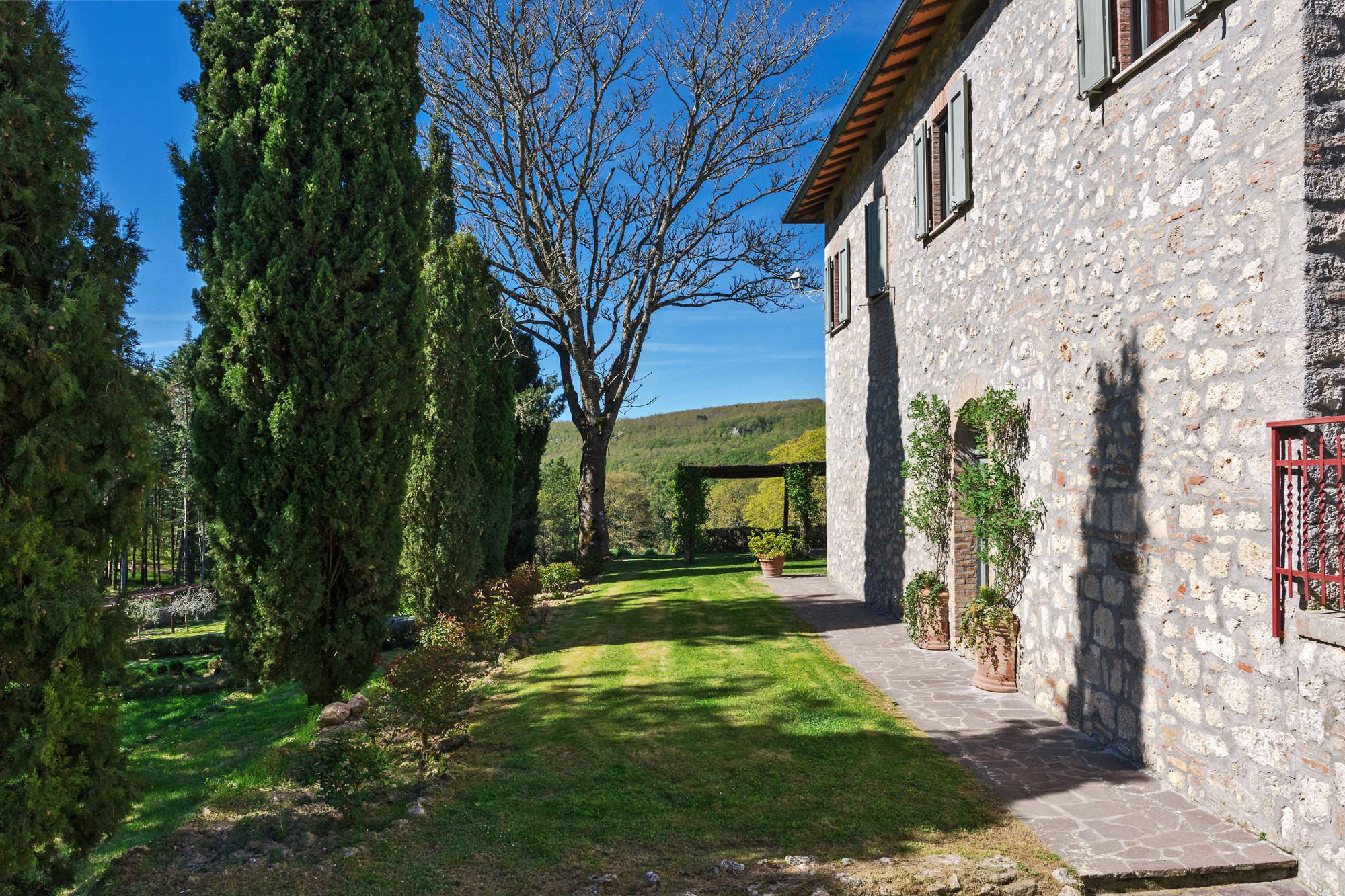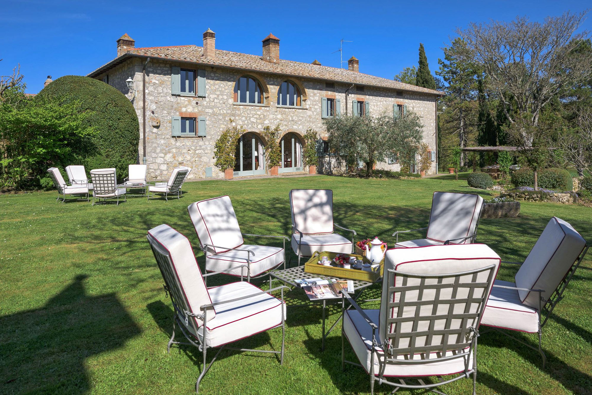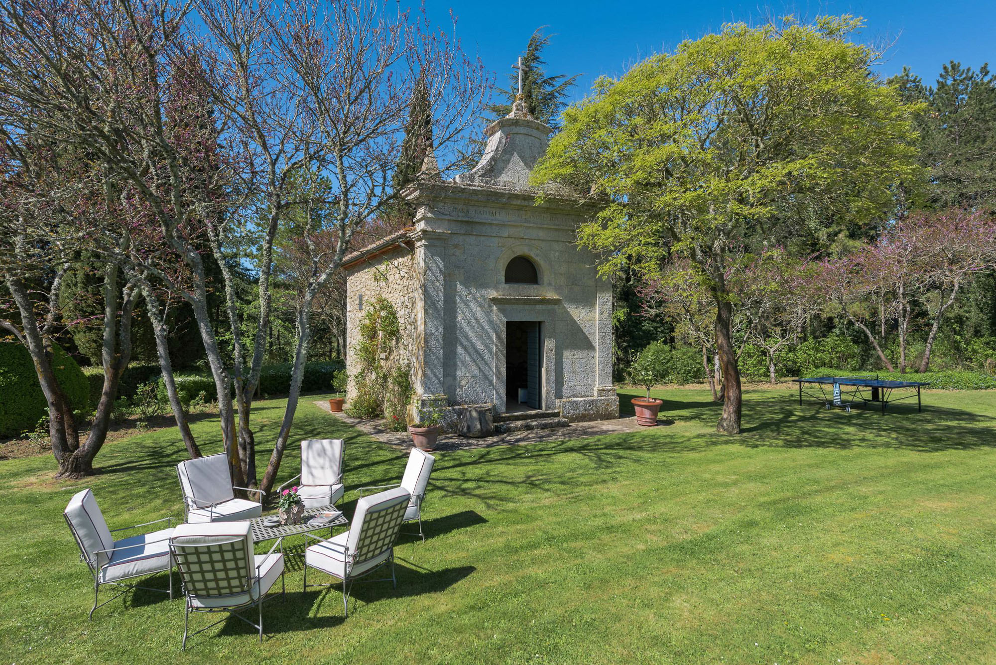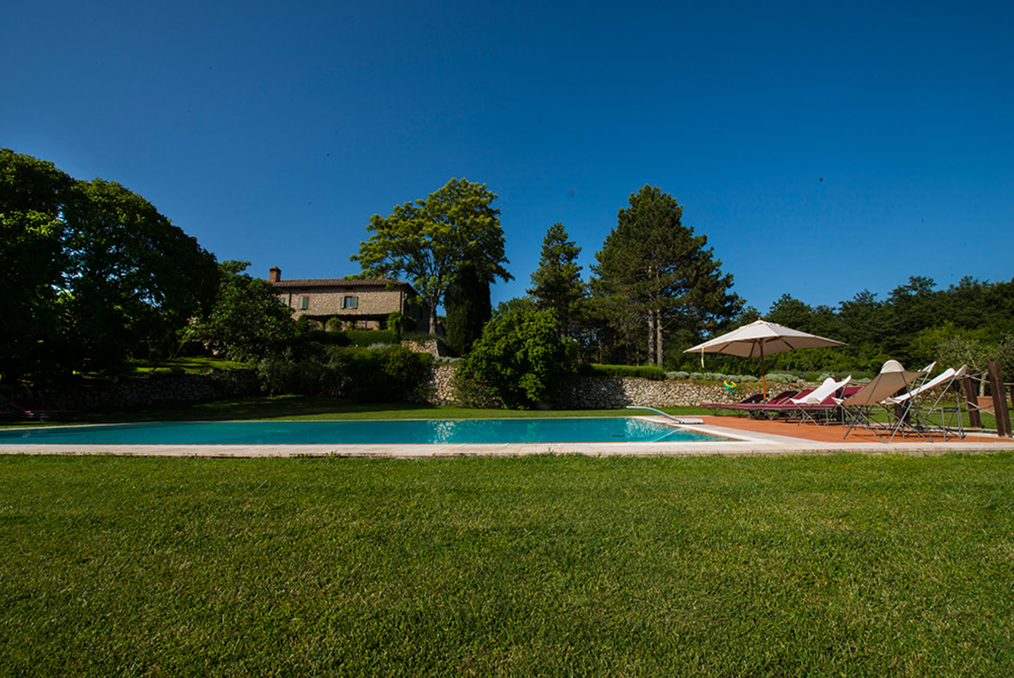 A pergola shades a dining table for al fresco meals, and an 18-meter swimming pool is on a lower lawn. There's lots of green space for playing games; table tennis and badminton are provided. Guests can explore the property's private trails with scenic walks and bike rides and take day trips to the nearby towns of Montepulciano, Montalcino, and Cetona—renowned for their rich history, exceptional cuisine, and world-class wineries.