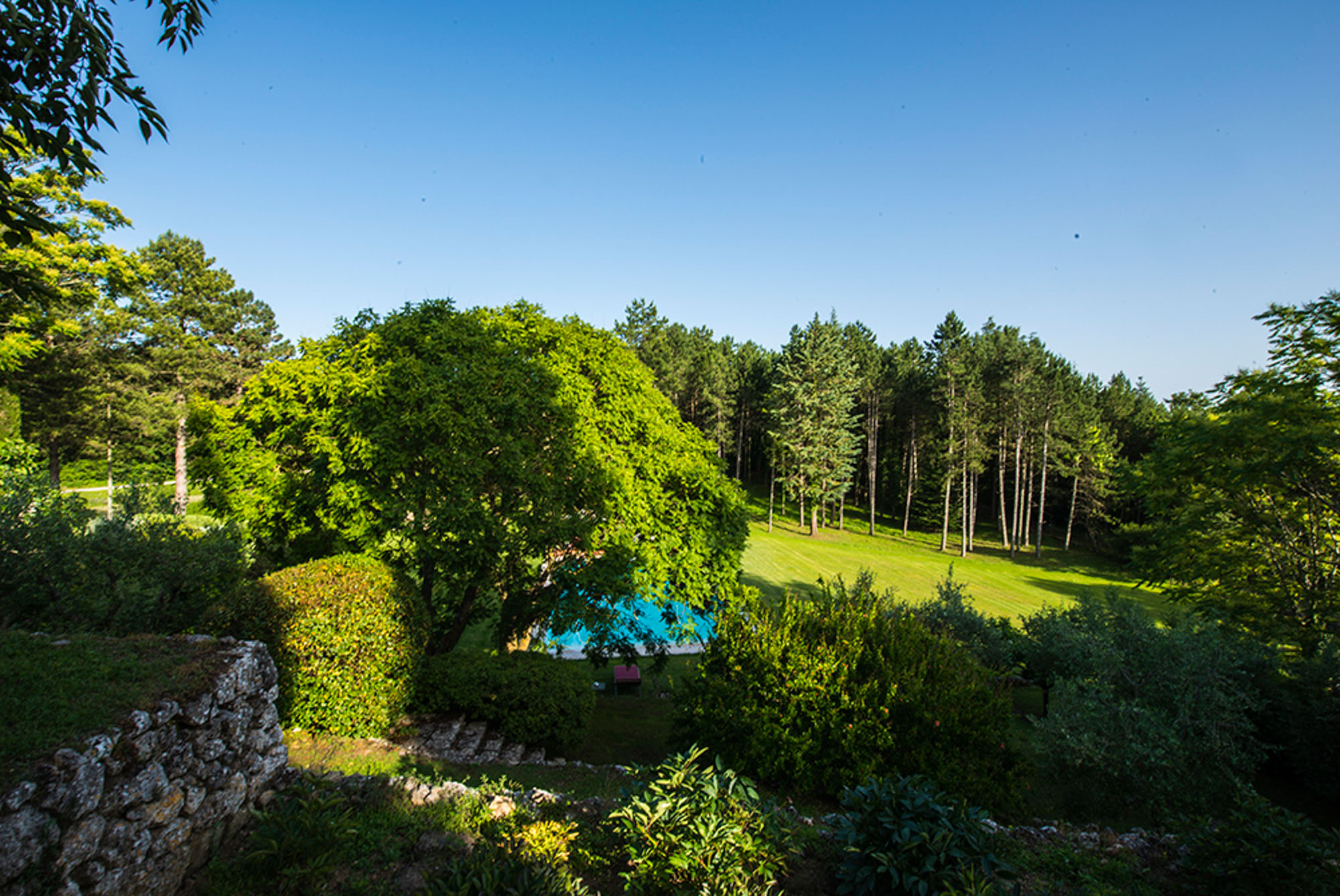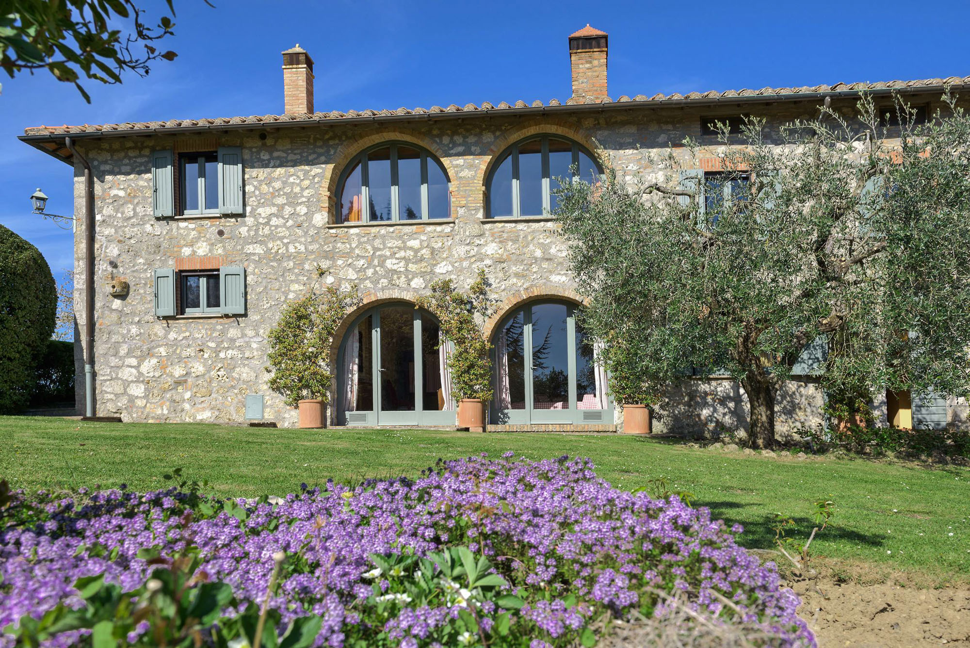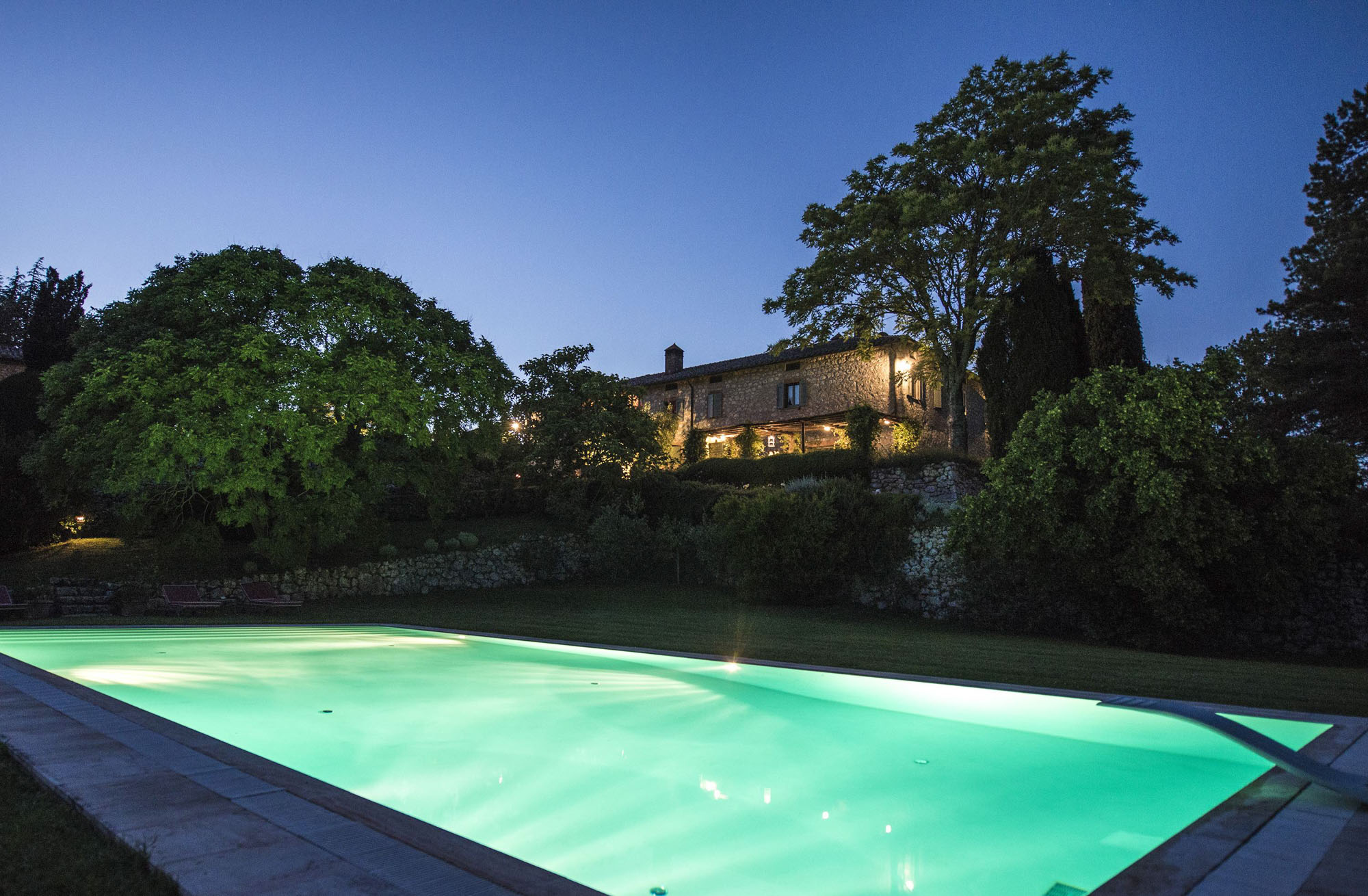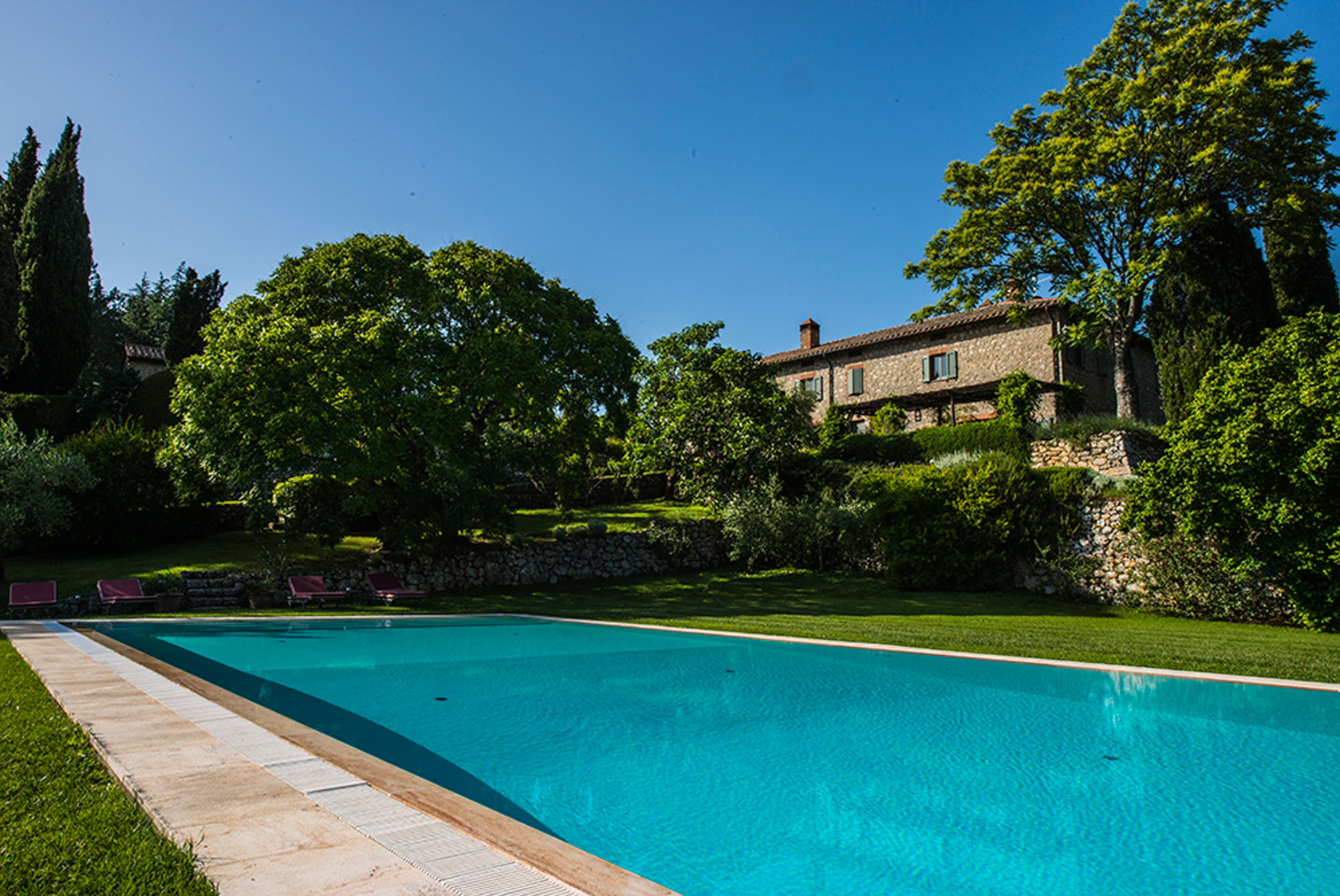A pergola shades a dining table for al fresco meals, and an 18-meter swimming pool is on a lower lawn. There's lots of green space for playing games; table tennis and badminton are provided. Guests can explore the property's private trails with scenic walks and bike rides and take day trips to the nearby towns of Montepulciano, Montalcino, and Cetona—renowned for their rich history, exceptional cuisine, and world-class wineries.