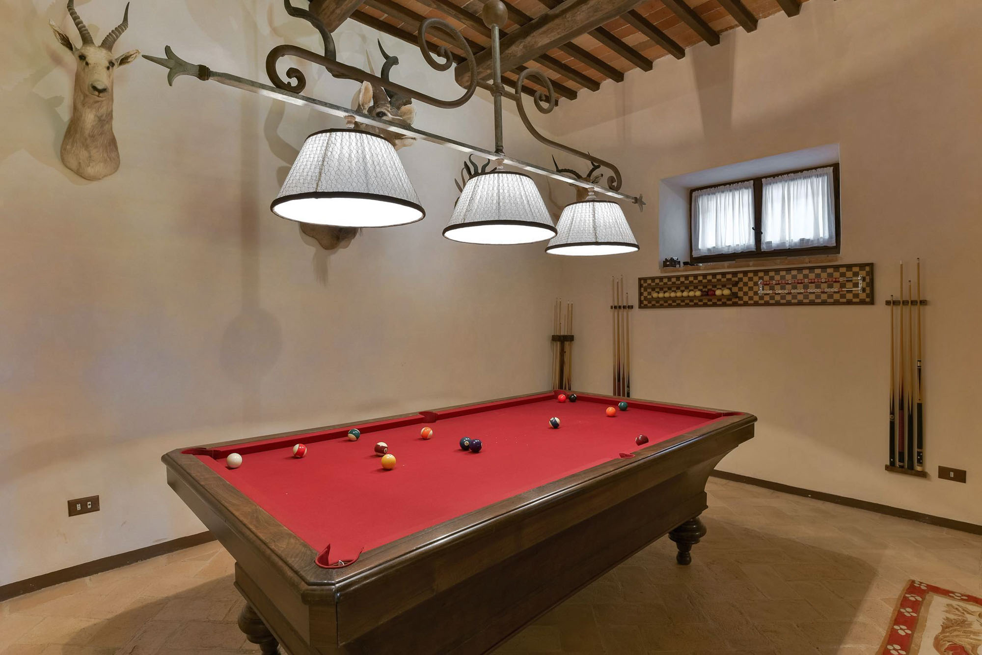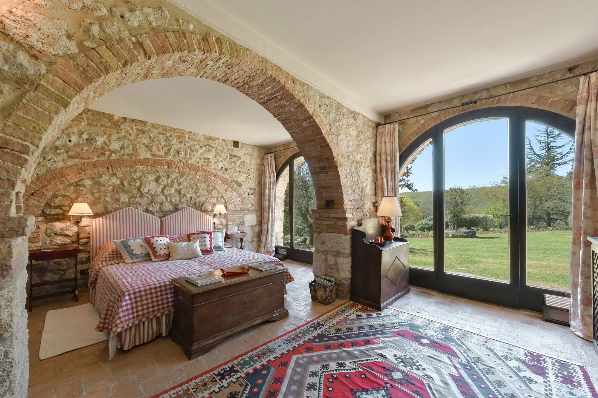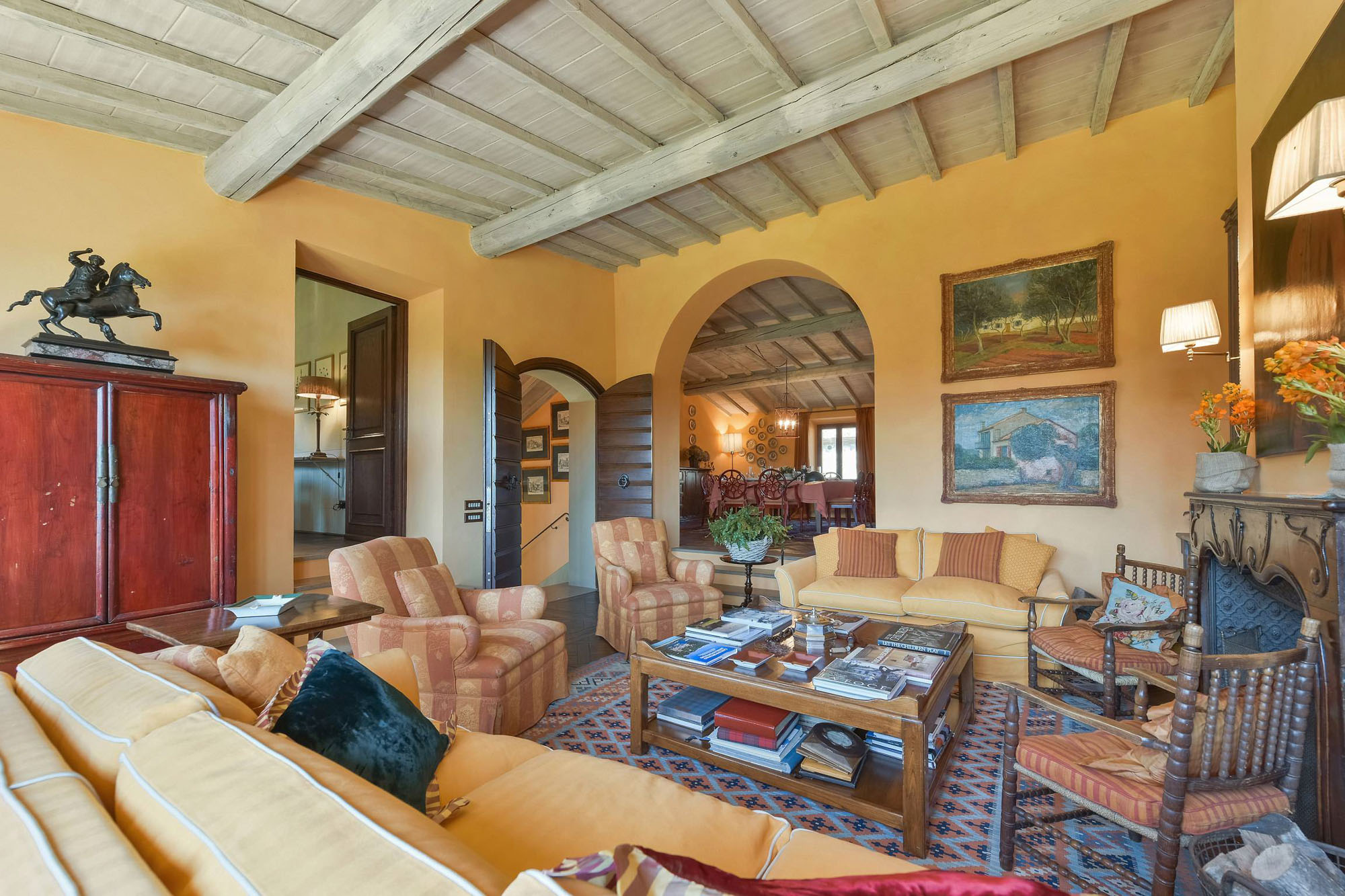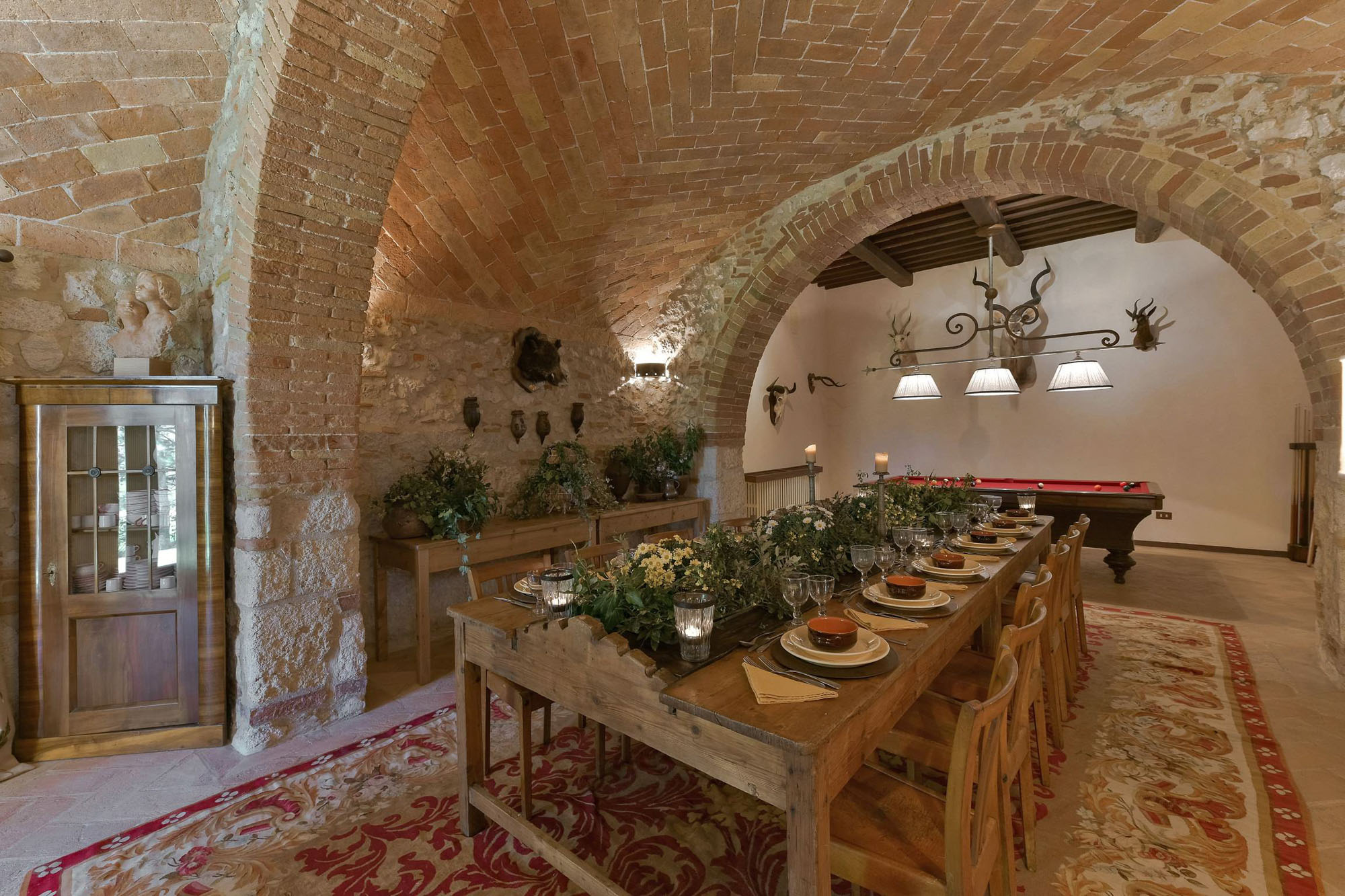 The remaining four bedrooms are on the first floor, two of which share a bathroom, and the other two are larger suites. Elegant living and dining rooms, with polished wooden floors and large colourful rugs, are also on the first floor, together with a TV room and a small kitchen. Another kitchen/dining room is on the stone vaulted ground floor, with a stone arch opening to a billiards room.