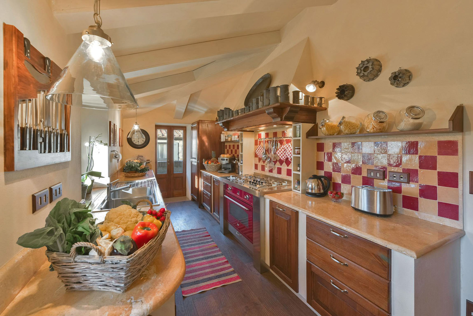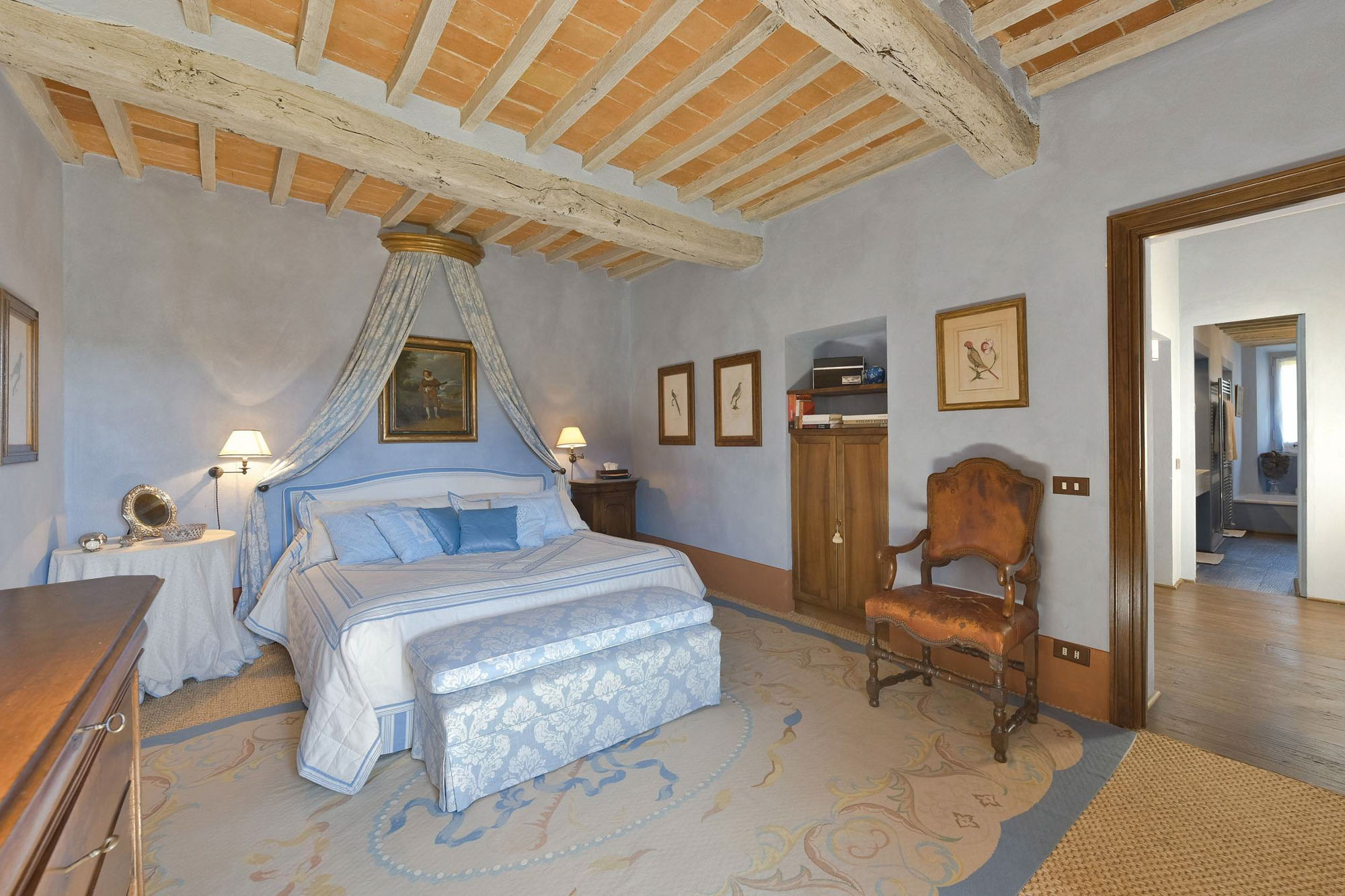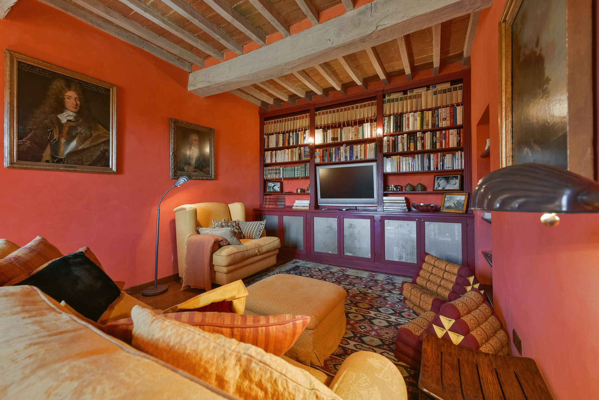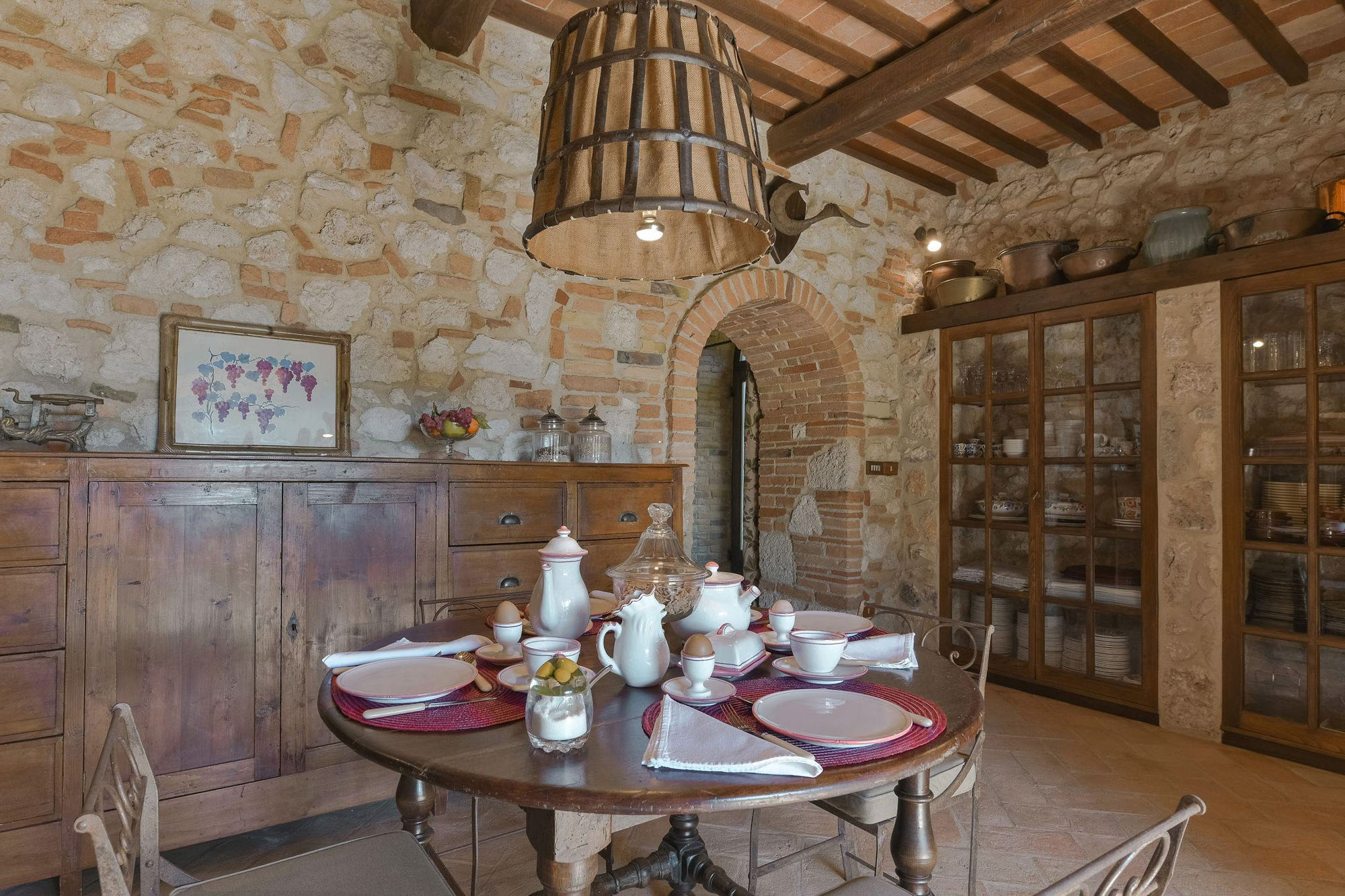 The remaining four bedrooms are on the first floor, two of which share a bathroom, and the other two are larger suites. Elegant living and dining rooms, with polished wooden floors and large colourful rugs, are also on the first floor, together with a TV room and a small kitchen. Another kitchen/dining room is on the stone vaulted ground floor, with a stone arch opening to a billiards room.