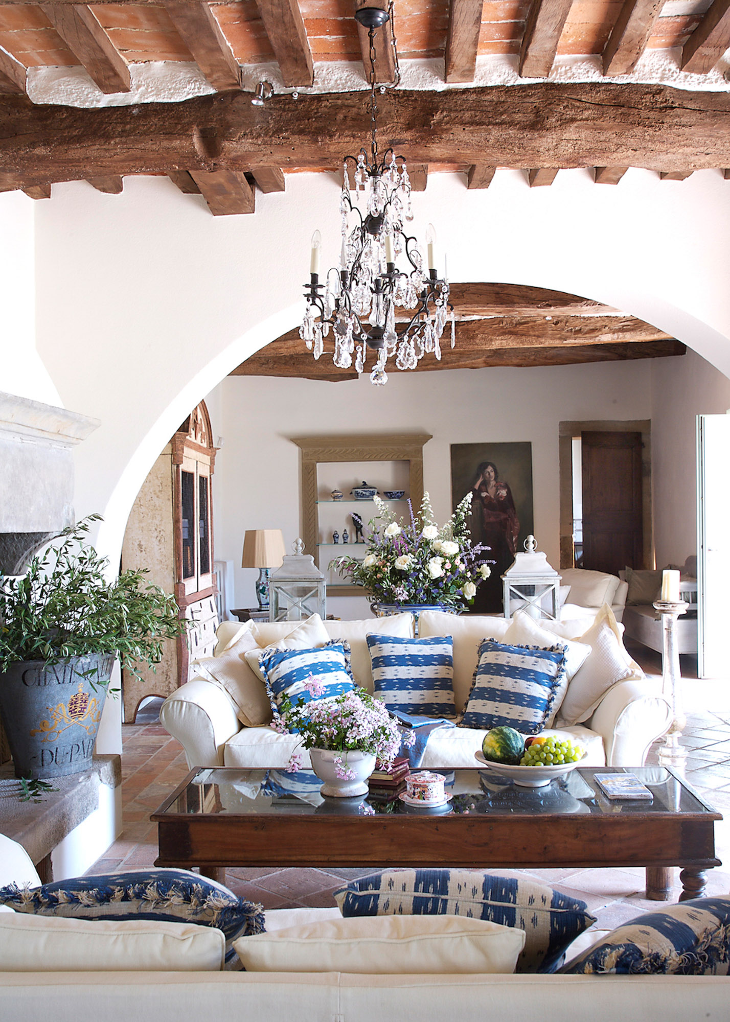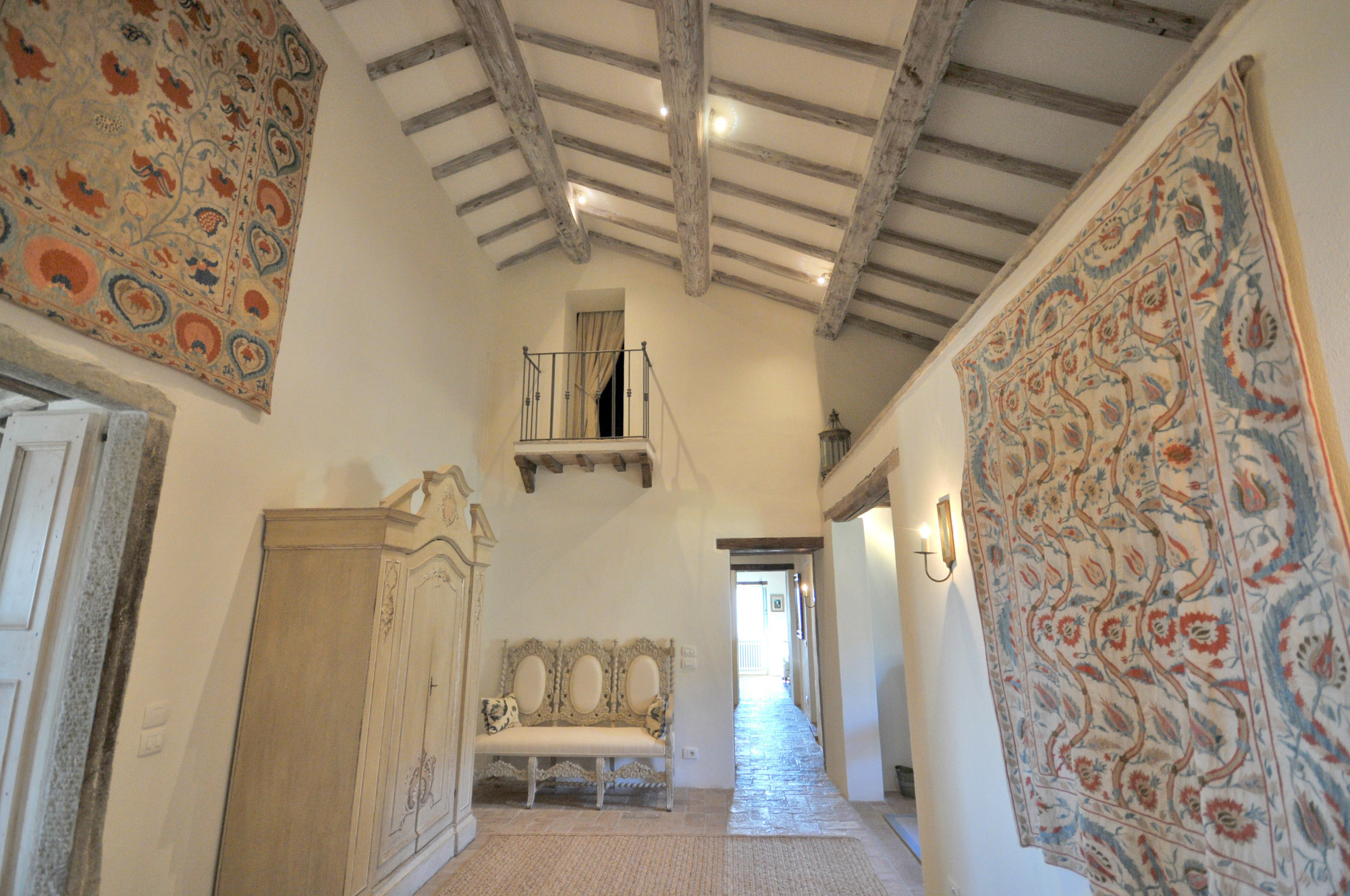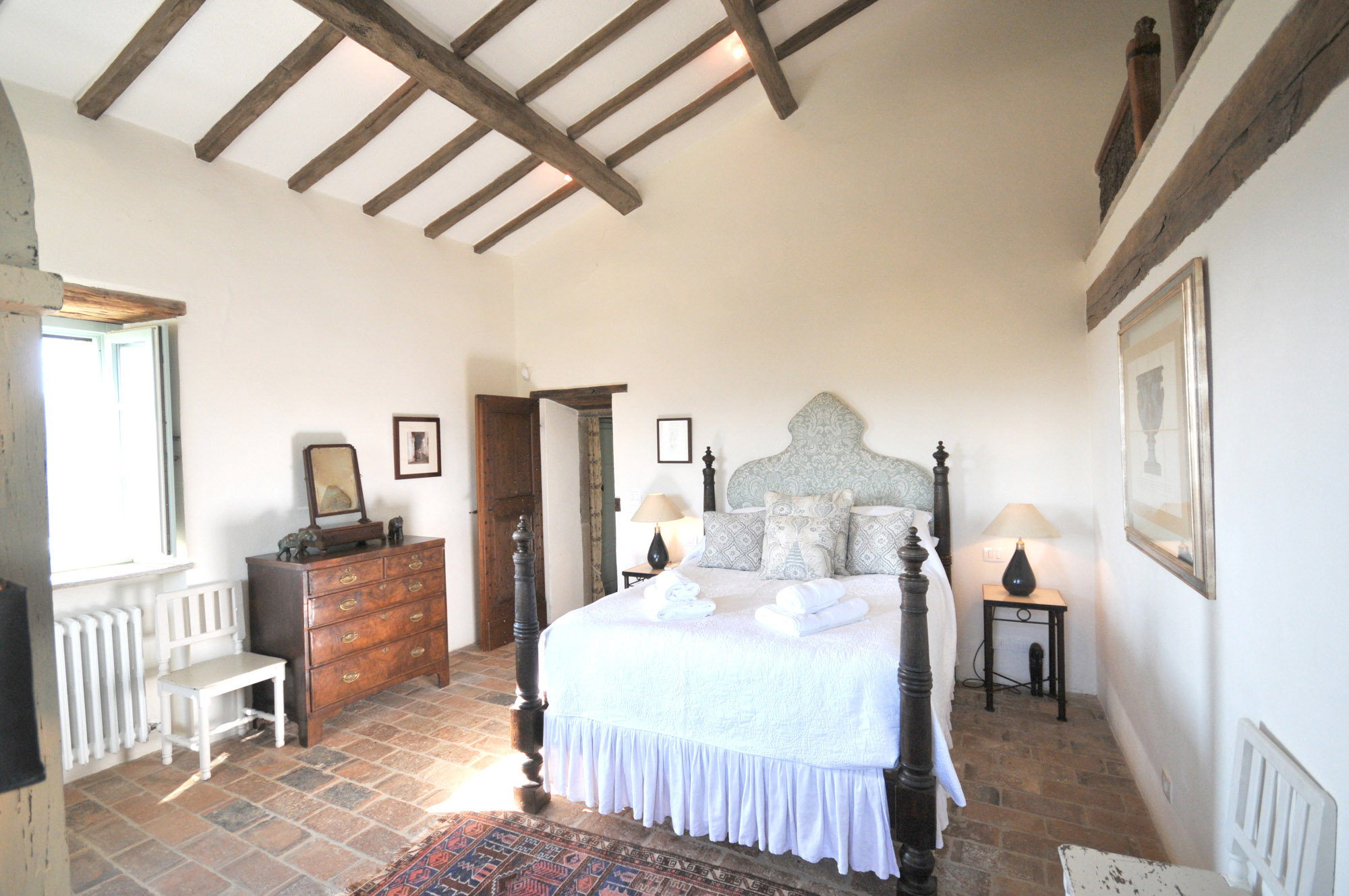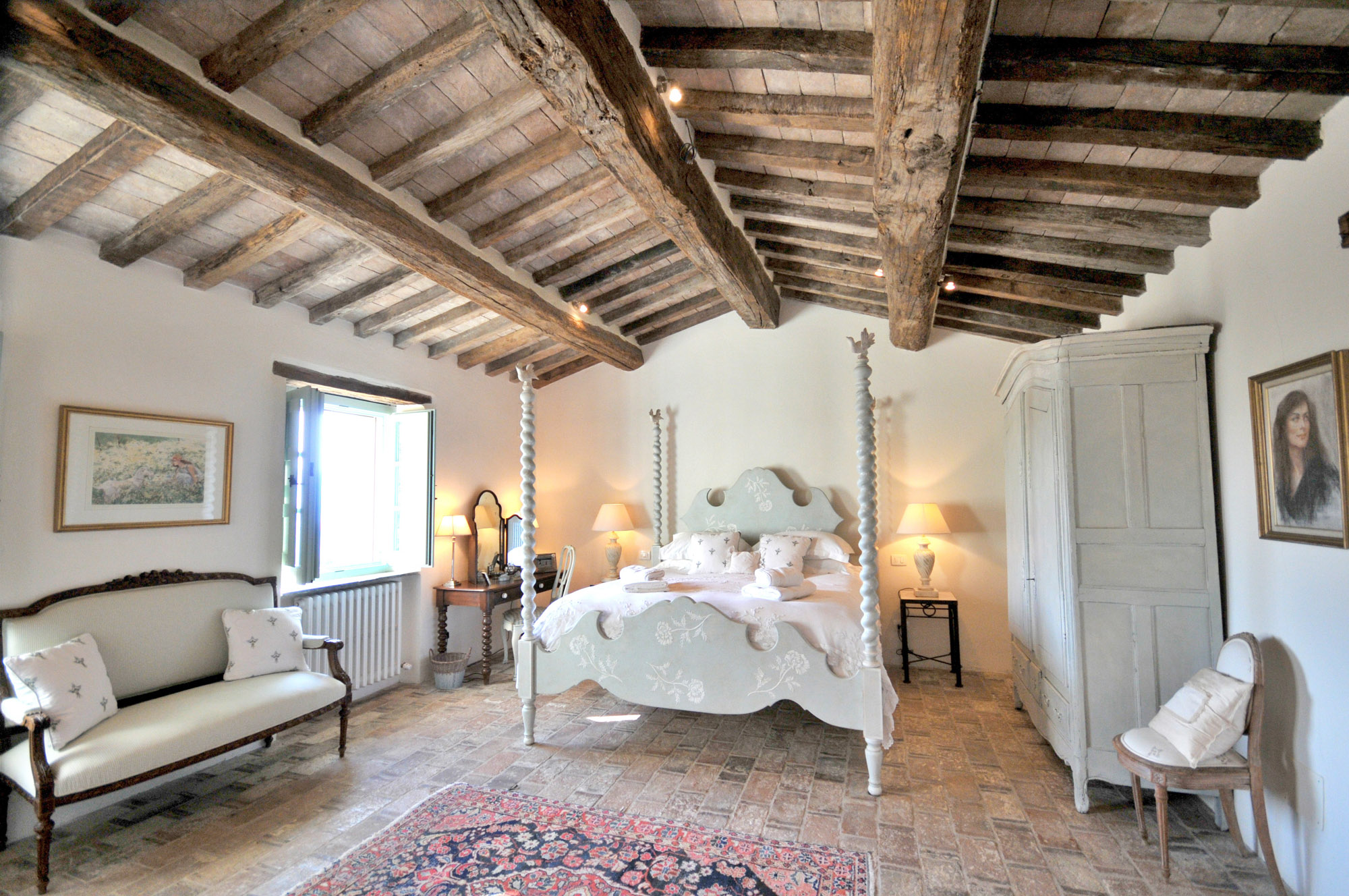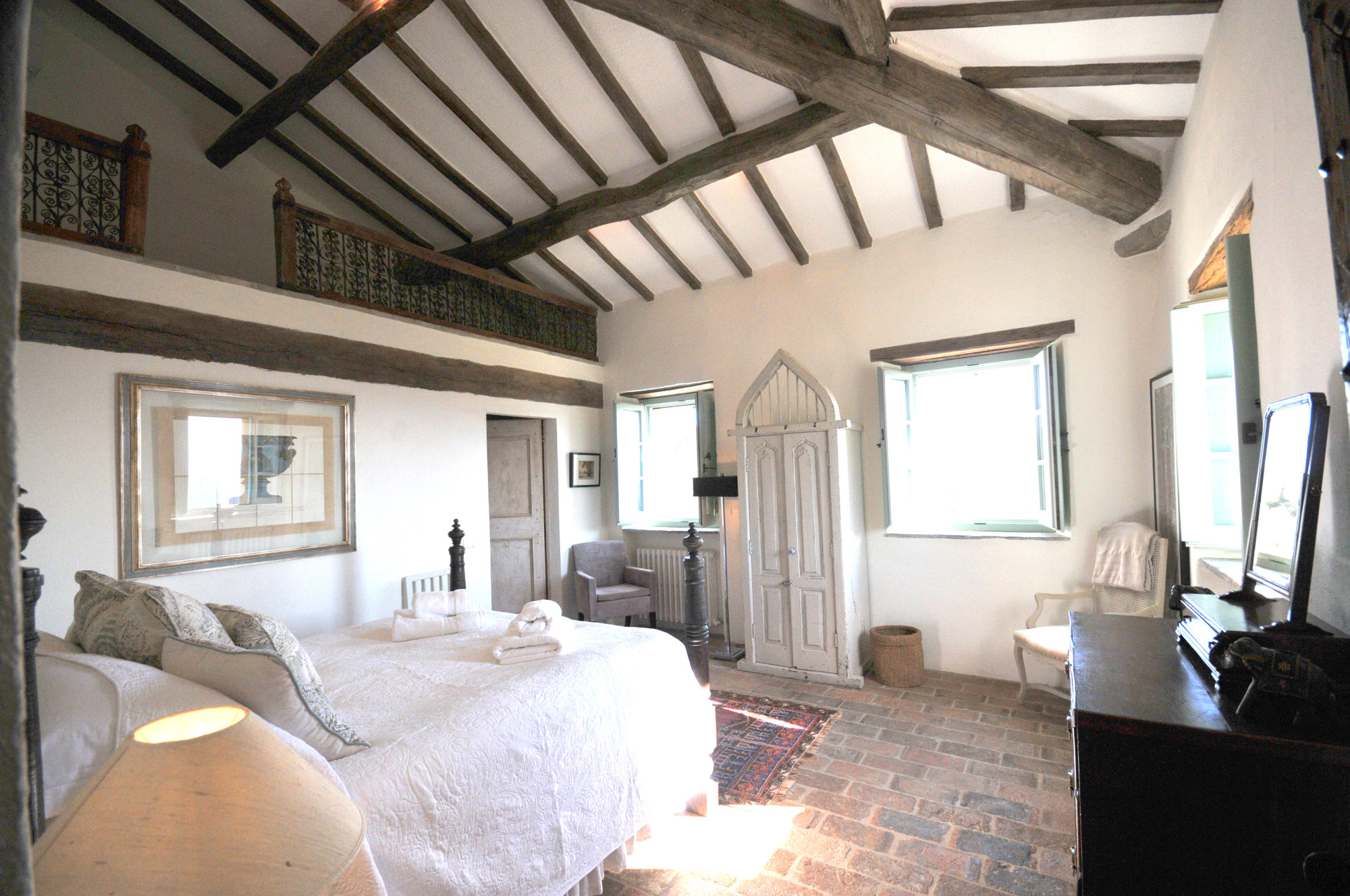 The rooms are furnished with a mix of antiques and comfortable classic pieces and include a refined drawing room, a galleried sitting room, and a spacious kitchen/dining room. The bedrooms and bathrooms are equally stylish and characterful. The hand painted four poster bed in the Master bedroom is made by the famous Venetian cabinet maker Porto Italia and is six foot wide. There is a further four poster bed in one of the ground floor bedrooms.