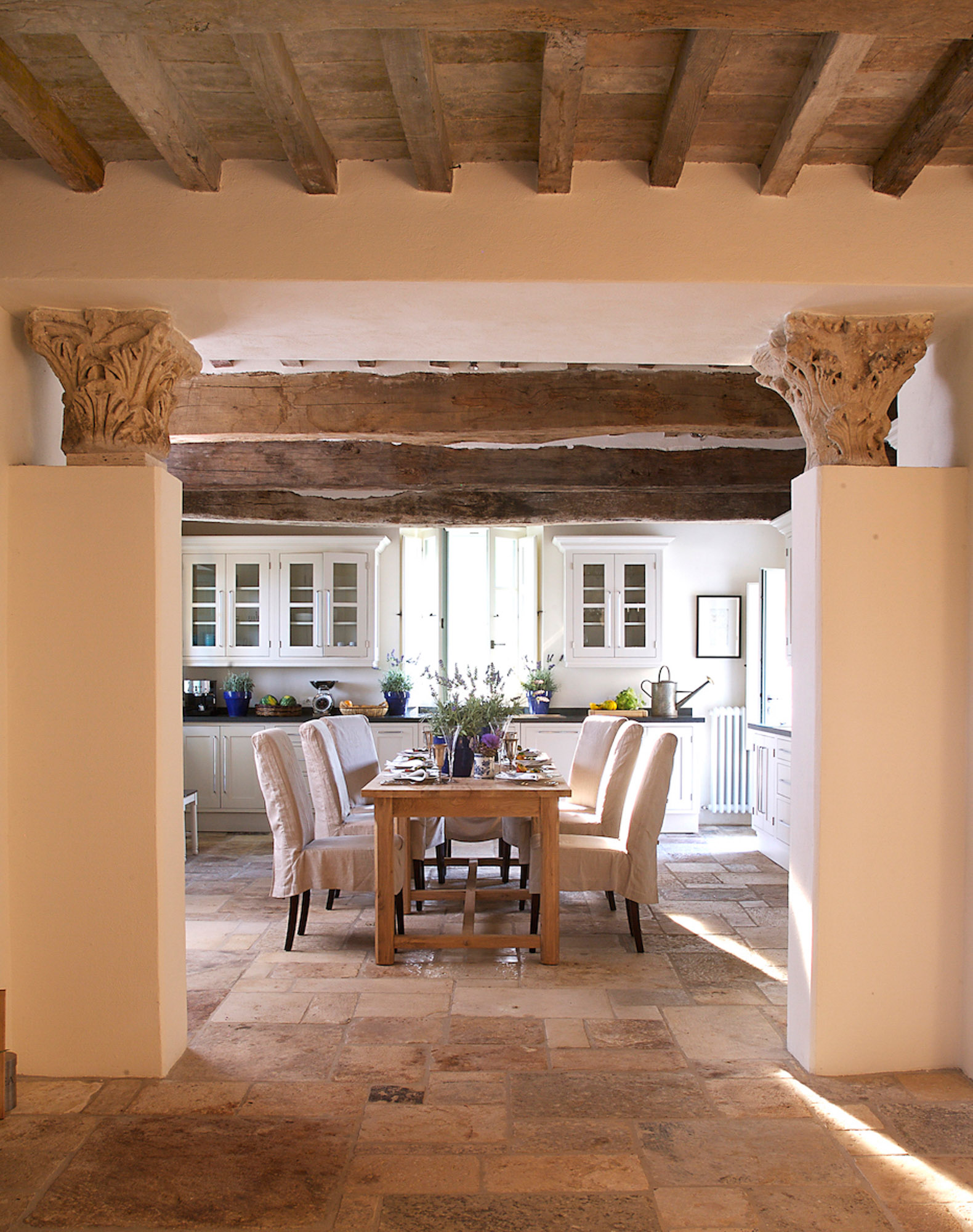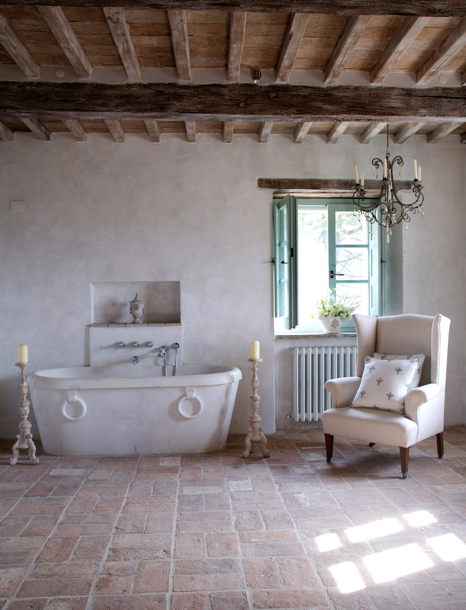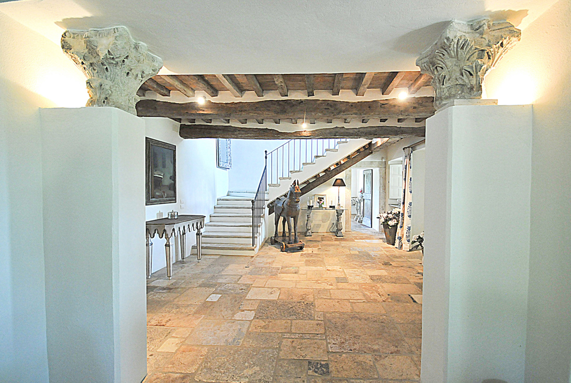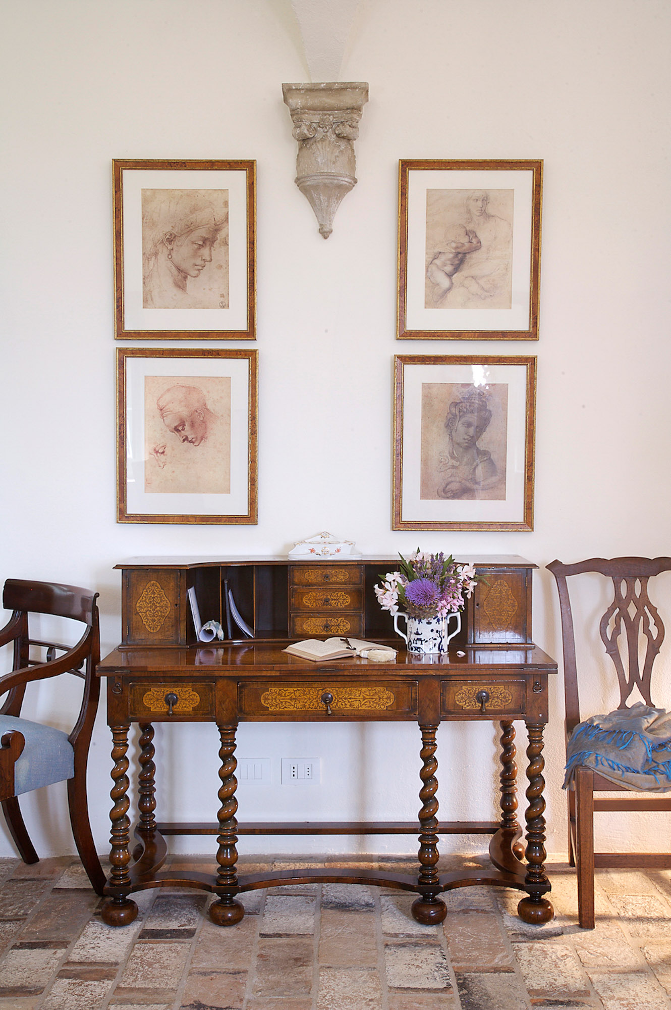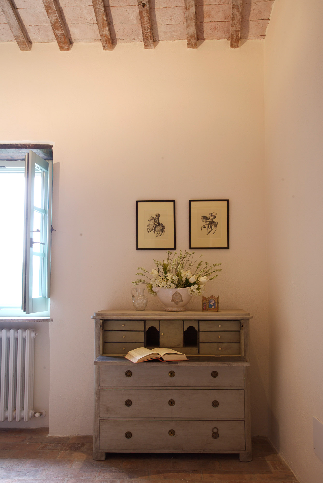 The rooms are furnished with a mix of antiques and comfortable classic pieces and include a refined drawing room, a galleried sitting room, and a spacious kitchen/dining room. The bedrooms and bathrooms are equally stylish and characterful. The hand painted four poster bed in the Master bedroom is made by the famous Venetian cabinet maker Porto Italia and is six foot wide. There is a further four poster bed in one of the ground floor bedrooms.