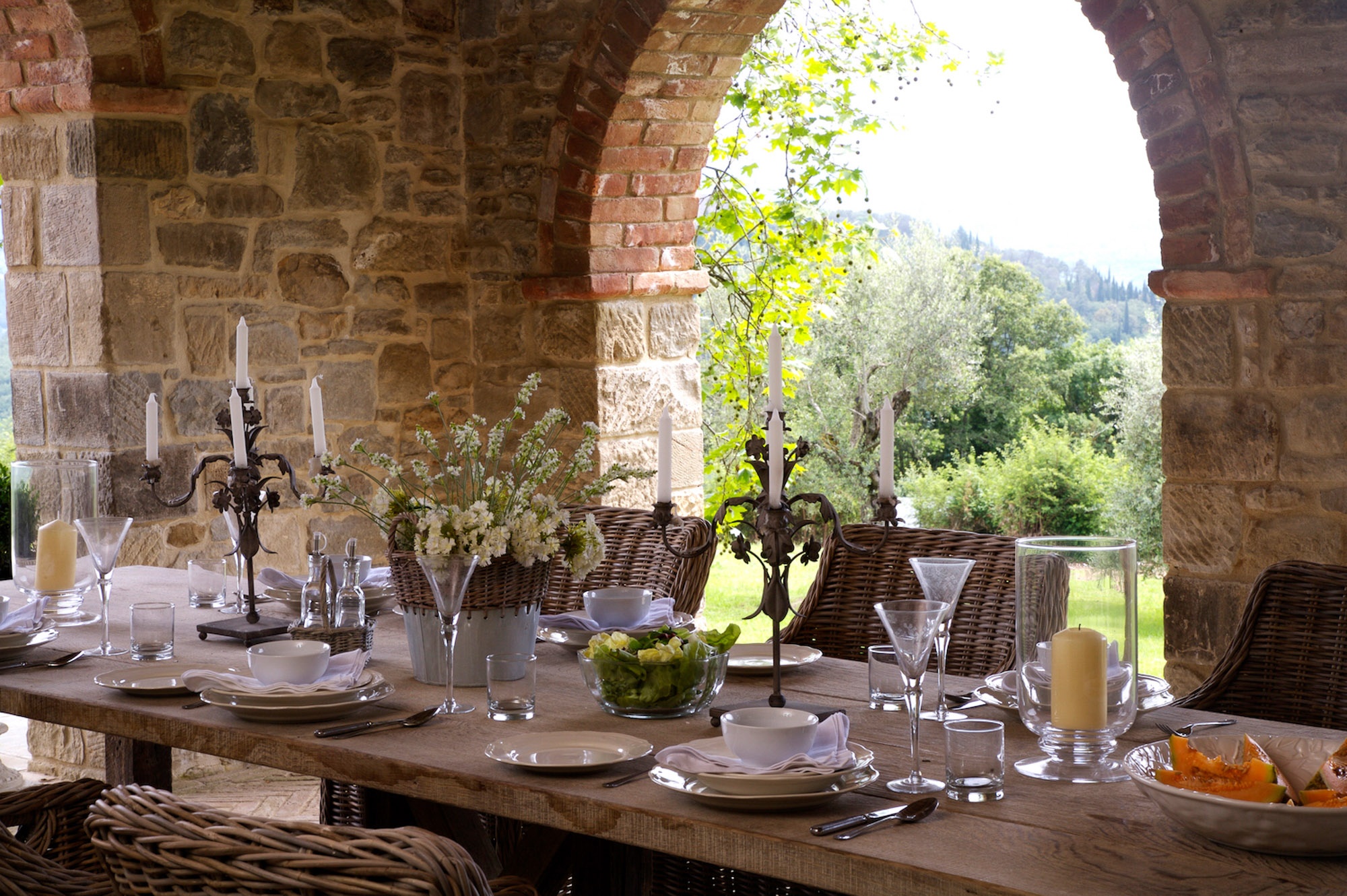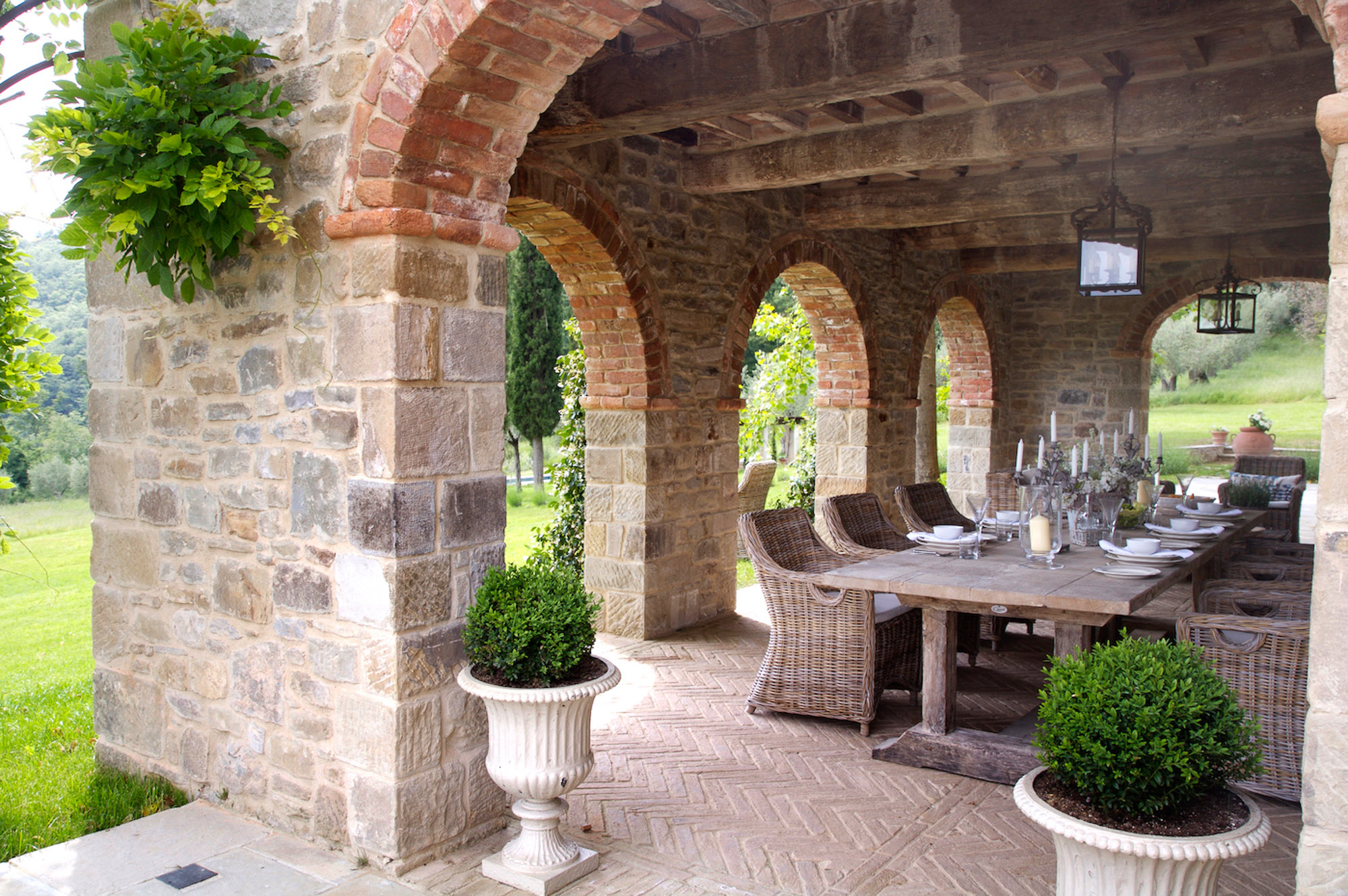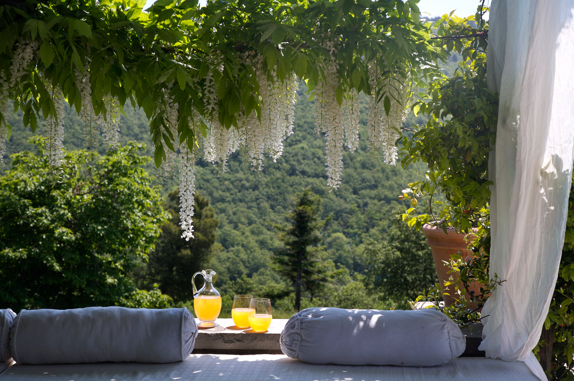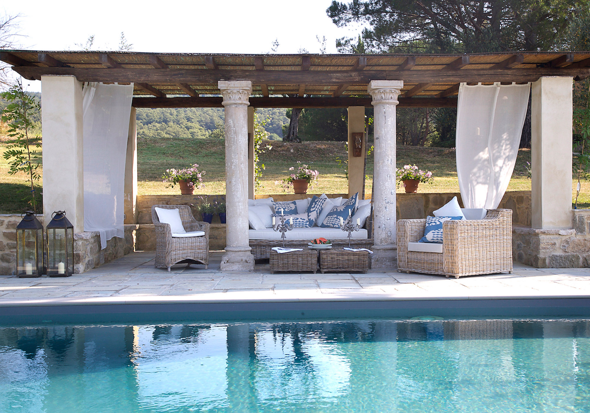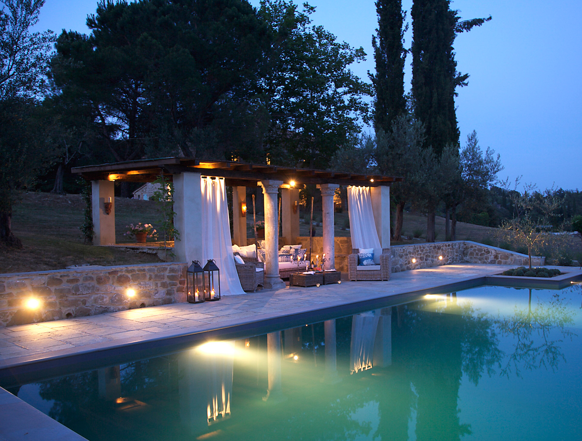 Seating is available on the stone terraces and under the stone pillared pergola beside the 12m pool, which is a lovely place for evening drinks lit by candle lanterns. Guests also have exclusive use of a nearby, private astroturf tennis court.