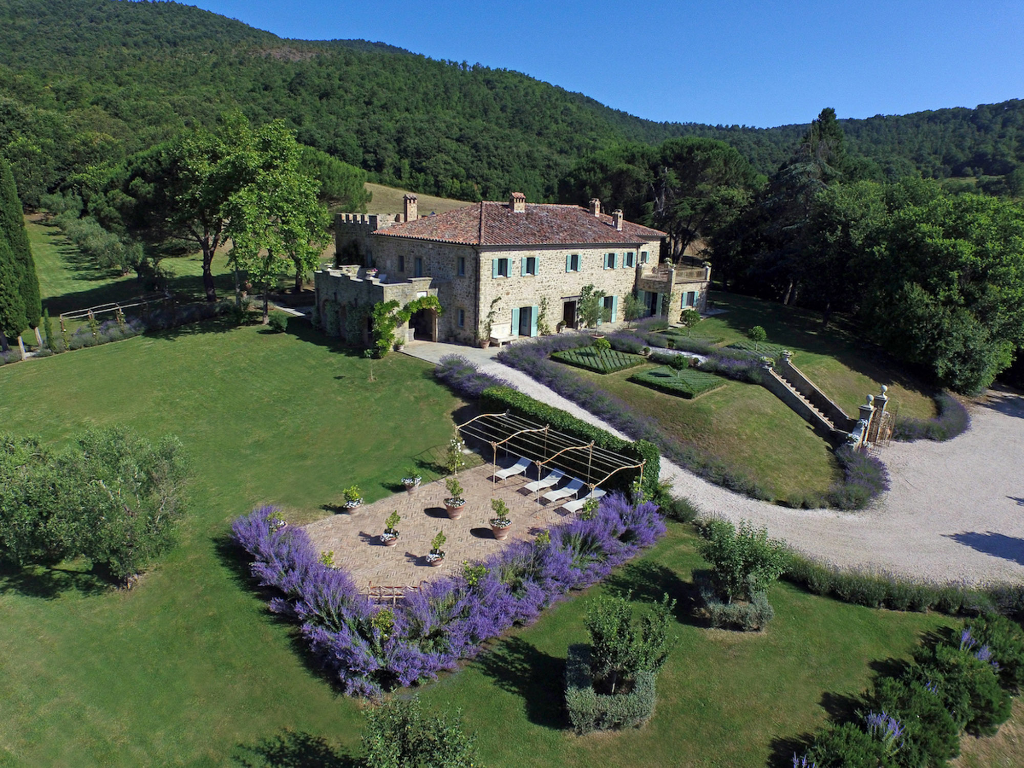 Surrounded by rolling lawns, woodland, and olive groves, with a private lake and magnificent views, it is a haven of tranquillity yet perfectly positioned to explore the towns and villages of Tuscany and Umbria.