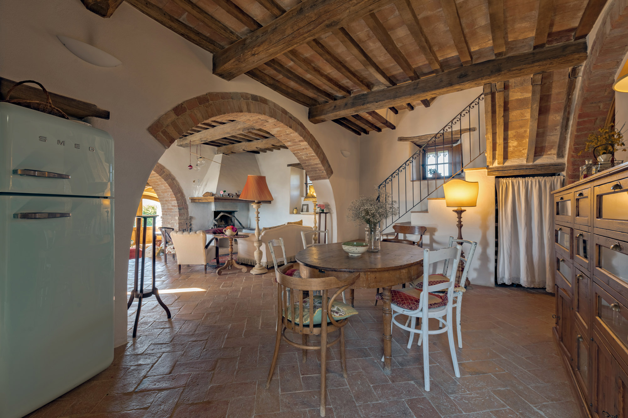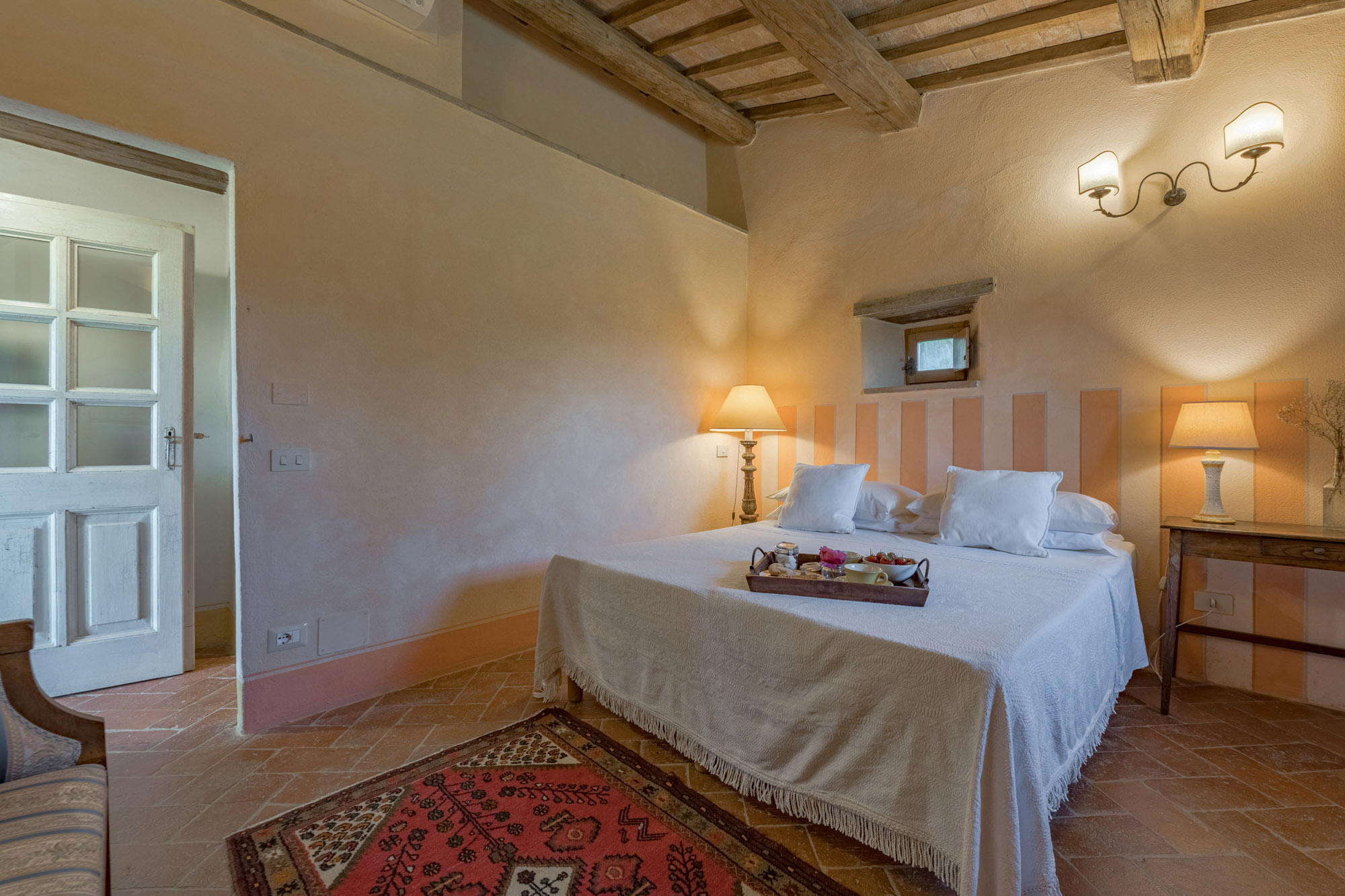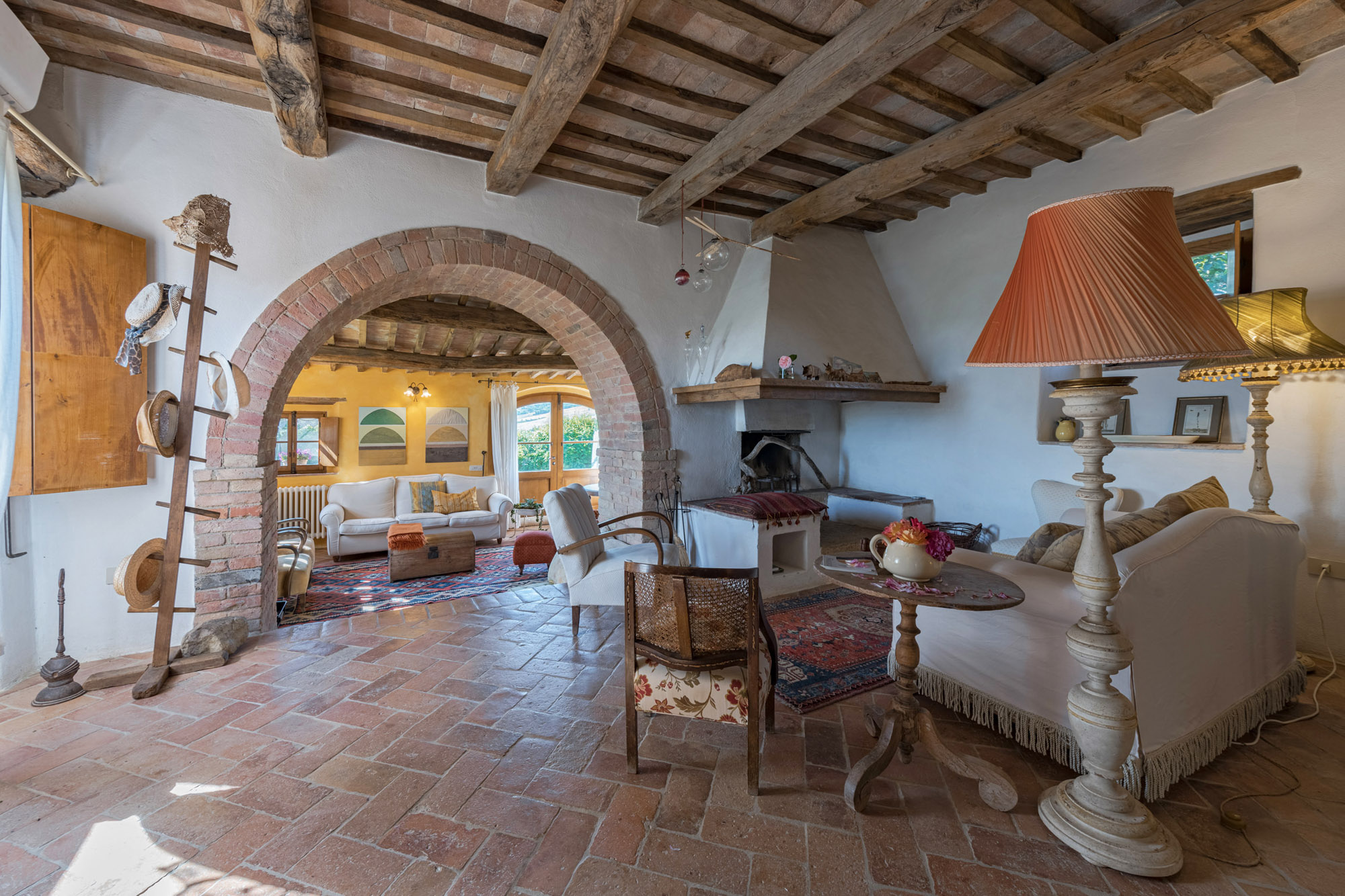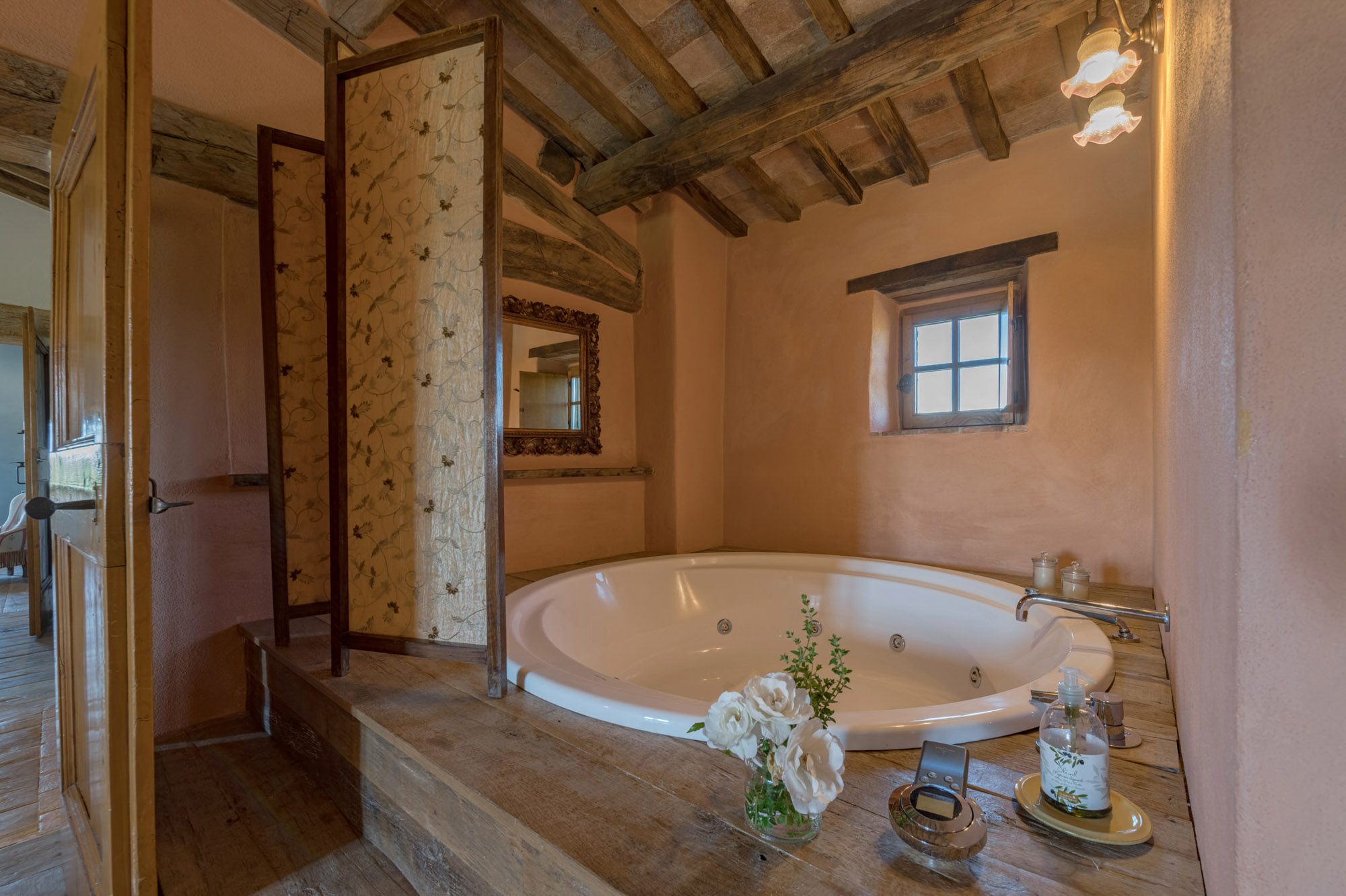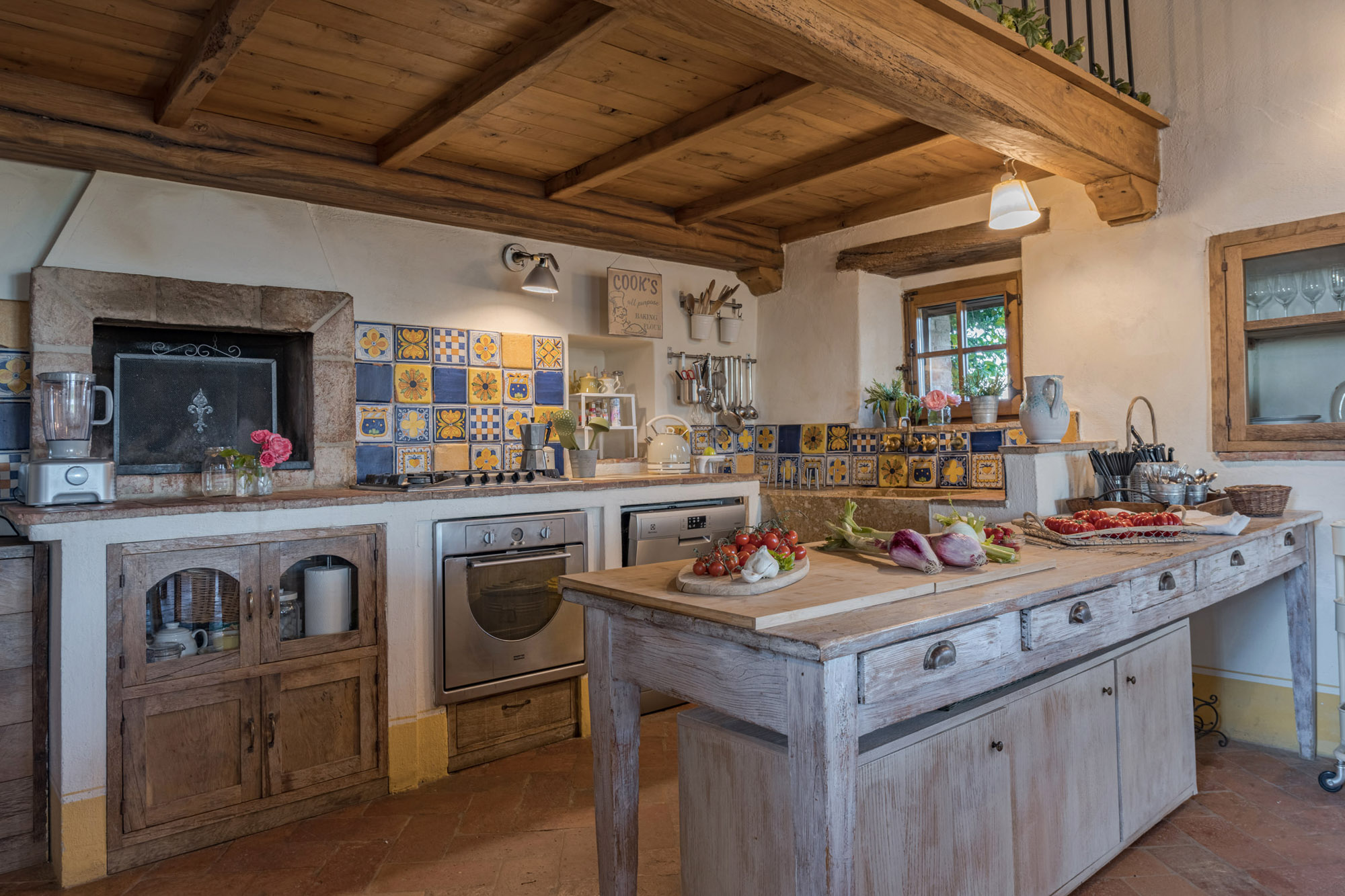 The six bedrooms have a romantic air; five are en-suite, one with a round bathtub and another with a hydromassage tub. There's a big Tuscan-style kitchen with modern amenities, a dining table for 12 and doors to the patio. The bright lounge, with its original feature fireplace, has access to a second, smaller kitchen for preparing drinks and snacks.